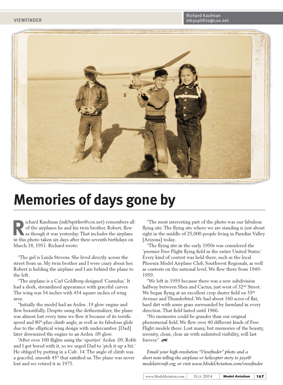 Richard Kaufman (mk9spitfire@cox.net) remembers all of the airplanes he and his twin brother, Robert, flew as though it was yesterday. That includes the airplane in this photo taken six days after their seventh birthdays on March 18, 1951. Richard wrote: