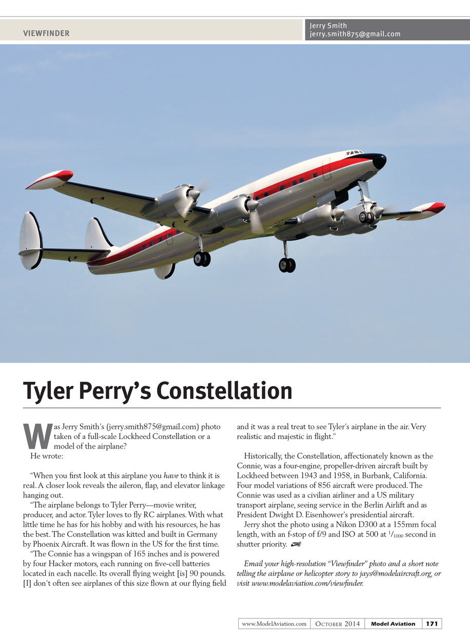 “The airplane belongs to Tyler Perry, movie writer, producer, and actor. Tyler loves to fly RC airplanes. With what little time he has for his hobby and with his resources, he has the very best. The Constellation was kitted and built in Germany by Phoenix Aircraft. It was flown here in the US for the first time.
