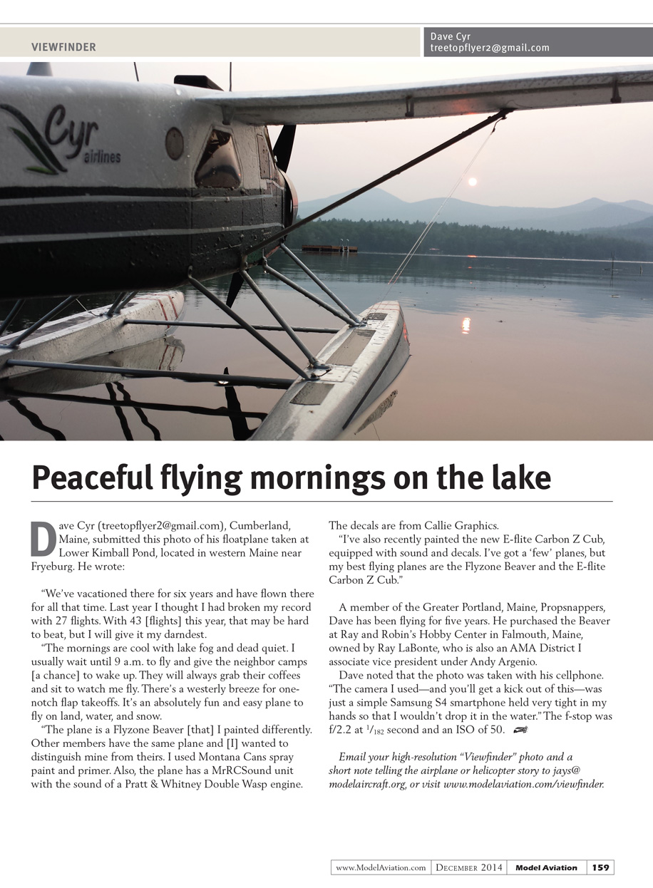 Email your high-resolution “Viewfinder” photo and a short note telling the airplane or helicopter story to jays@modelaircraft.org, or visit www.modelaviation.com/viewfind.