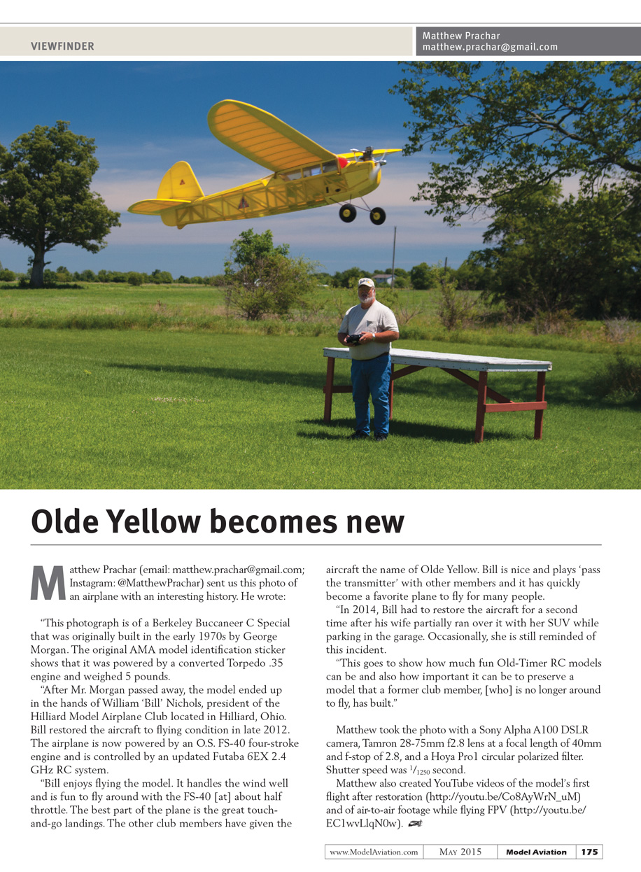 “Bill enjoys flying the model. It handles the wind well and is fun to fly around with the FS-40 [at] about half throttle. The best part of the plane is the great touch-and-go landings. The other club members have given the aircraft the name of ‘Olde Yellow.’ Bill is nice and plays ‘pass the transmitter’ with other members and it has quickly become a favorite plane to fly for many people.