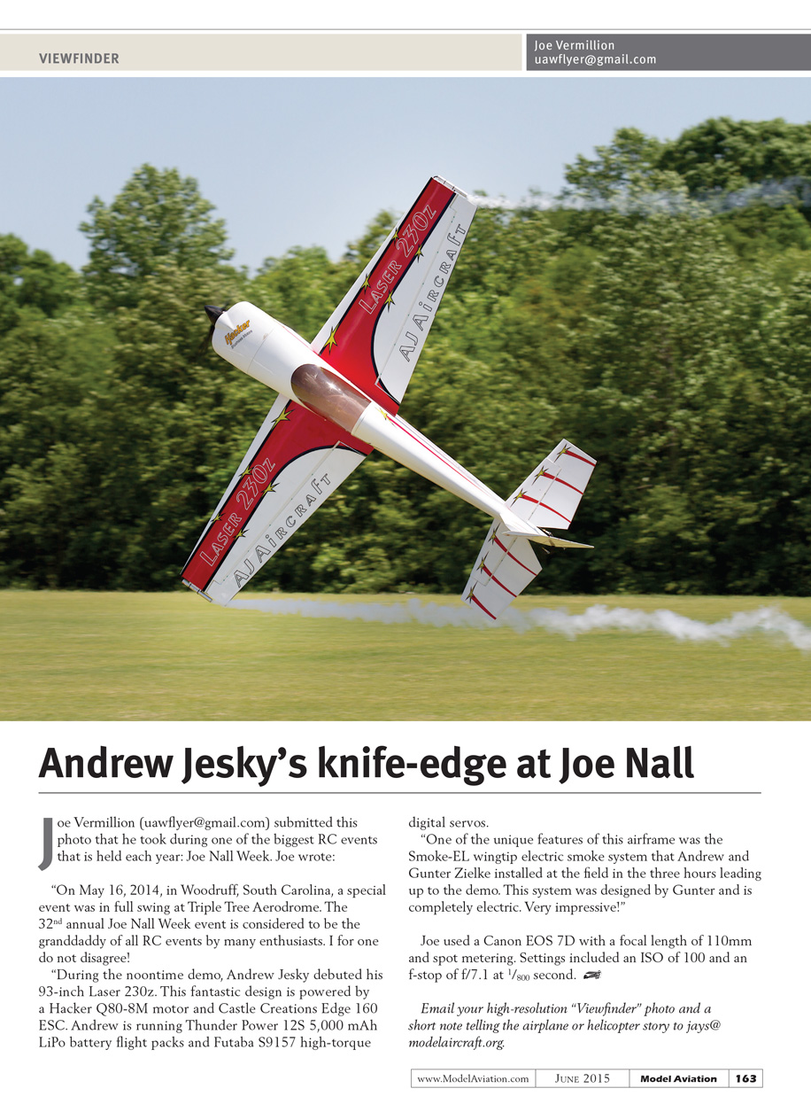 Joe Vermillion (uawflyer@gmail.com) submitted this photo that he took during one of the biggest RC events that is held each year: Joe Nall Week. Joe wrote: “On May 16, 2014, in Woodruff, South Carolina, a special event was in full swing at Triple Tree Aerodrome. The 32nd annual Joe Nall Week event is considered to be the granddaddy of all RC events by many enthusiasts. I for one do not disagree! “During the noontime demo, Andrew Jesky debuted his 93-inch Laser 230z. This fantastic design is powered by a Hacker Q80-8M motor and Castle Creations Edge 160 ESC. Andrew is running Thunder Power 12S 5,000 mAh LiPo battery flight packs and Futaba S9157 high-torque digital servos. “One of the unique features of this airframe was the Smoke-EL wingtip electric smoke system that Andrew and Gunter Zielke installed on the field in the three hours leading up to the demo. This system was designed by Gunter and is completely electric. Very impressive!” Joe used a Canon EOS 7D with a focal length of 110mm and spot metering. Settings included an ISO of 100 and an f-stop of f/7.1 at 1/800 second.[dingbat] Email your high-resolution “Viewfinder” photo and a short note telling the airplane or helicopter story to jays@modelaircraft.org.