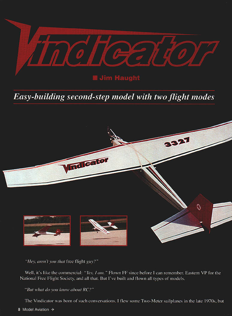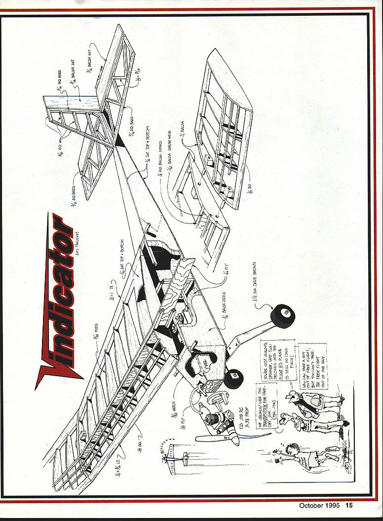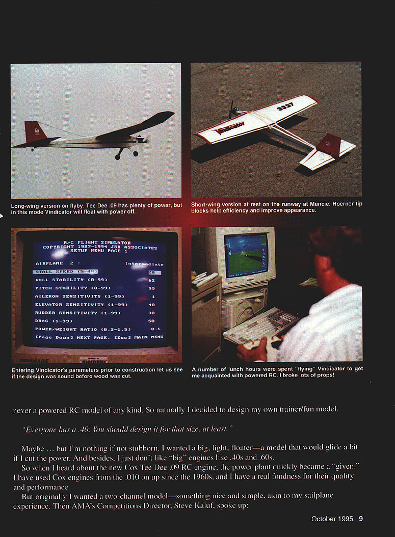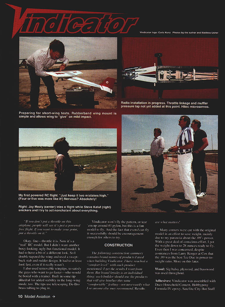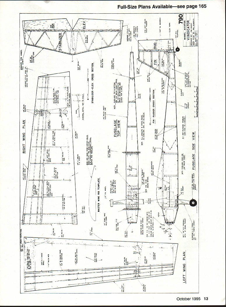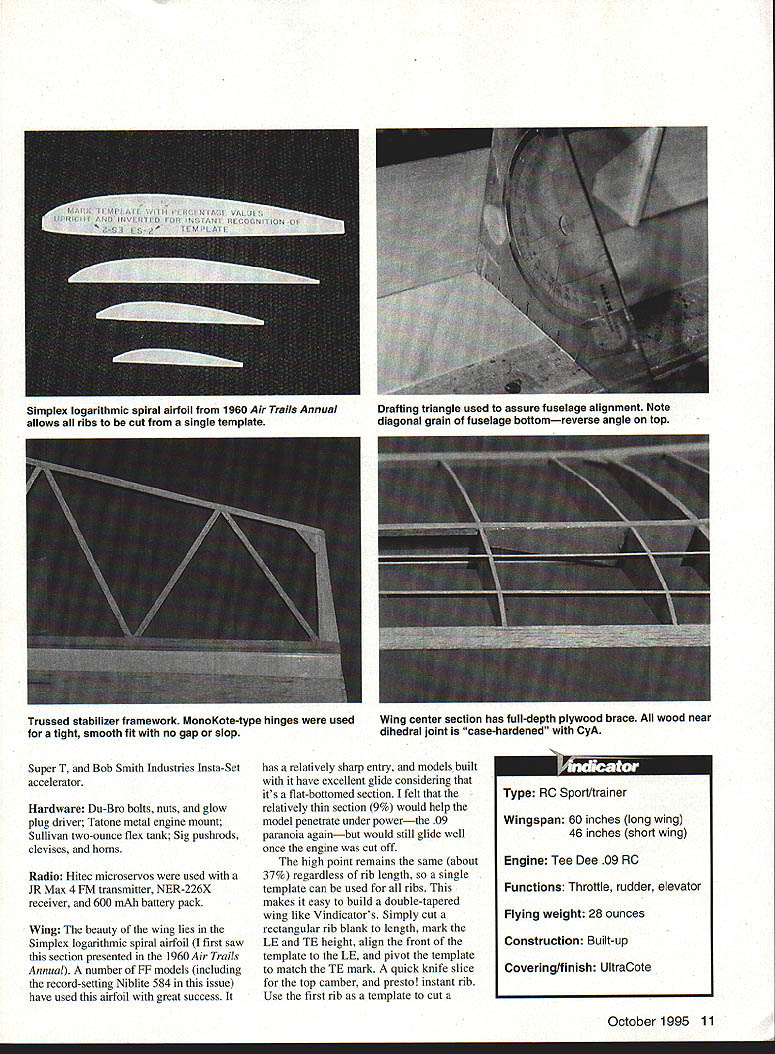 NO OCR TEXT NO OCR TEXT NO OCR TEXT Super T Bob Smith Industries Insta-Set accelerator Hardware Du-Bro bolts nuts glow plug driver Tatone metal engine mount Sullivan two-ounce flex tank Sig pushrods devises horns Radio Hitec microservos used JR Max 4 FM transmitter NER-226X receiver 600 mAh battery pack Wing The beauty wing lies Simplex logarithmic spiral airfoil first saw section presented 1960 Air Trails Annual number FF models including record-setting Niblite 584 issue have used airfoil great success has relatively sharp entry models built have excellent glide considering its flat-bottomed section felt relatively thin section 9% would help model penetrate under powerthe 09 paranoia againbut would still glide well once engine cut off high point remains same about 37% regardless rib length single template can used ribs makes easy build double-tapered wing like Vindicators Simply cut rectangular rib blank length mark LE TE height align front template LE pivot template match TE mark quick knife slice top camber presto instant rib Use first rib template cut October1995 11 Simplex logarithmic spiral airfoil 1960 Air Trails Annual allows ribs cut single template Drafting triangle used assure fuselage alignment Note diagonal grain fuselage bottomreverse angle top Trussed stabilizer framework MonoKote-type hinges used tight smooth fit no gap slop Wing center section has full-depth plywood brace wood near dihedral joint case-hardened CyA ________________ Type RO Sport/trainer Wingspan 60 inches long wing 46 inches short wing Engine Tee Dee 09 RO Functions Throttle rudder elevator Flying weight 28 ounces Construction Built-up Covering/finish UltraCote matching rib other wing half main spar notches cut ribs before assembly dont cut other spar notches until framework has assembled Mark spar locations ribs soft-lead pencil use sharp razor blade cut notches simple notching tool can made couple thin razor blade pieces CyAed side piece wood thats slightly smaller thickness desired notch depth spacer can also attached blades giving uniform depth width notches Vindicators wing derives good deal strength vertical-grained shear webs snug fit no gaps important full-depth / plywood center brace has proven adequate youre planning really horse model around may want go up 32 plywood added peace mind Plug-in tips Both tips tip blocks have brass tubing imbedded plug-in feature tip tubing /32 OD telescopes next-larger size tubing /s OD imbedded end ribs main panels small supporting block locks correct dihedral and/or assures correct alignment small tip blocks couple straight-pin hooks main spar capture #8 rubber band hold wingtip place feel like real wuss wrap piece tape around dihedral joint Both sets wingtips use Hoerner-style shapes cut tip losses give pleasing appearance 12 Model Aviation tip framework classic FF style lightness TurbulatorTubing imbedded tip rib/block telescopes nextspars added after panel has framed uplarger-size tubing/block assembly main panel BALSA SHEETYSA YAP 1 IBRACE lIST BALSA WEB ICY BR BALSA SPAR TOP B BOTTOM IA ROLSA V K CS SR AALSA IIII/ IUA IISACET RIBS CC SUB I/A BALSAICR PLy CITEARALPIBEBACL IAIRS 2\ - F t IJ AUSACTS BCRC 1 H RIGHT WING PLAN LUG B KULSAZIA BALSA LEBSUMS EAREGUSSETS RDOBASS1L I/ ATABI2L CRC BRACE PRYBALSASECT BBSI IIIA BALSA AAC[[ CE EUCABARS Sq BA SRARC P PRSEL SPAR TAP STE E CHEES INTO OTT UBBUS ASEL TUBE Cl--11 -T1___ SACK TOP S BOTTOM SlEET \ C IS TIC BLACE5TUPC llZ RIBS USE MARE TAOS UAYIUUS BALSA %SIBAI&A ILOOARIYSMIC SPIRUL IUB FLT ORJSY Iy ~ II BALSA [CCSO I- IlL -I 0.LI CC DOWEL BIBS / FUSELAGE TOP VIEW ROERSER SYTLE RISC TIP STA~ SUIC BALSA TIISSU STABILIZER ELEV CROSS SECTION MASTER WING RIB TEMPLATE IIO DOATL RISC LOCUTION OP SCYZ\iS RULSA SCEET RUACSUSA WIRE REMOTE SPRUC RAILSICY OIU 4 11COLLCF-I -III PTUSI II III IFII LJII U LEFT WING BOLTS TO ATTOCT / 1116 BALSA SWEET / MUTEFASELAGE TOP S ROTTUM/LEACISO P0CC AT MV AMALK OPPASITI ___________ASSLEOB BAYTUMI NAT IA 50WALSA SATE ALL UTRISUTS B CROSS PIECESBULSA OCIB SC FIN RUDDER CROSS SECTION URSA RAISA--FIN____ VA SO BOLSU COCA3CC BOLSU 1 H IiC ITALY --II GA SQ IUBY PLY AOARLCR BALSA IT FOSELAAE REAR UPRISTT TO SRRRSSTRPS RAIL IIAC TLTWODO DOUWLCR I ELEV TIPS RIlE SOFT 7 TOPE SIMAPS I7 RUD SC/C SA BASSWDOO RAILWGCTL 790 MODEL AVIATION VINDICATOR___ I/A AU SAGE BROWSVIEW THE OK U LIRE FLISATFUSELAGESIDE ___________ ACE S/C SIMPLA SESIPSCCZRAA.B Stabilizer rudder framework medium-weight strip balsa basswood spruce high-stress areas CyA fine construction provided joints well made used what euphemistically referred MonoKote hinges both rudder stabilizer allow tight clean hinge line yet can easily repaired replaced hinged surfaces prior covering framework Dont forget cover mating surfaces thin strip same color material will use balance part before apply hinges dont have nasty-looking off-color hinge gap Fuselage diagonal cross-gralned top bottom planking opposite grain directions top bottom effective way make light fuselage adequate stiffness application Otherwise fuselage basic box liberal use Ysi plywood doublers si may seem like enough thickness surprisingly tough plenty room radio equipment mounted servos 1/16 plywood tray easy removal unit Cut bottom sheet pieces oversize glue together building board Draw centerline bottom view directly sheet work bottom up attach sides other fuselage pieces top pieces attached individually after rest fuselage box complete hardware has installed Vindicators short nose makes imperative weight saved wherever possible behind CG model balanced just right Sullivan flex tank crammed far forward would go foamwrapped battery pack beneath receiver fits below servo tray also positioned far forward possible remote on-off switch used see Ivan Munninghoffs how-to April 1995 issue arranged pushing switch wire position landing gear absconded ACE k/C 12A Simple Series kit theres no reason similar gear wouldnt work along generic tail wheel wanted relatively wide stance aid inexperie