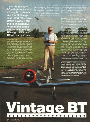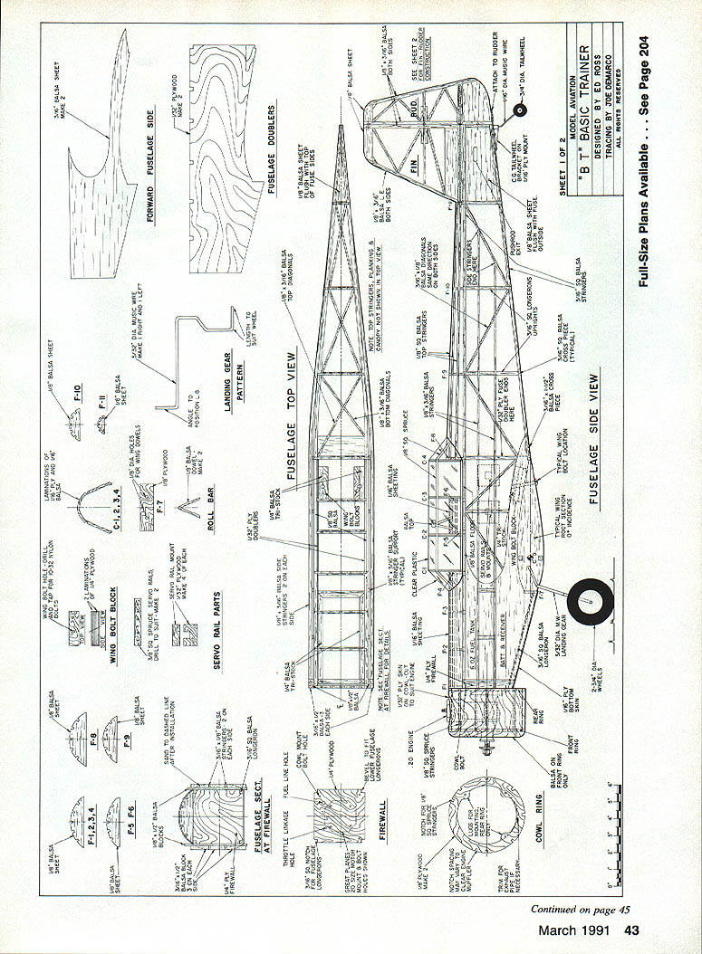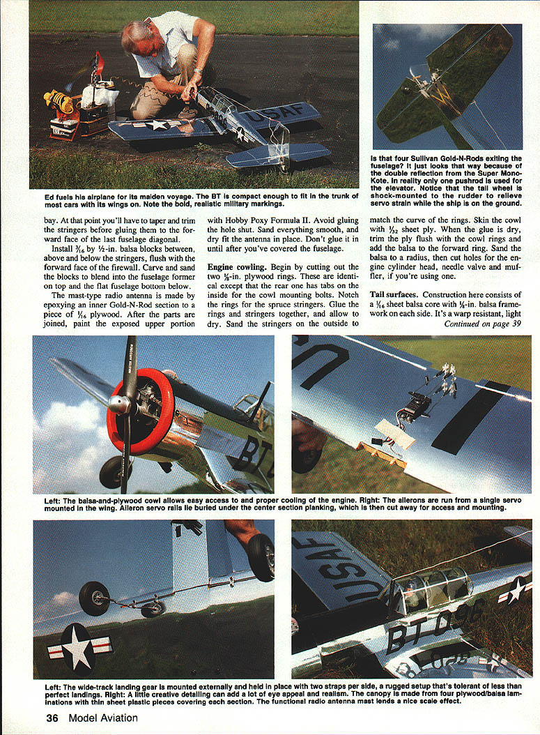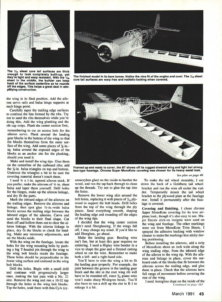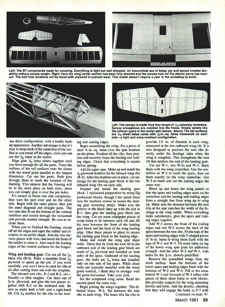 NO OCR TEXT BT three-quarter view sleek attractive lines evoke whole generation vintage military trainers duplicating partic ular airplane models wide landing gear stance gives exceptional ground-handling characteristics especially tail-dragger Rocksteady yet light nimble ship pleasure fly new filer gains confidence can add power really make move upper aft portion last upper crosspiece rear %-in sheet balsa Add servo rails wing mount ing bolt blocks inside fuselage Cut out lower aft portion both lower fuselage longerons install piece /16 ply tail wheel mount good time choose control linkage used Sullivan Gold-N-Rods rudder elevator prototype stall outer portions Gold-N-Rods Secure firmly exit fuse lage rear add cross support middle fuse Leave front ends loose time being throttle used cable inside inner portion GoldN-Rod Secure throttle passes through firewall leaving aft portion free now Fill cockpit floor A-in sheet balsa Cut out formers Install F-i through F-4 F-8 through F-li mak ing sure vertical properly aligned upper crosspieces Add A-in-sq balsa stringers Cover top ward fuselage /16 sheet balsa Install two pieces A-in-sq balsa along sides cockpit insert F-5 F-6 between Add -in balsa stringers cover /16 balsa sheet Make install rollover bar Make canopy frame four canopy hoops C-i through C-4 lamination /16 plywood /16 balsa Cut out ply wood parts first glue /16 sheet balsa ply trim balsa match its shape Cut file notches hoops spruce frame members run fore aft Install hoops checking theyre vertical square notch install straight A-in-sq spruce frame mem bers Add short A-in-sq spruce sticks form edges windshield rear panel canopy will have removed cover fuselage its easier locate properly before covering place two stringers side fuselage installed next resemble formers First glue two pieces / x /2-in sheet balsa fuselage sides flush forward edge firewall glue x nger supports latter should about 1 longjust distance tween /l6 x A-in balsa stringers Glue stringers positioning wide side horizontally maximum width Begin front glue over stringer supports until reach trailing edge wing Aft trailing edge glue stringers fuselage uprights diago nals until reach front last open March 1991 35 Ed Ross poses BT Chrome Super MonoKote stick-on insignia Major Decals give little 20-powered ship military realism belles Its trainer heritage Ed fuels airplane Its maiden voyage BT compact enough fit trunk moat cars its wings Note bold realistic military markings four Sullivan Gold-N-Rods exiting fuselage just looks way because double reflection Super Mono Kote reality pushrod used elevator Notice tall wheel shock-mounted rudder relieve servo strain whlie ship ground bay point youll have taper trim stringers before gluing ward face last fuselage diagonal Install /6 A-in balsa blocks between above below stringers flush forward face firewall Carve sand blocks blend fuselage former top flat fuselage bottom below mast-type radio antenna made epoxying inner Gold-N-Rod section piece /l6 plywood After parts joined paint exposed upper portion Hobby Poxy Formula II Avoid gluing hole shut Sand everything smooth dry fit antenna place Dont glue until after youve covered fuselage Engine cowling Begin cutting out two %-in plywood rings identi cal except rear has tabs inside cowl mounting bolts Notch rings spruce stringers Glue rings stringers together allow dry Sand stringers outside match curve rings Skin cowl /32 sheet ply glue dry trim ply flush cowl rings add balsa forward ring Sand balsa radius cut holes en gine cylinder head needle valve muf fler youre using Tail surfaces Construction consists V16 sheet balsa core A-in balsa frame work side Its warp resistant light Continued page 39 Left The balsa-and-plywood cowl allows easy access ana proper cooing ot inc engine HIgni ne ailerons run single servo mounted wing Aileron servo rails lie buried under center section plankIng cut away access mounting Left The wIde-track landing gear mounted externally held place two straps per aide rugged setup thats tolerant less perfect landings Right little creative detailing can add lot eye appeal realIsm canopy made four plywoodlbalsa lam inations thin sheet plastic pieces covering section functional radio antenna mast lends nice scale effect 36 Model Aviation thick configuration totally builtup appearance Another advantage its easy keep track centerline sur face round off edges since can see /46 sheet center Edge glue 1/16 balsa sheets together until have enough parts Trace outlines tail surfaces onto sheets wood grain parallel longest dimension Cut out parts Push pins through mark location framing ensures framing will same place both sides since can simply glue over pin holes Its easiest frame side completely turn part over other side Begin outer pieces add inner diagonal straight parts two tabs fit bottom vertical stabilizer extend through horizontal stab provide needed strength sure clude youve finished framing round off edges taper rudder el evators airfoil shape Join two ele vator pieces wire notch front rudder clear Also notch leading edges control surfaces hinges Wing landing gear Cut out /l6 balsa ribs R-4 Make template /46 plywood speed up job work carefully wont have sand ribs after cutting out template inboard root ribs R-1 R-2 literallya little tougher Cut out A-in plywood glue two pieces gether R-2 outboard side sure make both left- right-hand rib Cut /46 notches ribs leading trailing edges Begin assembling wing Pin piece hard A-in-sq balsa over spar location plans Position ribs posi tion securely brace leading trail ing edges Check everything square before gluing Add upper spar Make up install 42 plywood doublers inboard wing ribs R-3 After doublers place cut op enings landing gear block two inboard wing ribs side Prepare install landing gear block minimized preparation using Sig preformed blocks though did install blind nuts machine screws secure land ing gear mounting straps Make sure groove block lines up slot R- 