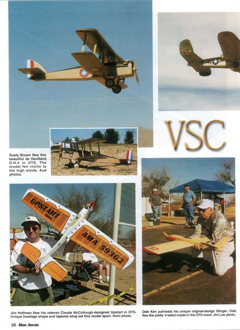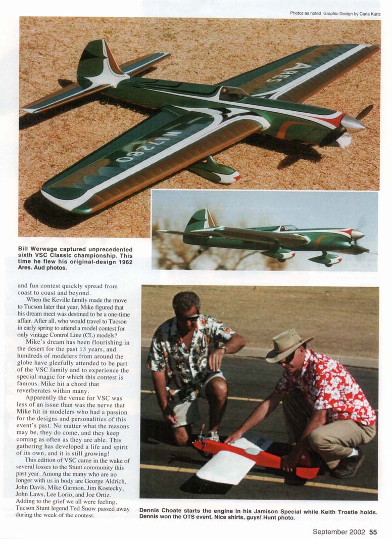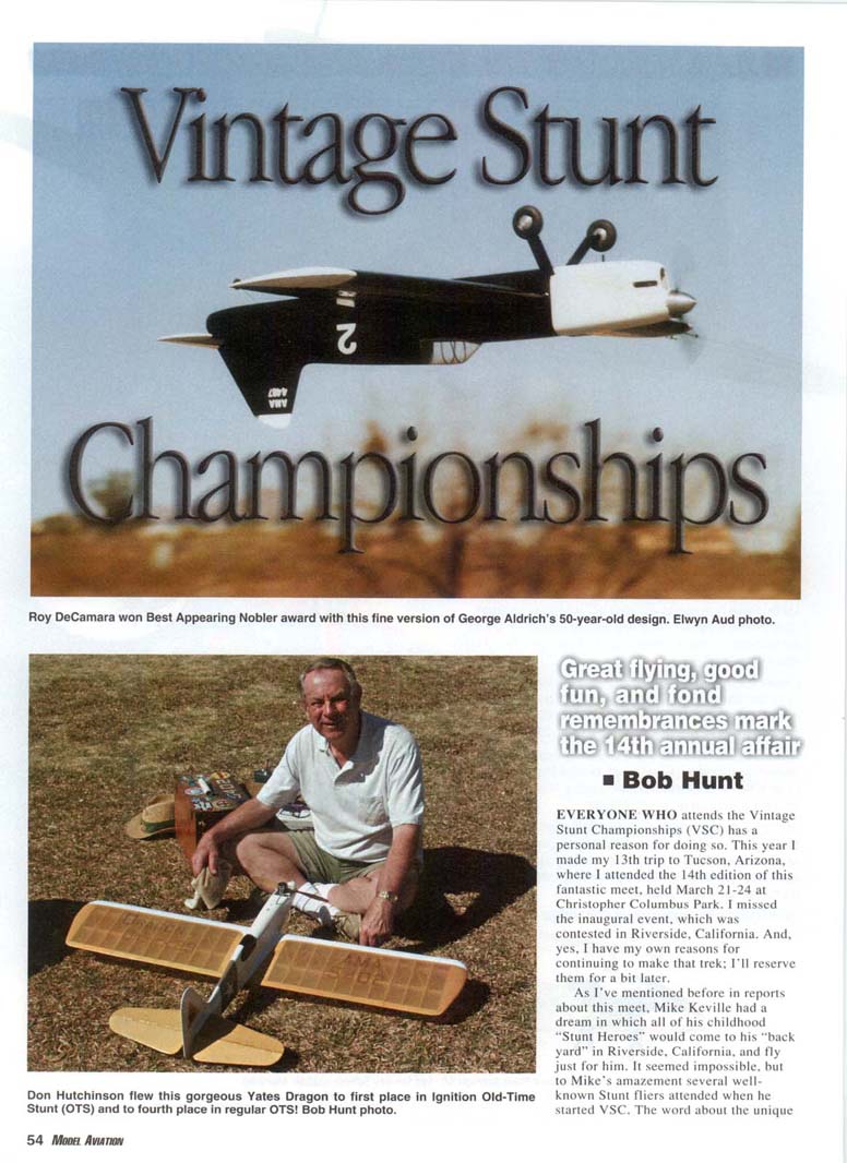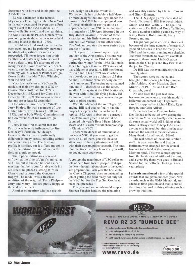 Roy DeCamara won Best Appearing Nobler award with this fine version of George Aldrich's 50-year-old design. Elwyn Aud photo. Don Hutchinson flew this gorgeous Yates Dragon to first place in Ignition Old-Time Stunt (OTS) and to fourth place in regular OTS! Bob Hunt photo. • Bob Hunt EVERYONE WHO attends the Vintage Stunt Championships (VSC) has a personal reason for doing so. This year I made my 13th trip to Tucson, Arizona, where I attended the 14th edition of this fantastic meet, held March 21-24 at Christopher Columbus Park. I missed the inaugural event, which was contested in Riverside, California. And, yes, I have my own reasons for continuing to make that trek; I'll reserve them for a bit later. As I've mentioned before in reports about this meet. Mike Keville had a dream in which all of his childhood "Stunt Heroes" would come to his "back yard" in Riverside, California, and fly just for him. It seemed impossible, but to Mike's amazement several well-known Stunt fliers attended when he started VSC. The word about the unique 54 MooaAvunw Bill Werwage captured unprecedented sixth VSC Classic championship. This time he flew his original-design 1962 Ares. Aud photos. and fun contest quickly spread from coast to coast and beyond. When the Keville family made the move to Tucson later that year. Mike figured that his dream meet was destined to be a one-time affair. After all, who would travel to Tucson in early spring to attend a model contest for only vintage Control Line (CL) models? Mike's dream has been flourishing in the desert for the past 13 years, and hundreds of modelers from around the globe have gleefully attended to be part of the VSC family and to experience the special magic for which this contest is famous. Mike hit a chord that reverberates within many. Apparently the venue for VSC was less of an issue than was the nerve that Mike hit in modelers who had a passion for the designs and personalities of this event's past. No matter what the reasons may be, they do come, and they keep coming as often as they are able. This gathering has developed a life and spirit of its own, and it is still growing! This edition of VSC came in the wake of several losses to the Stunt community this past year. Among the many who are no longer with us in body are George Aldrich, John Davis, Mike Garmon, Jim Kostecky, John Laws, Lee Lorio, and Joe Ortiz. Adding to the grief we all were feeling, Tucson Stunt legend Ted Snow passed away during the week of the contest. Dennis Choate starts the engine in his Jamison Special while Keith Trostle holds. Dennis won the OTS event. Nice shirts, guys! Hunt photo. September 2002 55 Rusty Brown flew this beautiful de Havilland D.H.4 in OTS. The model fell victim to the high winds. Aud photos. Jim Hoffman flew his veteran Claude McCollough-designed Upstart in OTS. Dale Kirn pull-tests his unique original-design Stinger. Dale Unique fuselage shape and tapered wing set this model apart. Hunt photo. flew the pretty V-tailed model in the OTS event. Jim Lee photo. 56 MooaAvurm LeRoy Black wowed everyone with his Classic-legal Paul DelGatto-designed B-25 bomber. Aud photo. Keith Trostle flew his Al Rabe-designed Bearcat to a great second-place finish in Classic. Al's new and larger Bearcat is at the top. Aud photos. Charlie Bruce holds his Leon Shulman-designed Hot Rock. The model featured a Drone diesel for power! Lee photo. Mark Gerber's Spirit of '64-winning Thunderbird II sets in front of anotner Bob Palmer design—the Skyscraper—which Ray Firkins recently restored. Aud photo. September 2002 57 Results in "Focus on Competition" Charlie Reeves repainted his venerable Yo-Yo model in the famous all-red Arlie Prezzler built this gorgeous rendition of Hi Johnson's Kenh P-38 "Yippee" scheme. He finished ninth in DTS this time. Lee photo. text for details! Aud photo. This is a true Stunt legend! Bob Palmer holds his original-design Skyscraper The pit area at a VSC is always very busy on competition day and is shown with another Palmer production: his daughter Carol. Hunt photo. Stunt's past. Hunt photo. 58 Mona AVIATION Jim Kraft flew this Yates Dragon in the Classic Stunt event! The well-built aircraft featured a Fox .35 for power. This is a popular design at VSC. Aud photo. anther. This model is a Bob Hunt favorite. See Jerry Phelps built this awesome replica of his original Patriot design from the 1970s. It featured an AeroTiger .36 for power and placed third in Classic. Aud photo. ere you will see a wide variety of models from John Simpson's Cavalier is a popular choice for Classic Stunt. Clockwise from upper left are Rich Oliver, Ed Capitanelli, Mark Smith, John Simpson with theirs. Aud photo. Ted designed the popular Old-Time Stunt (OTS) design the Humongous. and several were flown in competition at the meet. It was poignant to watch these models t'ly knowing that Ted had just left us. Members of the host club —the Cholla Choppers-conducted an emotion-filled farewell flight for Joe Ortiz. who was a member. They flew one of Joe's Stunt models during a break in the Classic event, and each took a turn at the handle for a few laps. I think many felt the combined presence of the spirits of all our fallen brethren. The passing of George Aldrich hit especially hard. He will forever be remembered as one of the most successful Stunt fliers and as one of the most giving personalities this event and this hobby have ever known. To list his accomplishments here would be impossible, but modelers the world over owe George a great debt of gratitude for his caring involvement. In celebration of George's life in modeling and in recognition of the Nobler's 50th anniversary, two new awards were given at the contest. John "Doc" Holliday captured the GMA Memorial Award with his great-flying 1952 Nobler. The Best Appearing Nobler award went home with Roy DeCamara, who flew a faithful and beautifully finished rendition of George's original model. Julie Aldrich. George's widow, was