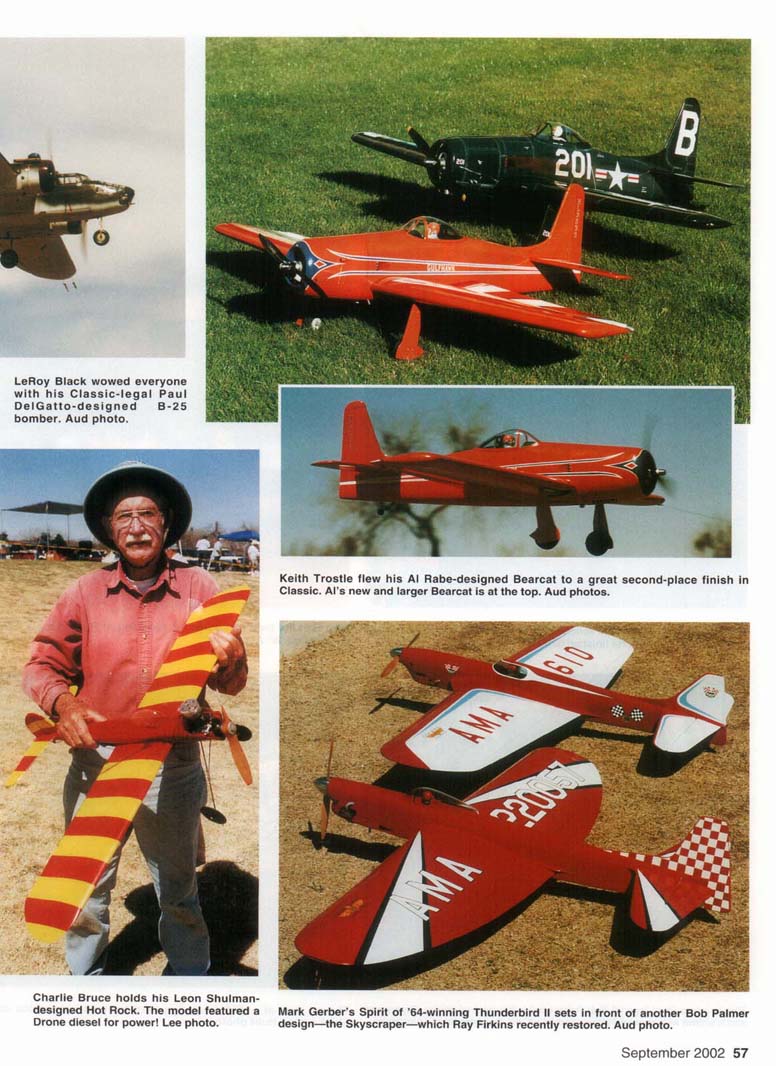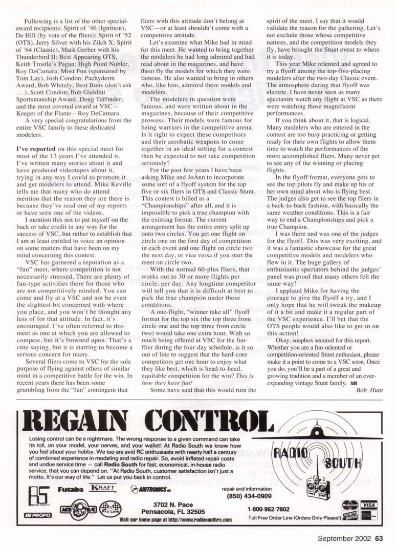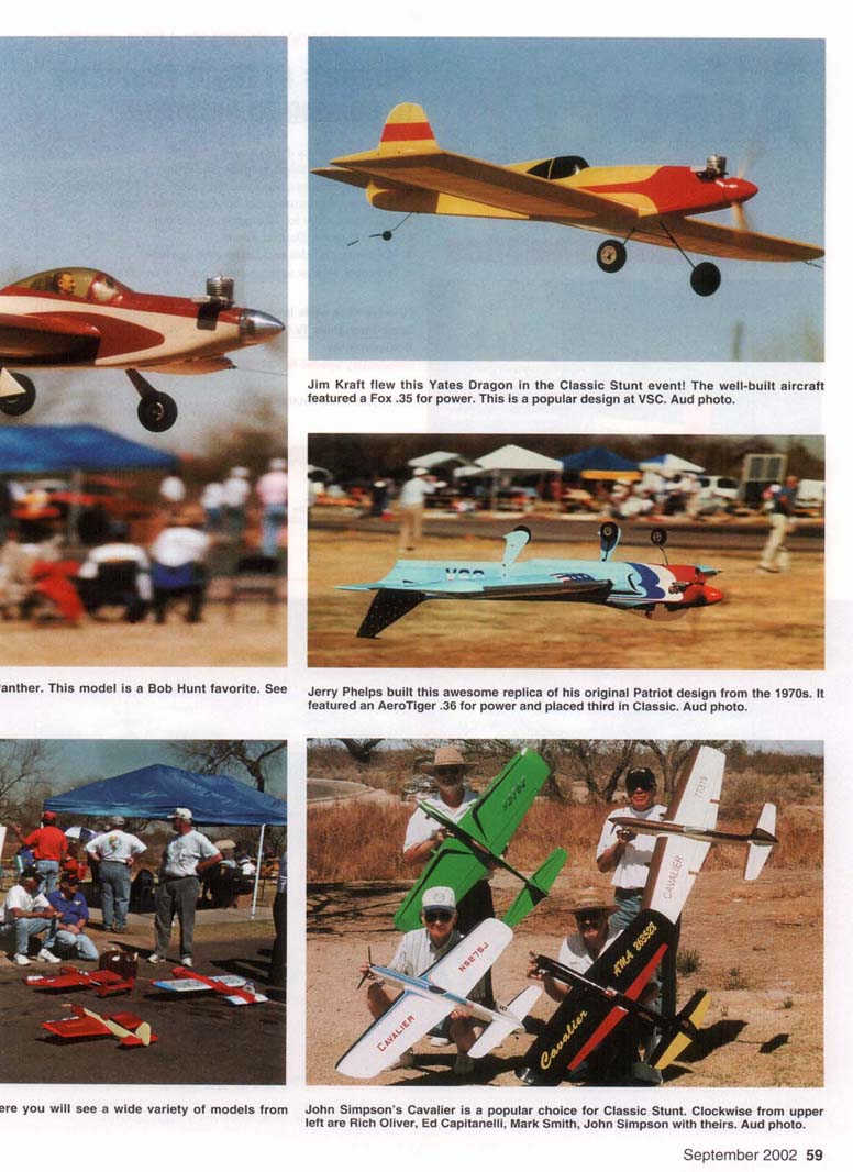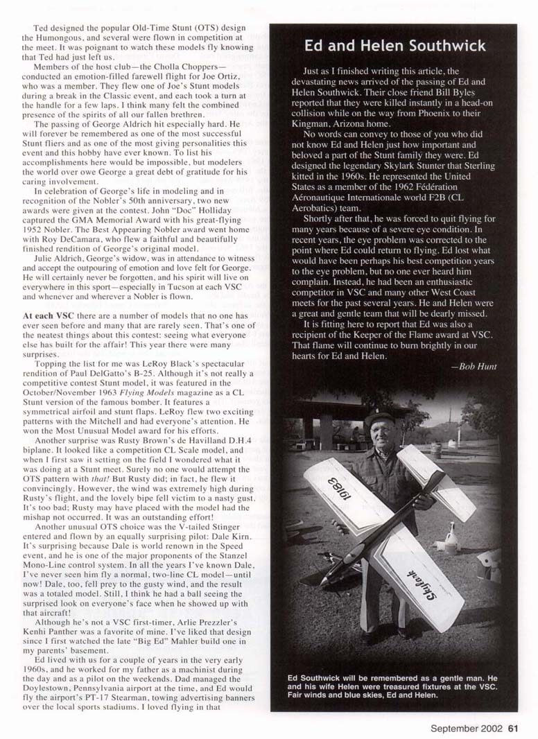 Roy DeCamara won Best Appearing Nobler award with this fine version of George Aldrich's 50-year-old design. Elwyn Aud photo. Don Hutchinson flew this gorgeous Yates Dragon to first place in Ignition Old-Time Stunt (OTS) and to fourth place in regular OTS! Bob Hunt photo. • Bob Hunt EVERYONE WHO attends the Vintage Stunt Championships (VSC) has a personal reason for doing so. This year I made my 13th trip to Tucson, Arizona, where I attended the 14th edition of this fantastic meet, held March 21-24 at Christopher Columbus Park. I missed the inaugural event, which was contested in Riverside, California. And, yes, I have my own reasons for continuing to make that trek; I'll reserve them for a bit later. As I've mentioned before in reports about this meet. Mike Keville had a dream in which all of his childhood "Stunt Heroes" would come to his "back yard" in Riverside, California, and fly just for him. It seemed impossible, but to Mike's amazement several well-known Stunt fliers attended when he started VSC. The word about the unique 54 MooaAvunw Bill Werwage captured unprecedented sixth VSC Classic championship. This time he flew his original-design 1962 Ares. Aud photos. and fun contest quickly spread from coast to coast and beyond. When the Keville family made the move to Tucson later that year. Mike figured that his dream meet was destined to be a one-time affair. After all, who would travel to Tucson in early spring to attend a model contest for only vintage Control Line (CL) models? Mike's dream has been flourishing in the desert for the past 13 years, and hundreds of modelers from around the globe have gleefully attended to be part of the VSC family and to experience the special magic for which this contest is famous. Mike hit a chord that reverberates within many. Apparently the venue for VSC was less of an issue than was the nerve that Mike hit in modelers who had a passion for the designs and personalities of this event's past. No matter what the reasons may be, they do come, and they keep coming as often as they are able. This gathering has developed a life and spirit of its own, and it is still growing! This edition of VSC came in the wake of several losses to the Stunt community this past year. Among the many who are no longer with us in body are George Aldrich, John Davis, Mike Garmon, Jim Kostecky, John Laws, Lee Lorio, and Joe Ortiz. Adding to the grief we all were feeling, Tucson Stunt legend Ted Snow passed away during the week of the contest. Dennis Choate starts the engine in his Jamison Special while Keith Trostle holds. Dennis won the OTS event. Nice shirts, guys! Hunt photo. September 2002 55 Rusty Brown flew this beautiful de Havilland D.H.4 in OTS. The model fell victim to the high winds. Aud photos. Jim Hoffman flew his veteran Claude McCollough-designed Upstart in OTS. Dale Kirn pull-tests his unique original-design Stinger. Dale Unique fuselage shape and tapered wing set this model apart. Hunt photo. flew the pretty V-tailed model in the OTS event. Jim Lee photo. 56 MooaAvurm LeRoy Black wowed everyone with his Classic-legal Paul DelGatto-designed B-25 bomber. Aud photo. Keith Trostle flew his Al Rabe-designed Bearcat to a great second-place finish in Classic. Al's new and larger Bearcat is at the top. Aud photos. Charlie Bruce holds his Leon Shulman-designed Hot Rock. The model featured a Drone diesel for power! Lee photo. Mark Gerber's Spirit of '64-winning Thunderbird II sets in front of anotner Bob Palmer design—the Skyscraper—which Ray Firkins recently restored. Aud photo. September 2002 57 Results in "Focus on Competition" Charlie Reeves repainted his venerable Yo-Yo model in the famous all-red Arlie Prezzler built this gorgeous rendition of Hi Johnson's Kenh P-38 "Yippee" scheme. He finished ninth in DTS this time. Lee photo. text for details! Aud photo. This is a true Stunt legend! Bob Palmer holds his original-design Skyscraper The pit area at a VSC is always very busy on competition day and is shown with another Palmer production: his daughter Carol. Hunt photo. Stunt's past. Hunt photo. 58 Mona AVIATION Jim Kraft flew this Yates Dragon in the Classic Stunt event! The well-built aircraft featured a Fox .35 for power. This is a popular design at VSC. Aud photo. anther. This model is a Bob Hunt favorite. See Jerry Phelps built this awesome replica of his original Patriot design from the 1970s. It featured an AeroTiger .36 for power and placed third in Classic. Aud photo. ere you will see a wide variety of models from John Simpson's Cavalier is a popular choice for Classic Stunt. Clockwise from upper left are Rich Oliver, Ed Capitanelli, Mark Smith, John Simpson with theirs. Aud photo. Ted designed the popular Old-Time Stunt (OTS) design the Humongous. and several were flown in competition at the meet. It was poignant to watch these models t'ly knowing that Ted had just left us. Members of the host club —the Cholla Choppers-conducted an emotion-filled farewell flight for Joe Ortiz. who was a member. They flew one of Joe's Stunt models during a break in the Classic event, and each took a turn at the handle for a few laps. I think many felt the combined presence of the spirits of all our fallen brethren. The passing of George Aldrich hit especially hard. He will forever be remembered as one of the most successful Stunt fliers and as one of the most giving personalities this event and this hobby have ever known. To list his accomplishments here would be impossible, but modelers the world over owe George a great debt of gratitude for his caring involvement. In celebration of George's life in modeling and in recognition of the Nobler's 50th anniversary, two new awards were given at the contest. John "Doc" Holliday captured the GMA Memorial Award with his great-flying 1952 Nobler. The Best Appearing Nobler award went home with Roy DeCamara, who flew a faithful and beautifully finished rendition of George's original model. Julie Aldrich. George's widow, was