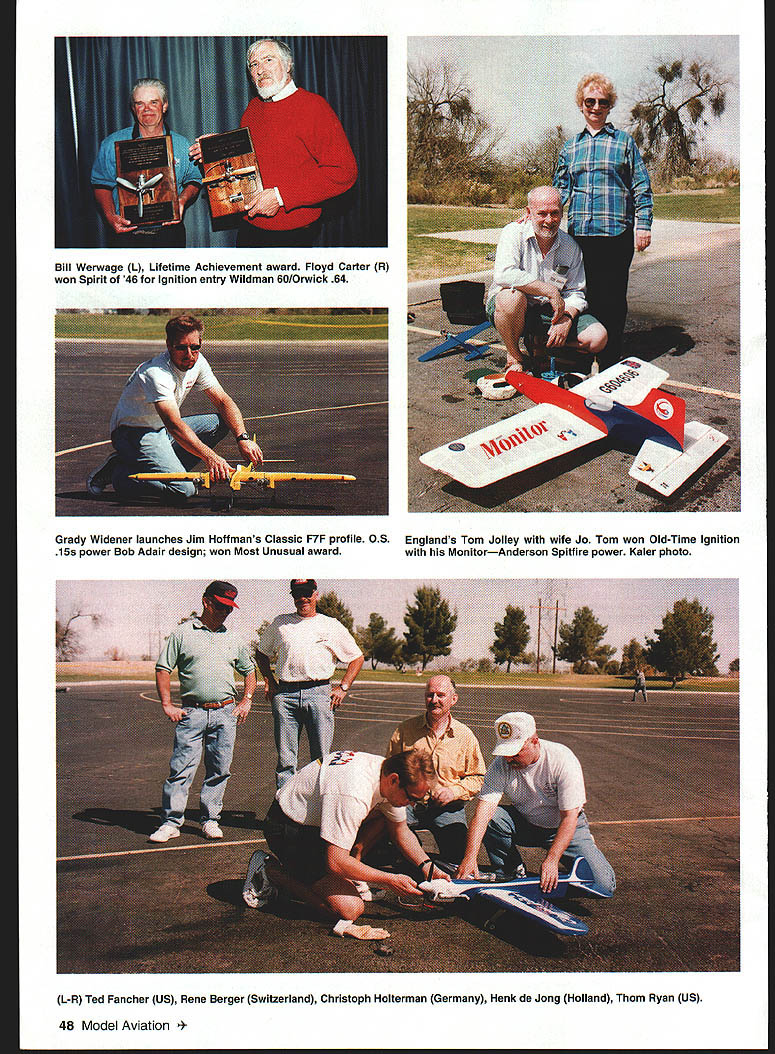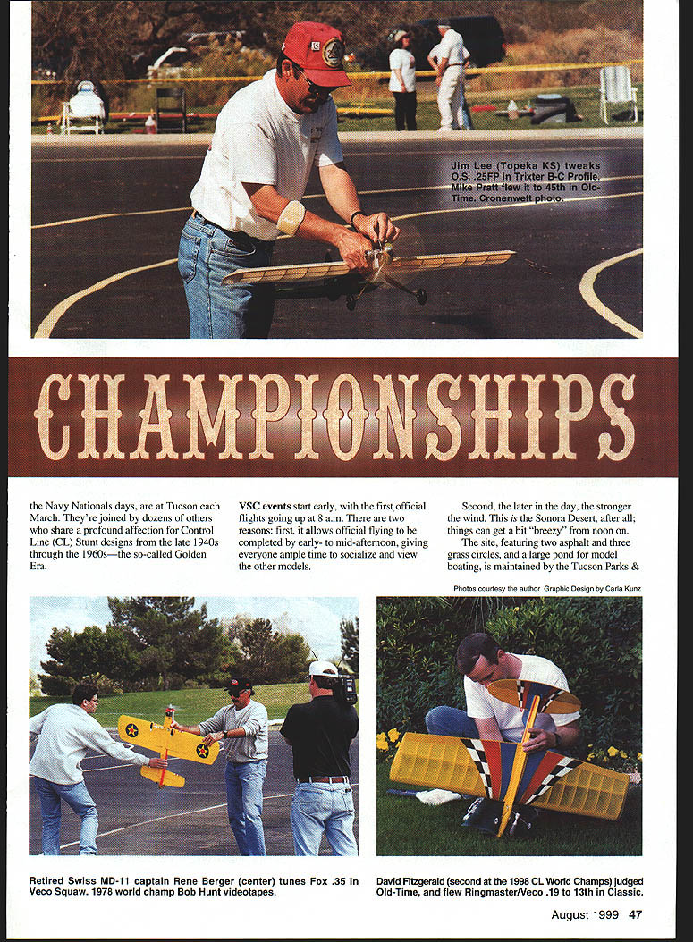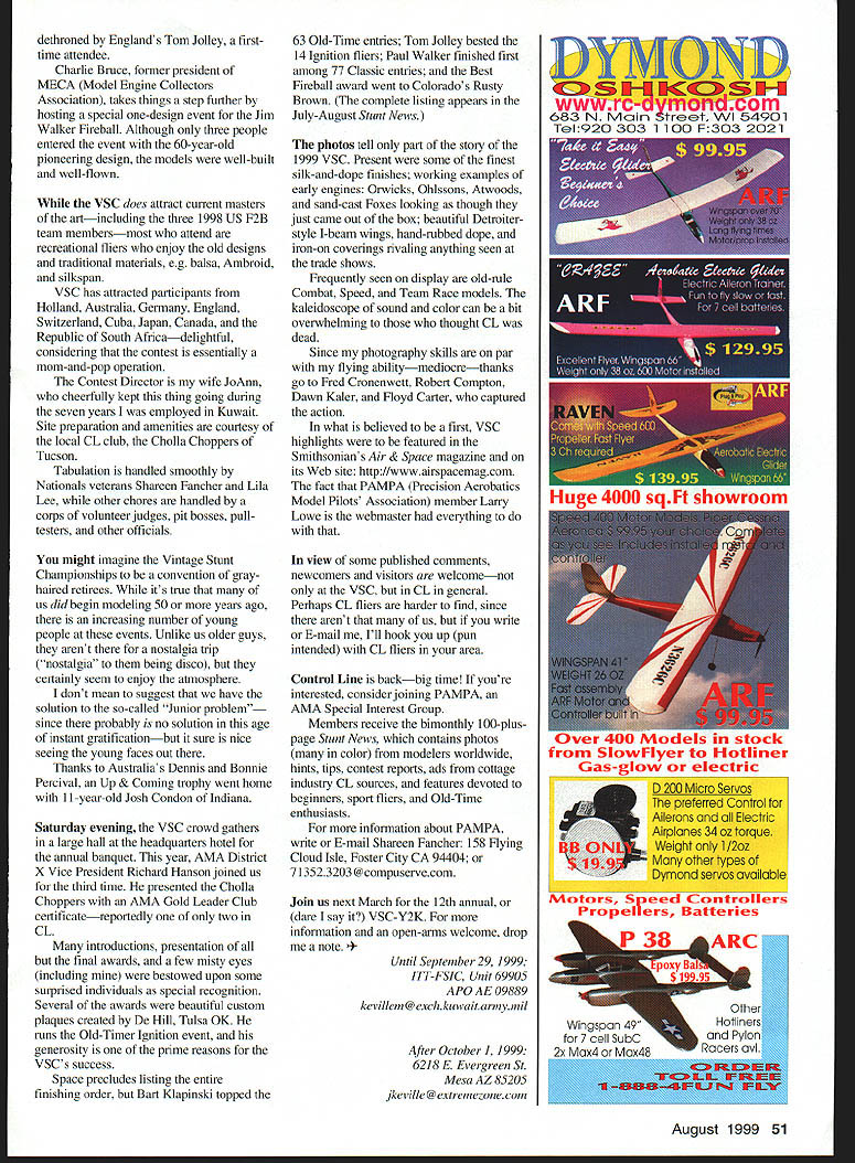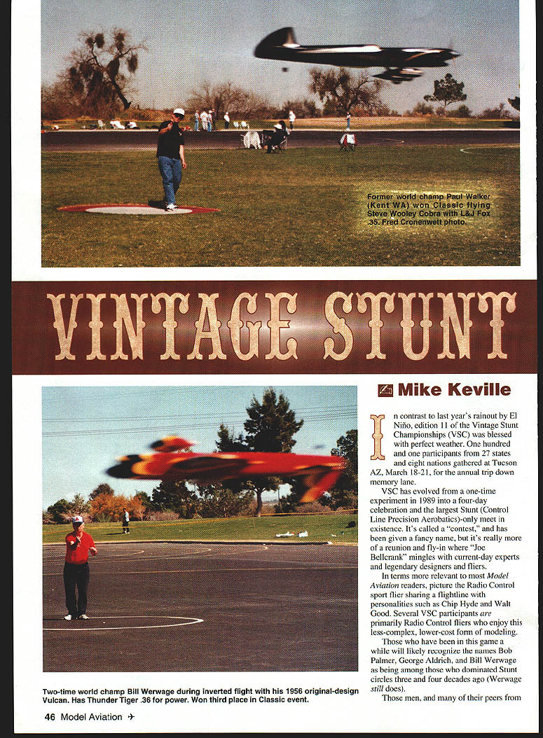 Mike Keville n contrast last years rainout El Nub edition 11 Vintage Stunt Championships VSC blessed perfect weather hundred participants 27 states eight nations gathered Tucson AZ March 18-21 annual trip down memory lane VSC has evolved one-time experiment 1989 four-day celebration largest Stunt Control Line Precision Aerobatics-only meet existence Its called contest has given fancy name its really reunion fly-in Joe Belicrank mingles current-day experts legendary designers fliers terms relevant Model Aviation readers picture Radio Control sport flier sharing flightline personalities such Chip Hyde Walt Good Several VSC participants primarily Radio Control fliers enjoy less-complex lower-cost form modeling have game will likely recognize names Bob Palmer George Aldrich Bill Werwage being among dominated Stunt circles three four decades ago Werwage still does men peers 46 Model Aviation time world champ Bill Werwage during inverted flight 1956 original-design Vulcan Has Thunder Tiger 36 power Won third place Classic event Navy Nationals days Tucson March Theyre joined dozens others share profound affection Control Line CL Stunt designs late 1940s through 1960sthe so-called Golden Era VSC events start early first official flights going up S am two reasons first allows official flying completed early- mid-afternoon giving everyone ample time socialize view other models Second later day stronger wind Sonora Desert after things can get bit breezy noon site featuring two asphalt three grass circles large pond model boating maintained Tucson Parks & Photos courtesy author Graphic Deain hy Carla Kunz Retired Swiss MD-li captain Rene Berger center tunes Fox 35 Veco Squaw 1978 world champ Bob Hunt videotapes David FigemId second 1998 CL World Champs judged Old-Time flew RingmasterNeco 19 13th Classic August 1999 47 Grady Widener launches Jim Hoffmans Classic F7F profile 0S 15s power Bob Adair design won Most Unusual award Englands Tom Jolley wife Jo Tom won Old-Time Ignition MonitorAnderson Spitfire power Kaler photo L-R Ted Fancher US Rene Berger Switzerland Christoph Holterman Germany Henk de Jong Holland Thom Ryan US 48 Model Aviation Werwage L Lifetime Achievement award Floyd Carter R won Spirit 46 Ignition entry Wildman 60/Orwick 64 Recreation Department Its drawback somewhat-limited practice space once competition begins its delightful field darned lucky have days disappearing flying sites events Old-Time Stunt Glow Ignition categories models designed before 1953 flown 195 1-52 AMA pattern Classic Stunt designs prior 1970 using current AMA Precision Aerobatics pattern flight scores secondary importance few contestants since emphasis preserving Stunt history rather collecting trophies Fidelity original design mandatory Old-Time Stunt its optional Classic severe reduction appearance points obvious modifications use traditional materials accessories encouraged awards models best represent spirit respective eras Other awards include beautiful crystal Sportsmanship trophy donated past national champion Bob Gialdini designer Olympic Pilots Choice appearance awards specials addition plaques top five scores event Jim Aron Richmond VA earned VSCs first-ever maximum 20 points Classic appearance judgingwith Ringmaster Pilots Choice Jerry Silvers gleaming metallic-green Atom 1958 I-beam design Art Pawloski spark Ignition event helps remind us glow plug attained instant popularity Entries tend fewer two other categories because nature event however Ignition contestants closely-knit group spending much time helping other guys get air Ive seen senior-citizen spectators cruise Ignition area thousand yard stare eyes past several years categorys undisputed king Don Hutchinson Mansfield TX year Don August1999 49 Eleven-year-old Josh Condon Markieville IN learned fly inverted Wednesday flew officially Thursday Friday dad Scott 1 coaches Kaler photo Clarence Bull Eugene OR O&R-powered Fireball Cronenwett photo Rusty Browns Greeley 00 rare Fireball Bipe published design Nostalgia has spread other CL events Owen Vick restored 1949 legendary Cal Smithignition O&R 33 Carter photo Hell Razor Dooling 61 Did 142 mph built can dethroned Englands Tom Jolley firsttime attendee Charlie Bruce former president MECA Model Engine Collectors Association takes things step further hosting special one-design event Jim Walker Fireball Although three people entered event 60-year-old pioneering design models well-built well-flown VSC does attract current masters artincluding three 1998 US F2B team membersmost attend recreational fliers enjoy old designs traditional materials eg balsa Ambroid silkspan VSC has attracted participants Holland Australia Germany England Switzerland Cuba Japan Canada Republic South Africadelightful considering contest essentially mom-and-pop operation Contest Director wife JoAnn cheerfully kept thing going during seven years employed Kuwait Site preparation amenities courtesy local CL club Cholla Choppers Tucson Tabulation handled smoothly Nationals veterans Shareen Fancher Lila Lee other chores handled corps volunteer judges pit bosses pulltesters other officials might imagine Vintage Stunt Championships convention grayhaired retirees its true us did begin modeling 50 years ago increasing number young people events Unlike us older guys arent nostalgia trip nostalgia being disco certainly seem enjoy atmosphere dont mean suggest have solution so-called Junior problem since probably no solution age instant gratificationbut sure nice seeing young faces out Thanks Australias Dennis Bonnie Percival Up & Coming trophy went home 11-year-old Josh Condon Indiana Saturday evening VSC crowd gathers large hall headquarters hotel annual banquet year AMA District X Vice President Richard Hanson joined us third time presented Cholla Choppers AMA Gold Leader Club certificatereportedly two CL introductions presentation final awards few misty eyes including bestowed upon some surprised individuals special recognition Severa