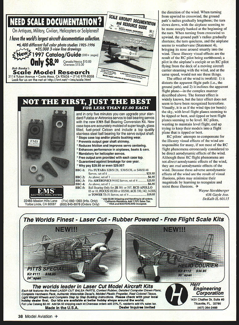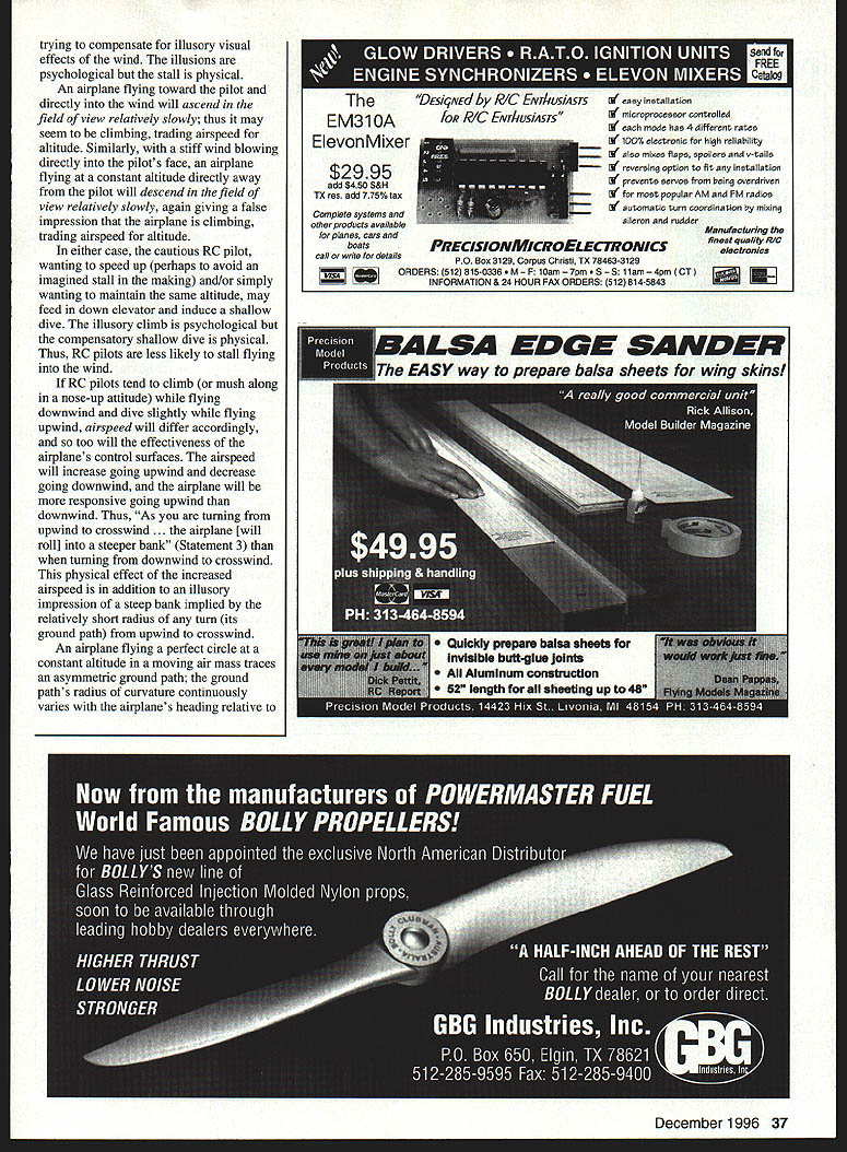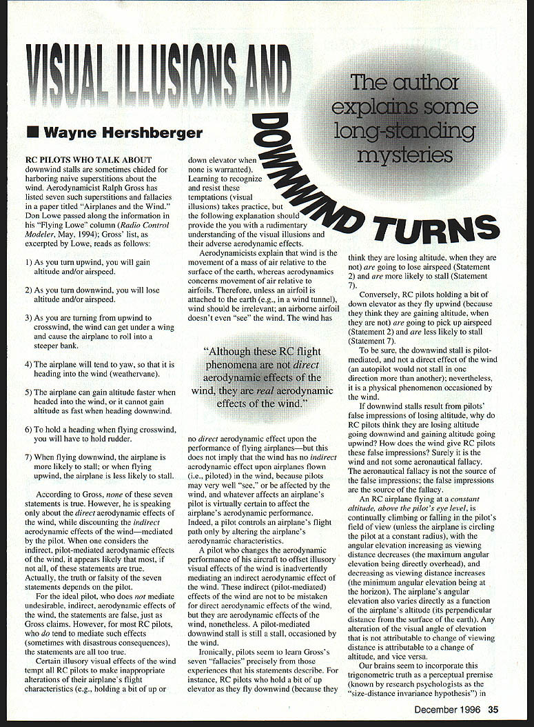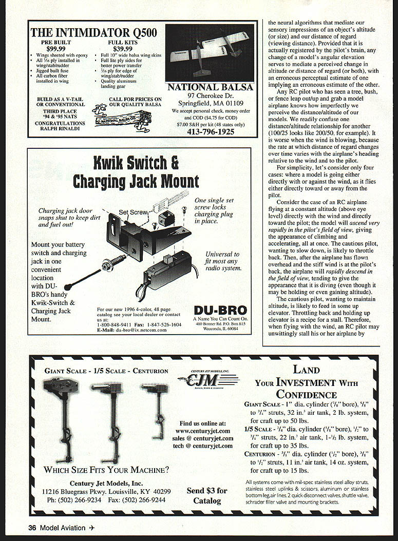 Wayne Hershberger RC PILOTS WHO TALK ABOUT downwind stalls sometimes chided harboring naive superstitions about wind Aerodynamicist Ralph Gross has listed seven such superstitions fallacies paper titled Airplanes Wind Don Lowe passed along information Flying Lowe column Radio Control Modeler May 1994 Gross list excerpted Lowe reads follows 1 As turn upwind will gain altitude and/or airspeed 2 As turn downwind will lose altitude and/or airspeed 3 As turning upwind crosswind wind can get under wing cause airplane roll steeper bank 4 The airplane will tend yaw heading wind weathervane 5 The airplane can gain altitude faster headed wind cannot gain altitude fast heading downwind 6 To hold heading flying crosswind will have hold rudder 7 When flying downwind airplane likely stall flying upwind airplane less likely stall According Gross seven statements true However speaking about direct aerodynamic effects wind discounting indirect aerodynamic effects windmediated pilot considers indirect pilot-mediated aerodynamic effects wind appears likely statements true Actually truth falsity seven statements depends pilot ideal pilot does mediate undesirable indirect aerodynamic effects wind statements false just Gross claims However RC pilots tend mediate such effects sometimes disastrous consequences statements too true Certain illusory visual effects wind tempt RC pilots make inappropriate alterations airplanes flight characteristics eg holding bit up down elevator warranted Learning recognize resist temptations visual illusions takes practice following explanation should provide rudimentary understanding visual illusions adverse aerodynamic effects Aerodynamicists explain wind movement mass air relative surface earth whereas aerodynamics concerns movement air relative airfoils Therefore unless airfoil attached earth eg wind tunnel wind should irrelevant airborne airfoil doesnt see wind wind has w no direct aerodynamic effect upon performance flying airplanesbut does imply wind has no indirect aerodynamic effect upon airplanes flown ie piloted wind because pilots may very well see affected wind whatever affects airplanes pilot virtually certain affect airplanes aerodynamic perfonnance Indeed pilot controls airplanes flight path altering airplanes aerodynamic characteristics pilot changes aerodynamic performance aircraft offset illusory visual effects wind inadvertently mediating indirect aerodynamic effect wind indirect pilot-mediated effects wind mistaken direct aerodynamic effects wind aerodynamic effects wind nonetheless pilot-mediated downwind stall still stall occasioned wind Ironically pilots seem learn Grosss seven fallacies precisely experiences statements describe instance RC pilots hold bit up elevator fly downwind because think losing altitude going lose airspeed Statement 2 and likely stall Statement 7 Conversely RC pilots holding bit down elevator fly upwind because think gaining altitude going pick up airspeed Statement 2 less likely stall Statement 7 sure downwind stall pilotmediated direct effect wind autopilot would stall direction another nevertheless physical phenomenon occasioned wind downwind stalls result pilots false impressions losing altitude RC pilots think losing altitude going downwind gaining altitude going upwind does wind give RC pilots false impressions Surely wind some aeronautical fallacy aeronautical fallacy source false impressions false impressions source fallacy An RC airplane flying constant altitude above pilots eye level continually climbing falling pilots field view unless airplane circling pilot constant radius angular elevation increasing viewing distance decreases maximum angular elevation being directly overhead decreasing viewing distance increases minimum angular elevation being horizon airplanes angular elevation also varies directly function airplanes altitude its perpendicular distance surface earth Any alteration visual angle elevation attributable change viewing distance attributable change altitude vice versa brains seem incorporate trigonometric truth perceptual premise known research psychologists size-distance invariance hypothesis December 1996 35 TURKS THE INTIMIDATOR Q500 FULL KITS $39 99 Full 10 wide balsa wing skins Full lite ply sides better power transfer /is ply edge wing/stab/rudder Quality aluminum landing gear BUILD AS V-TALL OR CONVENTIONAL THIRD PLACE 94 & 95 NATS CONGRATULATIONS RALPH RINALDI CALL FOR PRICES ON QUALITY BALSA PRE BUILT $9999 Wings sbeeted witb epoxy As ply installed wing/stab/rudder Jigged built fuse carbon fiber installed wing UIJJ1J~jit1 97 Cherokee Dr Springfield MA 01109 accept personal cbeck money order COD $475 COD $700 S&H per kit 48 states 413-796-1925 Kwik Switch & Charging Jack Mount Cha rging jack door snaps shut keep dirt fuel out Mount battery switch charging jack convenient location DU BROs hanuy Kwik-Switch & Charging Jack Mount new 1996 4-color 48 page catalog see local dealer contact us 1-800-848-9411 Fax 1-847-526-1604 E-Mail du-bro@ixnetcomcom single set screw locks charging plug place Universal fit radio system DU-BRO Name Can Count 480 Boone Rd PO Box 815 Woacoada IL 60084 neural algorithms mediate sensory impressions objects altitude size distance regard viewing distance Provided actually registered pilots brain change models angular elevation serves mediate perceived change altitude distance regard both erroneous perceptual estimate implying erroneous estimate other Any RC pilot has seen tree bush fence leap outlup grab model airplane knows imperfectly perceive distance/altitude models readily confuse distance/altitude relationship another 100/25 looks like 200/50 example worse wind blowing because rate distance regard changes over time varies airplanes heading relative wind pilot simplicity lets consider four cases model going either directly against wind flies either directly toward away pilot Consider case RC airplane flying constant altitude above eye level directly wind directly toward p