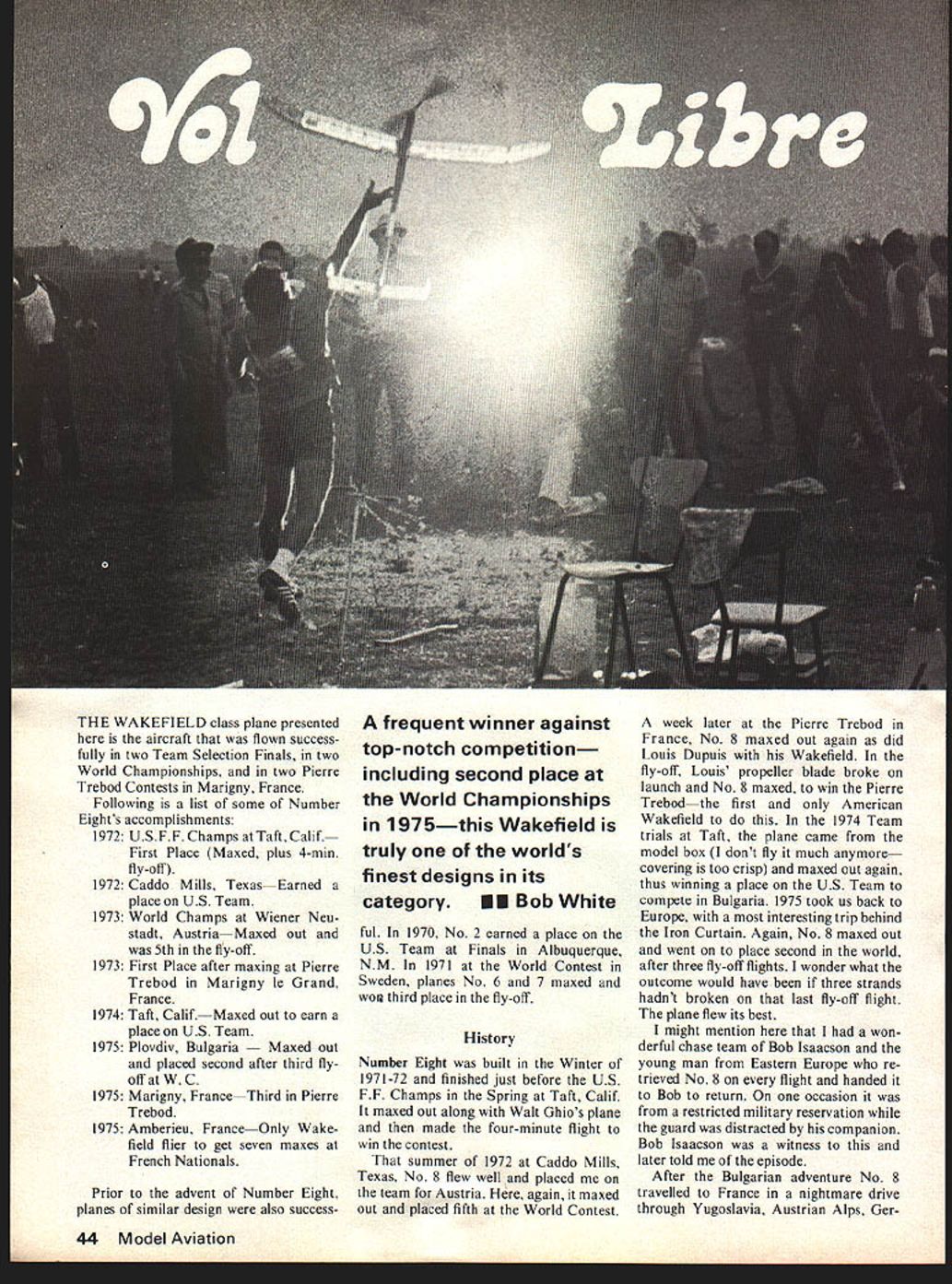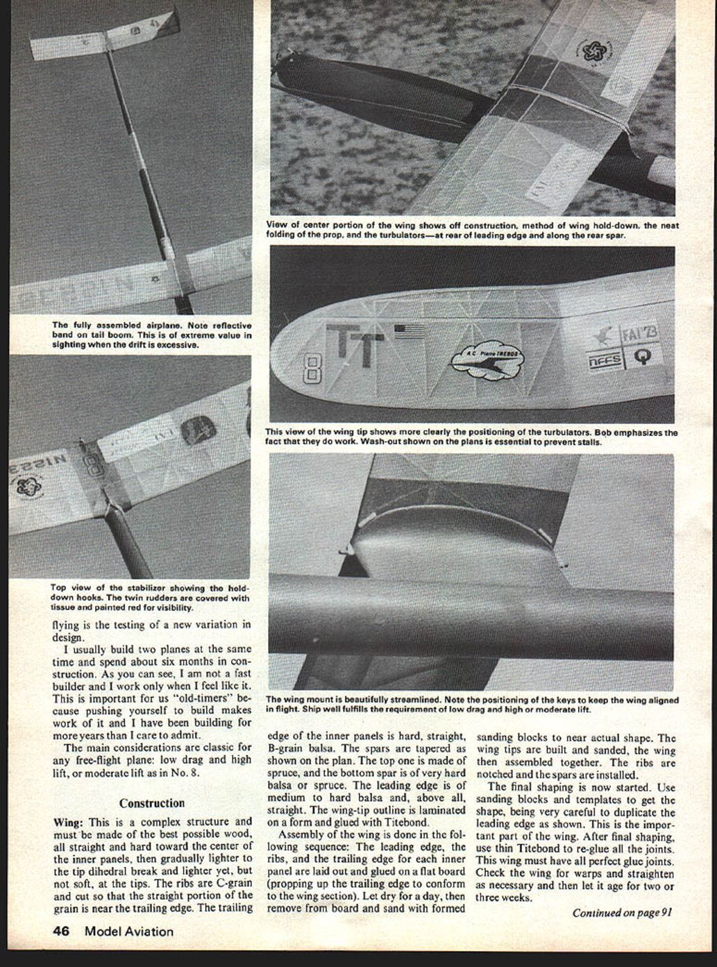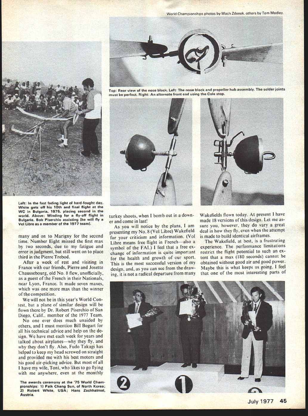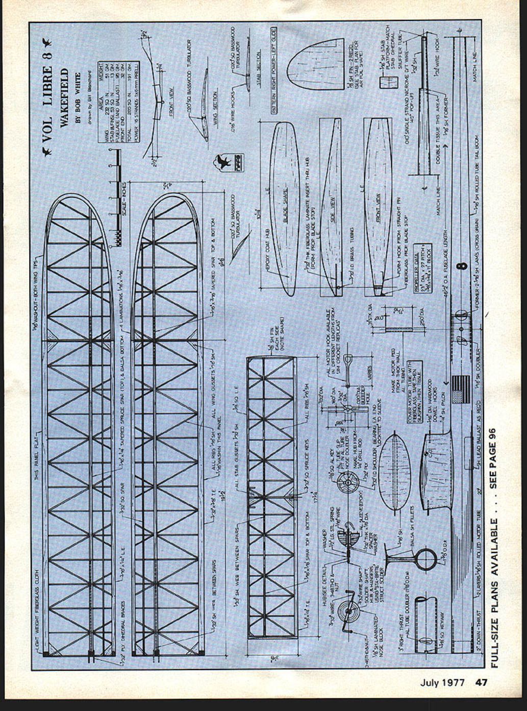 7 THE WAKEFIELD class plane presented aircraft flown success fully two Team Selection Finals two World Championships two Pierre Trebod Contests Marigny France Following list some Number Eights accomplishments 1972 USFF Champs Taft Calif First Place Maxed plus 4-mm fly-off 1972 Caddo Mills TexasEarned place US Team 1973 World Champs Wiener Neu stadt Austria Maxed out 5th fly-off 1973 First Place after maxing Pierre Trebod Marigny le Grand France 1974 Taft CalifMaxed out earn place US Team 1975 Plovdiv Bulgaria d out placed second after third flyoff W C 1975 Marigny FranceThird Pierre Trebod 1975 Amberieu FranceOnly Wake field flier get seven maxes French Nationals Prior advent Number Eight planes similar design also successA frequent winner against top-notch competition including second place World Championships 1975this Wakefield truly worlds finest designs its category EU Bob White ful 1970 No 2 earned place US Team Finals Albuquerque NM 1971 World Contest Sweden planes No 6 7 maxed worn third place fly-off History Number Eight built Winter 197 1-72 finished just before US FF Champs Spring Taft Calif maxed out along Walt Ghios plane made four-minute flight win contest summer 1972 Caddo Mills Texas No 8 flew well placed team Austria again maxed out placed fifth World Contest week later Pierre Trebod France No 8 maxed out again did Louis Dupuis Wakefield fly-off Louis propeller blade broke launch No 8 maxed win Pierre Trebodthe first American Wakefield 1974 Team trials Taft plane came model box dont fly much anymore covering too crisp maxed out again thus winning place US Team compete Bulgaria 1975 took us back Europe interesting trip behind Iron Curtain Again No 8 maxed out went place second world after three fly-off flights wonder what outcome would have three strands hadnt broken last fly-off flight plane flew its best might mention won derful chase team Bob Isaacson young man Eastern Europe re trieved No 8 flight handed Bob return occasion restricted military reservation guard distracted companion Bob Isaacson witness later told episode After Bulgarian adventure No 8 travelled France nightmare drive through Yugoslavia Austrian Alps Ger 44 Model Aviation Marigny second time Number Eight missed first max two seconds due fatigue error judgment still went place third Pierre Trebod After week rest visiting France friends Pierre Josette Chaussebourg old No 8 flew unofficially guest French Nationals near Lyon France made seven maxes max winner competition will years World Con test plane similar design will flown Dr Robert Piserchio San Diego Calif member 1977 Team No ever does much unaided others must mention Bill Bogart technical advice help de sign have met week years talked about airplaneswhy fly dont fly Also Fudo Takagi has helped keep head screwed straight provided best motors good air-picking advice have wife Toni likes go flying anywhere monthly rho awards ceremony 75 World Cham pionships 11 Paik Chang Sun North Korea 2 Robert White USA Hans Zachhalmel Austria World Championships photos Mach Zdenek others Tom Medley turkey shoots bomb out down er come last As will notice plans am presenting No 8 Vol Libre Wakefield criticism information Vol Libre means free flight Frenchalso symbol FAI feel free ex change information quite important health growth sport successful version design can see draw ing radical departure Wakefields flown today present have made 18 versions design Let sure however vary great deal fly attempt made build identical airframes Wakefield best frustrating experience performance limitations restrict flight potential such ex tent max 180 seconds cannot obtained good air good power Maybe what keeps us going feel interesting parts July1977 45 Top Rear view nose block Left nose block propeller hub assembly solder joints must oerfect Right An alternate front end using Cole stop Left In fast fading light hard-fought day White gets off 10th final flight WC Bulgaria 1975 placing second world Above Winding fly-off flight Bulgaria Bob Piserchio assisting Ihe will fly Vol Libre ass member 1977 team flying testing new variation design usually build two planes same time spend about six months con struction As can see am fast builder work feel like important us old-timers cause pushing yourself build makes work have building years care admit main considerations classic free-flight plane low drag high lift moderate lift No 8 Wing This complex structure must made best possible wood straight hard toward center inner panels gradually lighter tip dihedral break lighter yet soft tips ribs C-grain cut straight portion grain near trailing edge trailing edge inner panels hard straight B-grain balsa spars tapered shown plan top made spruce bottom spar very hard balsa spruce leading edge medium hard balsa above straight wing-tip outline laminated form glued Titebond Assembly wing done fol lowing sequence leading edge ribs trailing edge inner panel laid out glued flat board propping up trailing edge conform wing section Let dry day remove board sand formed sanding blocks near actual shape wing tips built sanded wing assembled together ribs notched spars installed final shaping now started Use sanding blocks templates get shape being very careful duplicate leading edge shown impor tant part wing After final shaping use thin Titebond re-glue joints wing must have perfect glue joints Check wing warps straighten necessary let age two three weeks Continuedonpage9l 46 Model Aviation View ot Center portion wing shows off construction method wing hold-down neat folding prop turbulatorsat rear leading edge along rear spar fully assembled airplane Note reflective band tail boom extreme value sighting drift excessive Top view stabilizer showing holddown hooks twin rudders covered tissue painted red visibility view wing tip shows clearly positioning turbulators Bob emphasizes fact work Wash-out shown plans essential prevent stalls wing mount beautifully streamlined Note positioning keys keep wing aligned 