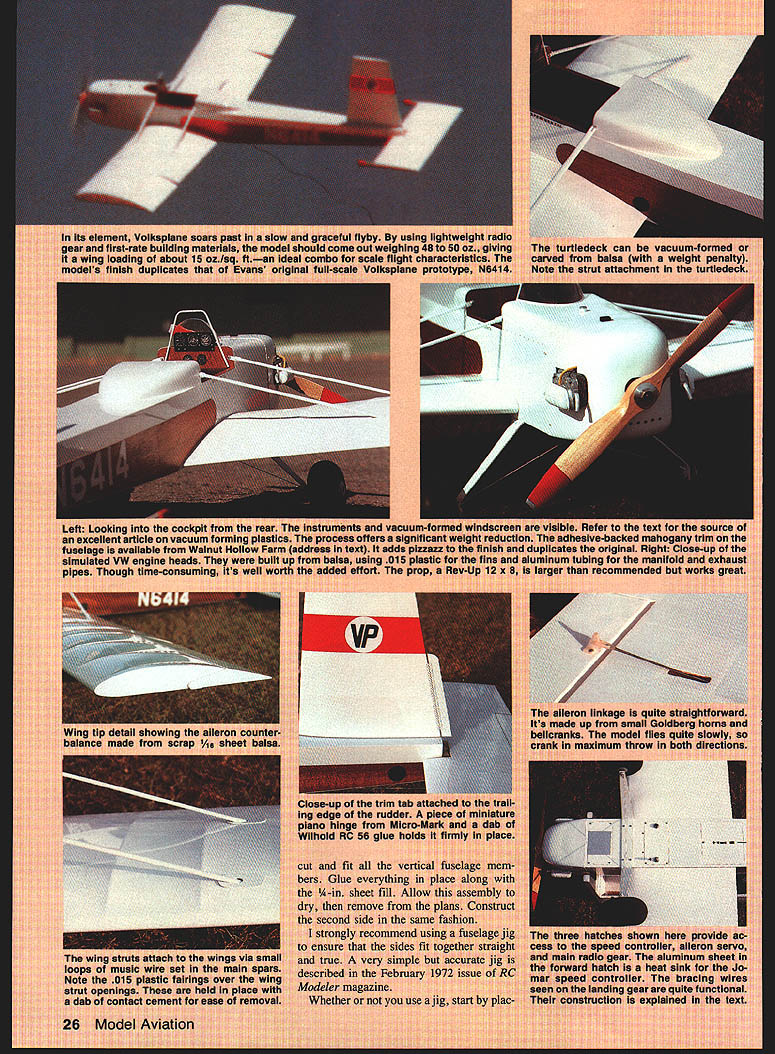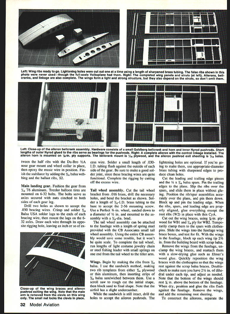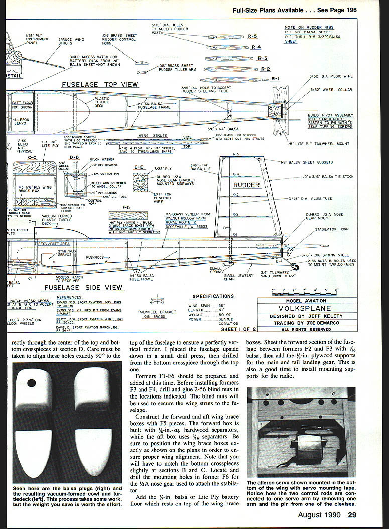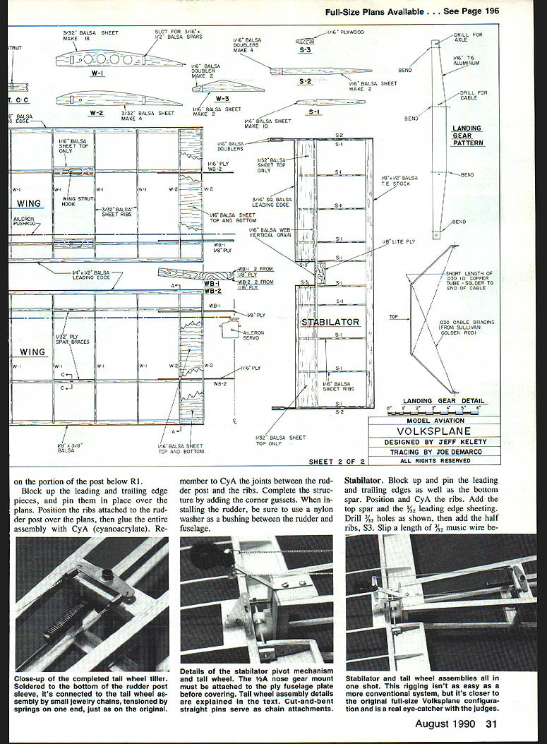 NO OCR TEXT NO OCR TEXT int Voikapian ut-rate bulidin loading ubotj finish duplicate ng ml cc Itartl4 onva avail i fran a hai I~ IT shawl flyby usin out weighing scale flight c Valkaplane ledeck can balsa utattac irar TO INS a-backed original g tar mi n recommends / K. ing 015 rt Pt aiieran made nicranks ank ml guuu uu vertic verything ii ove ti e sa commen ry Si Ipl VOl VKSP lANE JEFFKELETY DIR RLU\TUBING VACUUM FORMW PLPTIC Jf4\ CE Iiif II % SMEET 2RLP Y8 LITE PLY z REET % PLY VRGUUtA FORD PL%TIC 0I5 PL%TIC CmLING FIN8 PETWEU4 ILR 1-6RLUM 1 V4 Q RLR HEET BiLt5P J4 BRL8TE PRR TRELER 4 BILLN WHEEL rbu OPL YOUR WIFE IT5OKT NrTHING FOR RVIflTION iS HER AIOTtO ICL~ 7RI x Y2 BRLR PFIR FRMOU LRT WORD5 QXLE LE. xYz TE RIBS ing both fuselage sides upside down 900 building board Glue crosspieces section station just aft section C dry draw two sides together tail glue end crosspieces ensure straight fuselage mark 3/3201 TUBING COWLING SIDE VIEW COOLING FINS MADE FROM 015 PLASTIC SHEET SANDWICHED BETWEEN 1/32 BALSA REMAINDER IS MADE FROM BALSA AND ALUMINUM TUBE D THRUST ti ALUM L G 1/16 BALS SHEETINS A- F-S I/B BALSA SHEET F-I I/B FLY MOUNTING 74 HOLES MARKED FORI JTEC OS ELECTRICI MOTOR MOUNTI 1/16 BALSA SHEET VACUUM FORMEDA PLASTIC COWL I/B TO 2SPEED DOWN THRUSTCONTROL AREA ASTRO- FLIGHT GEARED OS COBALT MOTOR-MOUNTEDA ON JTEC ELECTRIC MOUNT I/B PLY LANDING GEAR MOUNT 77 1A6 ALUM L 0 SEE SHEET 3 FOR PATTERN centerlines end crosspieces align centerline drawn build ing board before gluing Fill remaining crosspieces glue place Before adding formers drill 3A6-dia rudder post holes run di28 Model Aviation fuselage begins take shape jig described February 1972 issue RCM makes easier build straight true fuselage However Isnt absolutely necessary close-up view Astro Flight geared 05 cobalt motor Installed firewall JTec aluminum mount direct-drive 15 cobalt motor can easily installed will probably drive Volkapiane little authority drilled tabs attaching cowling radio gear except aileron servo fits neatly fuselage bay aft section C 1A-in Lite Ply receiver-and-battery tray removable ease installation service seven-cell 1200 mAh battery pack secured floor compartment adhesive-backed Velcro strips its exact loca tion must shifted fore aft achieve correct CG center-of-gravity should 25% 30% wing chord Full-Size Plans Page 196 5/32 DIA HOLES TO ACCEPT RUDDER POST L32 PLY016 BRASS SHEET R5 INSTRUMENTSPRUCE WINGRUDDER CONTROL PANELSTRUTSHORN R-4 BUILD ACCESS HATCH FOR BATTERY PACK FROM I/B-016 BRASS SHEET BALSA SHEET-NOT SHOWN RUDDER TILLER ARM R-2 IETAI NOTE ON RUDDER RIBS R-I BALSA SHEET R-2 THRO 3/32 BALSA SHEET 3/32 OIA MUSIC WIRE 3/32 WHEEL COLLAR 7 BUILD T ASSEMBLY INTO STABILATOR FASTEN TO FR WITH2 SELF TAPPING SCREWS FUSELAGE TOP VIEW 3 B DIA HOE DACCEPT RUDDER S EERNG TUBE III C flFIII[jTORTE4S0 BALSA NOT SHOWNIIIDECKF SELAGE FRAME II II_______________________________________________ I I________ 3B SA W NG STRUTSOR BROOD HOFED NO STRUTS I/B LITE PLY TAILWHEEL MOUNT AILERONI SERVOI II I/lA NYROD ADAPTOR WITH END TAPPED N EPODIED INTO PLACE 2-SRF-4 I/B BLINDLITE PLY LYNUT TYPICALSAND TO STREAMLINES DRAPE C-CD-DNYLON WASHER I3/B WHEP REARINGE-E3/32 PLY CS AR -- R PIN DUBRO 1/2 NOSE GEAR BRACKET IER ARM SOLDERED1o--H%A MOUNTED SIDEWAYS [F-S 1/16 PLY WINGIWHEEL COLLAR BRACE BOXI RIRAEXIT FOR S/IA AD TOREPUSHROD CONTROLWIRE VA S PACER TO HORN N TAP FORFLOOR_____ SOCKET HEAD S TO SECAREVACUUM FORMED CPLASTIC TURTLE -]DECK7 TO ACCEPT UTS~ RECV/BATT AREA J RL SERVOS C--ACCESS HATCH TO RECEIVER FUSELAGE SIDE VIEW II/ 5-5 BALSA SFFEET GUSSETS 3/161/41111115 RUDDER 5/32 DIA ALUM TUBE Id rNk cT~ 7 1/2 3/16 BALSA T E STOCK GD-RHO 1/2 NOSE OEAR MOUNT STABILISTOR HORN -S/IA DIR SPRING STEEL 2-56NUTS H BOLTS USED --TOMOUNT T/W ASSEMBLY 3/4 TAILWHEEL SMALL JEWELRY SAND DOWN TO 1/2 FUSE FRAMECHAIN I034 4 PROM I/H /4 SPHUC5TOP F-5 PLY-MAAE4BOILO WINS BRACE BORES WITH I/B 55 PLY SEPARATOR /ILYSEPORATOR MAHOGANY VENEER FROM WALNUT HOLLOW FARM RURAL ROUTE 2 0 GEVILLE WI 53533 NOTCH 1/4 0 CROSS S AT B & C TO ACCEPT BRACE BOX XLER 2-3/4 DIA LOGFJ WHEELS REFERENCES EVANS W S SPORT AVIATION MAY IRAN PP SO-3S EVANS WS VP INFO HIT FROM EVANS AIRCRAFT REATY JW SPORT AVIATION APRIL INTl PP 30-33 DAVIS 0 SPORT AVIATION MARCH IBBI SPECIFICATIONS TAILWHEEL BRACKET 016 S WINO SPAN56 LENGTH -41 WEIGHT50 OZ POWERGEARED COBALT 05 SHEET MODEL AVIATION VOLKSPLANE DESIGNED BY 3EFF KELETY TRACING BY 30E DEMARCO 2 L RIGHTS m~vn rectly through center top bot tom crosspieces section D Care must taken align holes exactly 90W top fuselage ensure perfectly ver tical rudder placed fuselage upside down small drill press drilled bottom crosspiece through top Formers Fl -F6 should prepared added time Before installing formers F3 F4 drill glue 2-56 blind nuts locations indicated blind nuts will used secure wing struts fu selage Construct forward aft wing brace boxes F5 pieces forward box built A-in -sq hardwood separators aft box uses AR separators sure position wing brace boxes ex actly shown plans order en sure proper wing alignment Note will have notch bottom crosspieces slightly sections B C Locate drill mounting holes former F6 hA nose gear used attach stabila tor Add %-in balsa Lite Ply battery floor rests top wing brace boxes Sheet forward section fuse lage between formers F2 F3 AR balsa add A-in plywood supports main tail landing gear also good time install mounting sup ports radio August 1990 29 BALSA EET Seen balsa plugs right resulting vacuum-formed cowl tur tiedeck left process takes some work weight save worth effort aileron servo shown mounted bot tom wing servo mounting tape Notice two control rods con nected servo arm removing arm pin devises Complete fuselage cutting slits A-in balsa fill accept wing braces aileron pushrods Cowl turtledeck windshield Rudder components ready final assem bly Construction straightforward rud der pivots %2 aluminum main spar rudder post sleeve 3A6-in-0D brass tubing control horn tiller made 016 brass sheet No
