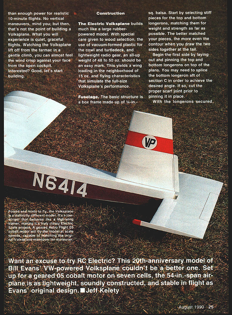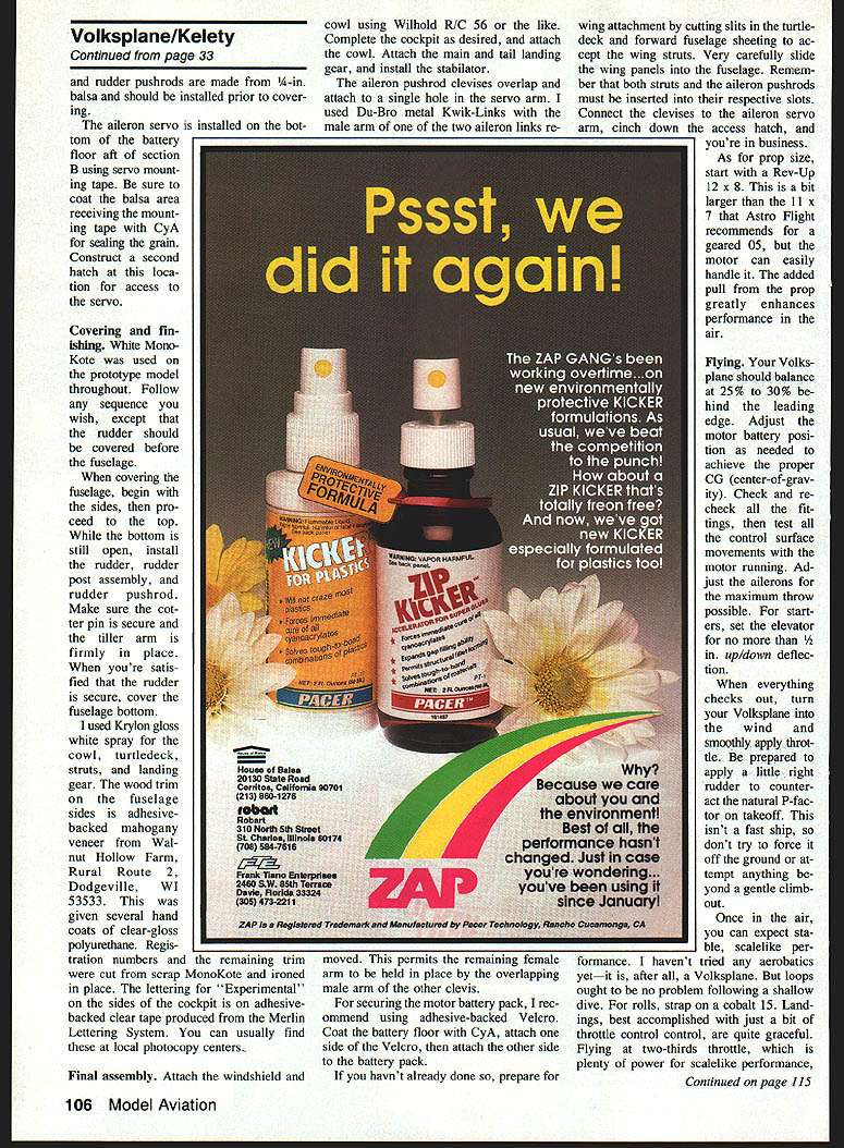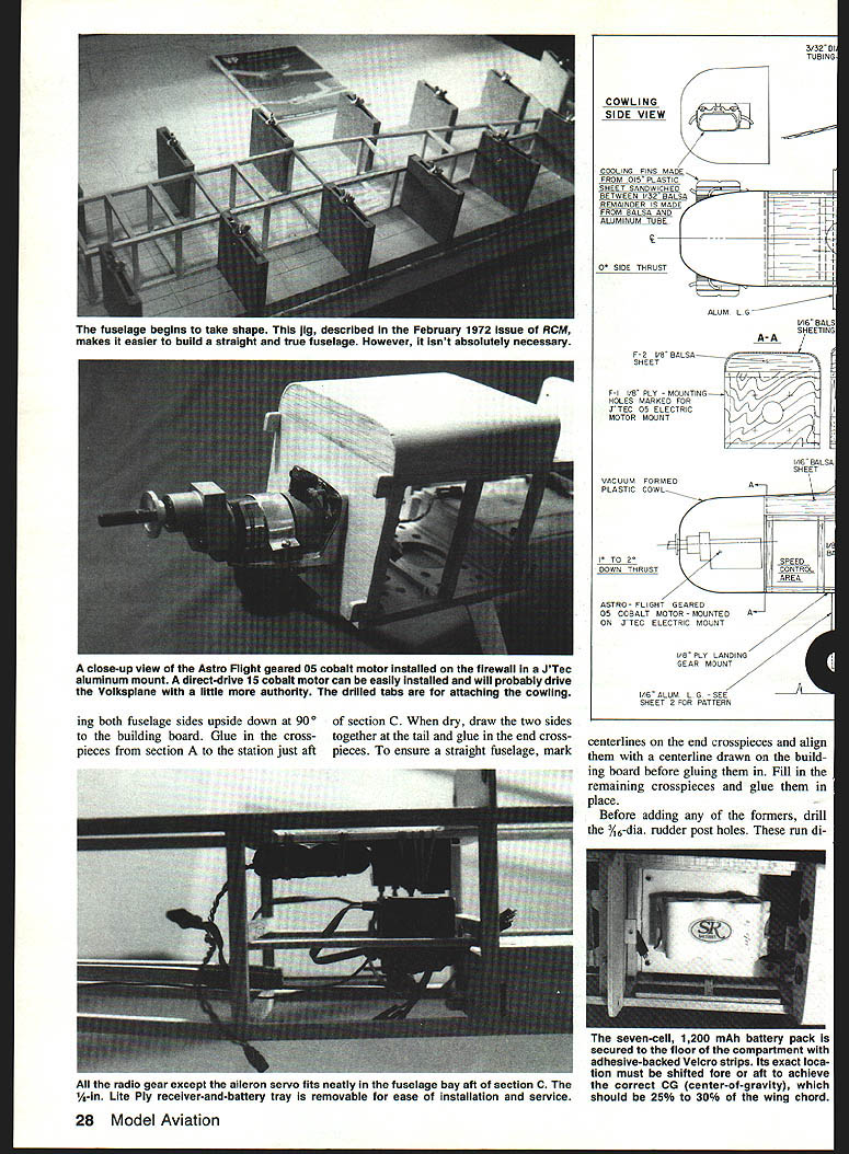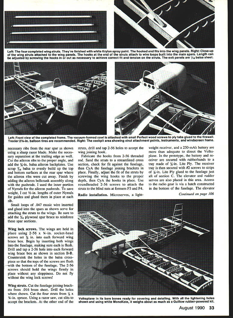 NO OCR TEXT NO OCR TEXT int Voikapian ut-rate bulidin loading ubotj finish duplicate ng ml cc Itartl4 onva avail i fran a hai I~ IT shawl flyby usin out weighing scale flight c Valkaplane ledeck can balsa utattac irar TO INS a-backed original g tar mi n recommends / K. ing 015 rt Pt aiieran made nicranks ank ml guuu uu vertic verything ii ove ti e sa commen ry Si Ipl VOl VKSP lANE JEFFKELETY DIR RLU\TUBING VACUUM FORMW PLPTIC Jf4\ CE Iiif II % SMEET 2RLP Y8 LITE PLY z REET % PLY VRGUUtA FORD PL%TIC 0I5 PL%TIC CmLING FIN8 PETWEU4 ILR 1-6RLUM 1 V4 Q RLR HEET BiLt5P J4 BRL8TE PRR TRELER 4 BILLN WHEEL rbu OPL YOUR WIFE IT5OKT NrTHING FOR RVIflTION iS HER AIOTtO ICL~ 7RI x Y2 BRLR PFIR FRMOU LRT WORD5 QXLE LE. xYz TE RIBS ing both fuselage sides upside down 900 building board Glue crosspieces section station just aft section C dry draw two sides together tail glue end crosspieces ensure straight fuselage mark 3/3201 TUBING COWLING SIDE VIEW COOLING FINS MADE FROM 015 PLASTIC SHEET SANDWICHED BETWEEN 1/32 BALSA REMAINDER IS MADE FROM BALSA AND ALUMINUM TUBE D THRUST ti ALUM L G 1/16 BALS SHEETINS A- F-S I/B BALSA SHEET F-I I/B FLY MOUNTING 74 HOLES MARKED FORI JTEC OS ELECTRICI MOTOR MOUNTI 1/16 BALSA SHEET VACUUM FORMEDA PLASTIC COWL I/B TO 2SPEED DOWN THRUSTCONTROL AREA ASTRO- FLIGHT GEARED OS COBALT MOTOR-MOUNTEDA ON JTEC ELECTRIC MOUNT I/B PLY LANDING GEAR MOUNT 77 1A6 ALUM L 0 SEE SHEET 3 FOR PATTERN centerlines end crosspieces align centerline drawn build ing board before gluing Fill remaining crosspieces glue place Before adding formers drill 3A6-dia rudder post holes run di28 Model Aviation fuselage begins take shape jig described February 1972 issue RCM makes easier build straight true fuselage However Isnt absolutely necessary close-up view Astro Flight geared 05 cobalt motor Installed firewall JTec aluminum mount direct-drive 15 cobalt motor can easily installed will probably drive Volkapiane little authority drilled tabs attaching cowling radio gear except aileron servo fits neatly fuselage bay aft section C 1A-in Lite Ply receiver-and-battery tray removable ease installation service seven-cell 1200 mAh battery pack secured floor compartment adhesive-backed Velcro strips its exact loca tion must shifted fore aft achieve correct CG center-of-gravity should 25% 30% wing chord Full-Size Plans Page 196 5/32 DIA HOLES TO ACCEPT RUDDER POST L32 PLY016 BRASS SHEET R5 INSTRUMENTSPRUCE WINGRUDDER CONTROL PANELSTRUTSHORN R-4 BUILD ACCESS HATCH FOR BATTERY PACK FROM I/B-016 BRASS SHEET BALSA SHEET-NOT SHOWN RUDDER TILLER ARM R-2 IETAI NOTE ON RUDDER RIBS R-I BALSA SHEET R-2 THRO 3/32 BALSA SHEET 3/32 OIA MUSIC WIRE 3/32 WHEEL COLLAR 7 BUILD T ASSEMBLY INTO STABILATOR FASTEN TO FR WITH2 SELF TAPPING SCREWS FUSELAGE TOP VIEW 3 B DIA HOE DACCEPT RUDDER S EERNG TUBE III C flFIII[jTORTE4S0 BALSA NOT SHOWNIIIDECKF SELAGE FRAME II II_______________________________________________ I I________ 3B SA W NG STRUTSOR BROOD HOFED NO STRUTS I/B LITE PLY TAILWHEEL MOUNT AILERONI SERVOI II I/lA NYROD ADAPTOR WITH END TAPPED N EPODIED INTO PLACE 2-SRF-4 I/B BLINDLITE PLY LYNUT TYPICALSAND TO STREAMLINES DRAPE C-CD-DNYLON WASHER I3/B WHEP REARINGE-E3/32 PLY CS AR -- R PIN DUBRO 1/2 NOSE GEAR BRACKET IER ARM SOLDERED1o--H%A MOUNTED SIDEWAYS [F-S 1/16 PLY WINGIWHEEL COLLAR BRACE BOXI RIRAEXIT FOR S/IA AD TOREPUSHROD CONTROLWIRE VA S PACER TO HORN N TAP FORFLOOR_____ SOCKET HEAD S TO SECAREVACUUM FORMED CPLASTIC TURTLE -]DECK7 TO ACCEPT UTS~ RECV/BATT AREA J RL SERVOS C--ACCESS HATCH TO RECEIVER FUSELAGE SIDE VIEW II/ 5-5 BALSA SFFEET GUSSETS 3/161/41111115 RUDDER 5/32 DIA ALUM TUBE Id rNk cT~ 7 1/2 3/16 BALSA T E STOCK GD-RHO 1/2 NOSE OEAR MOUNT STABILISTOR HORN -S/IA DIR SPRING STEEL 2-56NUTS H BOLTS USED --TOMOUNT T/W ASSEMBLY 3/4 TAILWHEEL SMALL JEWELRY SAND DOWN TO 1/2 FUSE FRAMECHAIN I034 4 PROM I/H /4 SPHUC5TOP F-5 PLY-MAAE4BOILO WINS BRACE BORES WITH I/B 55 PLY SEPARATOR /ILYSEPORATOR MAHOGANY VENEER FROM WALNUT HOLLOW FARM RURAL ROUTE 2 0 GEVILLE WI 53533 NOTCH 1/4 0 CROSS S AT B & C TO ACCEPT BRACE BOX XLER 2-3/4 DIA LOGFJ WHEELS REFERENCES EVANS W S SPORT AVIATION MAY IRAN PP SO-3S EVANS WS VP INFO HIT FROM EVANS AIRCRAFT REATY JW SPORT AVIATION APRIL INTl PP 30-33 DAVIS 0 SPORT AVIATION MARCH IBBI SPECIFICATIONS TAILWHEEL BRACKET 016 S WINO SPAN56 LENGTH -41 WEIGHT50 OZ POWERGEARED COBALT 05 SHEET MODEL AVIATION VOLKSPLANE DESIGNED BY 3EFF KELETY TRACING BY 30E DEMARCO 2 L RIGHTS m~vn rectly through center top bot tom crosspieces section D Care must taken align holes exactly 90W top fuselage ensure perfectly ver tical rudder placed fuselage upside down small drill press drilled bottom crosspiece through top Formers Fl -F6 should prepared added time Before installing formers F3 F4 drill glue 2-56 blind nuts locations indicated blind nuts will used secure wing struts fu selage Construct forward aft wing brace boxes F5 pieces forward box built A-in -sq hardwood separators aft box uses AR separators sure position wing brace boxes ex actly shown plans order en sure proper wing alignment Note will have notch bottom crosspieces slightly sections B C Locate drill mounting holes former F6 hA nose gear used attach stabila tor Add %-in balsa Lite Ply battery floor rests top wing brace boxes Sheet forward section fuse lage between formers F2 F3 AR balsa add A-in plywood supports main tail landing gear also good time install mounting sup ports radio August 1990 29 BALSA EET Seen balsa plugs right resulting vacuum-formed cowl tur tiedeck left process takes some work weight save worth effort aileron servo shown mounted bot tom wing servo mounting tape Notice two control rods con nected servo arm removing arm pin devises Complete fuselage cutting slits A-in balsa fill accept wing braces aileron pushrods Cowl turtledeck windshield Rudder components ready final assem bly Construction straightforward rud der pivots %2 aluminum main spar rudder post sleeve 3A6-in-0D brass tubing control horn tiller made 016 brass sheet No