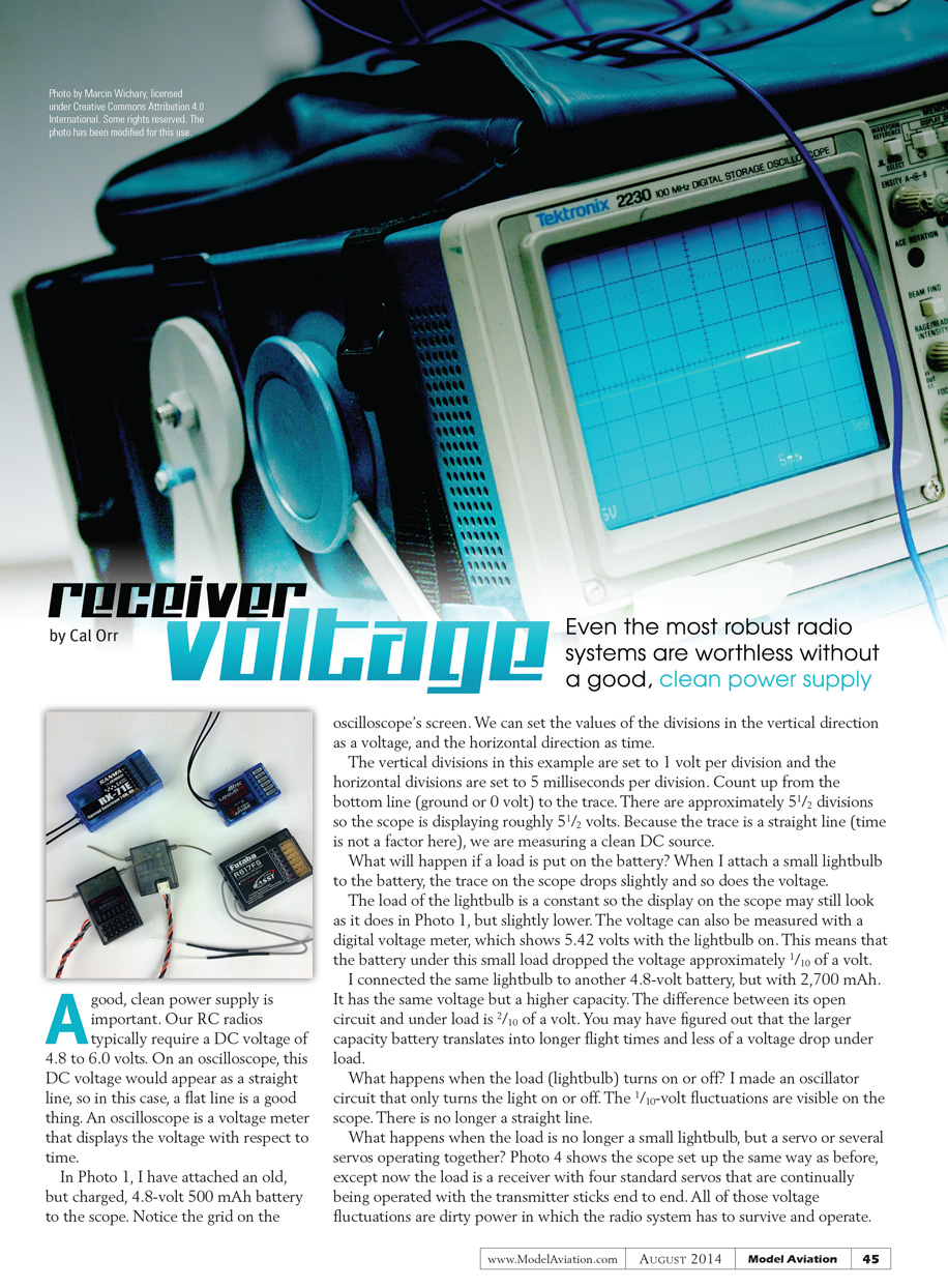 A good, clean power supply is important. Our RC radios typically require a DC voltage of 4.8 to 6.0 volts. On an oscilloscope, this DC voltage would appear as a straight line, so in this case, a flat line is a good thing. An oscilloscope is a voltage meter that displays the voltage with respect to time.