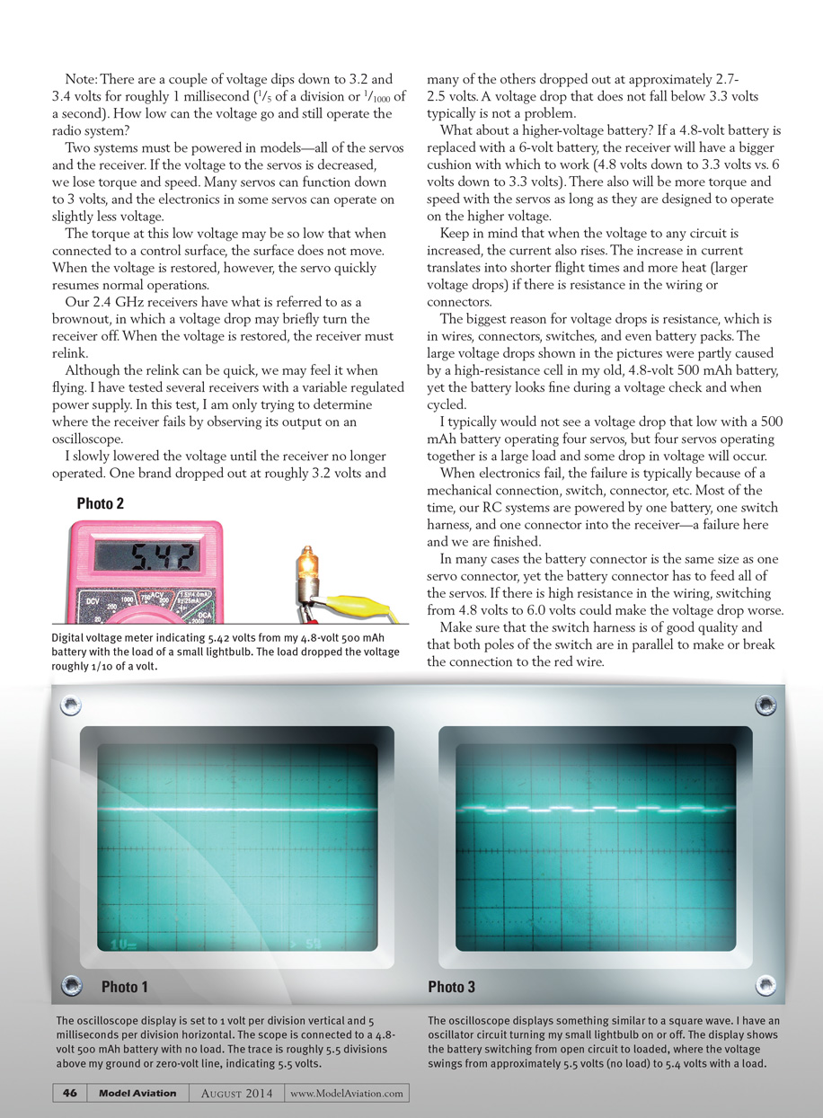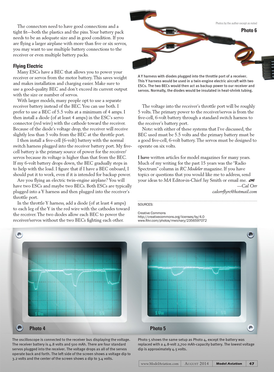 The connectors need to have good connections and a tight fit—both the plastics and the pins. Your battery pack needs to be an adequate size and in good condition. If you are flying larger airplanes with more than five or six servos, you may want to use multiple battery connections to the receiver or even multiple battery packs.