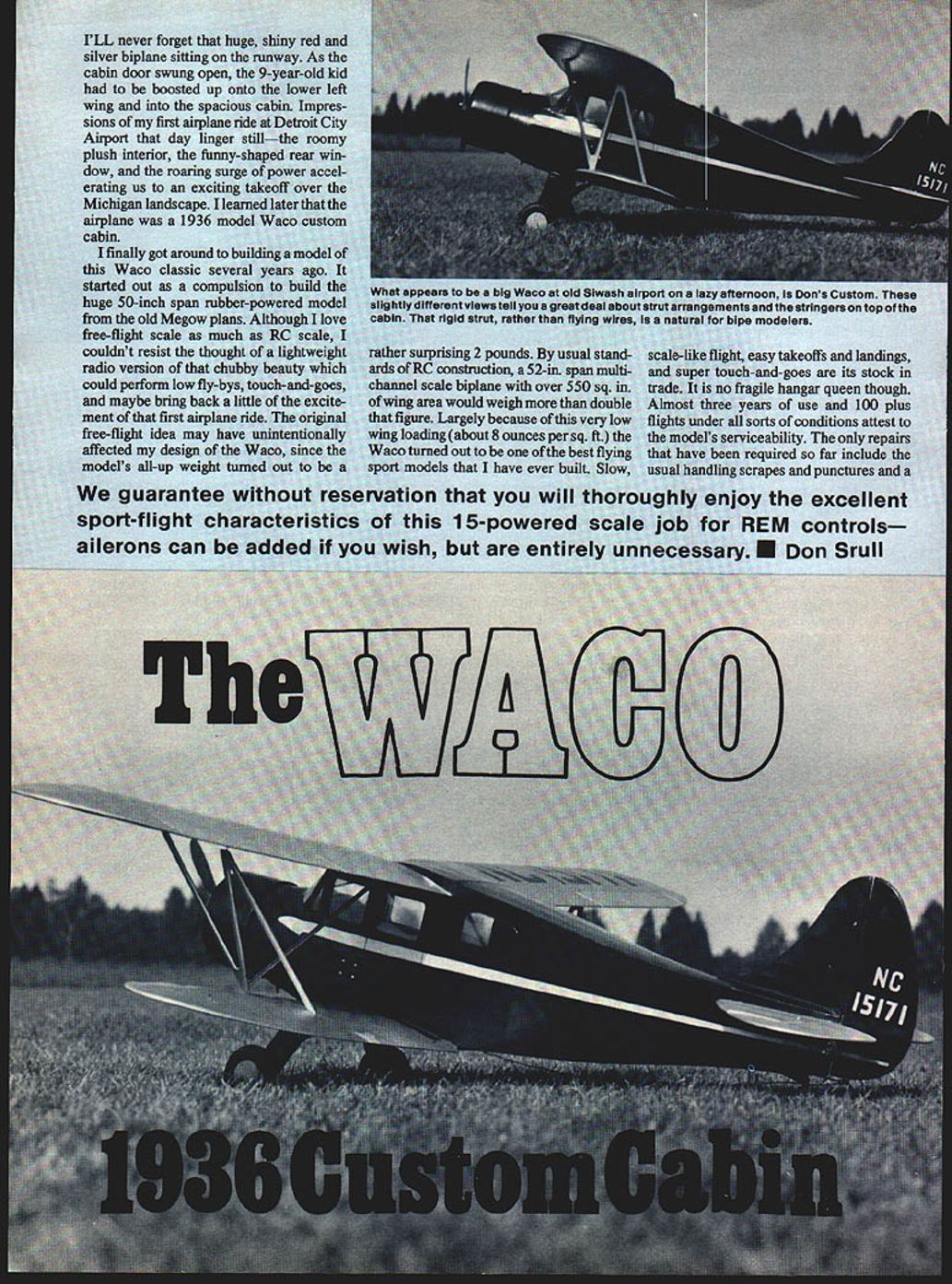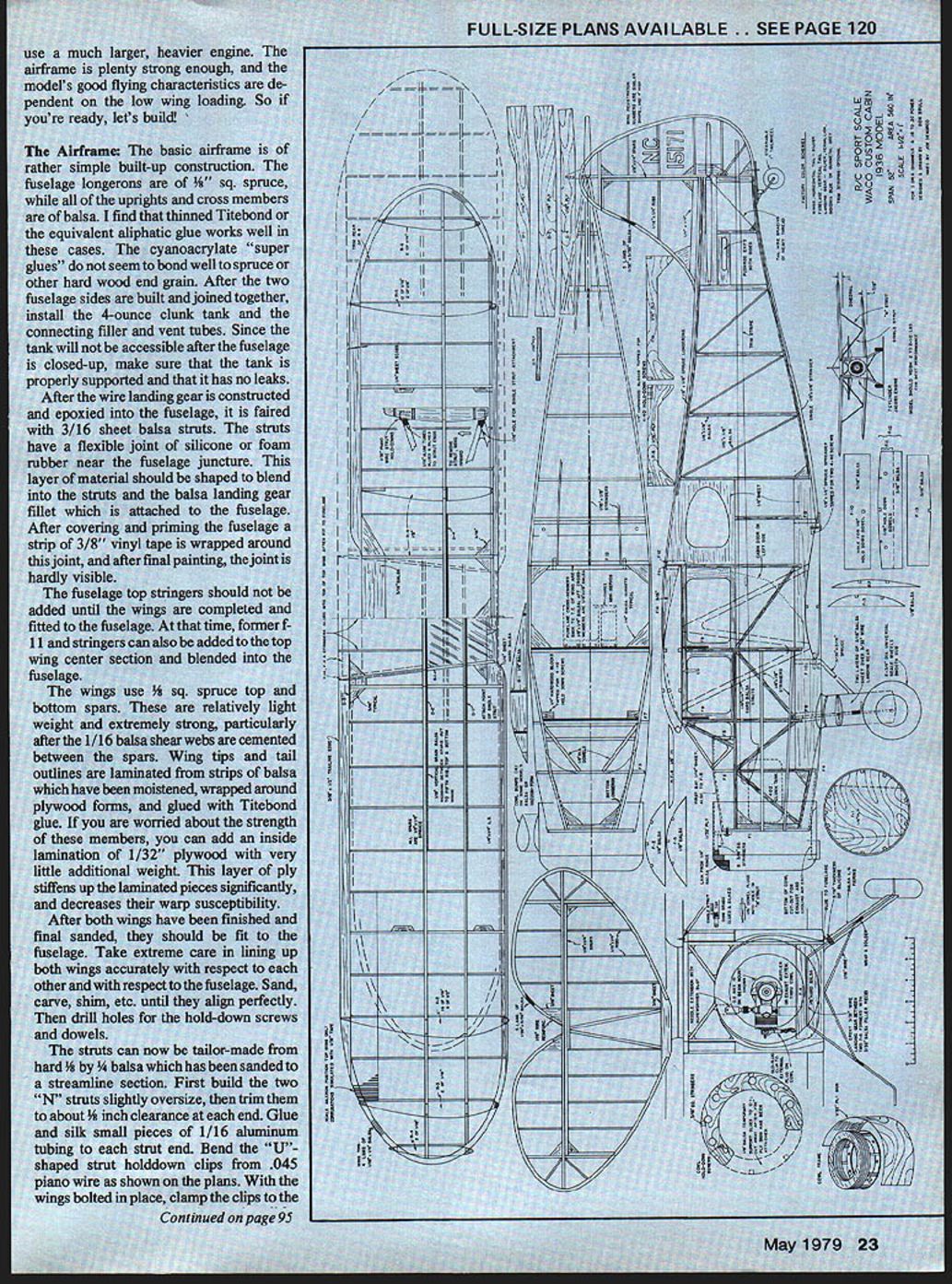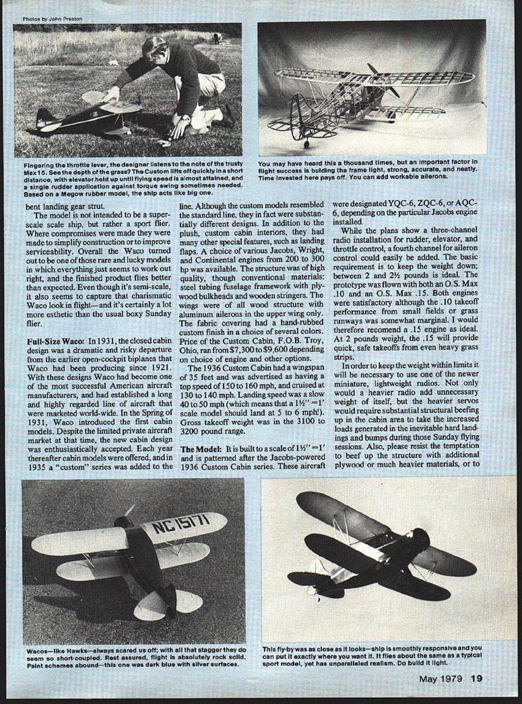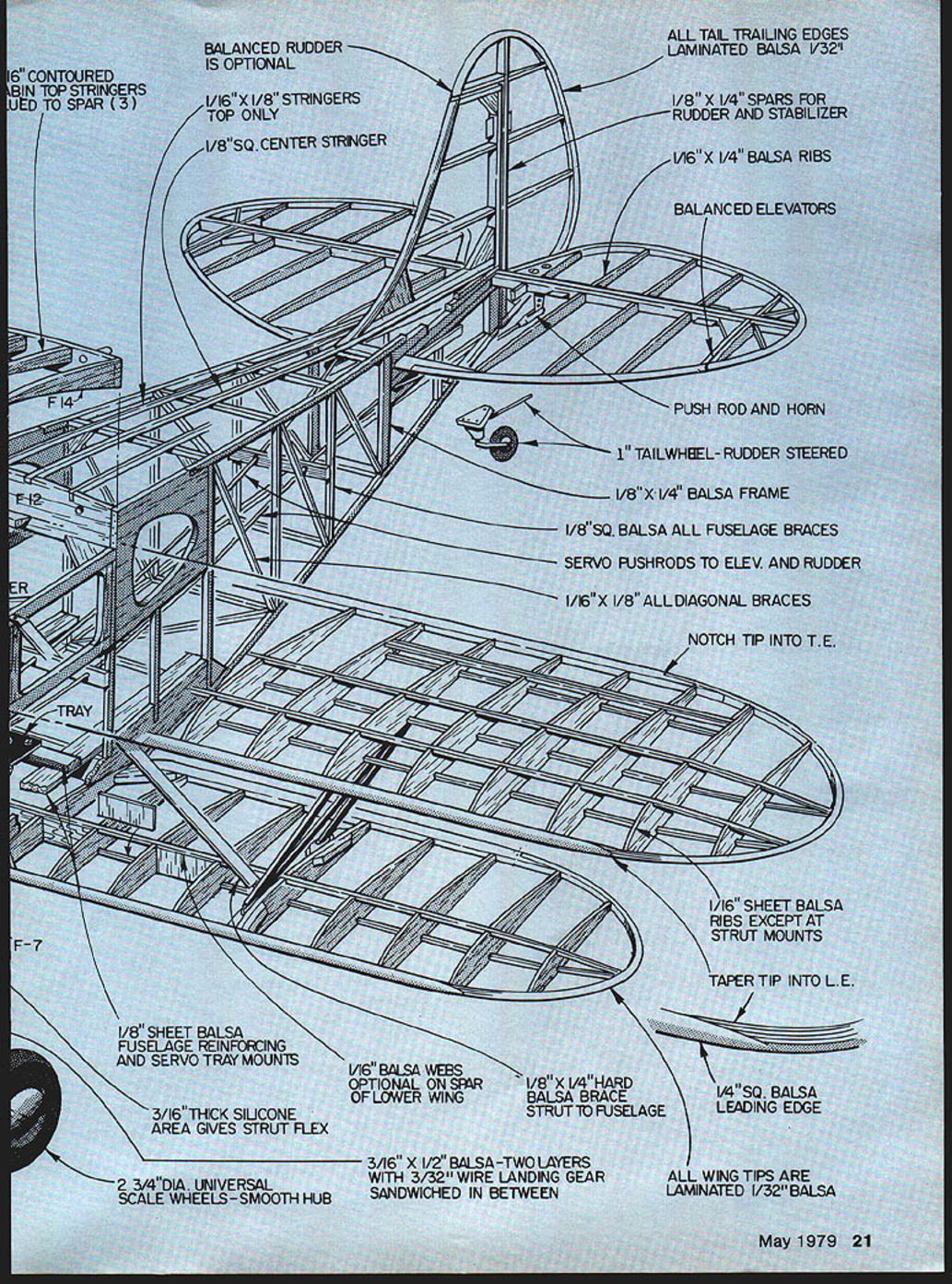 ru never forget silver biplane sitting cabin door swung open boosted up o wing sions first Airport day plush interior runn dow roaring su erating us ex Michigan landscane airplane cabin finally got arou Waco classic started out coi huge 50-inch span r old Megow free-flight scale couldnt resist radio version Ili could perform low maybe bring t ment first ai free-flight idea ma affected design models all-up weign guarantee sport-flight ailerons can mrs big Wai Brent views tell yo t rigid strut rathel arising construction scale biplane area would weigh n Largely because iie about 8 ounce out eis have e s 15-pow fternoon Dons C ants stringer bipe modelers ht easy takeoffs and] uch-and-goes its io fragile hangar qu e years use ano sorts conditions attc erviceability repa en required far scrapes ioy Don iv rtflight dTime n ag.I mode. y m ract a inter atUre& irious iiucnes fro flS tstrucfl ough Its Strame ture ciwoodev itwood usuaj DOthe -cccansi ci 3duccmCabir advertis ph Lnding sr Ji means land to asc er Ja n series ipissmoo1 asnt it flies abot u,dIieIed realism bL m 5C - sint Sc 1/A F- F-14 GLIED J ENGINE N 3/16SQ COWL Ci I/8PLYVAJOD COWLTO F-i FORMER WITH 3 UNLT INS 20 Model Aviation NO OCR TEXT SFRS 40 SCREWS 2 SA GUSSETS FRAME MO*IT ARS M6 LA K L SQSPRUC LIJE F-IO 3/I6BALSA 1 Fi I/8 PLYWOOD T1 FRONT FRAME 3/32u8A1SA FILLERS CONTAI 3/32 WIRE BETWEEN F-6 FO*AERS IGATrACH EPOXY D4 NO OCR TEXT FOR THE SOARING BUFF supertape applies stickey brushing masking Its stronger typical R/C building material lt weighs 1 gin per sq ft building area lts 0005 thick Its ready instant apply Sits quickest efficient method applying balsa greenskin other skin foam wing cores Plus dozens other great uses Try 3/8roll $479 1roli $795 2roIl $1595 ALL ROLLS ARE 2160 LONG SUPERWINGS superwings Portfolio Everything need know create own super-performance sailplane completely illustrated difinative work 20 pages packed technical data charts diagrams step-bystep instructions million $ worth information interested obtaining winning edge sailplane performance Hi Johnson Only $150 11015 Glenoaks Blvd Pacoima CA 91331 Tel 12131 8994312J Openers/Winter continued page 4 Over Don Srulls drawing table big homemade projector Finally opted two best looking draw ings scaled side view size multiplied 5 would give us model profile Another drawing scaled multiplication 8this planform Srull Bowers old wizard Ned Kragness bull session us during projected color slides Antique Aircraft Museum Ned explained tube nut bolt weve whipping out sheets drawings cross sections started over three times What now trying to freeze reason able level scalethis Sport Scale modeland crate has flown crank numerous minute cor rections final drawing Everyone has advice ought scale exhaust etcyou know Ned wants us build up Warren Truss ribs little ply gussets eyes roll said would cov ered painted would know what inside absolutely horrified Come fel lows wanted nice crate fly no competition just long does exhibit visual errors Now know what scale guys go through documentation begins insidiously builds builds like anvil-head thunderstorm Research becomes game itself fascinating enjoyable tend forget model Research unveiled hobby itself within could enjoy life time hobby uncontrolled documenta tion single design single airplane What license numbers ship building Which varia tion really copying find stringers no knew about nobody shows drawing Longerons shown curved drawing engineer types tell us thats no-nothat steel tube never bowed because its compression strength would shot darn wheeis 7 inches have make supposed fun project So well put Williams biggest6 inches maybe replace later big gest Williams cylinders e Gnome rotary make 7cylinder Warner out Now Fox 78 extension shaft mount ed 8 oclock put its head between dummy cylindersbut head doesnt show anyway have epoxy allergy Murder Now what So some guys tell us fool long enough stuff allergy part game fumes Being editor have big advantage three weeks research would take six months year otherwise Now hung up wing tipsnothing accur ate front view everything dis agreement Sooner later well back track make detailed drawings tail wheel assembly etcwe hope Time becomes meaningless Whereas building always frantic rush get air now feel enjoyment building big deal really dont care youll get done Enjoy step drawings look like road map rural Saudi Arabiavast open Spaces Will live long enough see thing fly cares get field got station wagon cares shop 9 x 12 three six-foot airplanes hang plus bench plus drawing table plus couch usually cat Aristocrat can assembled indoors Now dig guys built Tower Babel Pyramids Eiffel Tower Maybe should have stuck rubberscale guys Join us next Saturday after noon episode 15 Radio Technique/Myers continued page 17 dealing subject called EMI Electro-Magnetic Interference According experts getting rid EMI art science Whatever works right thing other hand flying buddy Nick Ziroli has building flying types models years ranging hA 200-pound RPVs Nick says has never found need chokes set working cor rectly before installed So having trouble likely caused wear tear will yield solutions proposed above Owners Kraft radios can purchase special harness No 200-193 direct factory containing chokes proper size use 22 H highcurrent chokes must specify system harness used cause Kraft has used several types connectors over years several patterns connections might make leads up other brands ask nicely dont know sure worst can happen say no February 1979 issue QST magazine has feature story device called Incon need choke filter Incon looks like good pos sible solution Youll have make own want because isnt production yet above bits information given BOB ABERLE W2QPP Keep letters coming folks Id par ticularly like hear some folks have solved problems George Myers 70 Froehlich Farm Rd Hicksville NY 11801 Waco/Sru II continued page 23 appropriate ribs clothes pins work well slip N struts place Move clips around 