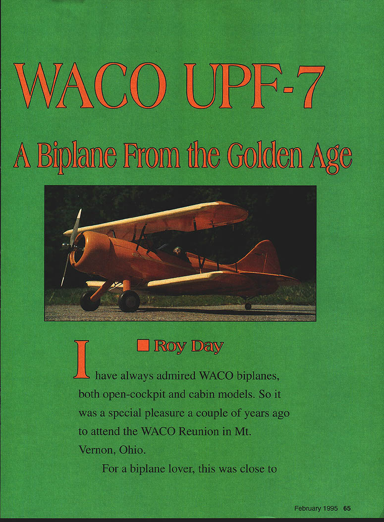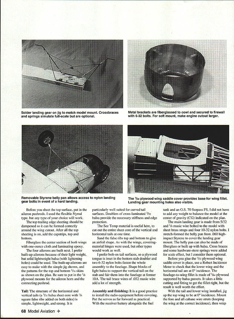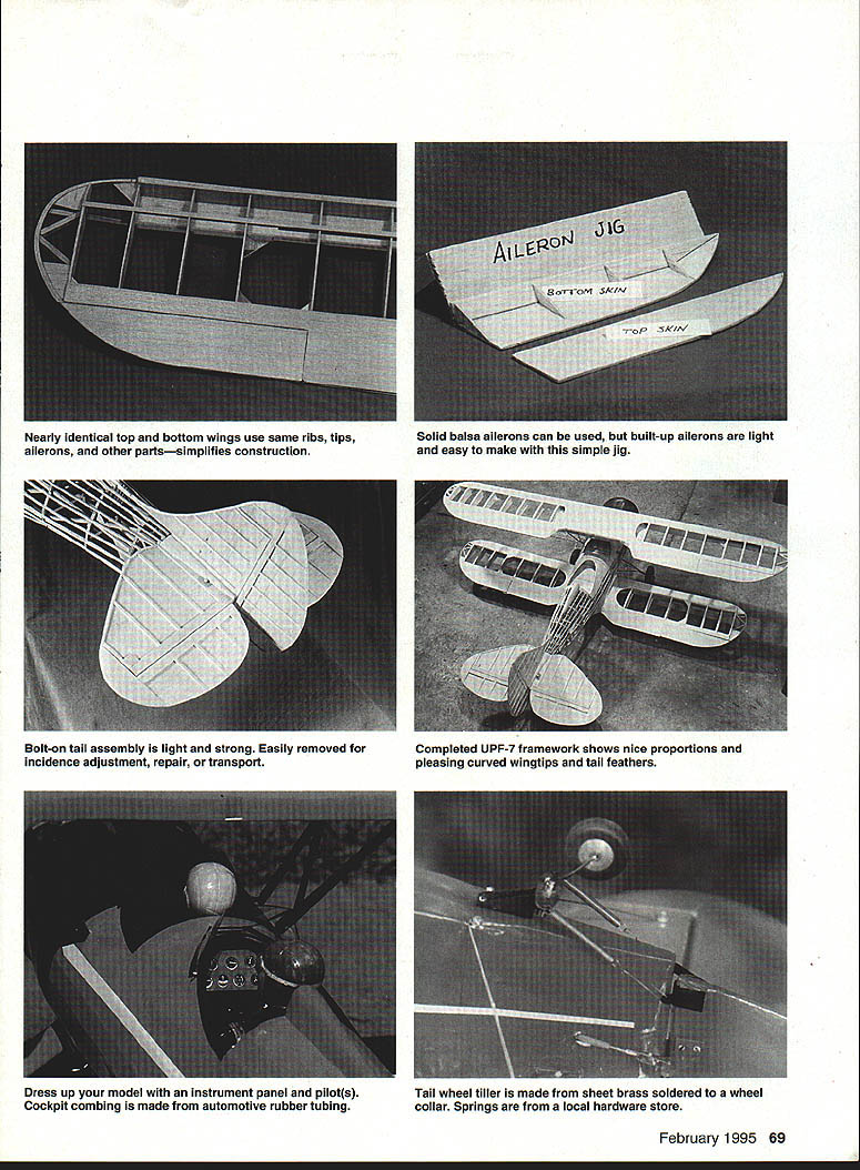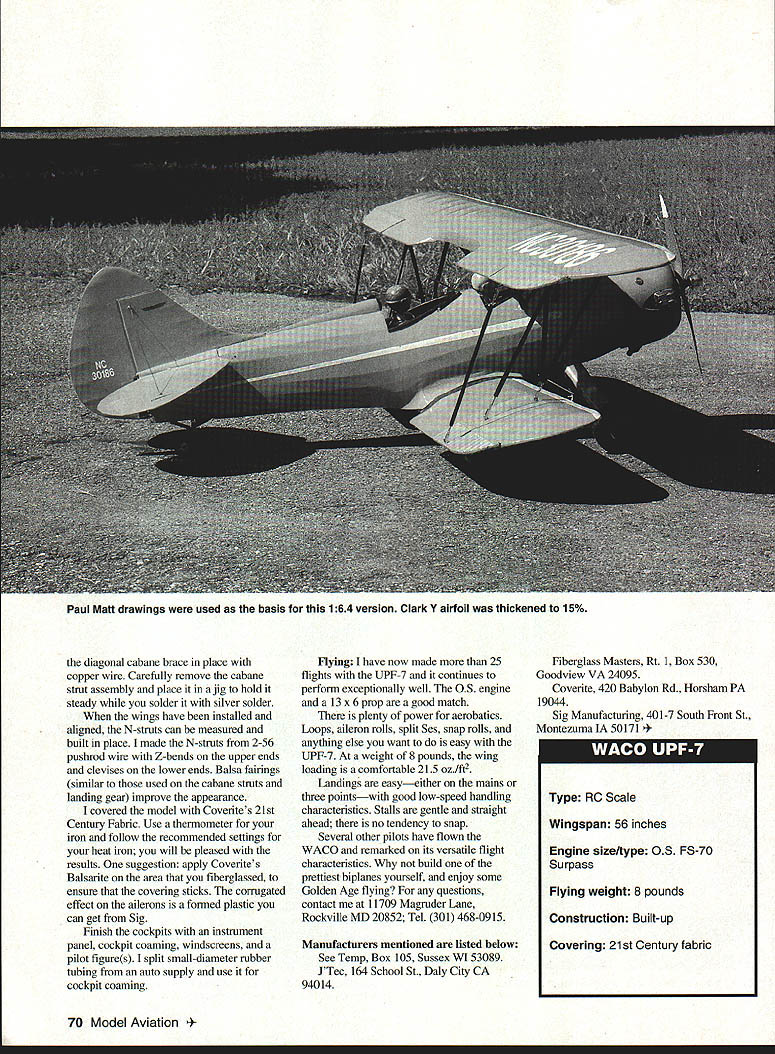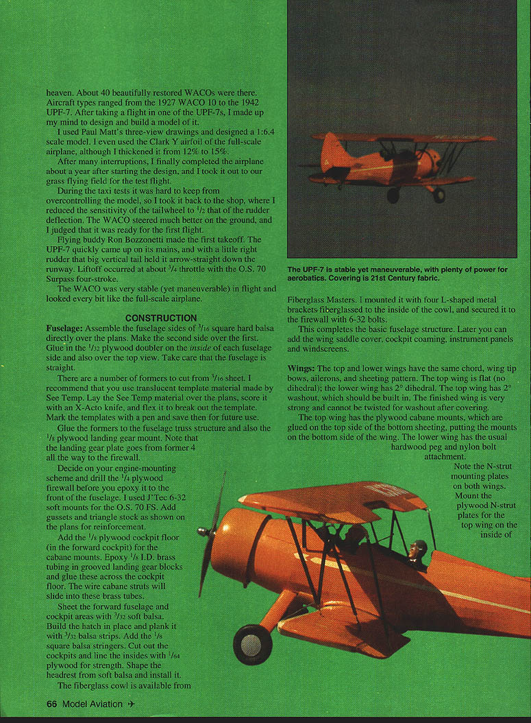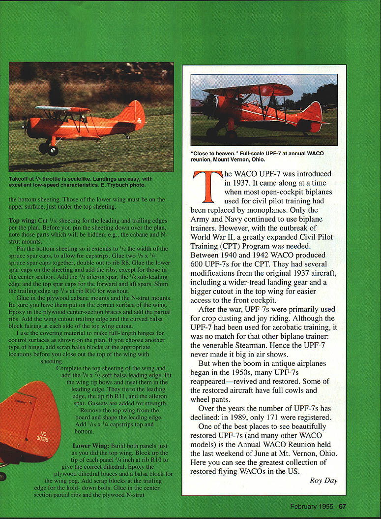 NO OCR TEXT NO OCR TEXT Close heaven Full-scale UPF-7 annual WACO reunion Mount Vernon Ohio WACO UPF-7 introduced 1937 came along time open-cockpit biplanes used civil pilot training replaced monoplanes Only Army Navy continued use biplane trainers However outbreak World War II greatly expanded Civil Pilot Training CPT Program needed Between 1940 1942 WACO produced 600 UPF-7s CPT several modifications original 1937 aircraft including wider-tread landing gear bigger cutout top wing easier access front cockpit After war UPF-7s primarily used crop dusting joy riding Although UPF-7 used aerobatic training no match other biplane trainer venerable Stearman Hence UPF-7 never made big air shows boom antique airplanes began 1950s UPF-7s reappearedrevived restored Some restored aircraft have full cowls wheel pants Over years number UPF-7s has declined 1989 171 registered best places see beautifully restored UPF-7s other WACO models Annual WACO Reunion held last weekend June Mt Vernon Ohio can see greatest collection restored flying WACOs US Roy Day Before sheet top surface put aileron pushrods used flexible Nyrod type type choice will work top trailing edge sheeting should dampened can formed correctly around wing cutout After top sheeting add capstrips top bottom Fiberglass center section both wings one-ounce cloth laminating epoxy four ailerons built next prefer built-up ailerons because light weight solid lightweight balsa lightening holes could used built-up ailerons easy make simple jig shown patterns top bottom 1/16 skins shown plan sure put J/ plywood mounts aileron horn connecting pushrod Tail structure horizontal vertical tails /32 balsa sheet core 1/8 square false ribs added both sides simple lightweight strong particularly well suited curved tail surfaces Doublers cross-laminated /32 balsa provide necessary stiffness edge protection See Temp material useful cut out entire sheet core vertical horizontal tails time Sand false ribs top bottom give airfoil shape As wings coveringmaterial hinges used other types would work well prefer bolt-on tail surfaces plywood tongue inset bottom stab doubler two 6-32 nylon bolts fasten whole assembly fuselage Shape blocks light balsa support vertical tail stab fair fuselage former bA tail brace wires 032 music wire add lot strength Assembly finishing good practice install radio equipment before covering Put servos far forward practical receiver battery alongside fuel tank OS 70 Surpass FS did have add weight balance model center gravity CG indicated plan main landing gear made 5/32 I/ music wire bolted model sheet brass straps four 10-32 nylon bolts stretch-formed belly pan 060 highimpact Styrene cover landing gear mount belly pan can also made fiberglass built up balsa Cross braces some hardware-store springs added scale effect consider optional Before glue /32 plywood wing saddle cover place use Robart Incidence Meter check lower wing horizontal tail 00 incidence fuselage-to-wing fillet made plywood supported balsa gussets takes litfie cutting fitting get fillet right result well worth effort tail lower wing installed jig up top wing 00 incidence Mount fore aft cabane wire struts keeping wing correct incidence wrap 68 Model Aviation er landing gear jig match model mount Crossbraces springs simulate full-scale optional Metal brackets fiberglassed cowl secured firewall 6-32 bolts soft mount make engine cutout larger Removable Styrene belly pan allows access nylon landing gear bolts event hard landing 1132 plywood wing saddle cover provides base wing fillet Landing gear mounting holes also visible Bolt-on tail assembly light strong Easily removed incidence adjustment repair transport Dress up model instrument panel pilots Cockpit combing made automotive rubber tubing Completed UPF-7 framework shows nice proportions pleasing curved wingtips tail feathers Tail wheel tiller made sheet brass soldered wheel collar Springs local hardware store February 1995 69 Nearly identical top bottom wings use same ribs tips ailerons other partssimplifies construction Solid balsa ailerons can used built-up ailerons light easy make simple jig Paul Mali drawings used basis 164 version Clark V airfoil thickened 15% diagonal cabane brace place copper wire Carefully remove cabane strut assembly place jig hold steady solder silver solder wings have installed aligned N-struts can measured built place made N-struts 2-56 pushrod wire Z-bends upper ends devises lower ends Balsa fairings similar used cabane struts landing gear improve appearance covered model Coverites 21st Century Fabric Use thermometer iron follow recommended settings heat iron will pleased results suggestion apply Coverites Balsarite area fiberglassed ensure covering sticks corrugated effect ailerons formed plastic can get Sig Finish cockpits instrument panel cockpit coaming windscreens pilot figures split small-diameter rubber tubing auto supply use cockpit coaming Flying have now made 25 flights UPF-7 continues perform exceptionally well 05 engine 13 x 6 prop good match plenty power aerobatics Loops aileron rolls split Ses snap rolls anything else want easy UPF-7 weight 8 pounds wing loading comfortable 215 oz/ft2 Landings easyeither mains three pointswith good low-speed handling characteristics Stalls gentle straight ahead no tendency snap Several other pilots have flown WACO remarked its versatile flight characteristics build prettiest biplanes yourself enjoy some Golden Age flying questions contact 11709 Magruder Lane Rockville MD 20852 Tel 301 468-0915 Manufacturers mentioned listed below See Temp Box 105 Sussex WI 53089 JTec 164 School St Daly City CA 94014 Fiberglass Masters Rt 1 Box 530 Goodview VA 24095 Coverite 420 Babylon Rd Horsham PA 19044 Sig Manufacturing 401-7 South Front St Montezuma IA 50171 odel Aviation RO Scale Wingspan 56 inches Engine size/type 05 FS-70 Surpass Flying weight 8 pounds Construction Built-up Covering 21st Century fabric