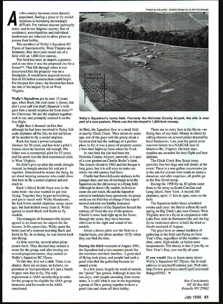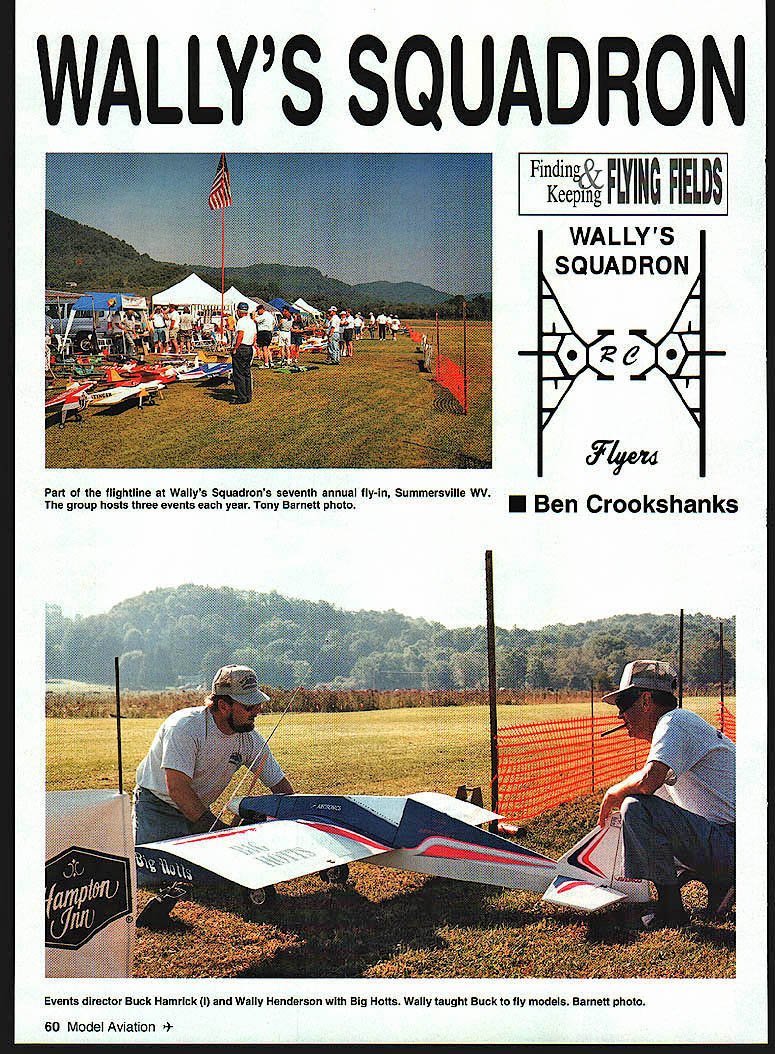 WALLYS SQUADRON Finding SiIVIN Keepin WALLYS SQUADRON 6 Part flightilne Wallys Squadrons seventh annual fly-in Summersyille WV group hosts three events year Tony Barnett photo U Ben Crookshanks 60 Model Aviation ts director Buck Hamrick Wally Henderson Big Hotts Wally taught Buck fly models Barnett photo As country becomes densely populated finding place fly model airplanes becoming increasingly difficult various reasons primarily noise litigious society fear accidents municipalities individual landowners reluctant allow pilots pursue hobby members Wally s Squadron RC Flyers Summersville West Virginia fortunate have year-round use field 1800-foot runway field has airport pasture time proposed site KmartTM fell through discovered property floodplain would have required several feet fill before construction could begin past few years location has site largest fly-in West Virginia Wallys Squadron got its start 13 years ago Buck real name James dont ever call him Hamricks wife gave him model airplane kit SearsTM Christmas put airplane together took out promptly crashed first flight Right dawned him although involved flying fullscale airplanes life did know needed fly model airplane Buck has power company lineman 20 years has held pilots license since became old enough father commercial pilot 57 years uncle first commercial pilot West Virginia didnt give up after crash though instead bought another kit put together Determined master thing set about locating someone could show him fly model airplane crash Bucks friend Keith Naye same boathe also wanted get flying Together began networking got touch Wally Henderson flown model airplanes years ago drifted away Wally agreed teach Buck Keith fly models managers Summersville airport agreed let use airport lessons spare time Wally spent better part summer teaching Buck Keith fly doing drawn back flying As time went several other pilots joined decided needed name group after tossing out several proposed names settled Wallys Squadron RC Flyers day club no charter no dues no bylaws no president vice-president its just bunch guys like fly requirement AMA membership order group eligible AMA group insurance events AMA sanctioned first Squadron flew small field nearby Glade Creek about six years ago guys told group about location makings perfect place fly piece property across four-lane highway lived time site Nicholas County Airport currently part cow pasture Charlie Butlers farm airport closed 1963 hangar long gone still easy make out old runway Charlie flown full-scale airplanes younger days too happy let Squadron use old runway flying field Although doesnt fly models loves come out watch Squadron entered handshake lease agreement group could use field free charge kept mowed took out liability insurance members Squadron fenced runway off rest pasture Charlies cows feed right up fence through years have become oblivious sight sound models About dozen pilots use field regular basis about another 10 fly can find time During third weekend August 1991 Squadron late-summer picnic members families great deal flying took place people such good time gathering became annual event few years largely word mouth picnic has grown Although lasts two days people attending seven states still what beginning group fliers getting together have good time show off hobby Photos author Graphic Design Jill Ann Cavaneagh no entry fees fly-inno flying fees kind Money raised selling chances several prizes donated local businesses Last year grand prize two tickets NASCAR race Martinsville Virginia both days trophies awarded best flight best airplane Glade Creek Boy Scout troop provides free hot dogs soft drinks event one-gallon mayonnaise jar site anyone wants make donation after expenses profits go Boy Scout troop During 1998 fly-in 87 pilots came far away South Carolina Long Island New York record 340 airplanes up 11 feet span field Squadron holds three scheduled events year first float-fly spring Big Ditch Lake near Cowan West Virginia next fly-in conjunction Lake Fest held Summersville big fly-in mentioned above held third fourth weekend August guys have annual tradition gathering field flying New Years Day regardless weatherrain sleet snow high winds below-zero temperatures theory fly New Years Day can fly year would like learn about Wallys Squadron RC Flyers E-mail address teacher@inetonenet Web site http//wwwgeocitiescom/CapeCanaverah Hangar/5563 Crookshanks HC 83 Box 666 Rainelle WV 25962 July 1999 61 Wallys Squadrons home field Formerly Nicholas County Airport site now part cow pasture Pilots use old airports 1800-foot runway