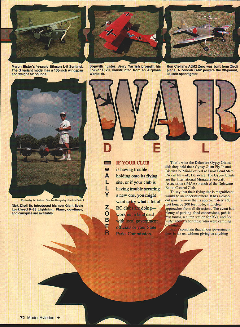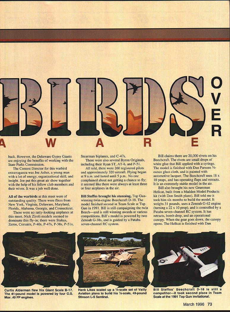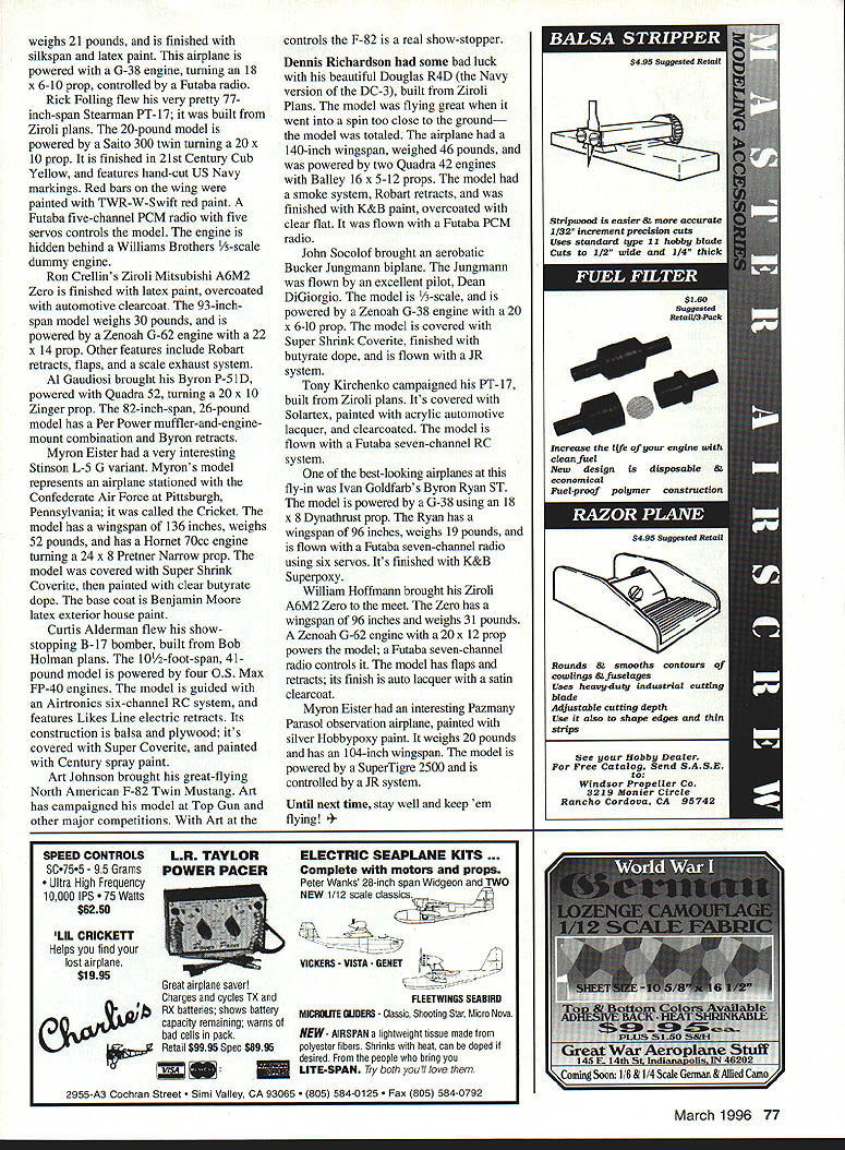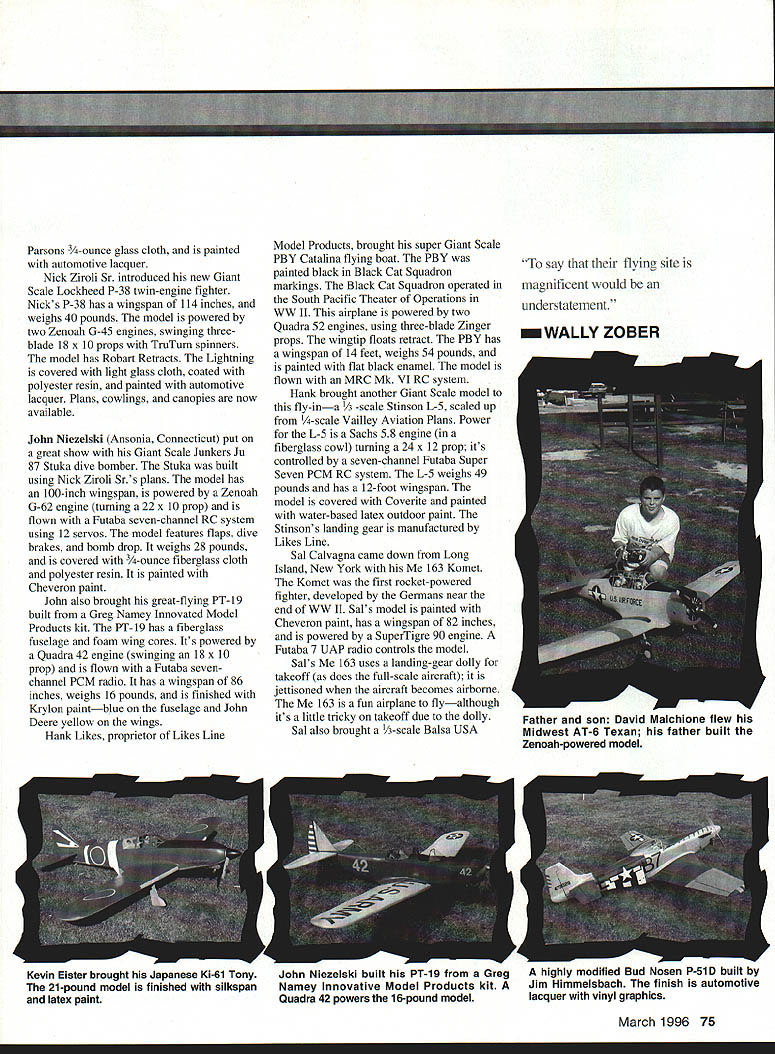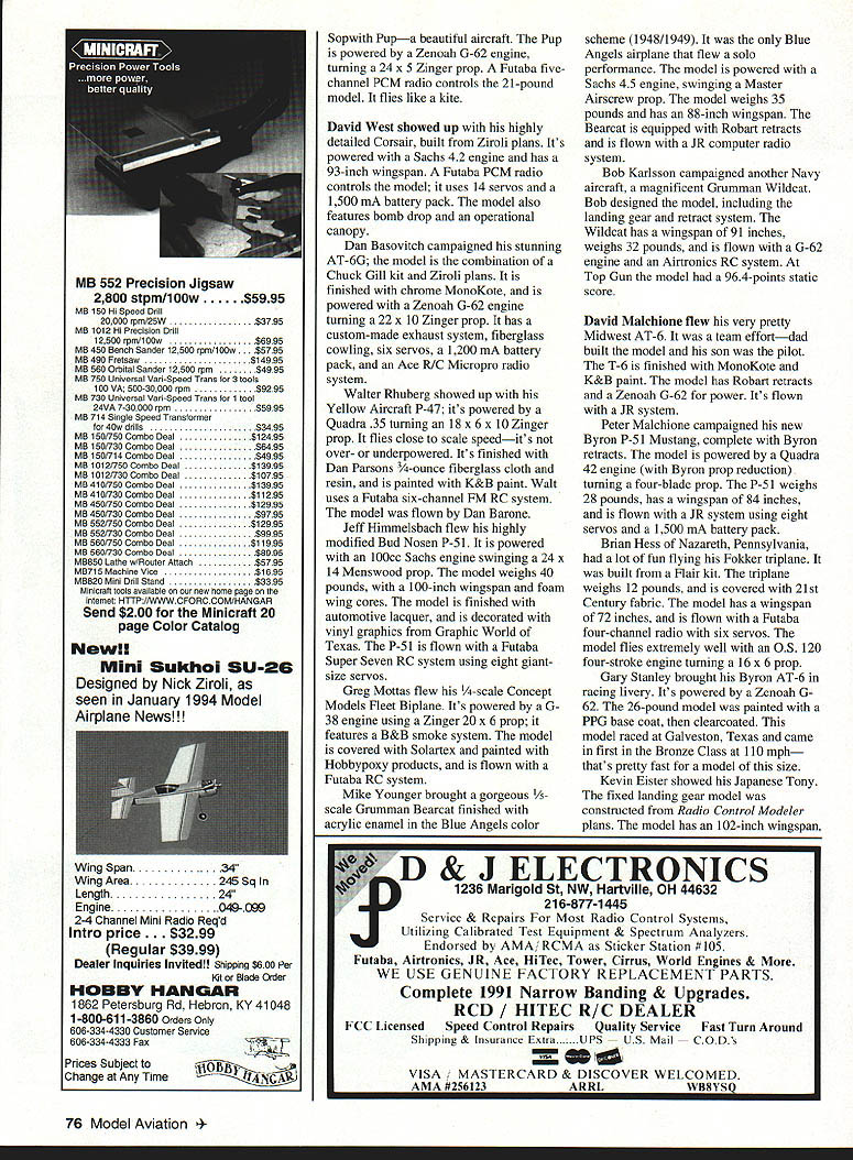 Myron Elsters -scale Stinson L-5 Sentinel G variant model has 136-Inch wingspan weighs 52 pounds 72 Model Aviation Crellins A6M2 Zero built Ziroli plans Zenoah G-62 powers 30-pound 93-inch-span fighter Thats what Delaware Gypsy Giants did held Gypsy Giant Fly-In District IV Mini-Festival bums Pond State Park Newark Delaware Gypsy Giants International Miniature Aircraft Association IMAA branch Delaware Radio Control Club say flying site magnificent would understatement has closecut grass runway approximately 750 200 feet wide clear roaches directions event nty parking food concessions public rooms dump station RVs hot s camping government x us witnout giving us anything E L Nick Ziroli Sr Introduced new Giant Scale Lockheed P-38 Lightning Plans cowlings canopies available new might Photos Author Graphic Design Heather Erdahiwantwhat lot RC z C back However Delaware Gypsy Giants enjoying benefits working State Parks Commission Contest Director warbird extravaganza Joe Asher young man lot energy organizational skill insight Joe put great air show together help fellow club members wives job well done warbirds meet outstanding quality fliers New York Virginia Delaware Maryland Florida Alabama Georgia Connecticut no ratty-looking airplanes meet Nick Ziroli models seemed dominate fly-in Stukas Zeros Corsairs P-40s P-47s P-38s P-S Curtis Alderman flew Giant Scale B-17 41-pound model powered four 05 Max 40 FP engines Stearman biplanes C-47s also several Byron Originals including Ryan ST AT-6 P-5 1 told 260 registered pilots approximately 320 aircraft Flying began 9 am lasted until 5 pm. No complained about getting chance fly seemed like always least three four airplanes air Bill Steffes brought stunning Top Gunwinning twin-engine Beechcraft D-18 model finished second Team Scale Top Gun 1991 Bill still campaigning twin Beechand still winning awards various competitions Bills model powered two Zenoah G-38s guided Futaba seven-channel RC system Hank Likes scaled up -scale set 0 Vailly Aviation plans build 1-scale 49-pound Stinson L-5 Sentinel 0 V E R Bill claims 20000 nvets Beechcraft rivets small drops white glue Bill applied syringe model finished Dan Parsons ounce glass cloth painted automotive lacquer Beechcraft uses 18 x 10 props has operating flaps retracts extremely stable model air Bill also brought new Grumman Hellcat built Madden Model Products kit Don Smith plans Bill told took him six months build model weighs 31 pounds uses Zenoab G-62 engine turning 22 x 10 prop controlled Futaba seven-channel RC system has retracts bomb drop operational canopy gear goes down canopy opens Hellcat finished Dan Bill stettes Beechcran u-18 still competitorit took second place Team Scale 1991 Top Gun Invitational March 1996 73 w ARE Parsons 3/4-ounce glass cloth painted automotive lacquer Nick Ziroli Sr introduced new Giant Scale Lockheed P-38 twin-engine fighter Nicks P-38 has wingspan 114 inches weighs 40 pounds model powered two Zenoah G-45 engines swinging threeblade 18 x 10 props Trulurn spinners model has Robart Retracts Lightning covered light glass cloth coated polyester resin painted automotive lacquer Plans cowlings canopies now available John Niezeiski Ansonia Connecticut put great show Giant Scale Junkers Ju 87 Stuka dive bomber Stuka built using Nick Ziroli Srs plans model has 100-inch wingspan powered Zenoah G-62 engine turning 22 x 10 prop flown Futaba seven-channel RC system using 12 servos model features flaps dive brakes bomb drop weighs 28 pounds covered 3/4-ounce fiberglass cloth polyester resin painted Cheveron paint John also brought great-flying PT- 19 built Greg Namey Innovated Model Products kit PT-19 has fiberglass fuselage foam wing cores Its powered Quadra 42 engine swinging 18 x 10 prop flown Futaba sevenchannel PCM radio has wingspan 86 inches weighs 16 pounds finished Krylon paintblue fuselage John Deere yellow wings Hank Likes proprietor Likes Line Kevin Eister brought Japanese Ki-61 Tony 21-pound model finished silkspan latex paint Model Products brought super Giant Scale PBY Catalina flying boat PBY painted black Black Cat Squadron markings Black Cat Squadron operated South Pacific Theater Operations WW II airplane powered two Quadra 52 engines using three-blade Zinger props wingtip floats retract PBY has wingspan 14 feet weighs 54 pounds painted flat black enamel model flown MRC Mk VI RC system Hank brought another Giant Scale model fly-in-a -scale Stinson L-5 scaled up -scale Vailley Aviation Plans Power L-5 Sachs 58 engine fiberglass cowl turning 24 x 12 prop its controlled seven-channel Futaba Super Seven PCM RC system L-5 weighs 49 pounds has 12-foot wingspan model covered Coverite painted water-based latex outdoor paint Stinson s landing gear manufactured Likes Line Sal Calvagna came down Long Island New York 163 Komet Komet first rocket-powered fighter developed Germans near end WW II Sals model painted Cheveron paint has wingspan 82 inches powered SuperTigre 90 engine Futaba 7 UAP radio controls model Sals 163 uses landing-gear dolly takeoff does full-scale aircraft jettisoned aircraft becomes airborne 163 fun airplane flyalthough its little tricky takeoff due dolly Sal also brought /3-scale Balsa USA John Niezelski built PT-19 Greg Namey Innovative Model Products kit Quadra 42 powers 16-pound model say eh Ir flying site m gnifi ent would understatement WALLY ZOBER highly modified Bud Nosen P-51 D built Jim Himmelsbach finish automotive lacquer vinyl graphics March 1996 75 Father son David Malchione flew Midwest AT-6 Texan father built Zenoah-powered model MB 552 Precision Jigsaw 2800 stpm/lOOw 5995 MB 150 Hi Speed Drill 20000 rpm/25W$3795 MB 1012 Hi Precision Drill 12500 rpm/i 00w$6995 MB 450 Bench Sander 12500 rp100w. $5795 MB 490 Fretsaw$14995 MB 560 Orbital Sander 12500 rpm$4995 MB 750 Universal Van-Speed Trans 3 tools 100 VA 500-30000 rpm $9295 MB 730 Universal Van-Speed Trans 1 tool 24VA 7-30000 rpm$5995 MB 714 Single Speed Transformer 40w drills$3495 MB 150/