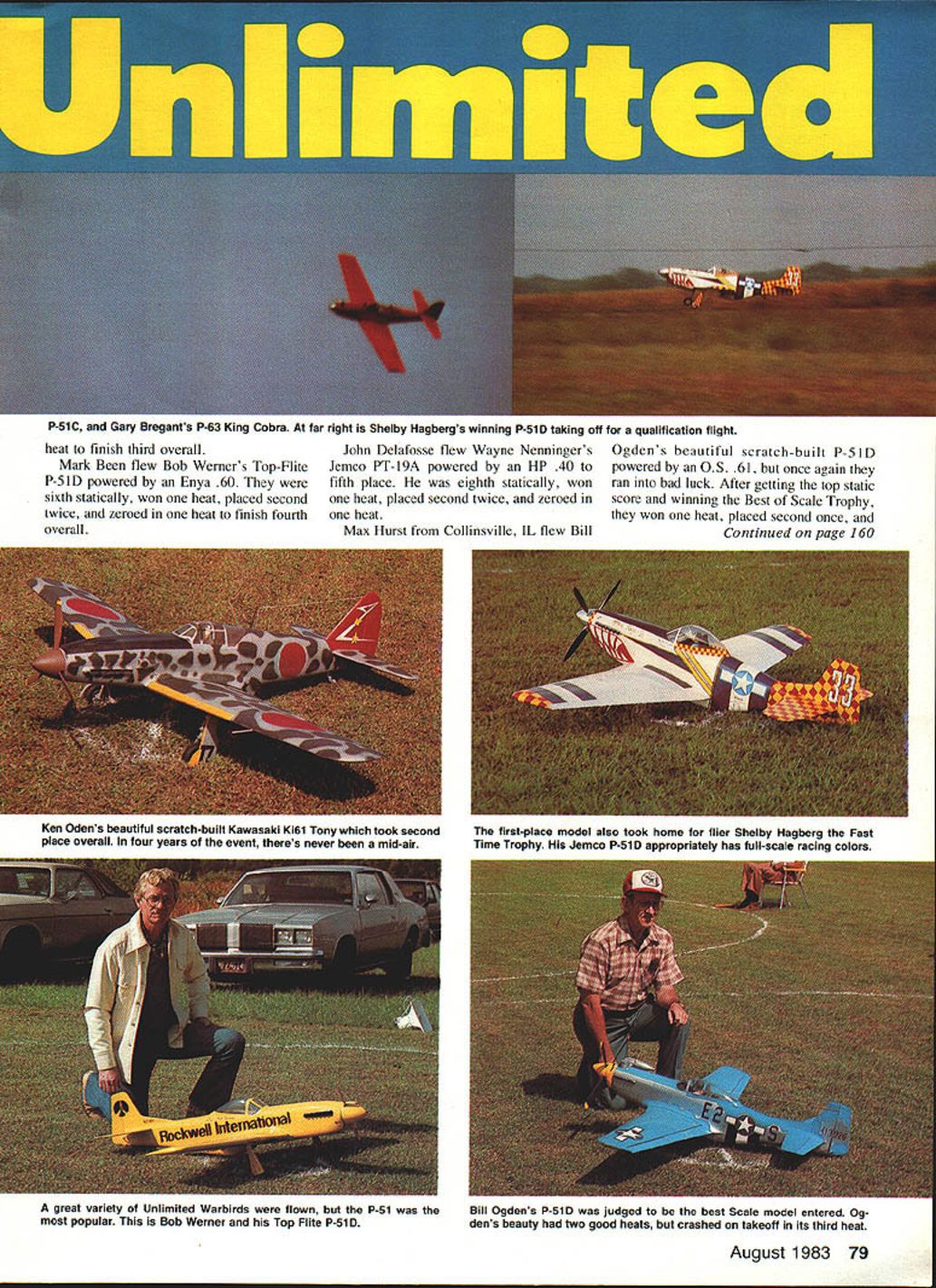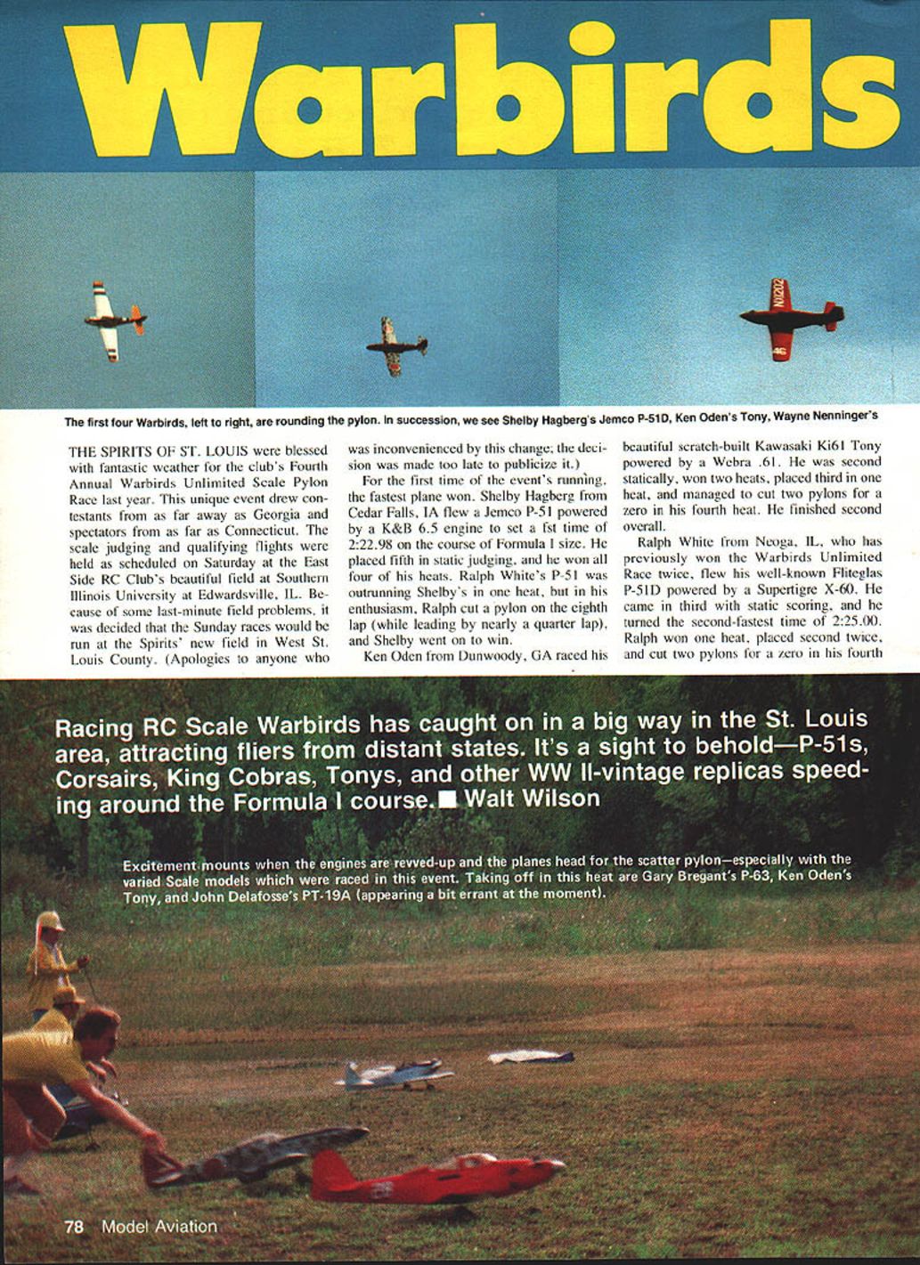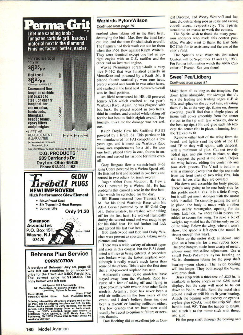 The first four Warbirds left right rounding pylon succession see Shelby Hagbergs JemcO P-51 0 Ken Odens Tony Wayne Nenningers THE SPIRITS OF ST LOUIS blessed fantastic weather clubs Fourth Annual Warbirds Unlimited Scale Pylon Race last year unique event drew con testants far away Georgia spectators far Connecticut scale judging qualifying flights held scheduled Saturday East Side RC Clubs beautiful field Southern Illinois University Edwardsville IL cause some last-minute field problems decided Sunday races would run Spirits new field West St Louis County Apologies anyone inconvenienced change deci sion made too late publicize first time events running fastest plane won Shelby Hagberg Cedar Falls IA flew Jemco P-5 powered K&B 65 engine set fst time 22298 course Formula size placed fifth static judging won four heats Ralph Whites P-SI outrunning Shelbys heat enthusiasm Ralph cut pylon eighth lap leading nearly quarter lap Shelby went win Ken Oden Dunwoody GA raced beautiful scratch-built Kawasaki Ki6 Tony powered Webra 61 second statically won two heats placed third heat managed cut two pylons zero fourth heat finished second overall Ralph White Neoga IL has previously won Warbirds Unlimited Race twice flew well-known Fliteglas P-S ID powered Supertigre X-60 came third static scoring turned second-fastest time 22SOO Ralph won heat placed second twice cut two pylons zero fourth P-51C Gary Bregants P-63 King Cobra far right Shelby Hagbergs winning P-51D taking oft qualification flight heat finish third overall Mark Been flew Bob Werners Top-Flite P-51D powered Enya 60 sixth statically won heat placed second twice zeroed heat finish fourth overall John Delafosse flew Wayne Nenningers Jemco PT-19A powered HP 40 fifth place eighth statically won heat placed second twice zeroed heat Max Hurst Collinsville IL flew Bill Ogdens beautiful scratch-built P-51D powered OS 61 once again ran bad luck After getting top static score winning Best Scale Trophy won heat placed second once Continued page 160 August 1983 79 Ken Odens beautiful scratch-built Kawasaki KiBi Tony took second place overall four years event theres never mid-air first-place model also took home flier Shelby Hagberg Fast Time Trophy Jemco P-51 D appropriately has full-scale racing colors great variety Unlimited Warbirds flown P-51 popular Bob Werner Top Flite P-51D Bill Ogdens P-51D judged best Scale model entered Og dens beauty two good heats crashed takeoff its third heat Warbirds Pylon/Wilson Continued page 79 crashed taking off third heat destroying bird Max flew third fast est time team finished sixth overall flagmen work cut out P-S flew against Ralph Whites identical except up right engine 05 muffler other inverted engine Wayne Nenninger scratch-built very nice P-S IC finished entirely MonoKote powered Kraft 61 placed fourth statically won heat placed second fourth two other heats crashed final heat Seventh overall its final position Art Biehl resurrected HB 40-powered Jemco AT-6 crashed last years Warbirds Race Again plagued bad luck placed second two heats third another crashed taking off last heat finish eighth overall tunately time damage seri ous Ralph Doyle flew Stafford P-51D powered Kraft 61 particular kit ws manufactured FAI competition few years ago meets Warbirds Race wing area requirements 61 won heat placed third fourth other zeroed last ninth over Gary Bregant flew scratch-built P-63 King Cobra powered Webra Speed 60 finished first second two heats zeroed two others tenth overall Roger Abbot Mattoon IL flew P-S ID powered Webra 61 problems caused zero first heat after scratched day Bill Blaum returned Traverse City Ml third Warbirds Race AU-I Corsair powered HP Gold Cup 61 Unfortunately crashed taking off first heat worked frantically during second round ready go third heat further bad luck zeroed last two heats Bob Underwood Bob Dolly Wis cher present spectators taking pictures notes wide variety aircraft types sizes contest P-5 1 domi nated seven being entered precedent broken fastest airplane won although really wasnt much faster some others also first time 40-powered airplane has won Apparently some Scale modelers have stayed away Warbirds Race cause fear taking off flying close proximity two three other Scale models Actually has never mid-air collision four years event dont believe has ever takeoff landing collision either few crashes have seen could usually traced equiment failure nerv ous thumbs Don Hoelting did excellent job Contest Director Westy Westhoff Joe Lunt did outstanding jobs scale racing coordinators respectively Spirits turned out en masse work contest Spirits wish thank gene rous sponsors made contest pos sible also want thank East Side RC Club its assistance use clubs field Spirits next Warbirds Unlimited Contest will September 17 18 1983 further information watch AMA Cal endar Events See Swee Pea/Lidberg Continued page 81 Make long template Pin down pins alongside through /16 sq leading trailing edges LE & TE splice curved tips elevating very tip Later during covering youll find single piece tissue will cover smoothly center rib out tip few wrinkles due bent-up tips Fit glue rib ex cept center rib place trimming TE end fit Remove either half wing board lightly sand ends LE TE will rejoin dihedral minimum glue Cut out two di hedral jigs pin place will support panel center Rejoin wing halves adding center rib four stick gussets V-tail built similar manner except tips made front parts two wing ribs Join tail halves after covered Pin down assemble body pieces Theres going body side profile model Yes little flimsy will get much stronger motor stick installed simplify getting wing place body made rather large nearly rectangular opening wing Later /~ sheet fill-in pieces added secure wing save bit weight model has fill-ins top wing Below wing wont show space left open model strong enough way Make up motor stick shown glue bent pin rear rubber hook prop hanger made strip metal allows some thrust-lin