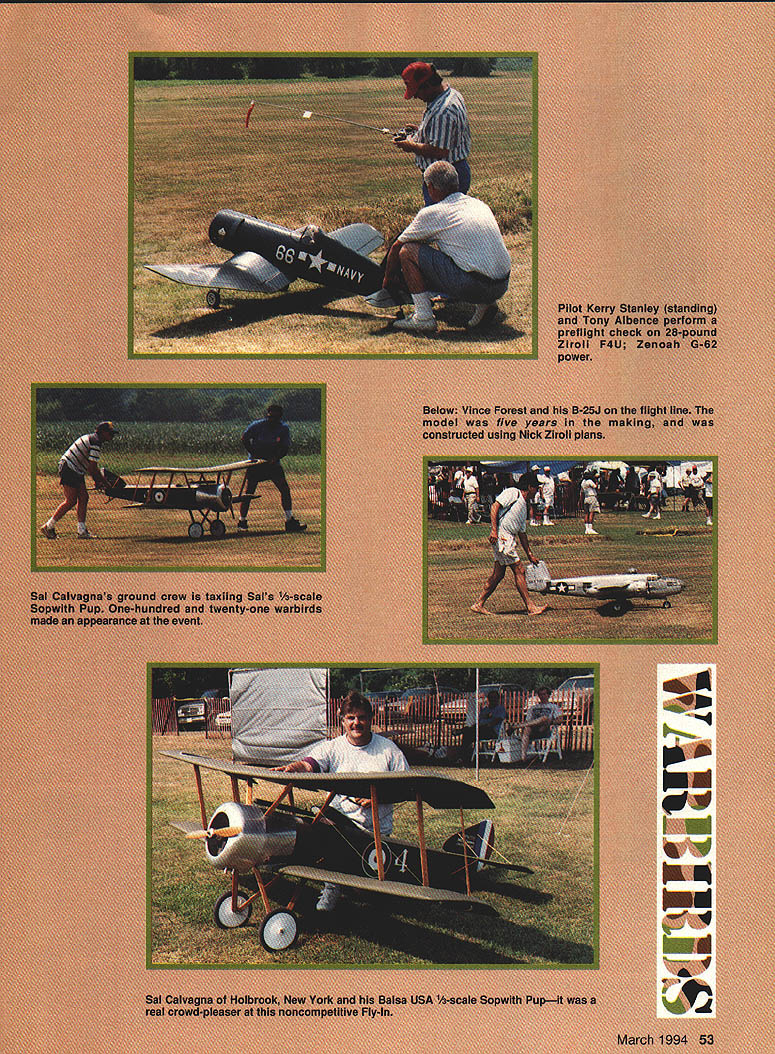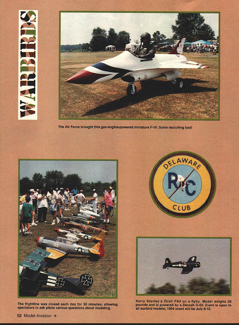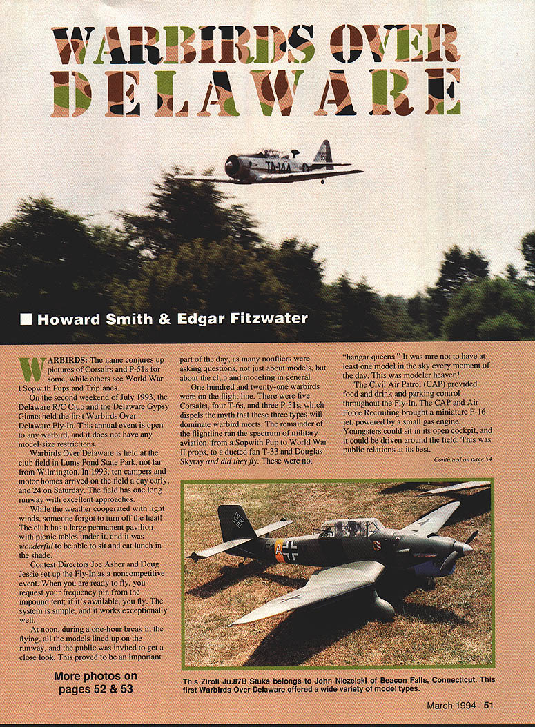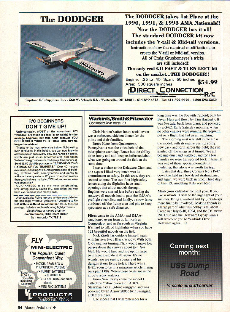 NO OCR TEXT NO OCR TEXT NO OCR TEXT WarbirdslSmith&Fitzwater Continued page 51 Chris Hardens after-hours social event barbecued chicken dinner pilots families Bruce Kane Quakertown Pennsylvania voice behind microphone day Bruce has ability funny still keep us informed about what going around field same time visitor Delaware Club aspect liked very much its commitment safety area second two-foot-high safety fences along flightline have small openings allow models through Engines started just before taking runway models pass IMAAs preflight check list finally snow fence cordoned off flying area pits keep spectators safe distance Fliers came AMA- IMAA sanctioned event far north Connecticut far south Virginia Its hard talk highlights have 121 beautiful models field Nick Ziroli has outdone himself again new P-61 Black Widow both G-38 engines turning Nick would make low passes down runway aboutfourfeet high would land fire up large twin Beech again Its no wonder seeing designs flying fields B-25 soon magazine article flying pair 1 08s twins air everyone watches New Jersey came model called fabric overcast 40% Stearman 13-foot wingspan powered Arrow 200cc twin swinging 30 x S Zinger model will remember long time Sopwith Tabloid built Bryan Hess flown Tim Haggerty t/3-scale built plans powered G-62 Early Saturday morning no other engines running Sopwith put flight us watching morning mist still air model its engine purring softly flew back forth across field sun glinted off wings turned became quiet watched few minutes transported back time special moments modeling alone worth trip Later day three Corsairs led P-47 down field low-level strafing pass again back time Three days RC modeling its very best Mark calendar next year like warbirds will highlight summer Bring warbird fly its always fun involved Making friends large part what hobby about Come out July 8-10 1994 Delaware RC Club Delaware Gypsy Giants will welcome Warbirds Over Delaware again odel Aviation 4The DODDGER DODDGER takes 1st Place 1990 1991 & 1993 AMA Nationals! Now DODDGER has standard DODDGER kit now includes V-tail & Mid-tail versions Instructions show required modifications create V-tail Mid-tail version Craig Grunkemeyers tricks still included! real GO FAST & TURN LEFT kit market.THE DODDGER! Engine 25 45 Span 50 inches $5499 Area 500 square inches rDIREcTpNNecTIoNRc Capstone R/C Suppliers Inc 562 W Sebrock lid Westerville OH 43081 614-8996313 Fax 614-899-6070 1-800-593-5250 R/C BEGINNERS DONT GIVE UP Unfortunately MOST advertised RIC trainers much too fast unstable average beginner take heart because YOU COULD SOLO YOUR VERY FIRST TIME UPI No longer mislead Thanks extensive trainer flight-testing ever conducted hobby can now know advance ones will fly slow hands-oft stable just so-so intermediate trainers grossly misnamed pull no punches Send $350 plus 520 postage EASE-OF-FLYING RATINGS OF R/C TRAINERS Over 40 models evaluated includingARFs Alsogrades ease-of-build ing explains basic aerodynamics dares address questions poor trainers good trainers marketed does no warn about GUARANTEED enlightening time-saving money-saving R/C publication have ever read money back Also available Flying lessons written especially tor lone eagle must go alone Learning Fly R/C Without Instructor $395 plus 750 postage Includes trouble-shooting flight problems Send check money order Jim Waterman 3818 Deerfield Dr San Antonio TX 78218