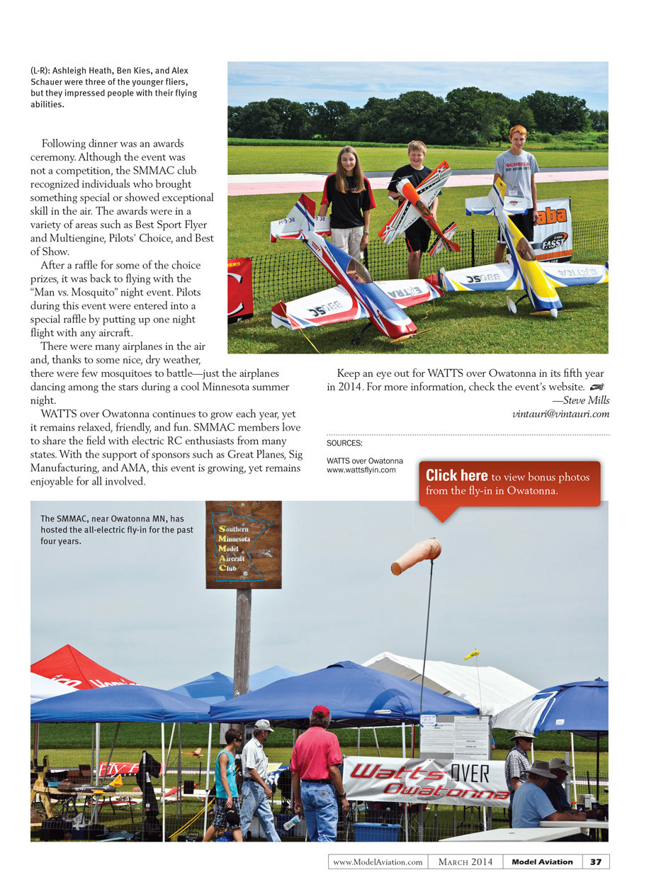 For the past four years, the Southern Minnesota Model Aircraft Club (SMMAC) outside of Owatonna, Minnesota, has hosted an excellent all-electric fly-in called WATTS over Owatonna. It has quickly grown into a well-attended event with more than 150 pilots and sponsors, including Great Planes and Sig Manufacturing, as well as vendors from numerous states. Pilots representing more than 12 states, including some from both the East and West Coasts attended this year!