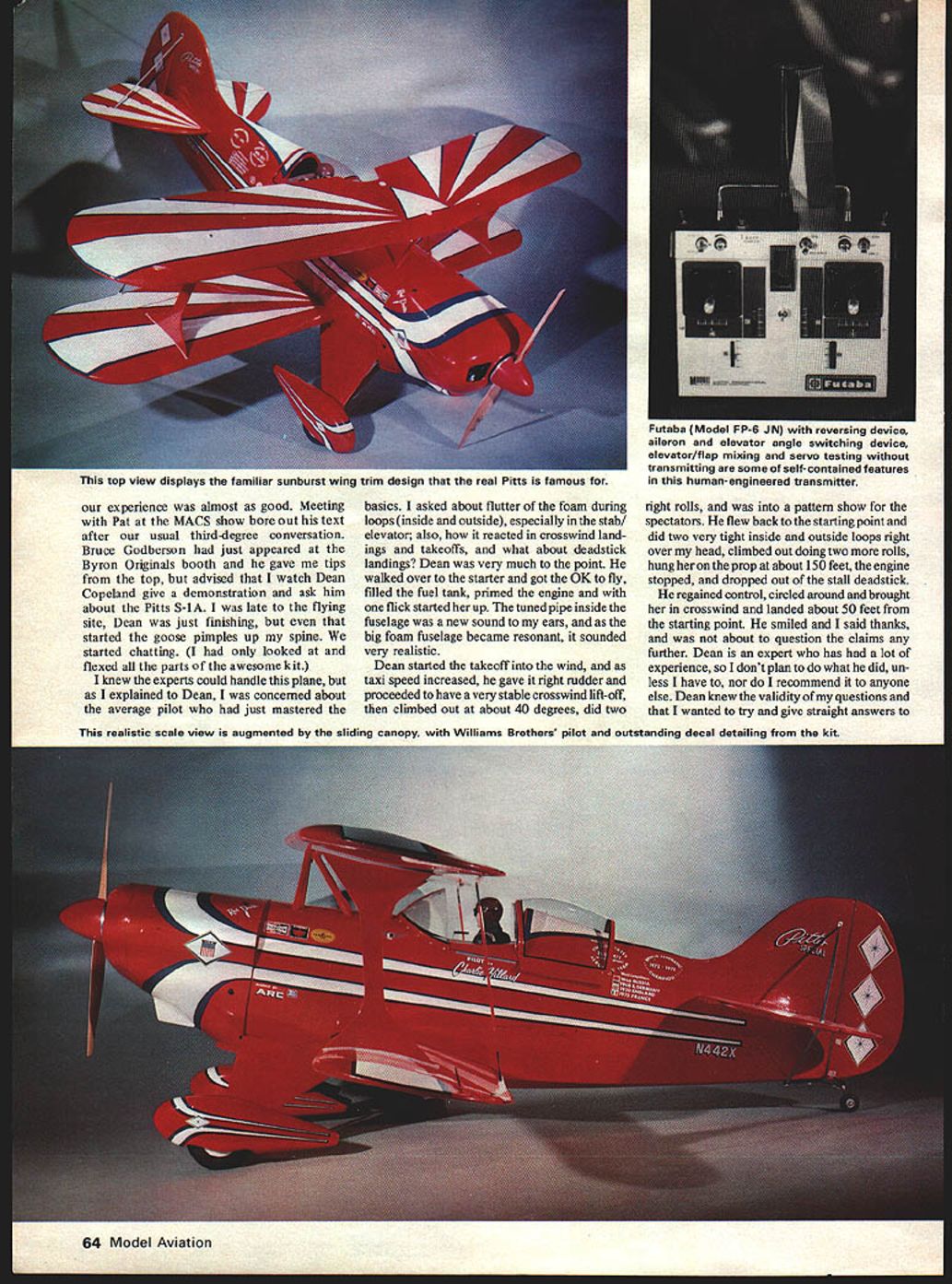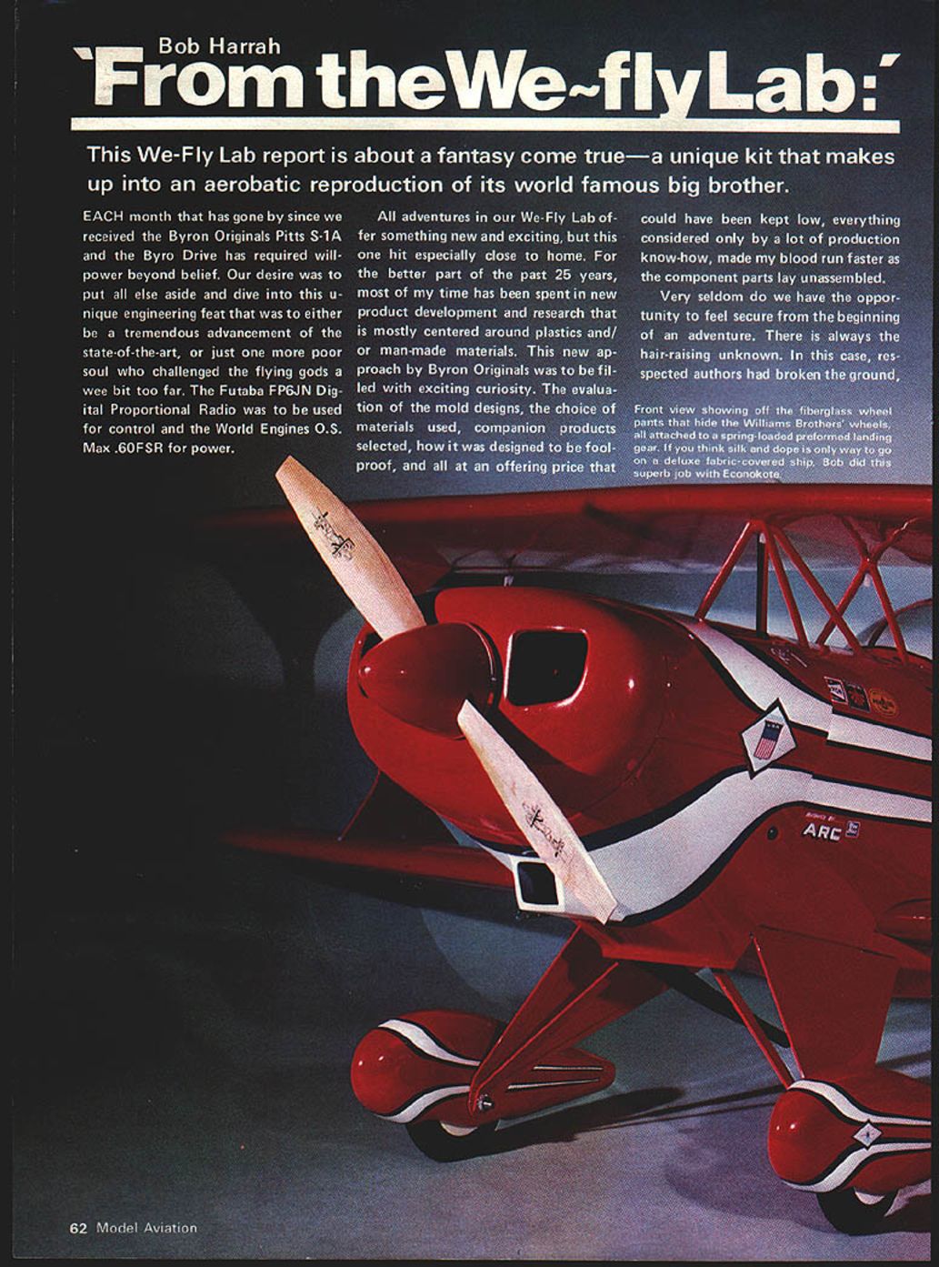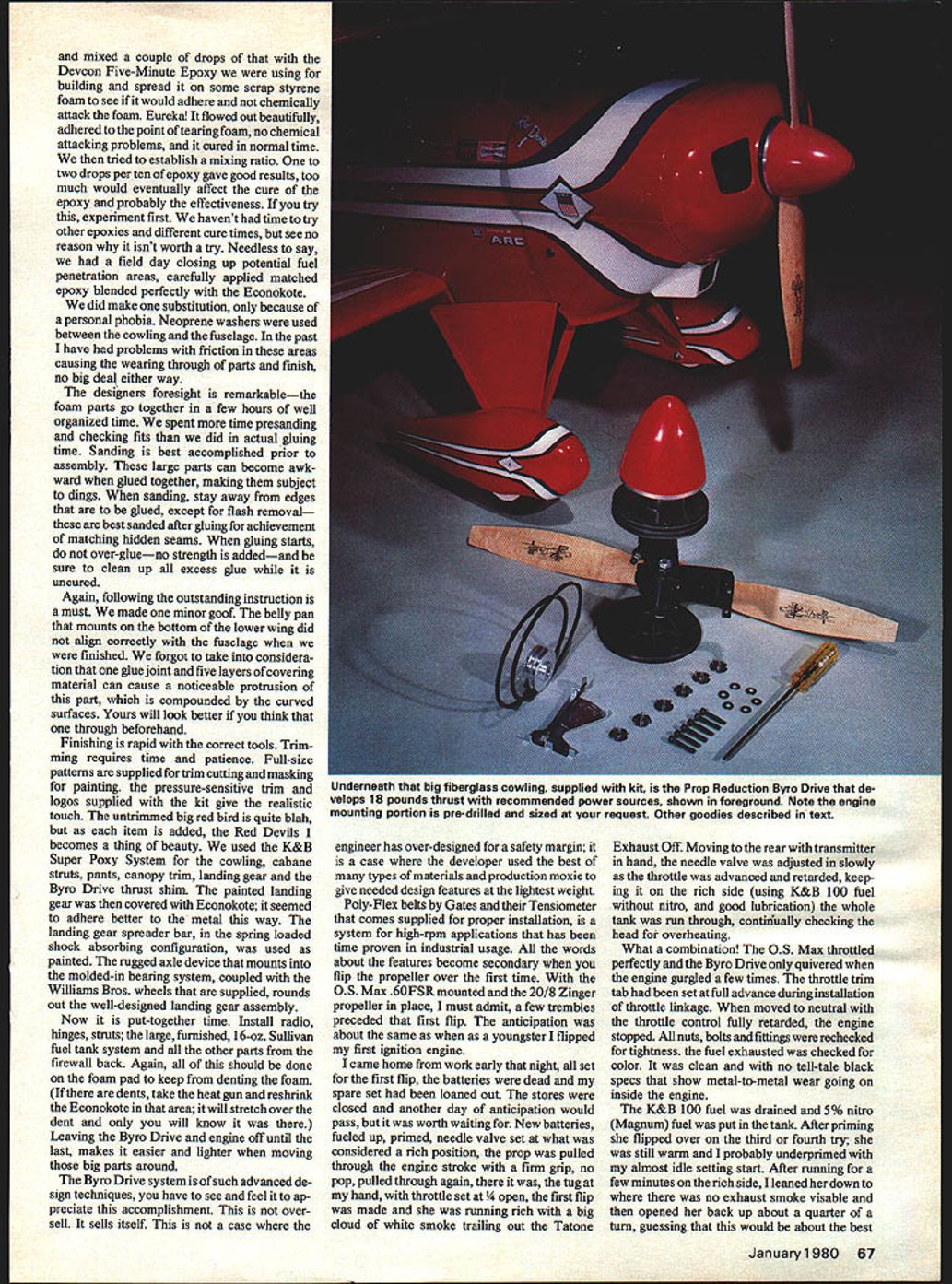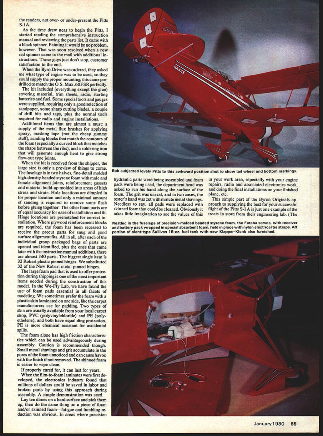 NO OCR TEXT NO OCR TEXT experience almost good Meeting Pat MACS show bore out text after usual third-degree conversation Bruce Godberson just appeared Byron Originals booth gave tips top advised watch Dean Copeland give demonstration ask him about Pitts S-lA late flying site Dean just finishing started goose pimples up spine started chatting looked flexed parts awesomekit knew experts could handle plane explained Dean concerned about average pilot just mastered basics asked about flutter foam during loops inside outside especially stab elevator also reacted crosswind land ings takeoffs what about deadstick landings Dean very much point walked over starter got OK fly filled fuel tank primed engine flick started up tuned pipe inside fuselage new sound ears big foam fuselage became resonant sounded very realistic Dean started takeoff wind taxi speed increased gave right rudder proceeded have very stable crosswind lift-off climbed out about 40 degrees did two right rolls pattern show spectators flew back starting point did two very tight inside outside loops right over head climbed out doing two rolls hung prop about 150 feet engine stopped dropped out stall deadstick regained control circled around brought crosswind landed about 50 feet starting point smiled said thanks about question claims further Dean expert has lot experience dont plan what did un less have nor recommend anyone else Dean knew validity questions wanted try give straight answers realistic scale view augmented sliding canoov Williams Brothers pilot outstanding decal detailing kit 64 Model Aviation top view displays familiar sunburst wing trim design real Pins famous 1-utaba Modelwith reversing device aileron elevator angle switching device elevator/flap mixing servo testing transmitting some self- contained features human-engineered transmitter readers over- under-present Pitts S-i As time drew near begin Pitts started reading comprehensive instruction manual reviewing parts list came black spinner Painting would no problem however soon resolved new red spinner came mail additional structions guys just dont stop customer satisfaction end Byro Drive ordered asked what type engine used could supply proper mounting came pre drilled match OS Max 60FSRperfectly kit included everything except giue covering material trim sheets radio starting batteries fuel Some special tools gauges supplied requiring good selection sandpaper some sharp cutting blades couple drill bits taps plus normal tools required radio engine installations Additional items almost must supply metal flux brushes applying epoxy masking tape cheap gummy stuff sanding blocks match contours foam especially curved block matches shape between ribs soldering iron will generate enough heat give strong flow-out type joints kit received shipper large size preview things come fuselage two halves fine-detail molded high-density beaded styrene foam male female alignment joints reinforcement gussets material build-up molded areas high stress strain Hole locations dimpled proper location minimal amount sanding required remove some flash before gluing together otlwr foam parts equal accuracy ease installation fit Hinge locations prenotched correct stallation plywood reinforcement blocks required foam has recessed receive precut parts snug good surface alignment fits after individual group packaged bags parts opened identified plus ones came later instruction manual additions almost 340 parts biggest single item 32 Robart plastic pinned hinges substituted 32 New Robart metal pinned hinges large foam pad used offer protec tion during shipping important items needed during construction model We-Fly Lab have found use- foam pads essential facets modeling sometimes prefer foam plastic skin laminated side like carpet manufacturers use padding Two types skin usually available local carpet shop PVC polyvinylchloride PE poly ethelene both have equal ding protection PE chemical resistant accidental spills foam alone has high friction characteris tics can used advantageously during assembly Caution recommended though Small metal shavings grit accumulate pores foam unnoticed can cause havoc finish removed skinned foam easier wipe clean properly cared can last years film-to-foam laminates first de veloped electronics industry found millions dollars could saved labor broken parts using approach during assembly simple demonstration used Lay ten dimes hard surface pick up same thing piece foam and/or skinned foamfatigue fumbling re duction obvious areas precision hydraulic parts being assembled foam pads being used department head asked run hand along surface foam grit unreal two cases testers hand cut minute metal shavings Needless say pads replaced skinned foam could cleaned Obviously takes little imagination see values work area especially engine repairs radio associated electronics work doing final installations finished plane etc simple part Byron Originals ap proach supplying best successful flight Pius S-l just example treats store engineering lab January1980 65 OD subjected lovely Pitts awkward position shot show tail wheel bottom markings Nestled fuselage precision-molded beaded styrene foam Futaba servos receiver battery pack wrapped special absorbent foam held place nylon electrical tie straps Aft Dortion slant-tvoe Sullivan 16-oz fuel tank new Klaooer-Klunk also furnished education alone worth price admission model future models scratch-built pictures drawings detailed instruc tions come kit make construction simplistic almost sure has got something wrong Kind like painting numbers doesnt make Rembrandt Norman Rockwell results almost guaranteed satisfy seems needless rehash everthing already covered instructions other authors will add some suggestions consideration perhaps better warrant further thought testing manufacturer recommends two methods finishing Top Flite Econokote K&B Super Poxy System will supply light weight glass cloth kit uses epoxy resin finishable numerous types 