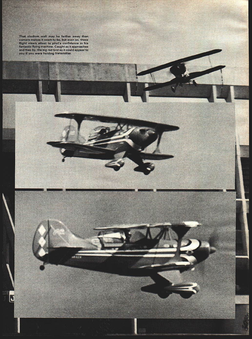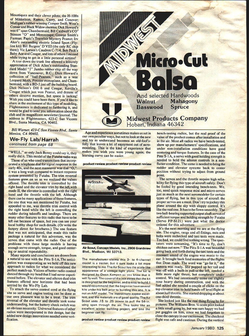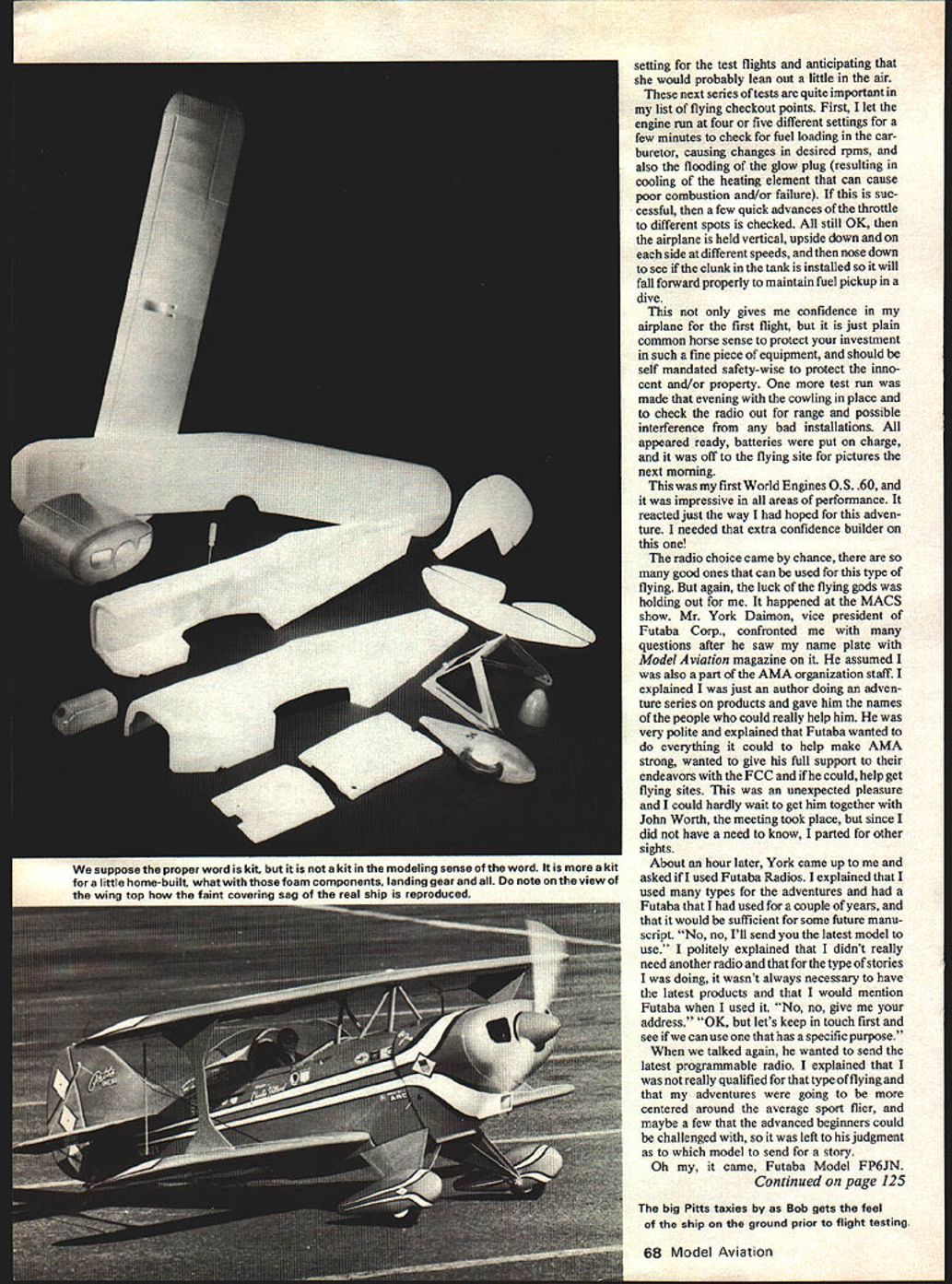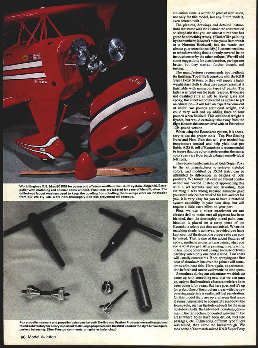 NO OCR TEXT NO OCR TEXT experience almost good Meeting Pat MACS show bore out text after usual third-degree conversation Bruce Godberson just appeared Byron Originals booth gave tips top advised watch Dean Copeland give demonstration ask him about Pitts S-lA late flying site Dean just finishing started goose pimples up spine started chatting looked flexed parts awesomekit knew experts could handle plane explained Dean concerned about average pilot just mastered basics asked about flutter foam during loops inside outside especially stab elevator also reacted crosswind land ings takeoffs what about deadstick landings Dean very much point walked over starter got OK fly filled fuel tank primed engine flick started up tuned pipe inside fuselage new sound ears big foam fuselage became resonant sounded very realistic Dean started takeoff wind taxi speed increased gave right rudder proceeded have very stable crosswind lift-off climbed out about 40 degrees did two right rolls pattern show spectators flew back starting point did two very tight inside outside loops right over head climbed out doing two rolls hung prop about 150 feet engine stopped dropped out stall deadstick regained control circled around brought crosswind landed about 50 feet starting point smiled said thanks about question claims further Dean expert has lot experience dont plan what did un less have nor recommend anyone else Dean knew validity questions wanted try give straight answers realistic scale view augmented sliding canoov Williams Brothers pilot outstanding decal detailing kit 64 Model Aviation top view displays familiar sunburst wing trim design real Pins famous 1-utaba Modelwith reversing device aileron elevator angle switching device elevator/flap mixing servo testing transmitting some self- contained features human-engineered transmitter readers over- under-present Pitts S-i As time drew near begin Pitts started reading comprehensive instruction manual reviewing parts list came black spinner Painting would no problem however soon resolved new red spinner came mail additional structions guys just dont stop customer satisfaction end Byro Drive ordered asked what type engine used could supply proper mounting came pre drilled match OS Max 60FSRperfectly kit included everything except giue covering material trim sheets radio starting batteries fuel Some special tools gauges supplied requiring good selection sandpaper some sharp cutting blades couple drill bits taps plus normal tools required radio engine installations Additional items almost must supply metal flux brushes applying epoxy masking tape cheap gummy stuff sanding blocks match contours foam especially curved block matches shape between ribs soldering iron will generate enough heat give strong flow-out type joints kit received shipper large size preview things come fuselage two halves fine-detail molded high-density beaded styrene foam male female alignment joints reinforcement gussets material build-up molded areas high stress strain Hole locations dimpled proper location minimal amount sanding required remove some flash before gluing together otlwr foam parts equal accuracy ease installation fit Hinge locations prenotched correct stallation plywood reinforcement blocks required foam has recessed receive precut parts snug good surface alignment fits after individual group packaged bags parts opened identified plus ones came later instruction manual additions almost 340 parts biggest single item 32 Robart plastic pinned hinges substituted 32 New Robart metal pinned hinges large foam pad used offer protec tion during shipping important items needed during construction model We-Fly Lab have found use- foam pads essential facets modeling sometimes prefer foam plastic skin laminated side like carpet manufacturers use padding Two types skin usually available local carpet shop PVC polyvinylchloride PE poly ethelene both have equal ding protection PE chemical resistant accidental spills foam alone has high friction characteris tics can used advantageously during assembly Caution recommended though Small metal shavings grit accumulate pores foam unnoticed can cause havoc finish removed skinned foam easier wipe clean properly cared can last years film-to-foam laminates first de veloped electronics industry found millions dollars could saved labor broken parts using approach during assembly simple demonstration used Lay ten dimes hard surface pick up same thing piece foam and/or skinned foamfatigue fumbling re duction obvious areas precision hydraulic parts being assembled foam pads being used department head asked run hand along surface foam grit unreal two cases testers hand cut minute metal shavings Needless say pads replaced skinned foam could cleaned Obviously takes little imagination see values work area especially engine repairs radio associated electronics work doing final installations finished plane etc simple part Byron Originals ap proach supplying best successful flight Pius S-l just example treats store engineering lab January1980 65 OD subjected lovely Pitts awkward position shot show tail wheel bottom markings Nestled fuselage precision-molded beaded styrene foam Futaba servos receiver battery pack wrapped special absorbent foam held place nylon electrical tie straps Aft Dortion slant-tvoe Sullivan 16-oz fuel tank new Klaooer-Klunk also furnished education alone worth price admission model future models scratch-built pictures drawings detailed instruc tions come kit make construction simplistic almost sure has got something wrong Kind like painting numbers doesnt make Rembrandt Norman Rockwell results almost guaranteed satisfy seems needless rehash everthing already covered instructions other authors will add some suggestions consideration perhaps better warrant further thought testing manufacturer recommends two methods finishing Top Flite Econokote K&B Super Poxy System will supply light weight glass cloth kit uses epoxy resin finishable numerous types 