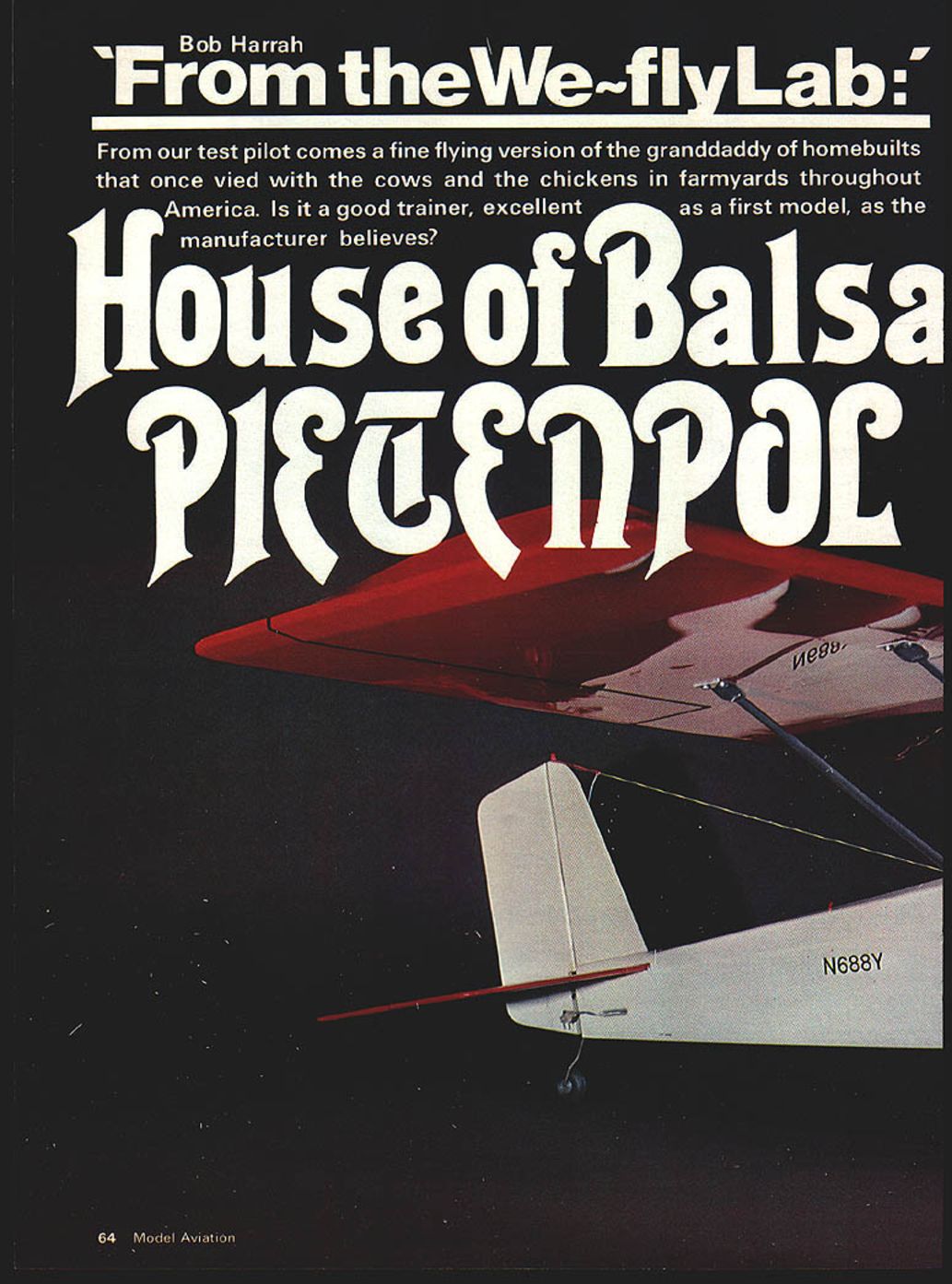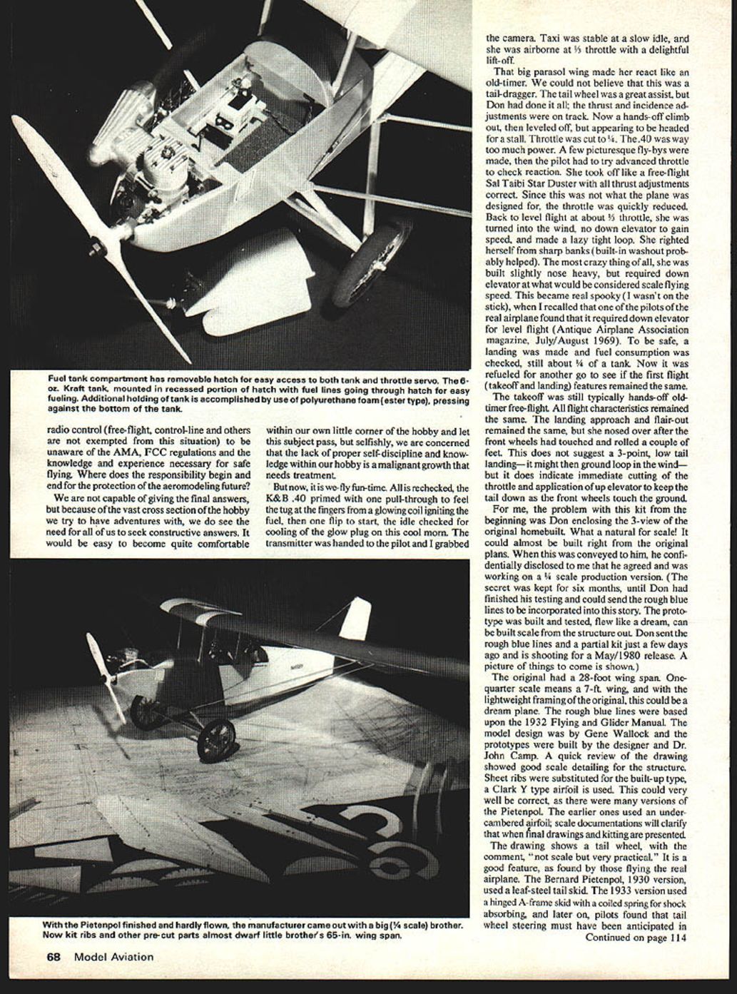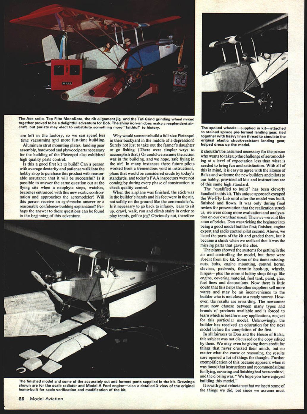 NO OCR TEXT NO OCR TEXT left factory can spend less time vacuuming fun-time building Aluminum strut mounting plates landing gear assembly hardwood plywood parts necessary building Pietenpol also exhibited high quality parts control good first kit build Can person average dexterity patience walk hobby shop purchase product reason able assurance will successful possible answer same question out flying site neophyte stops watches becomes entranced new exotic confron tation approaches aeromodeler Will person receive ego/macho answer reasonable confidence-building explanation Per haps answer questions can found beginning adventure would someone build full-size Pietenpol backyard middle depression Surely just take out farmers daughter go fishing simpler ways accomplish could assume action building hope safe flying air instances future pilots worked tremendous void instructions plans would considered crude todays standards todays FAA inspectors coming during phase construction check quality control airplane finished stick builders hands feet air safely ground like aeromodelers necessary go back infancy learn sit up crawl walk run climb stairs order play tennis golf jog Obviously therefore shouldnt assumed necessary person wants take up challenge aeromodel ing level expectation less what needed bring fun satisfaction mind easy agree House Balsa welcome new builders pilots hobby provided kits instructions same high standard qualified build has cleverly handled kit unique approach escaped We-Fly-Lab until after model built finished flown during final review presentation realization struck us doing evaluation analyza tion own usuaL hit like ton bricks Don tricking beginner being good model builder first finisher engine expert radio control pilot second Above listed parts kit graded became shock realized missing parts gave clue plans showed systems getting air controlling model absent kit Some items missing nuts bolts engine mounting control horns devises pushrods throttle hook-up wheels hingesplus normal hobby shop things like engine covering material fuel tank paint glue fuel lines decorations Now little doubt helps other suppliers sell wares may inconvenience builder close ready source ever results rewarding newcomer must now choose between types brands products available forced learn best applications notjust particular modeL Unlmowingly builder has received education next model before completion first fairness Don House Balsa subject discussed copy edited may giving credit things never crossed minds no matter what cause reasoning results sure opened lot things thought Further exemplification became apparent found instructions recommendations flying covering fmishinghad omitted closing hope have enjoyed building modeL great reluctance insert some things did since assume 66 Model Aviation Ace radio Top Fiite Monoiote tfle rib alignment jig Tuf-Grind grinding wheel mixed together proved delightful adventure Bob shiny iron-on does make resplendent air craft purists may elect substitute something faithfur history spoked wheelssupplied kitattached stained spruce pre-formed landing gear tied together heavy linen thread simulate original elastic shock-resistant landing gear helped dress up model finisntu muuei ena some OT tne accurateiy cut ana Tormea parts supplied tne kit Urawings shown scale radiator Model Ford enginealso detailed 3-view original home-built scale verification modification kit readers magazine already beyond first model stage will bold infringe upon unmentioned portions kit 2- 3-channel design 09 35 engine weighing between 4 5 lbs less 17 oz per sq ft wing loading Experience study plans gave some insight areas caution wing stabilizer set negative zero incidence respectively Down right engine thrust built center gravity CG about 28% wing chord Following plans must want beautiful takeoff landing character istics model capable Under design parameters being tail heavy would almost sure instant crash After completion model proved little tail heavy having 35 engine ready went K&B 40 Tatone Muffler Exhaust-Off spoked wheelsavailable House Balsa stained hardwood struts added wire landing gear got CG recommended location Top Flite Mono Kote used covering Pactra Formula-U aluminum paint used simu late metal cowling cockpit areas Klett pin-type hinges Carl Goldberg control horns K& S Engineering streamline tubing working wing struts used Standard glues used part During final stages received experimental bottle new type glue Carl Goldberg unnamed variation Jet Super Glue now months later time read Super Jet Instant Glue will old news few airplanes later after tests satisfied product havent tried yet will probably find out did its great addition glue supply better fun building House Balsa supplies two other products very helpful model will become regular aids future modeling Up Right wing-rib jig setting checking ribs vertical alignment Tuf-Grind grinding wheel makes cutting piano wire pleasure neat fiberglass trimming OK some plastics watch out overheat ing gumming up can cause binding Once again used Ace Radio new Bantam Midget servos high thrust offered needed instant reaction servos still pleasure airplane responding immediately pilots move control sticks some unexplainable reason seems comfortable range test radio rerun engine check out everything day before first flight flying picture Perhaps gives confidence know order yesterday batteries fully recharged night rechecked before first flight doesnt have worry about what might wrong can fully concentrate what going wonder failures first flights witnessed could have avoided panic scrambling anxiousness get air checking testing left morning first flight examples vivid morning first flew Pietenpol first scale job flown times months gone before flight watched modeler get plane Out car run goo out engine check controls stop start recheck engine response now good ship taxied out made beautiful lift-off about 50 yards down line about 10 feet air fli
