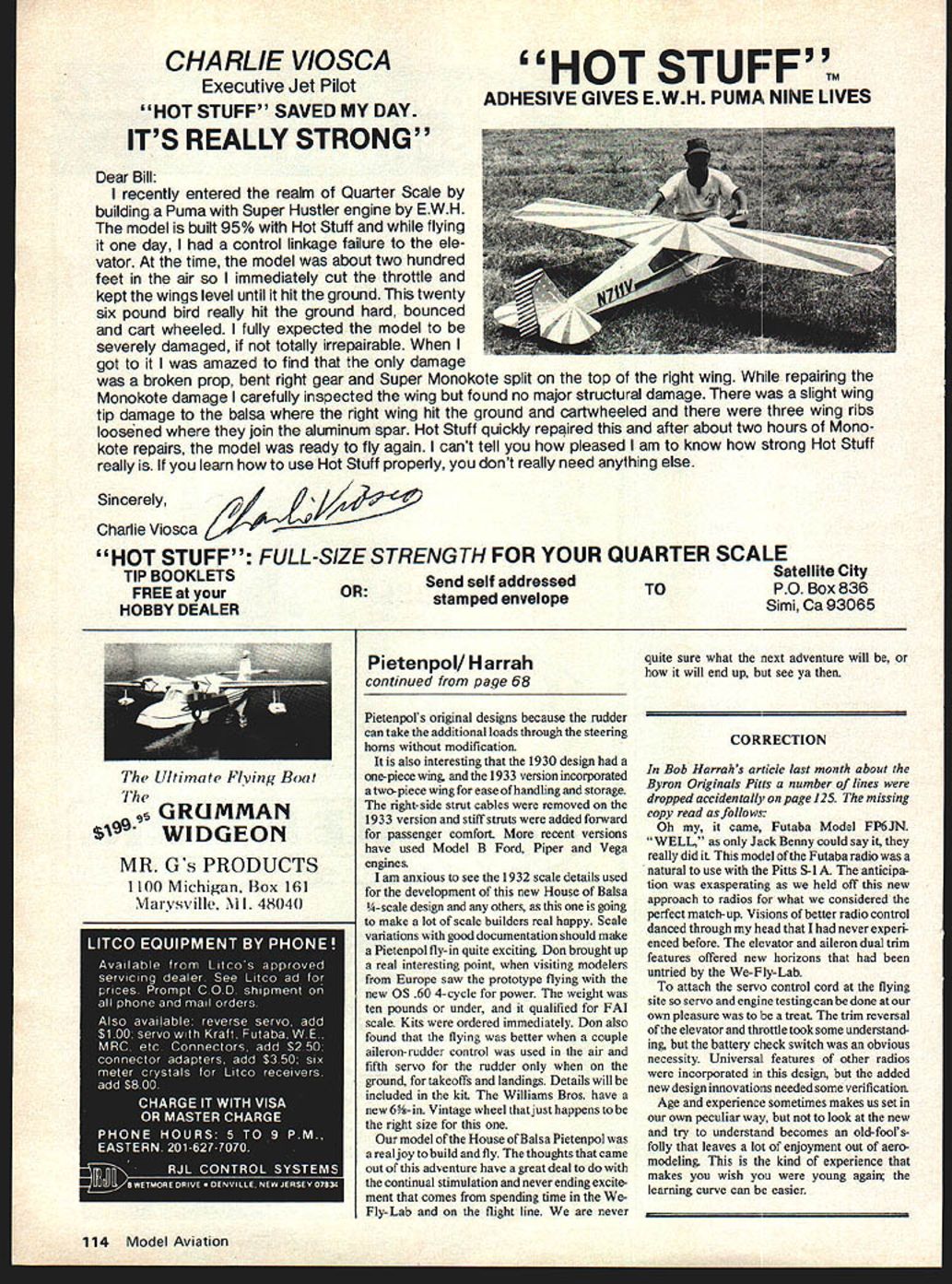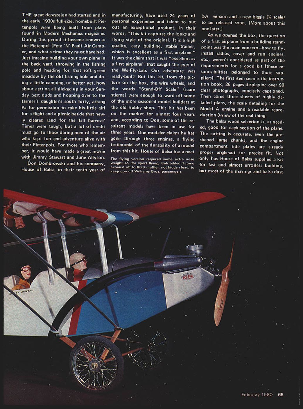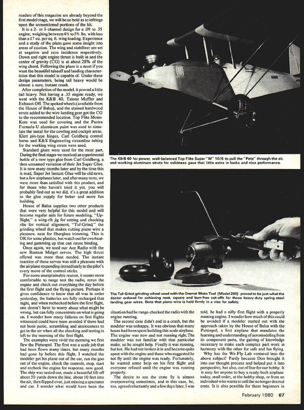 NO OCR TEXT NO OCR TEXT left factory can spend less time vacuuming fun-time building Aluminum strut mounting plates landing gear assembly hardwood plywood parts necessary building Pietenpol also exhibited high quality parts control good first kit build Can person average dexterity patience walk hobby shop purchase product reason able assurance will successful possible answer same question out flying site neophyte stops watches becomes entranced new exotic confron tation approaches aeromodeler Will person receive ego/macho answer reasonable confidence-building explanation Per haps answer questions can found beginning adventure would someone build full-size Pietenpol backyard middle depression Surely just take out farmers daughter go fishing simpler ways accomplish could assume action building hope safe flying air instances future pilots worked tremendous void instructions plans would considered crude todays standards todays FAA inspectors coming during phase construction check quality control airplane finished stick builders hands feet air safely ground like aeromodelers necessary go back infancy learn sit up crawl walk run climb stairs order play tennis golf jog Obviously therefore shouldnt assumed necessary person wants take up challenge aeromodel ing level expectation less what needed bring fun satisfaction mind easy agree House Balsa welcome new builders pilots hobby provided kits instructions same high standard qualified build has cleverly handled kit unique approach escaped We-Fly-Lab until after model built finished flown during final review presentation realization struck us doing evaluation analyza tion own usuaL hit like ton bricks Don tricking beginner being good model builder first finisher engine expert radio control pilot second Above listed parts kit graded became shock realized missing parts gave clue plans showed systems getting air controlling model absent kit Some items missing nuts bolts engine mounting control horns devises pushrods throttle hook-up wheels hingesplus normal hobby shop things like engine covering material fuel tank paint glue fuel lines decorations Now little doubt helps other suppliers sell wares may inconvenience builder close ready source ever results rewarding newcomer must now choose between types brands products available forced learn best applications notjust particular modeL Unlmowingly builder has received education next model before completion first fairness Don House Balsa subject discussed copy edited may giving credit things never crossed minds no matter what cause reasoning results sure opened lot things thought Further exemplification became apparent found instructions recommendations flying covering fmishinghad omitted closing hope have enjoyed building modeL great reluctance insert some things did since assume 66 Model Aviation Ace radio Top Fiite Monoiote tfle rib alignment jig Tuf-Grind grinding wheel mixed together proved delightful adventure Bob shiny iron-on does make resplendent air craft purists may elect substitute something faithfur history spoked wheelssupplied kitattached stained spruce pre-formed landing gear tied together heavy linen thread simulate original elastic shock-resistant landing gear helped dress up model finisntu muuei ena some OT tne accurateiy cut ana Tormea parts supplied tne kit Urawings shown scale radiator Model Ford enginealso detailed 3-view original home-built scale verification modification kit readers magazine already beyond first model stage will bold infringe upon unmentioned portions kit 2- 3-channel design 09 35 engine weighing between 4 5 lbs less 17 oz per sq ft wing loading Experience study plans gave some insight areas caution wing stabilizer set negative zero incidence respectively Down right engine thrust built center gravity CG about 28% wing chord Following plans must want beautiful takeoff landing character istics model capable Under design parameters being tail heavy would almost sure instant crash After completion model proved little tail heavy having 35 engine ready went K&B 40 Tatone Muffler Exhaust-Off spoked wheelsavailable House Balsa stained hardwood struts added wire landing gear got CG recommended location Top Flite Mono Kote used covering Pactra Formula-U aluminum paint used simu late metal cowling cockpit areas Klett pin-type hinges Carl Goldberg control horns K& S Engineering streamline tubing working wing struts used Standard glues used part During final stages received experimental bottle new type glue Carl Goldberg unnamed variation Jet Super Glue now months later time read Super Jet Instant Glue will old news few airplanes later after tests satisfied product havent tried yet will probably find out did its great addition glue supply better fun building House Balsa supplies two other products very helpful model will become regular aids future modeling Up Right wing-rib jig setting checking ribs vertical alignment Tuf-Grind grinding wheel makes cutting piano wire pleasure neat fiberglass trimming OK some plastics watch out overheat ing gumming up can cause binding Once again used Ace Radio new Bantam Midget servos high thrust offered needed instant reaction servos still pleasure airplane responding immediately pilots move control sticks some unexplainable reason seems comfortable range test radio rerun engine check out everything day before first flight flying picture Perhaps gives confidence know order yesterday batteries fully recharged night rechecked before first flight doesnt have worry about what might wrong can fully concentrate what going wonder failures first flights witnessed could have avoided panic scrambling anxiousness get air checking testing left morning first flight examples vivid morning first flew Pietenpol first scale job flown times months gone before flight watched modeler get plane Out car run goo out engine check controls stop start recheck engine response now good ship taxied out made beautiful lift-off about 50 yards down line about 10 feet air fli