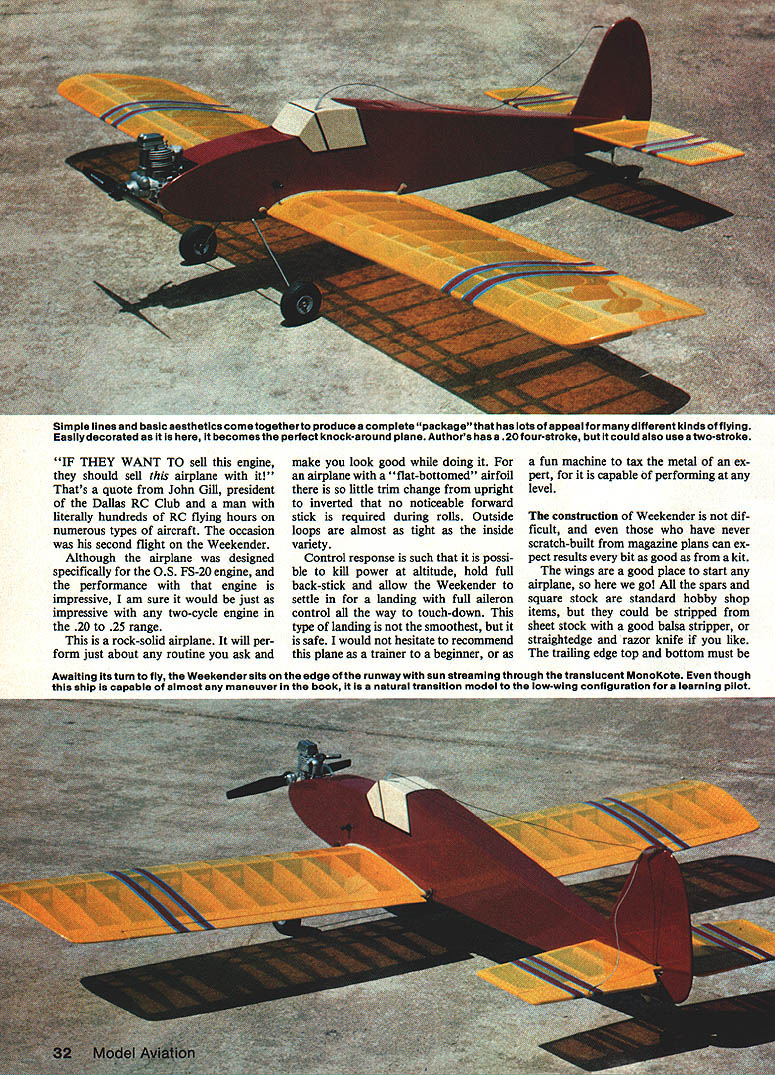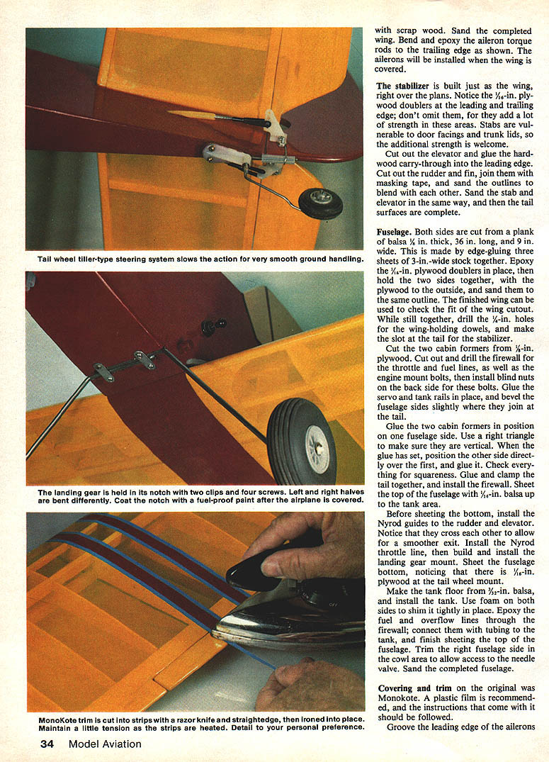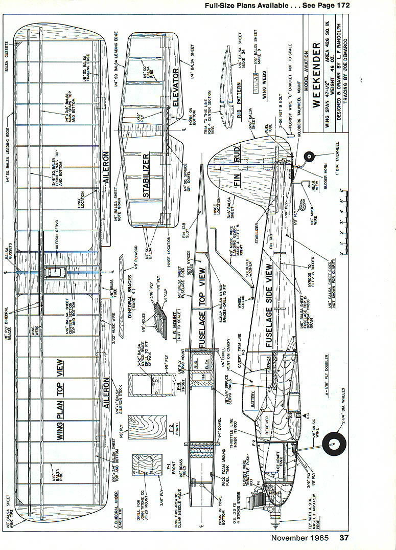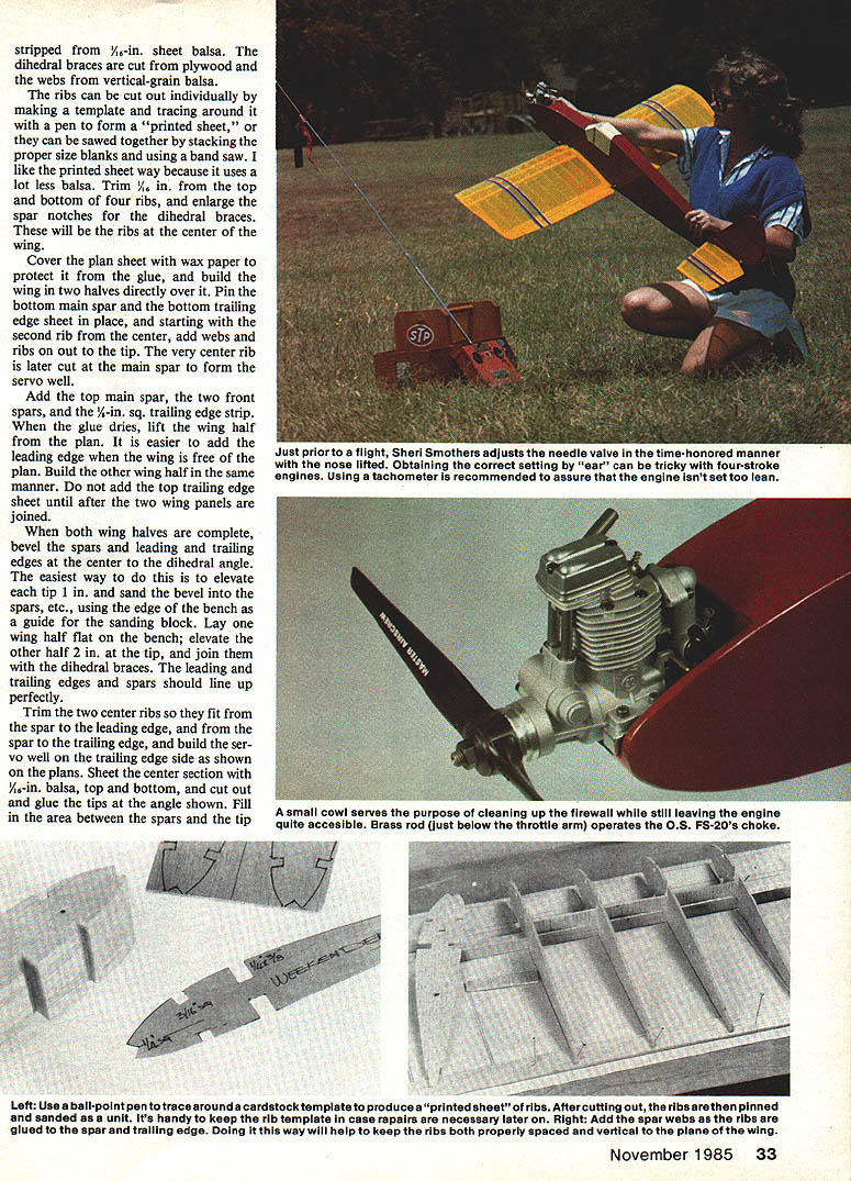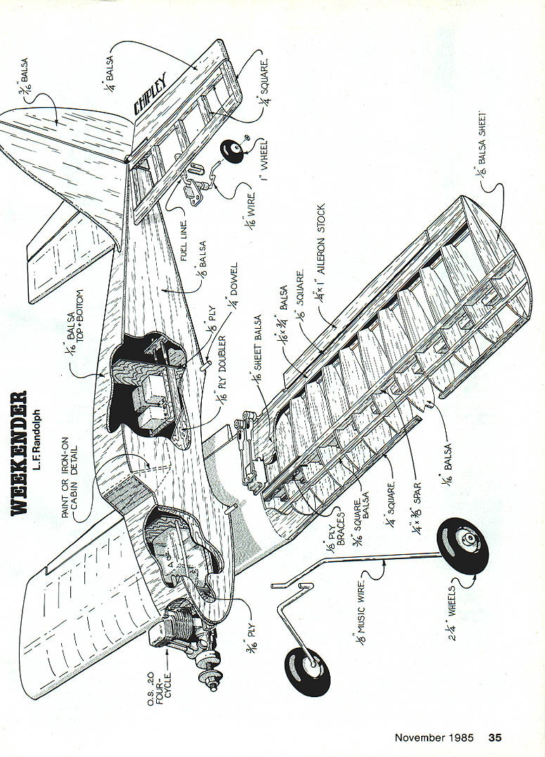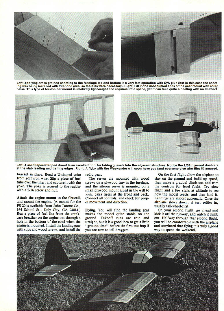 NO OCR TEXT wa photos 0s fIat-hot may n vnu am h Simple lines basic aesthetics come togetherto produce complete package has lots appeal different kinds flying Easily decorated becomes perfect knock-around plane Authors has 20 four-stroke could also use two-stroke IF THEY WANT TO sell engine should sell airplane Thats quote John Gill president Dallas RC Club man literally hundreds RC flying hours numerous types aircraft occasion second flight Weekender Although airplane designed specifically OS FS-20 engine performance engine impressive am sure would just impressive two-cycle engine 20 25 range rock-solid airplane will per form just about routine ask make look goad doing airplane flat-bottomed airfoil little trim change upright inverted no noticeable forward stick required during rolls Outside loops almost tight inside variety Control response such possi ble kill power altitude hold full back-stick allow Weekender settle landing full aileron control way touch-down type landing smoothest safe would hesitate recommend plane trainer beginner fun machine tax metal ex pert capable performing level construction Weekender dif ficult have never scratch-built magazine plans can ex pect results bit good kit wings good place start airplane go spars square stock standard hobby shop items could stripped sheet stock good balsa stripper straightedge razor knife like trailing edge top bottom must Awaiting its turn fly Weekender sits edge runway sun streaming through translucent MonoKote though ship capable almost maneuver book isa natural transition model low-wing configuratIon learning pilot stripped A-in sheet balsa dihedral braces cut plywood webs vertical-grain balsa ribs can cut out individually making template tracing around pen form printed sheet can sawed together stacking proper size blanks using band saw like printed sheet way because uses lot less balsa Trim top bottom four ribs enlarge spar notches dihedral braces will ribs center wing Cover plan sheet wax paper protect glue build wing two halves directly over Pin bottom main spar bottom trailing edge sheet place starting second rib center add webs ribs out tip very center rib later cut main spar form servo well Add top main spar two front spars A-in sq trailing edge strip glue dries lift wing half plan easier add leading edge wing free plan Build other wing half same manner add top trailing edge sheet until after two wing panels joined both wing halves complete bevel spars leading trailing edges center dihedral angle easiest way to elevate tip 1 sand bevel spars etc using edge bench guide sanding block Lay wing half flat bench elevate other half 2 tip join dihedral braces leading trailing edges spars should line up perfectly Trim two center ribs fit spar leading edge spar trailing edge build ser vo well trailing edge side shown plans Sheet center section A-in balsa top bottom cut out glue tips angle shown Fill area between spars tip Left Use ball-point pen totrace around cardstocktempiate produce printed sheet ribs Aftercutting out ribs arethen pinned sanded unit its handy keep rib tempiate case rapairs necessary iater Right Add spsr webs ribs giued spar traiiing edge Doing way wili help keep ribs both properiy spaced verticai piane wing November 1985 33 Just prior fiight Sheri Smothers adjusts needle vaive time-honored manner nose lifted Obtaining correct setting ear can tricky four-stroke engines Using tachometer recommended assure engine isnt set too ean small cowi serves purpose cleaning up firewali whlie stiii ieaving engine quite accesibie Brass rod just beiow throttie arm operates OS FS-20s choke scrap wood Sand completed wing Bend epoxy aileron torque rods trailing edge shown ailerons will installed wing covered stabilizer built just wing right over plans Notice /6-in ply wood doublers leading trailing edge dont omit add lot strength areas Stabs vul nerable door facings trunk lids additional strength welcome Cut out elevator glue hard wood carry-through leading edge Cut out rudder fin join masking tape sand outlines blend other Sand stab elevator same way tail surfaces complete Fuselage Both sides cut plank balsa / thick 36 long 9 wide made edge-gluing three sheets 3-in-wide stock together Epoxy A6-in plywood doublers place hold two sides together plywood outside sand same outline finished wing can used check fit wing cutout still together drill A-in holes wing-holding dowels make slot tail stabilizer Cut two cabin formers A-in plywood Cut out drill firewall throttle fuel lines well engine mount bolts install blind nuts back side bolts Glue servo tank rails place bevel fuselage sides slightly join tail Glue two cabin formers position fuselage side Use right triangle make sure vertical glue has set position other side direct ly over first glue Check thing squareness Glue clamp tail together install firewall Sheet top fuselage /6-in balsa up tank area Before sheeting bottom install Nyrod guides rudder elevator Notice cross other allow smoother exit Install Nyrod throttle line build install landing gear mount Sheet fuselage bottom noticing A6-in plywood tail wheel mount Make tank floor %2-in balsa install tank Use foam both sides shim tightly place Epoxy fuel overflow lines through firewall connect tubing tank finish sheeting top fuselage Trim right fuselage side cowl area allow access needle valve Sand completed fuselage Covering trim original Monokote plastic film recommend ed instructions come MonoKote trim cut strips razor knife straightedge ironed place should followed Maintain little tension strips heated Detail personal preference Groove leading edge ailerons 34 Model Aviation Tail wheel tiller-type steering system slows action very smooth ground handling landing gear held its notch two clips Tour screws Lefl rigflt flalves bent differently Coat notch fuel-proof paint after airplane covered WEEKENDER/i LsA __LE Randolph PAINT OR IRON-ON __\//ii 1 /1/BALA ~7w\K t6SHEETBAL3AIVvIR~SQUARE 3QUAREi AILROt4 STOCK MUSIC WIRESQUARE 3QIJAR