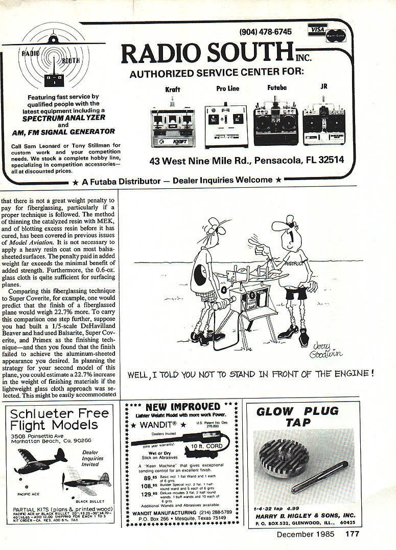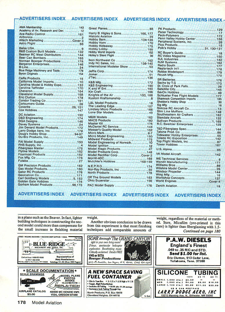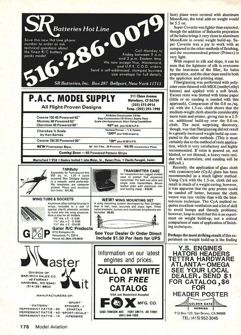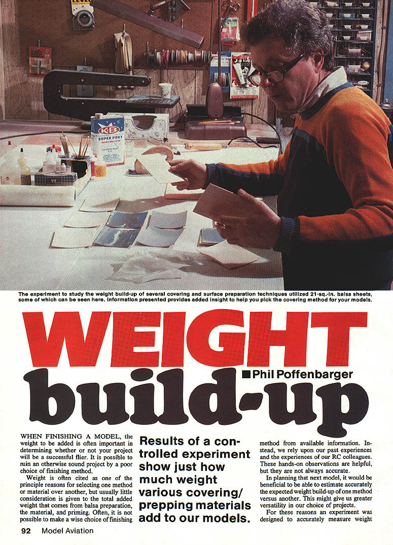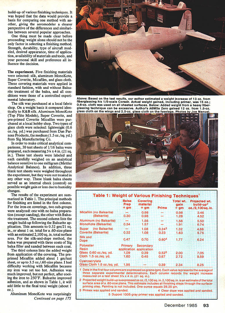The experiment study weight build-up severai covering surface preparation techniqut. some can seen information presented provides added insight heip pick covering method modeis much weight various covering prepping materials add models 92 Model Aviation WHEN FINISHiNG MODEL weight added often Its con-method available intormation Indetermining whether project troll e dstead rely upon past experiences will successful flier possible to experi meni experiences RC colleagues ruin otherwise sound project poor show j u st howThese hands-on observations helpful choice finishing methodbut always accurate Weight often cited planning next model would principle reasons selecting methodbeneficial able estimate accurately material over another usually littlethe expected weight build-up method consideration given total addedversus another might give us greater weight comes balsa preparationversatility choice projects material priming Often reasons experiment possible make wise choice finishingdesigned accurately measure weight build-up various finishing techniques hoped data would provide basis comparing method other giving aeromodeler clearer perspective differences similari ties between several popular approaches thing must made clear before proceeding weight alone should factor selecting finishing method Strength durability type aircraft mod eled desired appearance time applica tion availability materials tools personal skill preference fluence decision experiment Five finishing materials selected silk aluminum MonoKote Super Coverite Micaflim glass cloth covering materials applied standard fashion Balsarite treatment balsa con ditions controlled experi mental laboratory silk purchased local fabric shop weight basis compared iden tically K&B silk Aluminum MonoKote Top Flite Models Super Coverite pre-primed Coverite Micafilm pur chased local hobby shop Two types glass cloth selected lightweight 06 oz/sq yd purchased Dan Par sons Products medium 15 02/sq yd Sig Manufacturing Co order make critical analytical com parisons 30 test sheets 1/16 balsa prepared measuring 5 x 4 21 sq test sheets labeled carefully weighed analytical balance sensitive milligram Mettler Analytical Balance addition three blank test sheets weighed throughout experiment treated other way blank balsa sheets served internal check control possible weight gain loss due humidity changes results experiment sum marized Table 1 principal methods finishing listed first column iron-on coverings two sub-groups analyzed no balsa prepara tion except sanding other Balsarite treatment second column lists weight build-up following Balsarite ap plication amounts 032 gm/21 sq about 1 oz total 60-size plane estimated 2100 sq total surface area silk-and-dope method balsa prepared three coats Sig balsa filler sanded between coat third column lists added weight application covering pre primed Micafilni added about 1 gm/test sheet up 35 oz/60-size plane difficulty working Micafilm because iron set too hot Adhesion much improved perfect after cool ing iron 2500F Balsarite improved adhesion shown Table 1 will add little final total weight about 1 oz Aluminum MonoKote surprisingly Continued page 175 Table 1 Weight Balsa Prep icaflim no Balsarite Balsarite030 Aluminum no Balsarite MonoKote Balsarite Super no Balsarite Coverite Balsarite Silk Dope Polyester Resin Glass 060 02/sq yd Cloth 15 ozIsq yd Various Finishing Techniques 1 Prime 098 128 156156 034157191 108024132 032108023163 346 452 550 674 466 575 047070060177624 Primary application 109 160 Cyanoacrylate Glass Cloth 15 02/sq yd195 Secondary application 039 045 052 067 200 272 039234 705 959 825 1 Data first four columns expressed grams gin value represents average three separate experimental determinations column records weight increase measured test sheet 5 x 4 121 sq 2 Projectedweight build-up expressed oz121 00 sq 2100 sq estimate total surface area 60-size plane estimate includes finishing steps through surface priming step Painting included ounce equals 2835 gin 3 Primex applied sanded 4 Clear dope applied sanded 5 Dupont lOOS gray primer applied sanded December 1985 93 Above Based test results author estimated weight increase 13 oz fibergiassing 1/5scaie Corsair Actual weight gained including primer 15 oz O6-oz cloth used sheeted surfaces Below Added wainht heavy fiber alassina techniqus enn excesiva Amuthnr ARUn 7am 10 fn h9 CoveringTotal wt Projected wt materialgainbuild-up2 m oz/21 OOsq 098 098 fuselage frame over plans After assembly dry smooth both sides sanding block add plywood doub lers Round off fuselage edges sandpaper except stabilizer will mounted Cut out desired engine weight mount modules sand Cut out tail parts cockpit dorsal fin wing flaps sand smooth Sand some taper flaps elevator desired Cover parts lightweight heatshrink material Japanese tissue clear dope could used covering will probably require maintenance Add color dope trim desired Final assembly begins wing-fuse lage intersection Slip outboard tip cleaning wing opening sandpaper stick required Slip wing off its centered position temporarily coat center section top bottom thoroughly white glue Slip wing back proper final position Force white glue voids Align wing properly apply thin CyA entire joint unit will strong enough handle Make fillet baking soda around leading edge wing both sides apply CyA Clean covering material sur faces joined install horizontal stabilizer fuselage being careful align wing As wing joint use white glue CyA baking soda/ CyA fillet Similarly install fin rudder Slip flap joiner wire through fuselage Drill flaps Cut slots hinges Install flap elevator hinges shown plans cer tain run pins through hinges make sure wont come out Install control horns Rig pushrod bellcrank next last outside hole flap hornand pushrod last hole flap horn elevator Check plans control surface deflec tions Balance model shown plans sensitive controls move center gravity CG rearward less sensitive move CG forward May flying