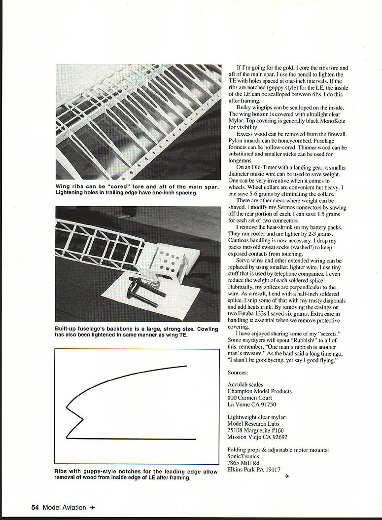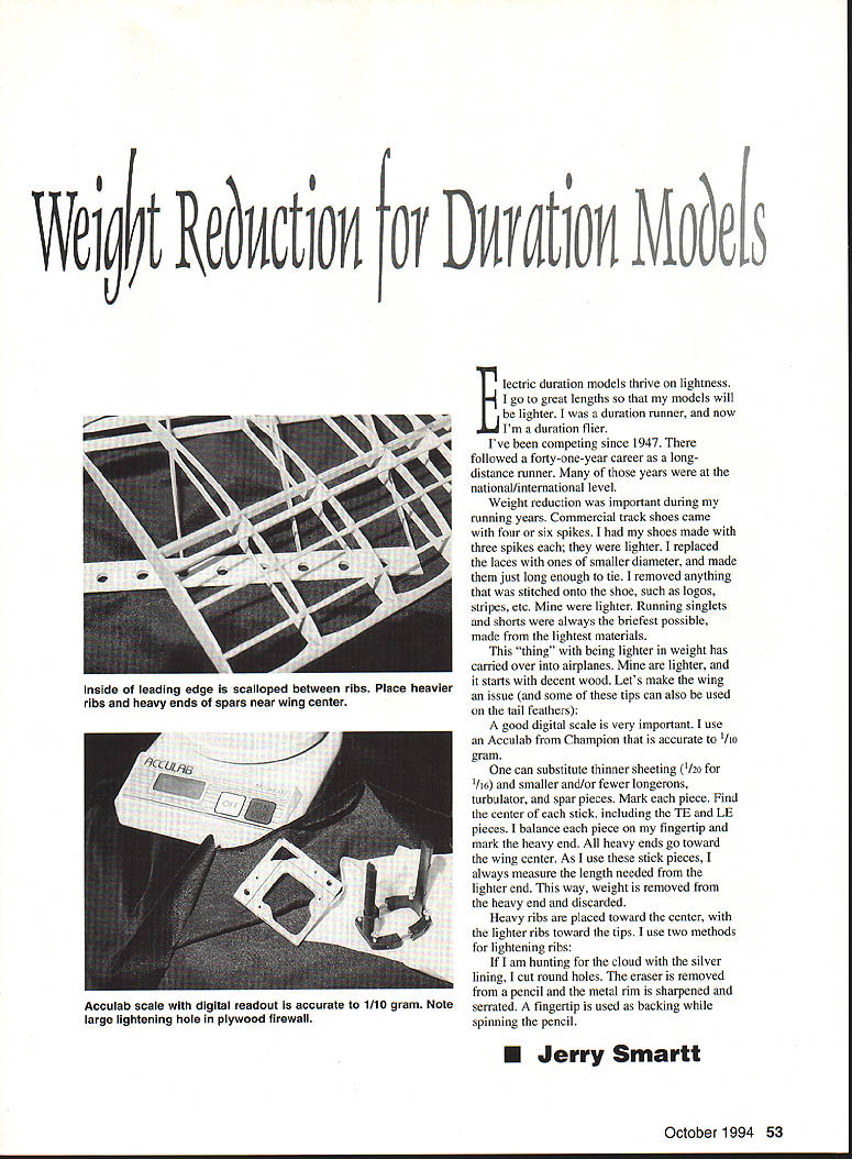 Ve RebcIion Draton Mo e Electric duration models thrive lightness go great lengths models will lighter duration runner now Im duration flier Ive competing since 1947 followed forty-one-year career longdistance runner years national/international level Weight reduction important during running years Commercial track shoes came four six spikes shoes made three spikes lighter replaced laces ones smaller diameter made just long enough tie removed anything stitched onto shoe such logos stripes etc Mine lighter Running singlets shorts always briefest possible made lightest materials thing being lighter weight has carried over airplanes Mine lighter starts decent wood Lets make wing issue some tips can also used tail feathers good digital scale very important use Acculab Champion accurate 1/10 gram can substitute thinner sheeting 1/20 1/16 smaller and/or fewer longerons turbulator spar pieces Mark piece Find center stick including TE LE pieces balance piece fingertip mark heavy end heavy ends go toward wing center As use stick pieces always measure length needed lighter end way weight removed heavy end discarded Heavy ribs placed toward center lighter ribs toward tips use two methods lightening ribs am hunting cloud silver lining cut round holes eraser removed pencil metal rim sharpened serrated fingertip used backing spinning pencil U Jerry Smartt October 1994 53 Inside leading edge scalloped between ribs Place heavier ribs heavy ends spars near wing center Acculab scale digital readout accurate 1110 gram Note large lightening hole plywood firewall Im going gold core ribs fore aft main spar use pencil lighten TE holes spaced one-inch intervals ribs notched guppy-style LE inside LE can scalloped between ribs after framing Bulky wingtips can scalloped inside wing bottom covered ultralight clear Mylar Top covering generally black MonoKote visibility Excess wood can removed firewall Pylon innards can honeycombed Fuselage formers can hollow-cored Thinner wood can substituted smaller sticks can used longerons Old-Timer landing gear smaller diameter music wire can used save weight can very inventive comes wheels Wheel collars convenient heavy can save 5-6 grams eliminating collars other areas weight can shaved modify Sermos connectors sawing off rear portion can save 15 grams set two connectors remove heat-shrink battery packs run cooler lighter 2-3 grams Cautious handling now necessary drop packs old sweat socks washed keep exposed contacts touching Servo wires other extended wiring can replaced using smaller lighter wire use tiny stuff used telephone companies reduce weight soldered splice Habitually splices perpendicular wire As result end half-inch soldered splice snip some trusty diagonals add heatshrink removing casings two Futaba 133s saved six grams Extra care handling essential remove protective covering have enjoyed sharing some secrets Some naysayers will spout Rubbish remember mans rubbish another mans treasure As bard said long time ago shant goodbyeing yet say good flying Sources Acculab scales Champion Model Products 800 Carmen Court La Verne CA 91750 Lightweight clear mylar Model Research Labs 25108 Marguerite #160 Mission Viejo CA 92692 Folding props & adjustable motor mounts SonicTronics 7865 Mill Rd Ribs guppy-style notches leading edge allowElkins Park PA 19117 removal wood inside edge LE after framing 54 Model Aviation ribs can cored fore aft main spar Lightening holes trailing edge have one-inch spacing Built-up fuselages backbone large strong size Cowling has also lightened same manner wing TE
