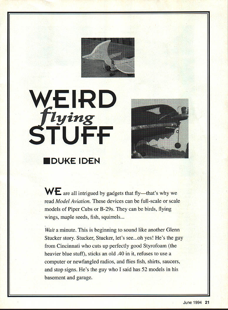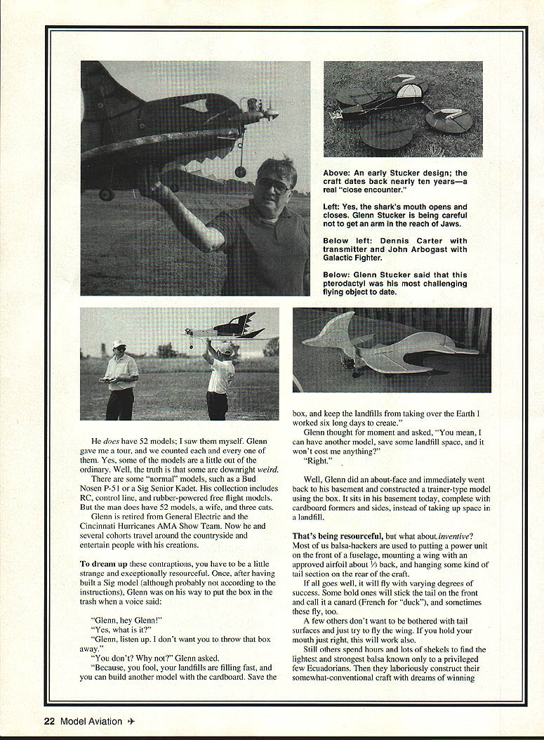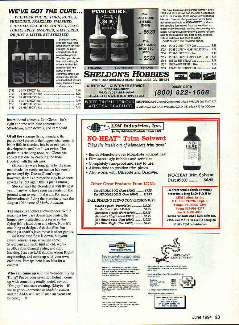 WEIRD lying TUFF EDUKE DEN WE intrigued gadgets fly-thats read Model Aviation devices can full-scale scale models Piper Cubs B-29s can birds flying wings maple seeds fish squirrels. Wait minute beginning sound like another Glenn Stucker story Stucker Stucker lets see. oh yes Hes guy Cincinnati cuts up perfectly good Styrofoam heavier blue stuff sticks old 40 refuses use computer newfangled radios flies fish shirts saucers stop signs Hes guy said has 52 models basement garage June 1994 21 does have 52 models saw myself Glenn gave tour counted Yes some models little out ordinary Well truth some downright weird some normal models such Bud Nosen P-5 1 Sig Senior Kadet collection includes RC control line rubber-powered free flight models But the man does have 52 models wife three cats Glenn retired General Electric Cincinnati Hurricanes AMA Show Team Now several cohorts travel around countryside entertain people creations dream up contraptions have little strange exceptionally resourceful Once after having built Sig model although probably according instructions Glenn way put box trash voice said Glenn hey Glenn Yes what Glenn listen up dont want throw box away dont Glenn asked Because fool landfills filling fast can build another model cardboard Save box keep landfills taking over Earth worked six long days create Glenn thought moment asked mean can have another model save some landfill space wont cost anything Right Well Glenn did about-face immediately went back basement constructed trainer-type model using box sits basement today complete cardboard formers sides instead taking up space landfill Thats being resourceful what aboutinventive Most us balsa-hackers used putting power unit front fuselage mounting wing approved airfoil about 1/3 back hanging some kind tail section rear craft goes well will fly varying degrees success Some bold ones will stick tail front call canard French duck sometimes fly too few others dont want bothered tail surfaces just try fly wing hold mouth just right will work also Still others spend hours lots shekels find lightest strongest balsa known privileged few Ecuadorians laboriously construct somewhat-conventional craft dreams winning 22 Model Aviation e An early Stucker design craft dates back nearly ten yearsa real close encounter Left Yes sharks mouth opens closes Glenn Stucker being careful get arm reach Jaws Below left Dennis Carter transmitter John Arbogast Galactic Fighter Below Glenn Stucker said pterodactyl challenging flying object date WEVE GOT THE CURE. WHETHER YOURE TORN RIPPED SHREDDED FRAZZLED SMASHED CRUSHED CRACKED CHIPPED FRAC TURED SPLIT SNAPPED SHAITERED OR JUST LIITEL BIT STRESSED Sheldons epoxy products have long known strength flexibility reliability reasonable prices Whether choose quick setting 5minute field repair just hurry extremely strong 30minute can confident using best price27625 MIN EPOXY Suz596 276312 MN EPOXY loz596 276430 MIN EPOXY 8oz596 27595 MN EPOXY 9uz749 276015 MN EPOXY 9oz749 276130 MN EPOXY 9oz749 have marketing POSICURE since ig84 have always best product avail able modeler absolute lowest possi ble price always assured finest adhesives available POSI-CURE products specially formulated very best avalable raw materials use no second grade stock warehouse inventory stored ref riger ated maintain very best quality possible Lots imitators good POSICURE~a modelers choice 2752 POSICtlRE~ THN 2oz 539 2753POSI-CURE OAP-FILLNO 2oz539 2754POSI-CURE THN loz349 2755POSI-CURE GAP FILLNG loz 349 2756NSTA-SET SPRAY 2oz349 2757NSTA-SET REFILL lOoz796 2758UN-CURE DEBONDER loz296 SHELDONS HOBBIES 2135 OLD OAKLAND ROAD SAN JOSE CA 95131 international contests Glennhes right home blue construction Styrofoam birch dowels cardboard strange flying wonders pterodactyl presents biggest challenge fifth series has year development has flown twice problem long nose Glenn has solved coupling nose rudder ailerons Since long gone time man made scene no human has seen pterodactyl fly Due Glenns age however rumor may have seen several fly again just rumor Stucker says pterodactyl will fly next year have seen model ground want see air information flying pterodactyl see August 1986 issue Model Aviation shark another show-stopper making low pass downstage center hinged jaw attached servo flying fishs jaws open close Now its thing design fish flies making sharks jaws move sheer genius So cash flow down inventiveness up scrounge some Styrofoam such find old wornin 40 four-channel radio start hacking Just use LAR Looks About Right engineering come up own creations Perhaps idea contest can come up Weirdest Flying Thing Put invention helmet come up something totally weird cry out Oh joy start creating Maybeif goodsomeone Model Aviation AMA will see such event can beheld EAT Trim Solvent Takes hassle out Monokote trim work Bonds Monokote over Monokote heat Eliminates ugly bubbles wrinkles Completely fuel-proof easy use Allows time position trim pieces Also works Ultracote Oracover Other Great Products LDM STRONGBOX Part #8000 95 STRONGBOX II Pert #81 00 5 BALL BEARING SERVO CONVERSIONKITS Futaba 4-pack Part #9600$2995 Futaba Single Part #9610$795 Alrtronfcs 4-pack Part #9700$2995 Alrtronics Single Part #9710$795 JR / Hitec 4-pack Part #9800$2095 JR / Hitec Single Part #981 0$595 FZZZZi boa tht hvpnThi AvlationhnokO Oil haa earned its l5EtglCht aviation mmiv oil nmdelcv tttiome tried too Ospetre hive Dave Pettily nave yost Iineosoe Itanoohoannove penduot lieytoplilvoinoetaotthe TOIC need hoportroi reasosta ertpln avpatlrntoaanohe envetlent petaivenTh ootair5entpettceetetvne lOtovty naulaoveeee too hene tenngnieed hvpetitti advantage Anteeioen Model Ptndoots Atti bonvning no anohe system nonspononta end TeeaOOiotoryatemoa TOME pmvdonet vi thn hmotpte hnoloPonp hens identified nisible aupetiotity finpetlOet Tier io no soboitote foe qolityhopeoDO Cntaotycvo lnoalltobbyshoplint live doesot oaoyooprodotinaiOthotivodvoerv isynvnaot w.ittvoilslipditeottoyoomdovr NO
