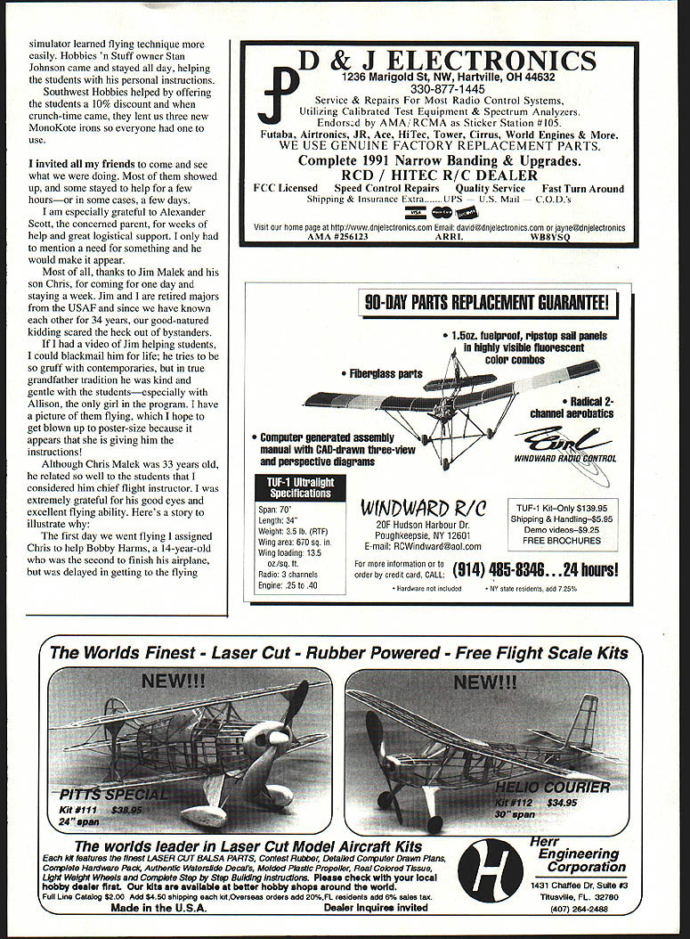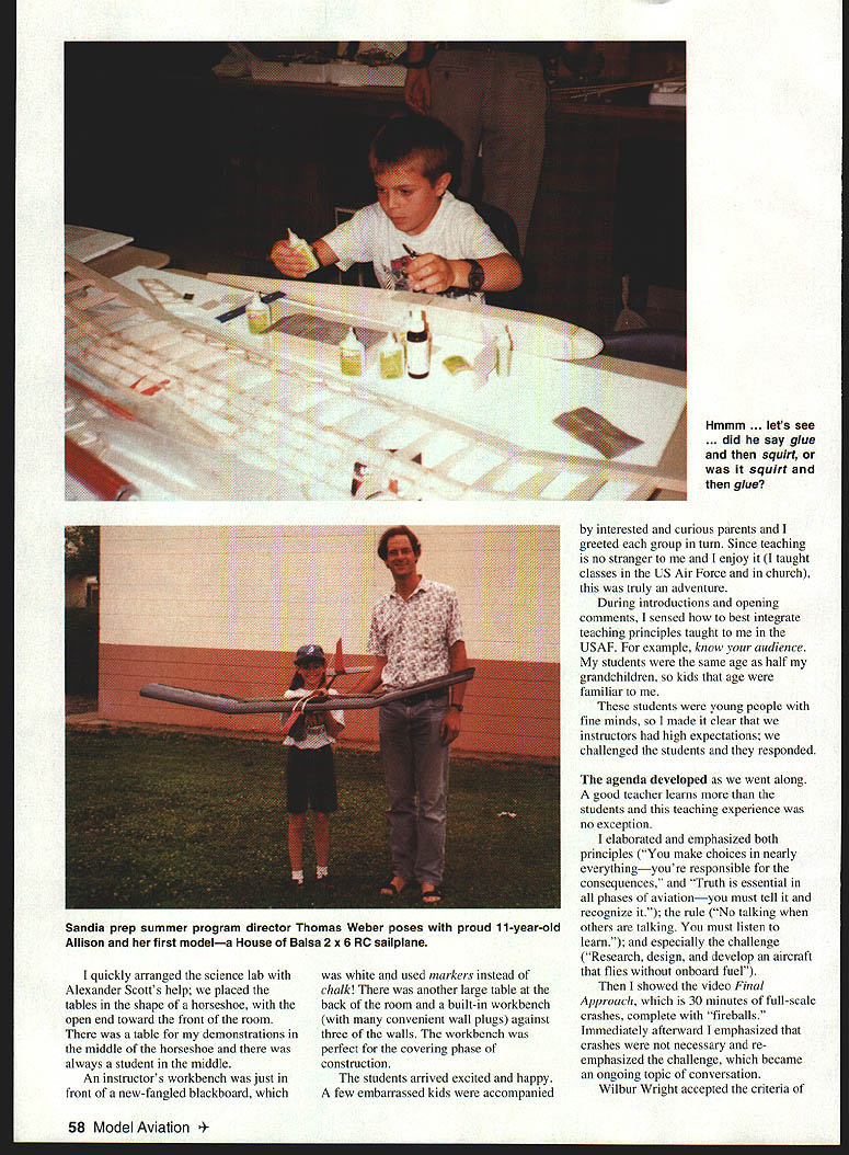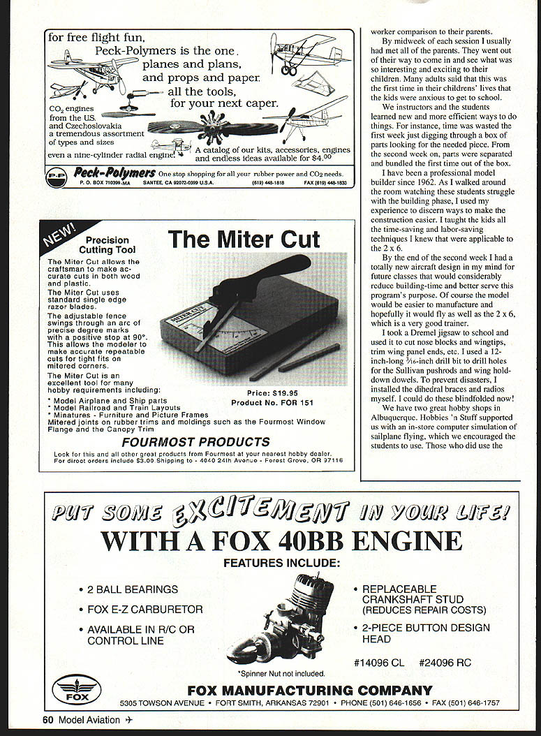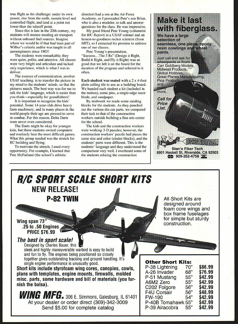 NO OCR TEXT NO OCR TEXT Hmmm . lets see did say glue squirt squirt glue quickly arranged science lab Alexander Scotts help placed tables shape horseshoe open end toward front room table demonstrations middle horseshoe always student middle An instructors workbench just front new-fangled blackboard white used markers instead chalk another large table back room built-in workbench convenient wall plugs against three walls workbench perfect covering phase construction students arrived excited happy few embarrassed kids accompanied interested curious parents greeted group turn Since teaching no stranger enjoy taught classes US Air Force church truly adventure During introductions opening comments sensed best integrate teaching principles taught USAF example know yaur audience students same age half grandchildren kids age familiar students young people fine minds made clear instructors high expectations challenged students responded agenda developed went along good teacher learns students teaching experience no exception elaborated emphasized both principles make choices nearly everythingyoure responsible consequences Truth essential phases aviationyou must tell recognize rule No talking others talking must listen learn especially challenge Research design develop aircraft flies onboard fuel showed video Final Approach 30 minutes full-scale crashes complete fireballs Immediately afterward emphasized crashes necessary re emphasized challenge became ongoing topic conversation Wilbur Wright accepted criteria 58 Model Aviation ndia prep summer program director Thomas Weber poses proud 11-year-old Allison first modela House Balsa 2 x 6 RC sailplane true flight challenge under its own power rise earth sustain level controlled flight land point lower takeoff point Since late 20th century students will mature needing air transport onboard fuel sources Imagine would part Wilburs criteria and/or taught aeroengineers since 1903 students remarkable quiet polite attentive classes very bright articulate lacked experience what deliver essence communication another USAF teaching transfer picture mind students minds pictures match best way talk kids language easier thinkespecially grandfathers important recognize kids potential Some 14-year-olds drive heavy farm machinery places world people age pressed serve combat reason Delta Darts never considered Darts might okay younger kids students owned computers routinely beat difficult games What group needed stretch RC building flying motivate stretch used opportunity example learned Pete McFarland schools athletic director son Air Force Academy persuaded Petes son Brian also modeler talk answer questions class impressive good friend Pete Young columnist RIC Report USAF colonel honest-to-goodness rocket scientist MIT extracted promise address classes Pete Youngs presentation Success. 3 Rs Design Right Build Right Fly Right good left board duration program referred often student seated 2 x 4-foot plain ceiling tile use building board handed student kit included tuition some pins single-edge razor blade sandpaper midweek made some sanding blocks students As punched out various die-cut parts compared task construction workers outside building fine arts center school kids construction workers working 3-D puzzles however construction workers puzzle pieces same size color cinder blocks students parts different students language understood comparison very well overheard some students relating construction best sport scale Designed Charles Bauer P sleek highly maneuverable warbird easy build fun fly engines being positioned closely together gives outstanding tracking ground handling single engine performance unusually good Short kits include styrofoam wing cores canopies cowls plans templates engine mounts firewalls molded misc parts some hardware bill materials fur nish balsa I4ING Ik1FGE 306 E Simmons Galesburg IL 61401 dealer order direct 309-342-3009 Send $500 complete catalog Other Short Kits P-38 Lightning70 A-26 Invader68 P-51 Mustang55 A6M2 Zero55, 0202 Folgore56 F4U Corsair56 FW-1 9054 P-40B Tomahawk 55 P-39 Airacobra 55 RIC SPORT SCALE SHORT KITS NEW RELEASE P-82 TWIN Wing span 25 to 50 Engines PRICE $7699 Short Kits designed around foam core wings box frame fuselages simple sturdy construction $8699 $7699 $4299 $4299 $4299 $4899 $4299 $4299 $4299 props paper free flight fun Peck-Polymers planes plans tools 002 enginefor next caper U __________ Czechoslovakia:ii~Iifli tremendous assortment types sizes Urn catalog kits accessones engines nine-cylinder radialand endless ideas available $400 .Peck-Pe/ywers stop shopping rubber power C02 needs P 0 Box 110399 MASANTEE CA 92072-0399 USA619 449-iSleFAX 619 448-1833 Miter Cut Precision Cutting Tool Miter Cut allows craftsman make ac curate cuts both wood plastic Miter Cut uses standard single edge razor blades adjustable fence swings through arc precise degree marks positive stop 900 allows modeler make accurate repeatable cuts tight fits mitered corners Miter Out excellent tool hobby requirements including Model Airplane Ship parts Model Railroad Train Layouts O Minatures Furniture Picture Frames Mitered joints rubber trims moldings such Fourmost Window Flange Canopy Trim FOURMOST PRODUCTS Look thia otFer groat products Fourmosi nearest hobby dealer direct orders include $3 00 Shipping 4040 24th Aven.e Forest Grove OR 97116 worker comparison parents midweek session usually met parents went out way come see what interesting exciting children adults said first time childrens lives kids anxious get school instructors students learned new efficient ways things instance time wasted first week just digging through box parts looking needed piece second week parts separated bundled first time out box have professional model builder since 1962 As walked around room watching students struggle building phase used experience discern ways make construction easier taught kids time-saving labor-saving techniques knew applicable 2 x 6 