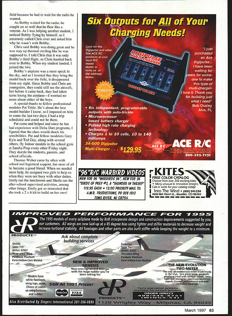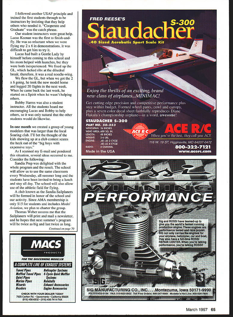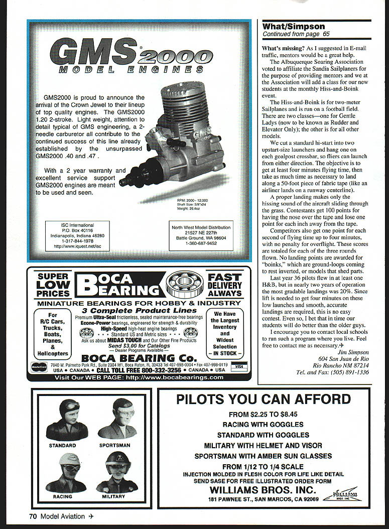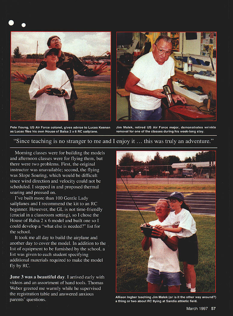 NO OCR TEXT NO OCR TEXT Hmmm . lets see did say glue squirt squirt glue quickly arranged science lab Alexander Scotts help placed tables shape horseshoe open end toward front room table demonstrations middle horseshoe always student middle An instructors workbench just front new-fangled blackboard white used markers instead chalk another large table back room built-in workbench convenient wall plugs against three walls workbench perfect covering phase construction students arrived excited happy few embarrassed kids accompanied interested curious parents greeted group turn Since teaching no stranger enjoy taught classes US Air Force church truly adventure During introductions opening comments sensed best integrate teaching principles taught USAF example know yaur audience students same age half grandchildren kids age familiar students young people fine minds made clear instructors high expectations challenged students responded agenda developed went along good teacher learns students teaching experience no exception elaborated emphasized both principles make choices nearly everythingyoure responsible consequences Truth essential phases aviationyou must tell recognize rule No talking others talking must listen learn especially challenge Research design develop aircraft flies onboard fuel showed video Final Approach 30 minutes full-scale crashes complete fireballs Immediately afterward emphasized crashes necessary re emphasized challenge became ongoing topic conversation Wilbur Wright accepted criteria 58 Model Aviation ndia prep summer program director Thomas Weber poses proud 11-year-old Allison first modela House Balsa 2 x 6 RC sailplane true flight challenge under its own power rise earth sustain level controlled flight land point lower takeoff point Since late 20th century students will mature needing air transport onboard fuel sources Imagine would part Wilburs criteria and/or taught aeroengineers since 1903 students remarkable quiet polite attentive classes very bright articulate lacked experience what deliver essence communication another USAF teaching transfer picture mind students minds pictures match best way talk kids language easier thinkespecially grandfathers important recognize kids potential Some 14-year-olds drive heavy farm machinery places world people age pressed serve combat reason Delta Darts never considered Darts might okay younger kids students owned computers routinely beat difficult games What group needed stretch RC building flying motivate stretch used opportunity example learned Pete McFarland schools athletic director son Air Force Academy persuaded Petes son Brian also modeler talk answer questions class impressive good friend Pete Young columnist RIC Report USAF colonel honest-to-goodness rocket scientist MIT extracted promise address classes Pete Youngs presentation Success. 3 Rs Design Right Build Right Fly Right good left board duration program referred often student seated 2 x 4-foot plain ceiling tile use building board handed student kit included tuition some pins single-edge razor blade sandpaper midweek made some sanding blocks students As punched out various die-cut parts compared task construction workers outside building fine arts center school kids construction workers working 3-D puzzles however construction workers puzzle pieces same size color cinder blocks students parts different students language understood comparison very well overheard some students relating construction best sport scale Designed Charles Bauer P sleek highly maneuverable warbird easy build fun fly engines being positioned closely together gives outstanding tracking ground handling single engine performance unusually good Short kits include styrofoam wing cores canopies cowls plans templates engine mounts firewalls molded misc parts some hardware bill materials fur nish balsa I4ING Ik1FGE 306 E Simmons Galesburg IL 61401 dealer order direct 309-342-3009 Send $500 complete catalog Other Short Kits P-38 Lightning70 A-26 Invader68 P-51 Mustang55 A6M2 Zero55, 0202 Folgore56 F4U Corsair56 FW-1 9054 P-40B Tomahawk 55 P-39 Airacobra 55 RIC SPORT SCALE SHORT KITS NEW RELEASE P-82 TWIN Wing span 25 to 50 Engines PRICE $7699 Short Kits designed around foam core wings box frame fuselages simple sturdy construction $8699 $7699 $4299 $4299 $4299 $4899 $4299 $4299 $4299 props paper free flight fun Peck-Polymers planes plans tools 002 enginefor next caper U __________ Czechoslovakia:ii~Iifli tremendous assortment types sizes Urn catalog kits accessones engines nine-cylinder radialand endless ideas available $400 .Peck-Pe/ywers stop shopping rubber power C02 needs P 0 Box 110399 MASANTEE CA 92072-0399 USA619 449-iSleFAX 619 448-1833 Miter Cut Precision Cutting Tool Miter Cut allows craftsman make ac curate cuts both wood plastic Miter Cut uses standard single edge razor blades adjustable fence swings through arc precise degree marks positive stop 900 allows modeler make accurate repeatable cuts tight fits mitered corners Miter Out excellent tool hobby requirements including Model Airplane Ship parts Model Railroad Train Layouts O Minatures Furniture Picture Frames Mitered joints rubber trims moldings such Fourmost Window Flange Canopy Trim FOURMOST PRODUCTS Look thia otFer groat products Fourmosi nearest hobby dealer direct orders include $3 00 Shipping 4040 24th Aven.e Forest Grove OR 97116 worker comparison parents midweek session usually met parents went out way come see what interesting exciting children adults said first time childrens lives kids anxious get school instructors students learned new efficient ways things instance time wasted first week just digging through box parts looking needed piece second week parts separated bundled first time out box have professional model builder since 1962 As walked around room watching students struggle building phase used experience discern ways make construction easier taught kids time-saving labor-saving techniques knew applicable 2 x 6 
