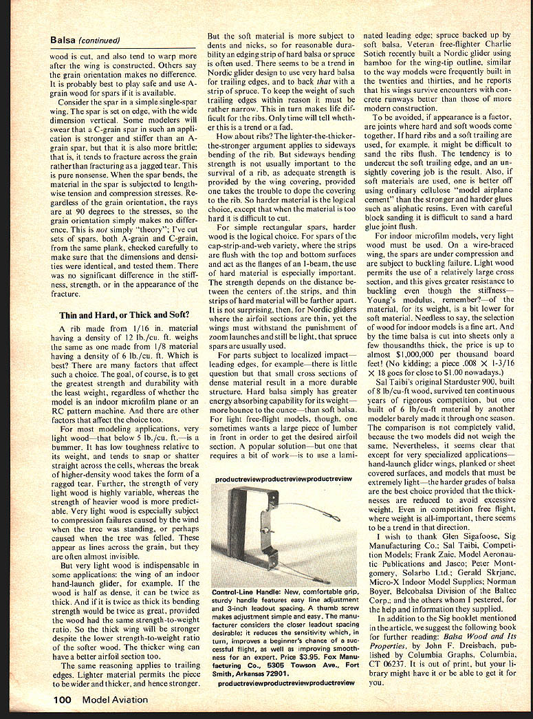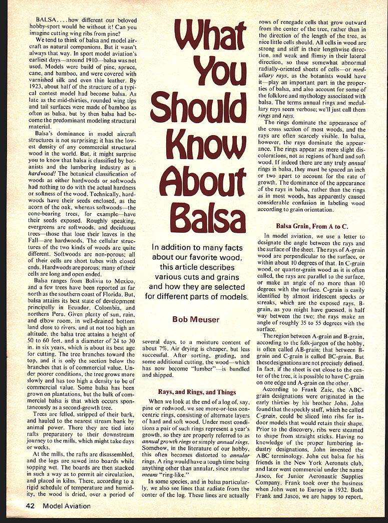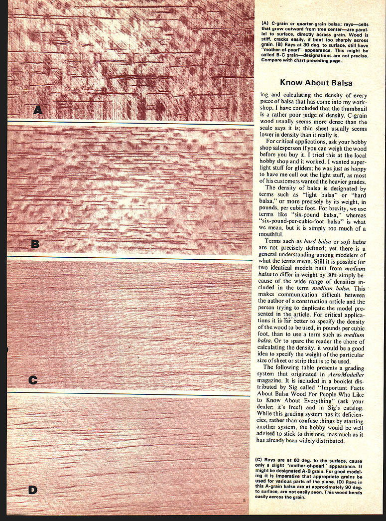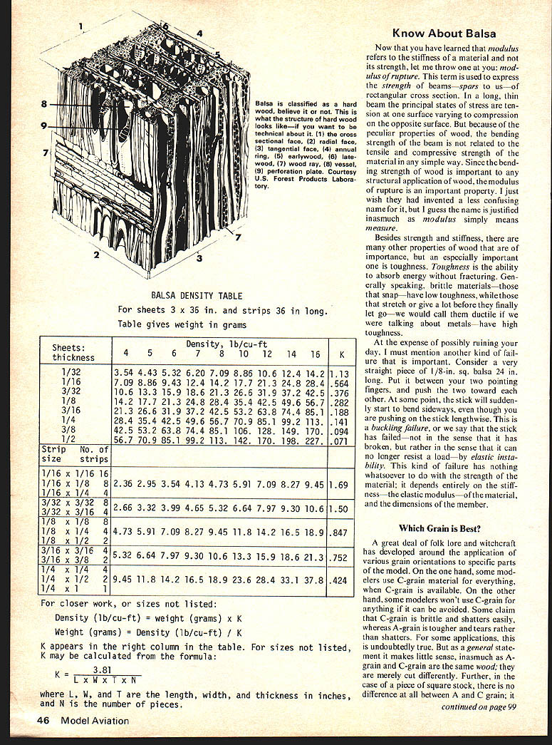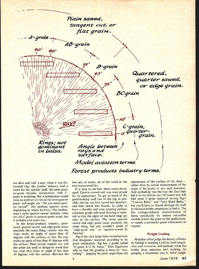 BALSA. different beloved hobby-sport would Can imagine cutting wing ribs pine tend think balsa model air craft natural companions wasnt always way sport model aviations earliest daysaround 1910balsa used Models build pine spruce cane bamboo covered varnished silk thin leather 1923 about half structure typi cal contest model become balsa As late mid-thirties rounded wing tips tail surfaces made bamboo often balsa balsa come predominant modeling structural material Balsas dominance model aircraft structures surprising has low est density commercial structural wood world might surprise know balsa classified bot anists lumbering industry hardwood botanical classification woods either hardwoods softwoods nothing actual hardness softness wood Technically hard woods have seeds enclosed acorn oak whereas softwoodsthe cone-bearing trees examplehave seeds exposed Roughly speaking evergreens softwoods deciduous treesthose lose leaves Fallare hardwoods cellular struc tures two kinds woods quite different Softwoods non-porous cells short tubes closed ends Hardwoods porous cells long open ended Balsa ranges Bolivia Mexico few trees have reported far north southern coast Florida balsa attains its best state development principally Ecuador Colombia northern Peru Given plenty sun rain elbow room well-drained bottom land close rivers too high altitude balsa tree attains height 50 60 feet diameter 24 30 in six years about its best age cutting tree branches toward top section below branches commercial value Un der poorer conditions tree grows slowly has too high density commercial value Some balsa has grown plantations bulk com mercial balsa occurs spon taneously second-growth tree Trees felled stripped bark hauled nearest stream bank animal power tied rafts preparatory downstream journey mills might take days weeks mills rafts disassembled logs sawed boards sopping wet boards stacked such way permit air circulation placed kilns according rigid schedule temperature humid ity wood dried over period What Should Know About Balsa addition facts about favorite wood article describes various cuts grains selected different parts models Bob Meuser several days moisture content about 7% Air drying cheaper less successful After sorting grading some additional cutting woodwhich has now become lumber bundled shipped Rays Rings Things look end log say pine redwood see more-or-less con centric rings consisting alternate layers hard soft wood Under condi tions pair such rings represent years growth properly referred annual gro wth rings simply annual rings Somehow literature hobby often becomes distorted annular rings ring would have tough time being anything other annular since annular means ring-like some species balsa particular ly also see lines radiate center log lines actually rows renegade cells grow outward center tree rather direction length tree nice little cells should cells wood strong stiff lengthwise direc tion weak flimsy lateral direction somewhat abnormal radially-oriented sheets cellsor med ullary rays botanists would have itplay important part proper ties balsa also account some folklore mythology associated balsa terms annual rings medul lary rays seem verbose well just call rings rays rings dominate appearance cross section woods rays often scarcely visible balsa however rays dominate appear ance rings appear mere slight dis colorations regions hard soft wood indeed truly annual rings balsa must spaced inch two apart account rate growth dominance appearance rays balsa rather rings woods has apparently caused considerable confusion labeling wood according grain orientation Balsa Grain C model aviation use letter designate angle between rays surface sheet rays A-grain wood perpendicular surface within about 10 degrees C-grain wood quarter-grain wood often called rays parallel surface make angle no 10 degrees surface C-grain easily identified almost iridescent specks streaks exposed rays Bgrain might have guessed half way between two rays make angle roughly 35 55 degrees surface region between A-grain B-grain according folk-jargon hobby often called AR-grain between Bgrain C-grain called BC-grain designations precisely defined fact sheet cut close cen ter tree possible have C-grain edge A-grain other According Frank Zaic ABCgrain designations originated early thirties brother John John found speckly stuff called C-grain could sliced ribs door models would retain shape Prior discovery ribs steamed shape straight sticks Having no knowledge proper lumbering dustry designations John invented ABC terminology John cut balsa friends New York Aeronuts club later went commercial under name Jasco Junior Aeronautic Supplies Company Frank took over business John went Europe 1932 Both Frank Jasco happy report 42 Model Aviation Piain sawed tangent cut flat grait A-ffrain 4~5 -5rain 800 J5-fjrain qitarter sawed edge 57rain Quartered yrain 2/ II / C-grain zzzzi- d quarter 9ratn ngs domiuiant &a4a 2 Forest products industry terms An9Ie hetueen rays su rface 4-lodel aiation terms alive well Later dis covered lumber industry name speckly stuff term quar ter-grain became synonymous Cgrain modeling lumberman would raise eyebrow two term quarter grain might ask mean quar ter sawed perhaps quarter sawn depending lives lumber mans term quarter-sawed includes what call C-grain quarter-grain wood includes lot too forest-products industry quar tered quarter sawed edge grain mean precisely same thing namely rings make angle 45 degrees surface rays make angle less 45 degrees surface Plainsawed tangent cut flat grain used designate wood has rings make angle less 45 degrees surface Between two sets terms wood tree accounted easy see terms devel oped Quarter-sawed oak once prized its appearance get much good-looking stuff out log pos sible log first sawed quarters sawed boards order have durable wearing surface premium grade softwood flooring selec ted edges hard rings ap pear surface terms quarter sawed edge grain mean precisely same 