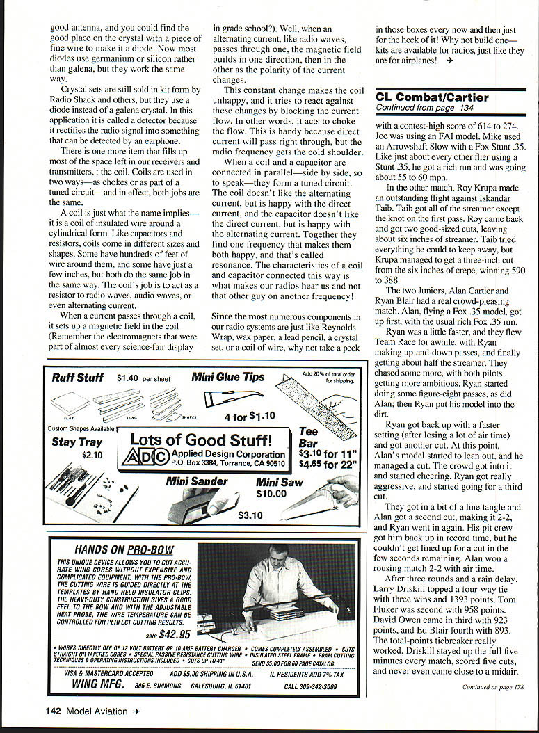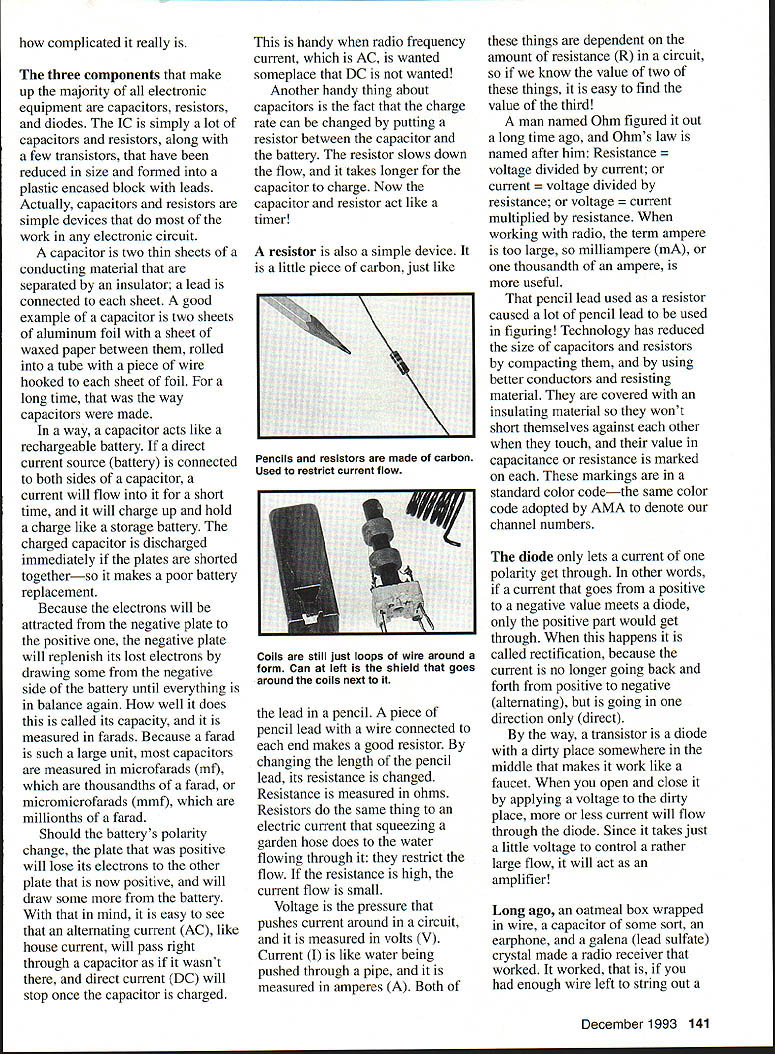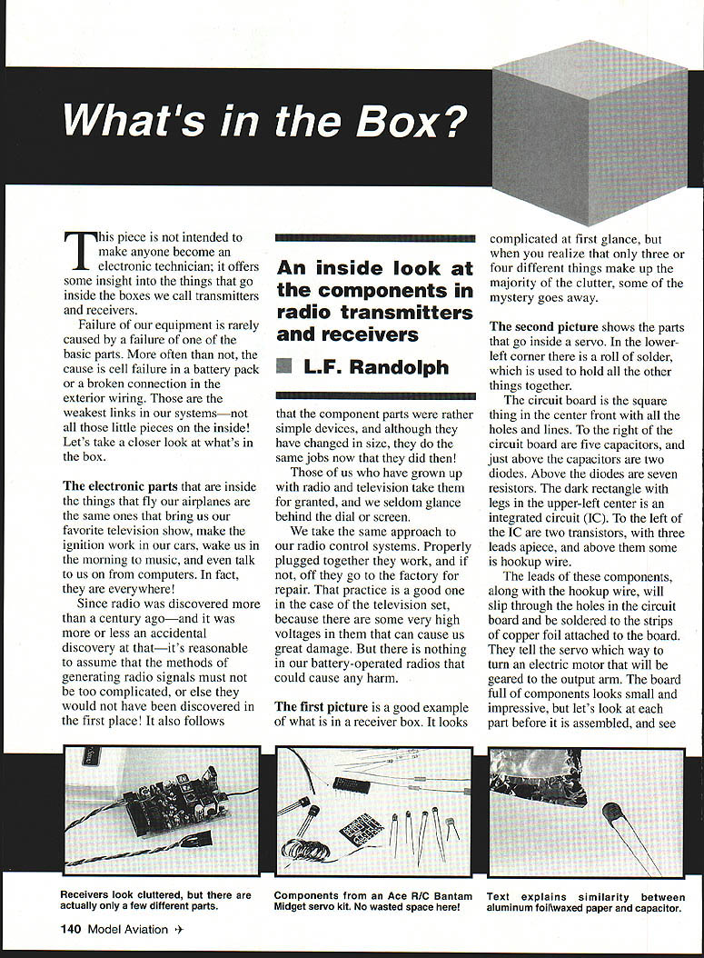 This piece intended make anyone become electronic technician offers some insight things go inside boxes call transmitters receivers Failure equipment rarely caused failure basic parts often cause cell failure battery pack broken connection exterior wiring weakest links systemsnot little pieces inside Lets take closer look whats box electronic parts inside things fly airplanes same ones bring us favorite television show make ignition work cars wake us morning music talk us computers fact everywhere Since radio discovered century agoand less accidental discovery thatits reasonable assume methods generating radio signals must too complicated else would have discovered first place also follows An inside look components radio transmitters receivers U LF Randolph component parts rather simple devices although have changed size same jobs now did us have grown up radio television take granted seldom glance behind dial screen take same approach radio control systems Properly plugged together work off go factory repair practice good case television set because some very high voltages can cause us great damage nothing battery-operated radios could cause harm first picture good example what receiver box looks complicated first glance realize three four different things make up majority clutter some mystery goes away second picture shows parts go inside servo lowerleft corner roll solder used hold other things together circuit board square thing center front holes lines right circuit board five capacitors just above capacitors two diodes Above diodes seven resistors dark rectangle legs upper-left center integrated circuit IC left IC two transistors three leads apiece above some hookup wire leads components along hookup wire will slip through holes circuit board soldered strips copper foil attached board tell servo way turn electric motor will geared output arm board full components looks small impressive lets look part before assembled see 140 Model Aviation ivers look cluttered actually few different parts Components Ace RIC Bantam Text explains similarity between Midget servo kit No wasted space aluminum foil\waxed paper capacitor complicated really three components make up majority electronic equipment capacitors resistors diodes IC simply lot capacitors resistors along few transistors have reduced size formed plastic encased block leads Actually capacitors resistors simple devices work electronic circuit capacitor two thin sheets conducting material separated insulator lead connected sheet good example capacitor two sheets aluminum foil sheet waxed paper between rolled tube piece wire hooked sheet foil long time way capacitors made way capacitor acts like rechargeable battery direct current source battery connected both sides capacitor current will flow short time will charge up hold charge like storage battery charged capacitor discharged immediately plates shorted togetherso makes poor battery replacement Because electrons will attracted negative plate positive negative plate will replenish its lost electrons drawing some negative side battery until everything balance again well does called its capacity measured farads Because farad such large unit capacitors measured microfarads mf thousandths farad micromicrofarads mmf millionths farad Should batterys polarity change plate positive will lose its electrons other plate now positive will draw some battery mind easy see alternating current AC like house current will pass right through capacitor wasnt direct current DC will stop once capacitor charged handy radio frequency current AC wanted someplace DC wanted Another handy thing about capacitors fact charge rate can changed putting resistor between capacitor battery resistor slows down flow takes longer capacitor charge Now capacitor resistor act like timer resistor also simple device little piece carbon just like Pencils resistors made carbon Used restrict current flow lead pencil piece pencil lead wire connected end makes good resistor changing length pencil lead its resistance changed Resistance measured ohms Resistors same thing electric current squeezing garden hose does water flowing through restrict flow resistance high current flow small Voltage pressure pushes current around circuit measured volts V Current like water being pushed through pipe measured amperes Both things dependent amount resistance R circuit know value two things easy find value third man named Ohm figured out long time ago Ohms law named after him Resistance age divided current current age divided resistance voltage ent multiplied resistance working radio term ampere too large milliampere mA thousandth ampere useful pencil lead used resistor caused lot pencil lead used figuring Technology has reduced size capacitors resistors compacting using better conductors resisting material covered insulating material wont short themselves against other touch value capacitance resistance marked markings standard color codethe same color code adopted AMA denote channel numbers diode lets current polarity get through other words current goes positive negative value meets diode positive part would get through happens called rectification because current no longer going back forth positive negative alternating going direction direct way transistor diode dirty place somewhere middle makes work like faucet open close applying voltage dirty place less current will flow through diode Since takes just little voltage control rather large flow will act amplifier Long ago oatmeal box wrapped wire capacitor some sort earphone galena lead sulfate crystal made radio receiver worked worked enough wire left string out December 1993 141 Coils still just loops wire around form Can left shield goes around coils next good antenna could find good place crystal piece fine wire make diode Now diodes use germanium silicon rather galena hut work same way Crystal sets still sold kit form Radio Shack others use diode instead galena crystal application called