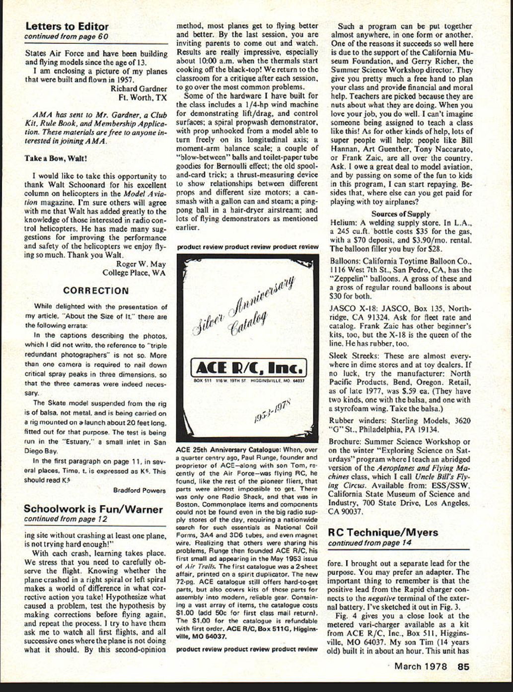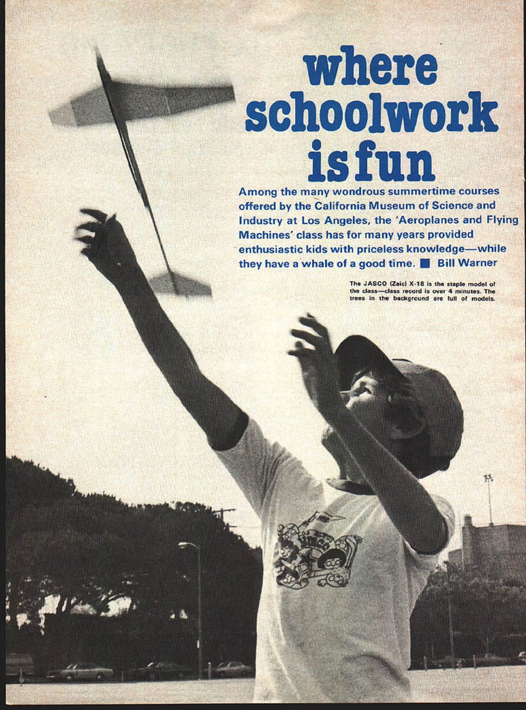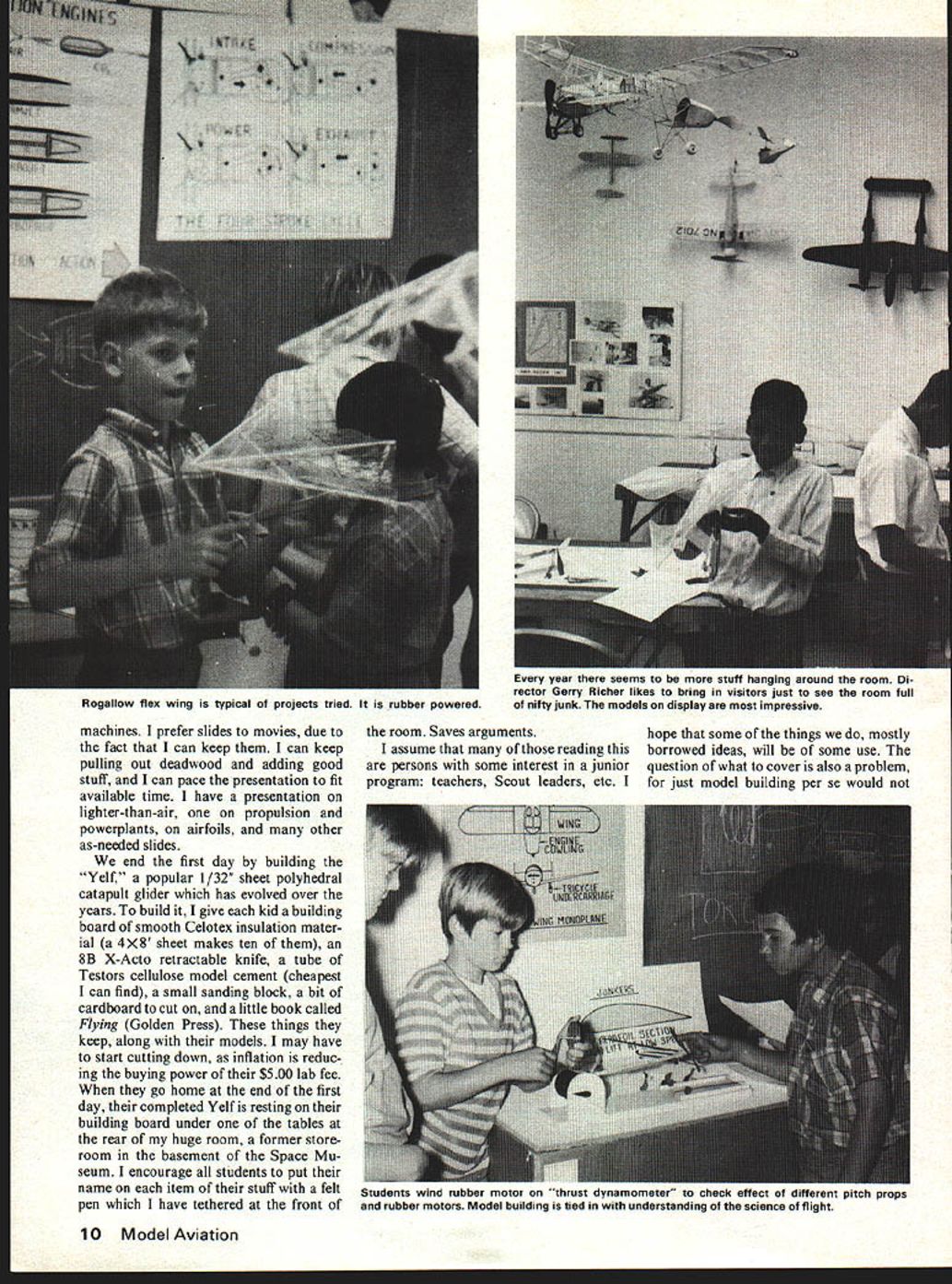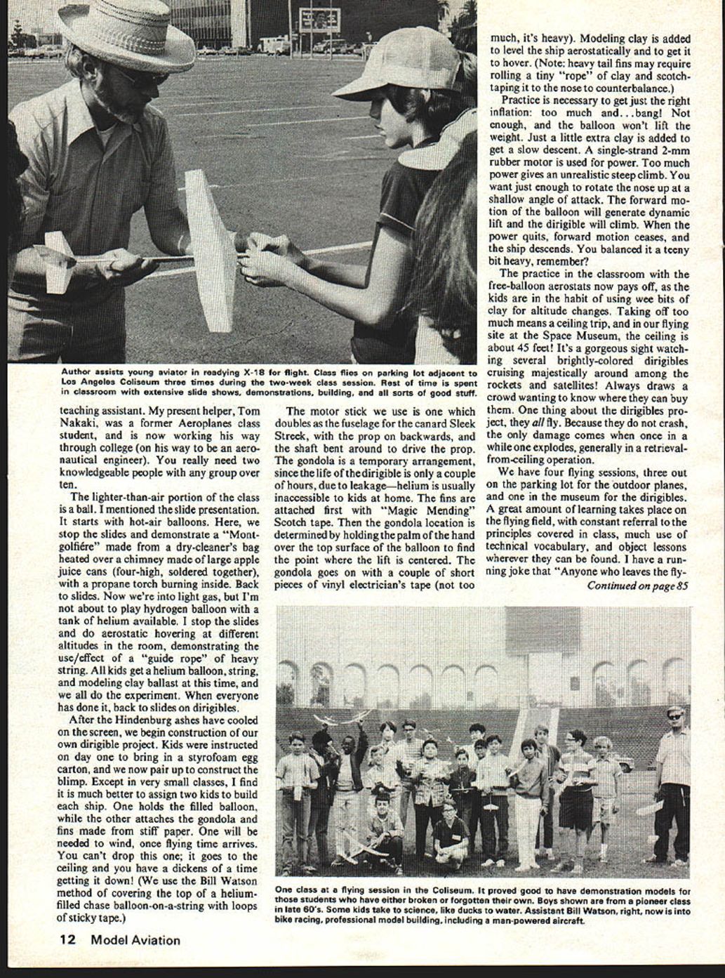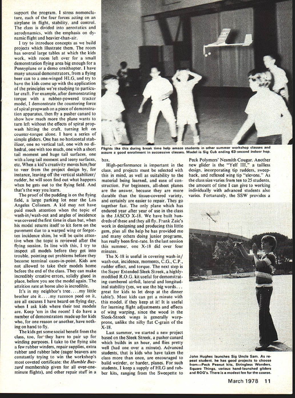 Among offered Industry Machines enthusia have years kr over 4 rouna fuji DO YOU KNOW what Humble Buz zard Did know getting hit ear dirigible doesnt hurt Are aware Wilbur Orville really didnt invent aeroplane Maz das dont really have rotary engines Well way gain such priceless knowledge have whale good time boot take Aeroplanes Flying Ma chines class Los Angeles home California Museum Science Indus try Thousands students summer take advantage offerings diverse Marine Ecology Computer Program ming Headed up Gerry Richer Summer Science Workshop program great teachers students alike due simple fact guiding principle making learning fun Everyone gives own special class class would like have young Some classes one-week sessions some two standard period two hours long student can take two dif ferent classes such Animal Behavior morning Rocketry afternoon present operate eight weeks starting week after LA city schools get out Tuition about $30 two-week class such Aeroplanes workshop Although classes young child ren kindergarten up take kids fifth grade twelfth grade general character groups teach would prob ably fall category gifted parents wishing offer enrichment pressure offspring 20 hours disposal trick divide up time between theory building models flying ses sions name game organiza tion can well imagine Well after almost ten years Im getting What makes class fun other just learning new interesting things hav ing success flying something has built ones own two hands kids hard may believe have never used knife other cutting up supper So program has appeal students know zilch about planes thumbs also boy girl genius starts out asking help compute Reynolds Num ber new pattern ship theyre design ing start out slide presentation Ive made up taking slides good airplane pictures wherever can get hands traces history aviation tower jumpers through de Rozier Ader Whitehead etc ending Space Shuttle keep adding get better photos always enjoy seeing too something bores know its going deadly kids use slides illustrate everything parts flying craft its easier show slide vortex generators 707 way rather take field trip airport odd unusual flying March 1978 9 students repeat Aeroplanes class work difficult projects time review basic flight principles Advanced student buNding stick-and-tissue model receive aviation model-building merit badges Boy Scouts taking class Such built-up projects sharpen dexterity Join ing fuselage sides isnt easy Above Ilyable dirigibles delignt Bill Warner demonstrates static ballasting model ing clay give slight descent power applied dirigible moves positive angle attack supplies lift Helium bought commercial supply see text right Tom Nakaki assist ant both winter summer programs Below Gondola dirigible made styrofoam egg carton balsa Sleek Streak propeller machines prefer slides movies due fact can keep can keep pulling out deadwood adding good stuff can pace presentation fit available time have presentation lighter-than-air propulsion powerplants airfoils other as-needed slides end first day building Yelf popular 1/32 sheet polyhedral catapult glider has evolved over years build give kid building board smooth Celotex insulation mater ial 4X8 sheet makes ten 8B X-Acto retractable knife tube Testors cellulose model cement cheapest can find small sanding block bit cardboard cut little book called Flying Golden Press things keep along models may have start cutting down inflation reduc ing buying power $500 lab fee go home end first day completed Yelf resting building board under tables rear huge room former store room basement Space Mu seum encourage students put name item stuff felt pen have tethered front room Saves arguments assume reading persons some interest junior program teachers Scout leaders etc hope some things mostly borrowed ideas will some use question what cover also problem just model building per se would 10 Model Aviation Rogallow flex wing typical projects tried rubber powered year seems stuff hanging around room Di rector Gerry Richer likes bring visitors just see room full nifty junk models display impressive iuoents wino ruoner motor inrusi oynamometer cnec erred different pitch props rubber motors Model building tied understanding science flight support program stress nomencla ture four forces acting airplane flight stability control class divided aerostatics aerodynamics emphasis dy namic flight heavier-than-air try introduce concepts build projects illustrate room has several large tables kids work room left over small demonstration flying area big enough Pennyplane demo ornithopter have unusual demonstrators flying beer can one-winged HLG try have kids come up application principles studying particu lar craft example after demonstrating torque rubber-powered tractor model demonstrate countering force spiral propwash piece demonstra tion apparatus fly pusher canard show much plane wants turn left effects spiral propwash hitting craft turning left counter-torque alone have series simple gliders has no horizontal stab ilizer no vertical tail no di hedral too much short tail moment huge tail surfaces along tail moment teeny surfaces etc kids creativity moves him/her veer project design instance leaving off vertical stabilizer/ rudder will soon find out what happens gets out flying field thats way learn proof pudding flying field large parking lot near Los Angeles Coliseum kid may have paid much attention topic wash-in/wash-out angles incidence covered first time class model returns itself kit form pavement due warped wing forgot ten incidence shim will quite atten tive topic reviewed after flying session line try inspect models before get trouble pointing out problems before become terminal cases-in-point Kids allowed take models home before end class can make incredibly creative errors solidly glued place before see model again attrition rate home also incredible Its neighbors tree ttle brother ate ccoon peed excuses have heard flying day ask kids test model