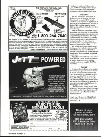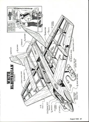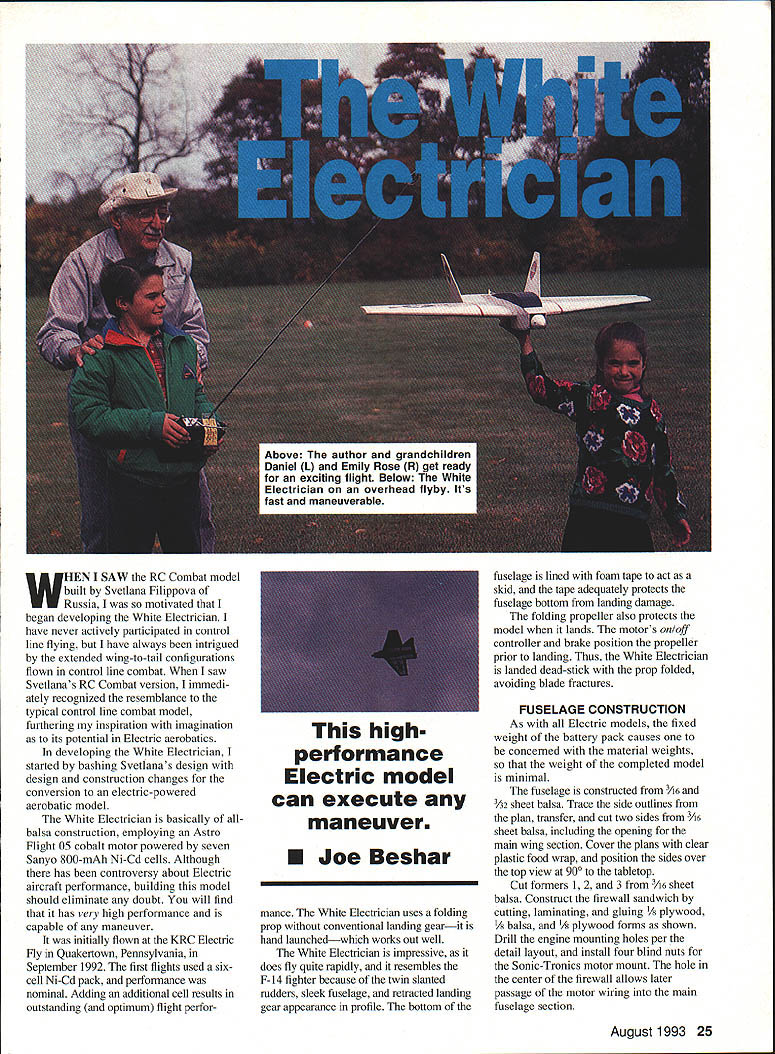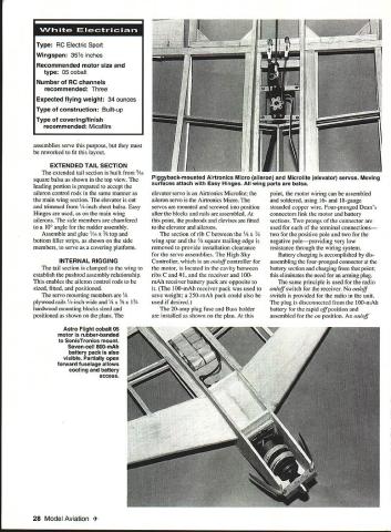 WHEN SAW RC Combat model built Svetlana Filippova Russia motivated began developing White Electrician have never actively participated control line flying have always intrigued extended wing-to-tail configurations flown control line combat saw Svetlanas RC Combat version immedi ately recognized resemblance typical control line combat model furthering inspiration imagination its potential Electric aerobatics developing White Electrician started bashing Svetlanas design design construction changes conversion electric-powered acrobatic model White Electrician basically allbalsa construction employing Astro Flight 05 cobalt motor powered seven Sanyo 800-mAb Ni-Cd cells Although has controversy about Electric aircraft performance building model should eliminate doubt will find has very high performance capable maneuver initially flown KRC Electric Fly Quakertown Pennsylvania September 1992 first flights used sixcell Ni-Cd pack performance nominal Adding additional cell results outstanding optimum flight perfor maneuver U Joe Beshar mance White Electrician uses folding prop conventional landing gearit hand launchedwhich works out well White Electrician impressive does fly quite rapidly resembles F-14 fighter because twin slanted rudders sleek fuselage retracted landing gear appearance profile bottom fuselage lined foam tape act skid tape adequately protects fuselage bottom landing damage folding propeller also protects model lands motors on/off controller brake position propeller prior landing Thus White Electrician landed dead-stick prop folded avoiding blade fractures FUSELAGE CONSTRUCTION As Electric models fixed weight battery pack causes concerned material weights weight completed model minimal fuselage constructed 3/i6 3A2 sheet balsa Trace side outlines plan transfer cut two sides 46 sheet balsa including opening main wing section Cover plans clear plastic food wrap position sides over top view 900 tabletop Cut formers 1 2 3 /6 sheet balsa Construct firewall sandwich cutting laminating gluing /s plywood l/ balsa 1/ plywood forms shown Drill engine mounting holes per detail layout install four blind nuts Sonic-Tronics motor mount hole center firewall allows later passage motor wiring main fuselage section August 1993 25 high performance Electric model can execute Assemble glue sandwiched firewall formers over top view shown top bottom fuselage cross-sheeted 62 balsa providing open hatch location marked plans open portion shown fuselage bottom battery pack also left sheeting battery access hatch removable strength stability requires 3A2 sheet inside stiffener rails profiled glued shown Cut assemble glue two holders front hatch shown allows hatch slide position retained fuselage can still removed easily Sonic-Tronics electric motor mount attached firewall -inch-long 4-40 Allen-head cap screws Astro Flight 05 cobalt motor attached mount held position rubber bands builders option use plastic wrappers supplied Sonic-Tronics motor mountI prefer using #62 rubber bands wound tightly around motor method gives flexibility motor mounting avoids damage subject crash impact Note plans bottom fuselage next battery compartment left open serves exposure cooling provides means removing battery changeover etc desired piece Velcro between battery pack compartment can used hold battery place fit otherwise satisfactory WING CONSTRUCTION entire wing framed sheeted cap stripped balsa Place clear plastic wrap over wing plans position x 3/ leading edge shown Position square trailing edge over plans Cut ribs 3A2 balsa accordance templates drawing spar slots 3/i6 square front 1/ x cut C rib two #5 ribs Glue ribs place basic wing assembly Lay spars across ribs mark slot locations ribs 1 2 3 4 cut slots marked two /16 spars two pars assembled glued place shown leading edge sheeted 1/~ balsa center /i spar top bottom Ribs 2 3 4 5 have A6 x strips top #1 ribs cap stripped Y16 x a shown wider cap strip provides platform attach wing covering Cross-sheet bottom wing between #1 ribs A6 balsa provide platform receiver battery controller battery compartment ailerons cut shaped -inch sheet balsa trimmed shown plans slotted installation Easy Hinges aileron control rods fitted sized shown top view Standard pushrod Overhead view prior planking motor installation All-balsa construction saves weight especially important Electric models 26 Model Aviation e-quarter rear view shows color scheme markings Twin slantedTop view k2 balsa hatch removed shows completed rudders give appearance F-14 fighterradio installation Covering white Micaflim WHITE - BRLSP SHTPLEA5JNCL SPINNER SHOW ELECTRICIAN ME NowroFLY JOE BESHARThE AIRPLANEESEE YOLJTAUGHT HER YOL~ MET4O ___ op MARi3INL CONTROL -BLSA PIERON STOCK4BLSR SM1 SHEET 4z SHTBRLSR I//i0 0 If/i0 -N aBRLS RIBS N BLSI SONIC TROM CS6 BALSA SHEEN BITERY PACK FOLDING PROP- BFU-SR FUSE SIDES PLY SRND4[CN BPLS SNT 05 COB PLY fr1OTOR Z SPINNER Type RC Electric Sport assemblies serve purpose must reworked fit layout EXTENDED TAIL SECTION extended tail section built 5A6 square balsa shown top view leading portion prepared accept aileron control rods same manner main wing section elevator cut trimmed 1/4-inch sheet balsa Easy Hinges used main wing ailerons side members chamfered 100 angle rudder assembly Assemble glue /is x /s top bottom filler strips shown side members serve covering platform INTERNAL RIGGING tail section clamped wing establish pushrod assembly relationship enables aileron control rods sized fitted positioned servo mounting members 1/8 plywood rails -inch wide s x 1 hardwood mounting blocks sized positioned shown plans elevator servo Airtronics Microlite aileron servo Airtronics Micro servos mounted screwed position after blocks rails assembled point pushrods devises fitted elevator ailerons section rib C between /s x wing spar /8 square trailing edge removed provide installation clearance servo assemblies High Sky Controller on/off controller motor located cavity between ribs C #1 re