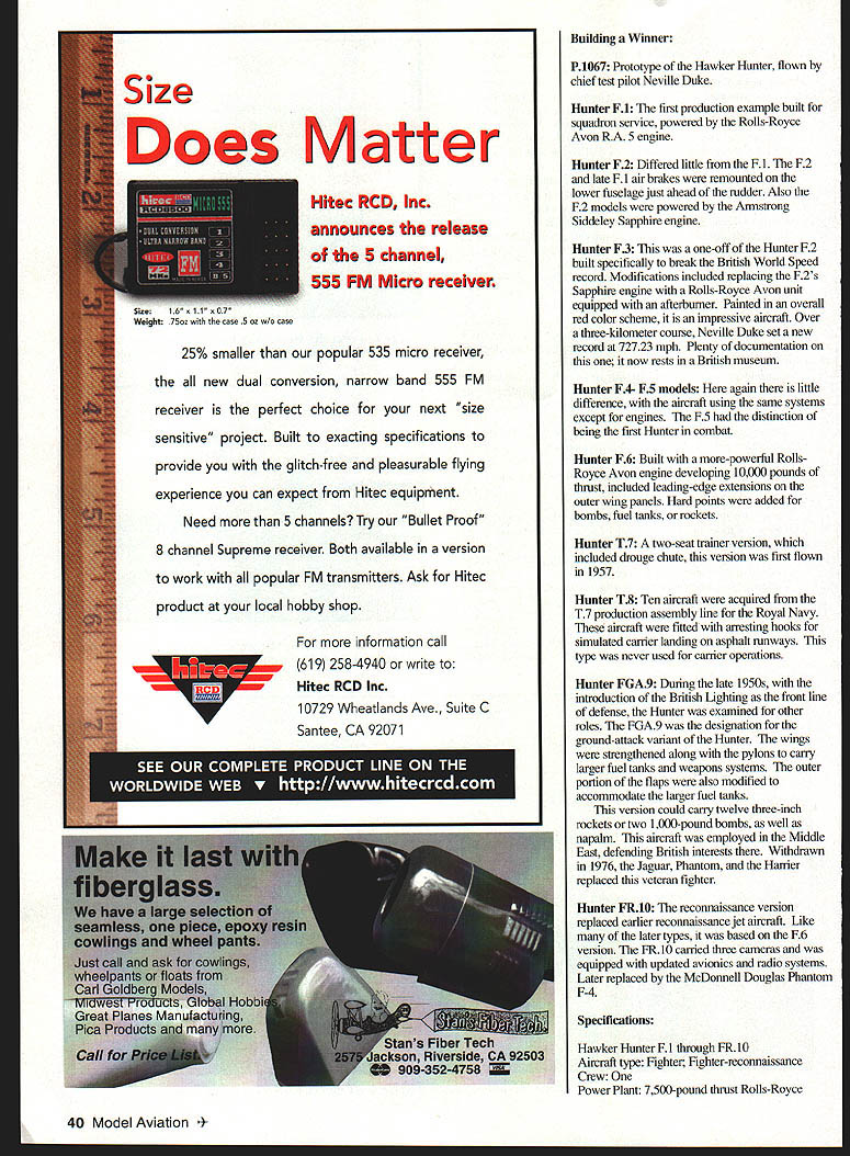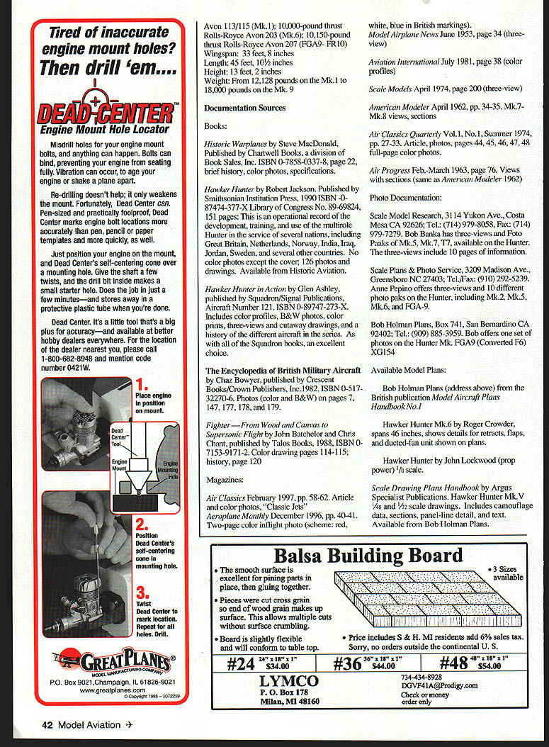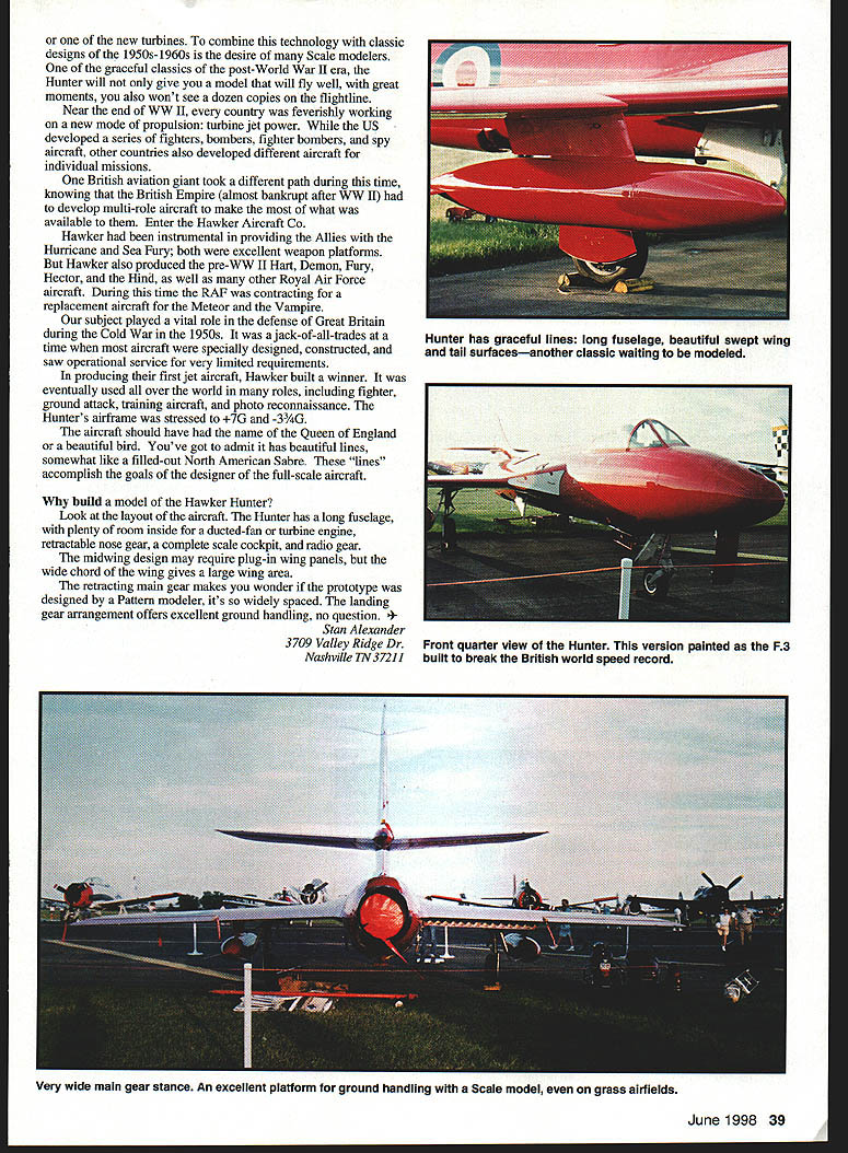 Editors note first three-part bimonthly series on But sometimes didnt know name aircraft anything subjects worth considering Scale construction projectsabout other propeller jet engine military Photos courtesy Scale Model Researchor civilian articles will explore specific aircraft dont see modeled oftenif Have ever seen airplane flying during air show fly-in sitting just inside hangar local airport would love model have times Hawker Huater Jet models fascinate modelers well viewing public have unique sound powered ducted fans U Stan Alexander Hunter has graceful lines long fuselage beautiful swept wing tail surfacesanother classic waiting modeled 38 Model Aviation t side view gives idea length fuselage position nose gear air intakes wing root new turbines combine technology classic designs l950s-1960s desire Scale modelers graceful classics post-World War H era Hunter will give model will fly well great moments also wont see dozen copies flightline Near end WW II country feverishly working new mode propulsion turbine jet power US developed series fighters bombers fighter bombers spy aircraft other countries also developed different aircraft individual missions British aviation giant took different path during time knowing British Empire almost bankrupt after WW II develop multi-role aircraft make what available Enter Hawker Aircraft Co Hawker instrumental providing Allies Hurricane Sea Fury both excellent weapon platforms Hawker also produced pre-WW H Hart Demon Fury Hector Hind well other Royal Air Force aircraft During time RAF contracting replacement aircraft Meteor Vampire subject played vital role defense Great Britain during Cold War 1950s jack-of-all-trades time aircraft specially designed constructed saw operational service very limited requirements producing first jet aircraft Hawker built winner eventually used over world roles including fighter ground attack training aircraft photo reconnaissance Hunters airframe stressed 7G -33¼G aircraft should have name Queen England beautiful bird Youve got admit has beautiful lines somewhat like filled-out North American Sabre lines accomplish goals designer full-scale aircraft build model Hawker Hunter Look layout aircraft Hunter has long fuselage plenty room inside ducted-fan turbine engine retractable nose gear complete scale cockpit radio gear midwing design may require plug-in wing panels wide chord wing gives large wing area retracting main gear makes wonder prototype designed Pattern modeler its widely spaced landing gear arrangement offers excellent ground handling no question Alexander 3709 Valley Ridge Dr Nashville TN37211 June 1998 39 Hunter has graceful lines long fuselage beautiful swept wing tail surfacesanother classic waiting modeled Front quarter view Hunter version painted F3 built break British world speed record Very wide main gear stance An excellent platform ground handling Scale model grass airfields Does Matter Hitec RCDI Inc announces release 5 channel 555 FM Micro receiver 25% smaller popular 535 micro receiver new dual conversion narrow band 555 FM receiver perfect choice next size sensitive project Built exacting specifications provide glitch-free pleasurable flying experience can expect Hitec equipment Need 5 channels Try Bullet Proof 8 channel Supreme receiver Both available version work popular FM transmitters Ask Hitec information call 619 258-4940 write 10729 Wheatlands Ave Suite C Santee CA 92071 Building Winner P1067 Prototype Hawker Hunter flown chief test pilot Neville Duke Hunter F1 first production example built squadron service powered Rolls-Royce Avon RA 5 engine Hunter F2 Differed little F1 F2 late F 1 air brakes remounted lower fuselage just ahead rudder Also F2 models powered Armstrong Siddeley Sapphire engine Hunter F3 one-off Hunter F2 built specifically break British World Speed record Modifications included replacing F2s Sapphire engine Rolls-Royce Avon unit equipped afterbumer Painted overall red color scheme impressive aircraft Over three-kilometer course Neville Duke set new record 72723 mph Plenty documentation now rests British museum Hunter F4- F5 models again little difference aircraft using same systems except engines F5 distinction being first Hunter combat Hunter F6 Built more-powerful RollsRoyce Avon engine developing 10000 pounds thrust included leading-edge extensions outer wing panels Hard points added bombs fuel tanks rockets Hunter T7 two-seat trainer version included drouge chute version first flown 1957 Hunter T8 Ten aircraft acquired T7 production assembly line Royal Navy aircraft fitted an-esting hooks simulated carrier landing asphalt runways type never used carrier operations Hitec RCD IncHunter FGA9 During late 1950s introduction British Lighting front line defense Hunter examined other roles FGA9 designation ground-attack variant Hunter wings strengthened along pylons cany larger fuel tanks weapons systems outer portion flaps also modified accommodate larger fuel tanks version could carry twelve three-inch rockets two 1000-pound bombs well napalm aircraft employed Middle East defending British interests Withdrawn 1976 Jaguar Phantom Harrier replaecd veteran fighter Hunter FR10 reconnaissance version replaced earlier reconnaissance jet aircraft Like later types based F6 version FRlO carried three cameras equipped updated avionics radio systems Later replaced McDonnell Douglas Phantom F-4 Specifications Hawker Hunter F 1 through FR10 Aircraft type Fighter Fighter-reconnaissance Crew Power Plant 7500-pound thrust Rolls-Royce 40 Model Aviation 16x1 75oz case 5 oz w/o case product local hobby shop Tired inaccurate engine mount holes drill emEND J3M Engine Mount Hole Locator Misdnll holes engine mount bolts anything can happen Bolts can bind preventing engine seating fully Vibration can occur age engine shake plane apart Re-drilling doesnt help weakens mount Fortunately Dead Center can Pen-sized practically foolproof Dead Center marks engine bolt locations accurately pen p