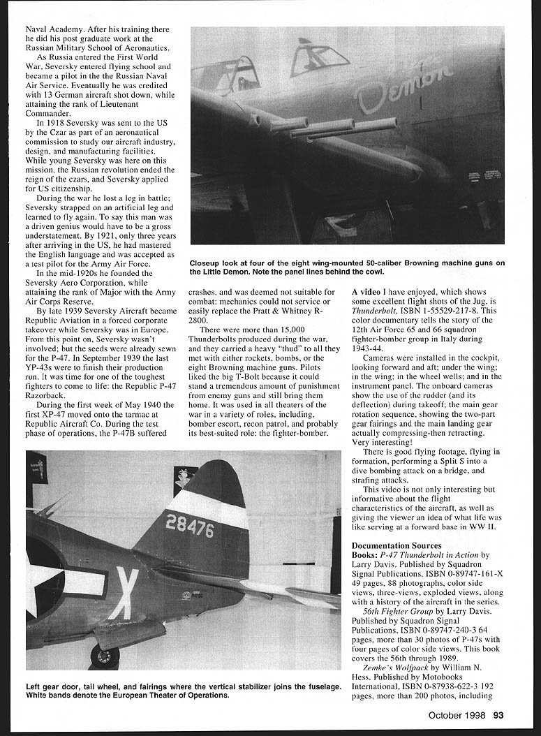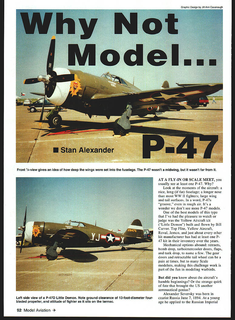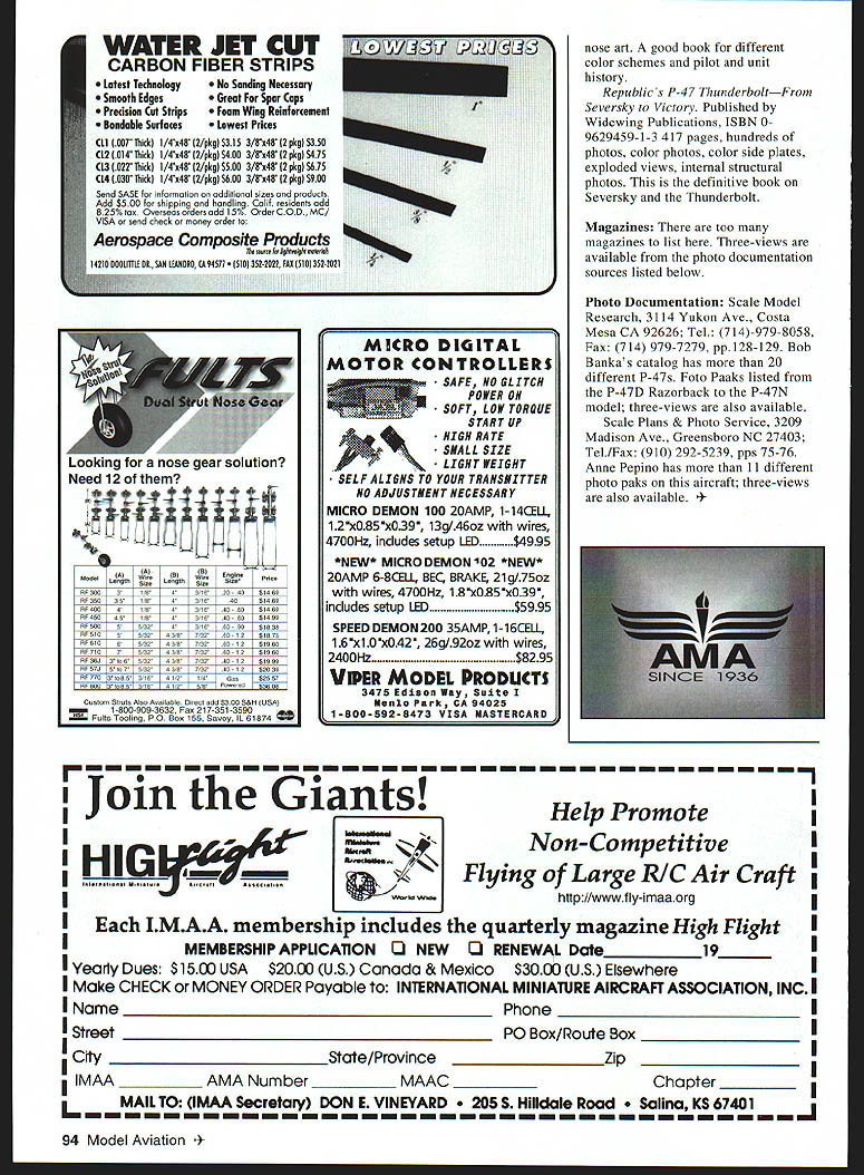 AT FLY-IN OR SCALE MEET usually see least P-47 Look moments aircraft nice long fat fuselage longer nose WW II fighters large wing tail surfaces word P-47s groove rough air Its wonder dont see P-47 models best models type Ive pleasure watch judge Yellow Aircraft kit Little Demon built flown Bill Carver Top Flite Yellow Aircraft Royal Jemco just about other kit manufacturer has least 47 kit inventory over years Mechanical options abound retracts bomb drop turbointercooler doors flaps tank drop name few gear doors retractable tail wheel can pain times Scale modelers making challenge work part fun modeling warbirds did know about aircrafts humble beginnings strange quirk fate brought US another aeronautical genius Alexander Seversky born czarist Russia June 7 1894 young age applied Russian Imperial 92 Model Aviation t -view gives idea deep wings set fuselage P-47 wasnt midwing wasnt far Left side view P-47D Little Demon Note ground clearance 13-foot-diameter four bladed propeller attitude fighter sits tarmac Naval Academy After training did post graduate work Russian Military School Aeronautics As Russia entered First World War Seversky entered flying school became pilot the Russian Naval Air Service Eventually credited 13 German aircraft shot down attaining rank Lieutenant Commander 1918 Seversky sent US Czar part aeronautical commission study aircraft industry design manufacturing facilities young Seversky mission Russian revolution ended reign czars Seversky applied US citizenship During war lost leg battle Seversky strapped artificial leg learned fly again say man driven genius would have gross understatement 1921 three years after arriving US bad mastered English language accepted test pilot Army Air Force mid-1920s founded Seversky Aero Corporation attaining rank Major Army Air Corps Reserve late 1939 Seversky Aircraft became Republic Aviation forced corporate takeover Seversky Europe point Seversky wasnt involved seeds already sewn P-47 September 1939 last YP-43s finish production run time toughest fighters come life Republic P-47 Razorback During first week May 1940 first XP-47 moved onto tarmac Republic Aircraft Co During test phase operations P-47B suffered crashes deemed suitable combat mechanics could service easily replace Pratt & Whitney R 2800 15000 Thunderbolts produced during war carried heavy thud met either rockets bombs eight Browning machine guns Pilots liked big T-Bolt because could stand tremendous amount punishment enemy guns still bring home used theaters war variety roles including bomber escort recon patrol probably its best-suited role fighter-bomber video have enjoyed shows some excellent flight shots Jug Thunderbolt ISBN 1-55529-217-8 color documentary tells story 12th Air Force 65 66 squadron fighter-bomber group Italy during 1943-44 Cameras installed cockpit looking forward aft under wing wing wheel wells instrument panel onboard cameras show use rudder its deflection during takeoff main gear rotation sequence showing two-part gear fairings main landing gear actually compressing-then retracting Very interesting good flying footage flying formation performing Split S dive bombing attack bridge strafing attacks video interesting informative about flight characteristics aircraft well giving viewer idea what life like serving forward base WW II Documentation Sources Books P-47 Thunderbolt Action Larry Davis Published Squadron Signal Publications ISBN 0-89747-161-X 49 pages 88 photographs color side views three-views exploded views along history aircraft series 56th Fighter Group Larry Davis Published Squadron Signal Publications ISBN 0-89747-240-3 64 pages 30 photos P-47s four pages color side views book covers 56th through 1989 Zemkes Wolfpack William N Hess Published Motobooks International ISBN 0-87938-622-3 192 pages 200 photos including October1998 93 Closeup look four eight wing-mounted 50-caliber Browning machine guns Little Demon Note panel lines behind cowl Left gear door tail wheel fairings vertical stabilizer joins fuselage White bands denote European Theater Operations Latest Technology Smooth Edges Precision Cut Strips Bondable Surfaces WATER JET CUT CARBON FIBER STRIPS No Sanding Necessary Great Far Spar Caps Foam Wing Reinforcement Lowest Prices Cii 001 Thick 1/4x4F2/pkg$315 3/8x4012 pkg $350 CL2 014 Thick 1/4x4r 2/pkg $400 3/8s48 2 pkg S475 CL3 022Thickl 1/4x4F 2/pkg $500 3/0x48 2 pkg S675 CL4 030Thiclc 1/4x48 2/pkg S600 3/8x40 2 pkg S900 Send SASE information additional sizes products Add $500 shipping handling Calif residents add 825% tax Overseas orders add15 Order COD MCI VISA send check money order Aerospace Composite Products soesce feskgh$eeghtetetleh 14210 DOOLITTLE DR SAN LEANDRO 0 94511 352-2022 FAX 1510 3522021 ModeltAtBiEnginePrOC LengtS SizeLengthSize xr 3003 8431620 40$1469 hr 35035 1943116 469 hr 4004194011$40 -60$1469 hr 450 4519 40 -90$1459 hr 500 00 90$1908 hF 510 43871326012$1875 hr 610 43167/326012$1960 hr 710 408730901 0$1960 hr 3hJ319653043973240 r 0$1999 $r 57J5 10 75324387/32401 292039 hr 770310953 164 1214 Gas$0557 6F900 ij3ais.ILL35$Poloerho nose art good book different color schemes pilot unit history Republics P-47 ThunderboltFrom Seversky Victory Published Widewing Publications ISBN 09629459-1-3 417 pages hundreds photos color photos color side plates exploded views internal structural photos definitive book Seversky Thunderbolt Magazines There too magazines list Three-views available photo documentation sources listed below Photo Documentation Scale Model Research 3114 Yukon Ave Costa Mesa CA 92626 Tel 714-979-8058 Fax 714 979-7279 pp128-129 Bob Bankas catalog has 20 different P-47s Foto Paaks listed P-47D Razorback P-47N model three-views also available Scale Plans & Photo Service 3209 Madison Ave Greensboro NC 27403 Tel/Fax 910 292-5239 pps 75-76 Anne Pepino has 11 different photo paks aircraft three-views also available Join Giants Help PromoteI INon-Competitive HIG __ —Flyingof Large RIC Air Craft i Ilelngen Ml A