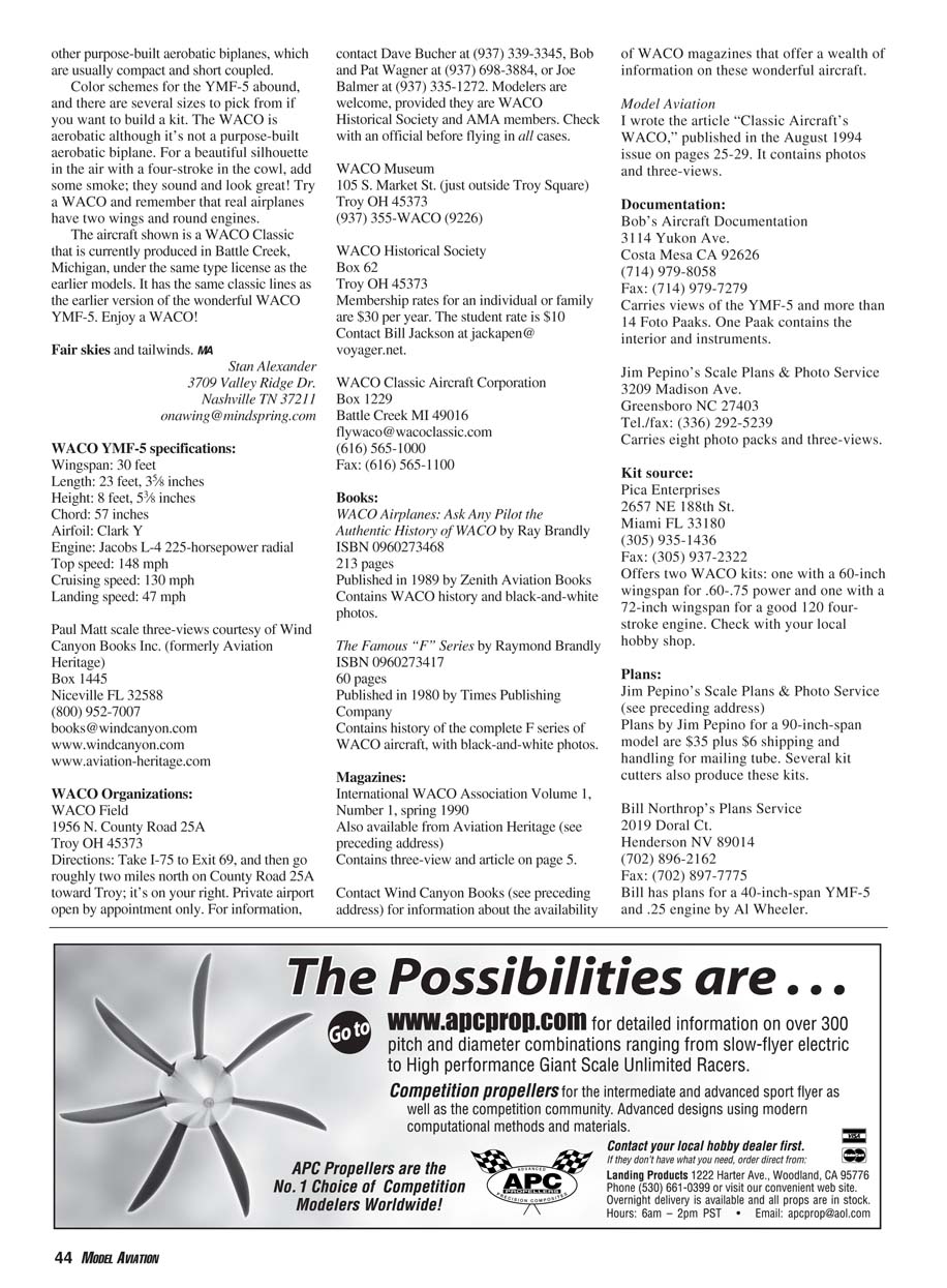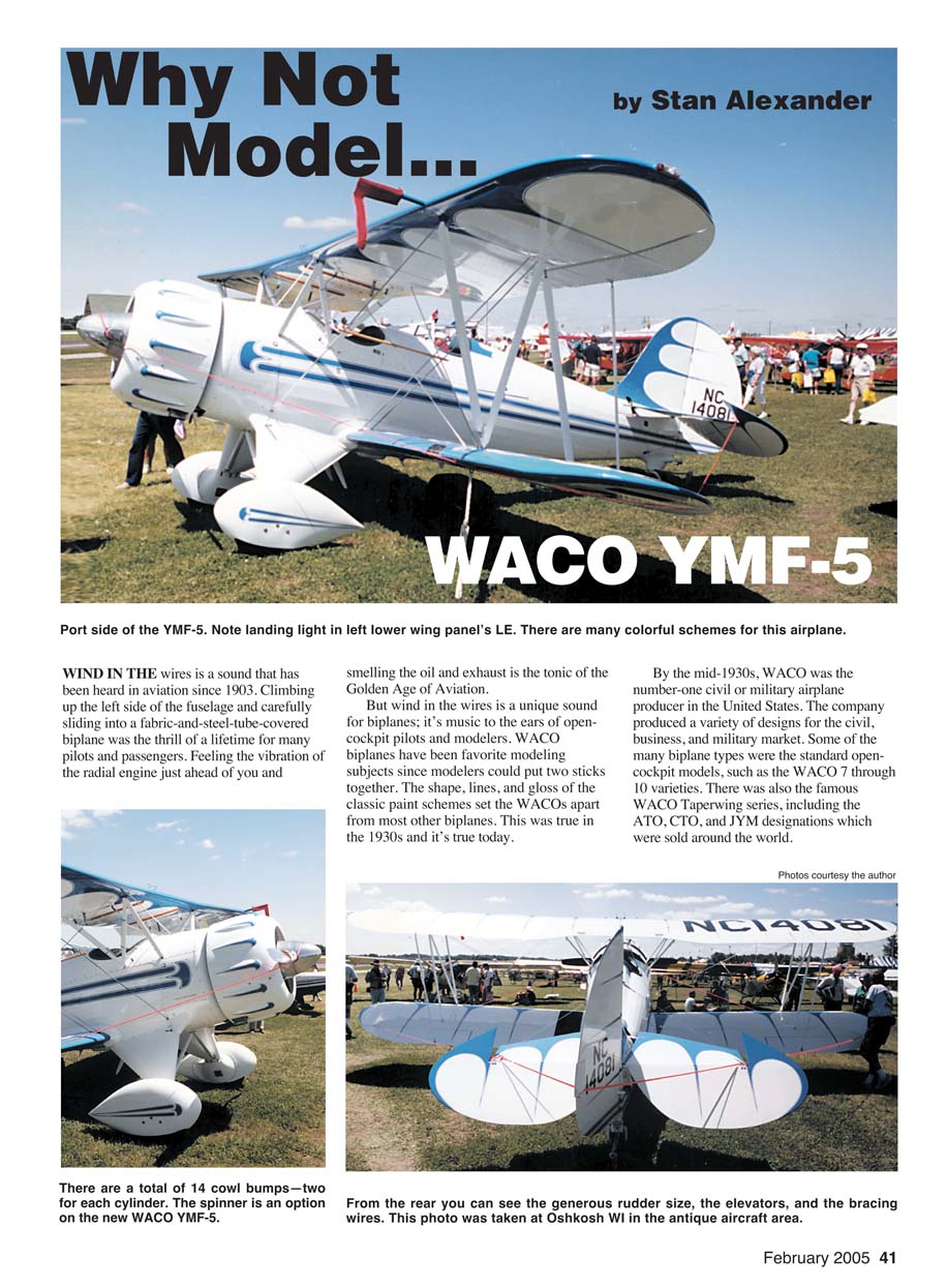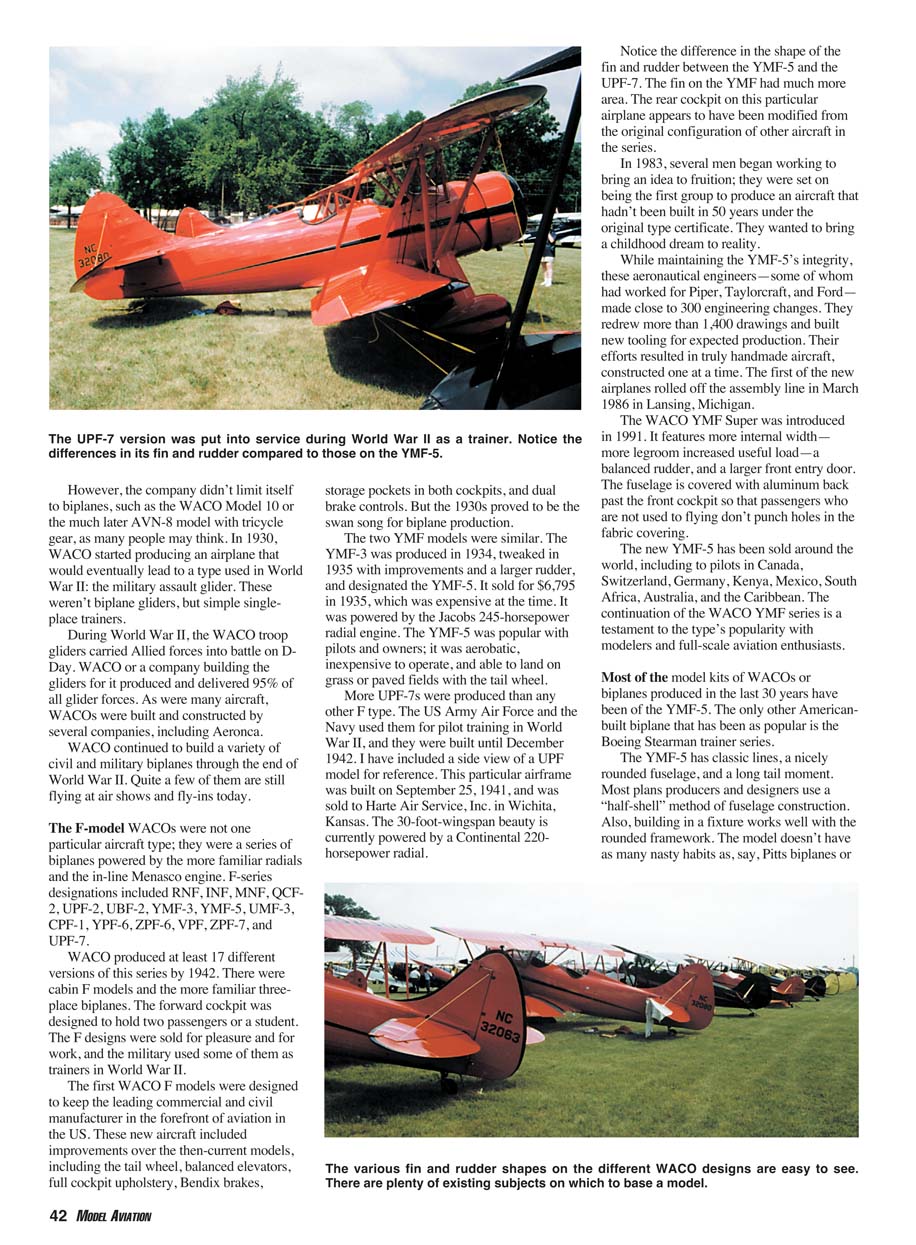 February 2005 41 Why Not Model... WACO YMF-5 Port side of the YMF-5. Note landing light in left lower wing panel’s LE. There are many colorful schemes for this airplane. smelling the oil and exhaust is the tonic of the Golden Age of Aviation. But wind in the wires is a unique sound for biplanes; it’s music to the ears of opencockpit pilots and modelers. WACO biplanes have been favorite modeling subjects since modelers could put two sticks together. The shape, lines, and gloss of the classic paint schemes set the WACOs apart from most other biplanes. This was true in the 1930s and it’s true today. By the mid-1930s, WACO was the number-one civil or military airplane producer in the United States. The company produced a variety of designs for the civil, business, and military market. Some of the many biplane types were the standard opencockpit models, such as the WACO 7 through 10 varieties. There was also the famous WACO Taperwing series, including the ATO, CTO, and JYM designations which were sold around the world. WIND IN THE wires is a sound that has been heard in aviation since 1903. Climbing up the left side of the fuselage and carefully sliding into a fabric-and-steel-tube-covered biplane was the thrill of a lifetime for many pilots and passengers. Feeling the vibration of the radial engine just ahead of you and There are a total of 14 cowl bumps—two for each cylinder. The spinner is an option on the new WACO YMF-5. From the rear you can see the generous rudder size, the elevators, and the bracing wires. This photo was taken at Oshkosh WI in the antique aircraft area. by Stan Alexander Photos courtesy the author 42 MODEL AVIATION The UPF-7 version was put into service during World War II as a trainer. Notice the differences in its fin and rudder compared to those on the YMF-5. The various fin and rudder shapes on the different WACO designs are easy to see. There are plenty of existing subjects on which to base a model. However, the company didn’t limit itself to biplanes, such as the WACO Model 10 or the much later AVN-8 model with tricycle gear, as many people may think. In 1930, WACO started producing an airplane that would eventually lead to a type used in World War II: the military assault glider. These weren’t biplane gliders, but simple singleplace trainers. During World War II, the WACO troop gliders carried Allied forces into battle on DDay. WACO or a company building the gliders for it produced and delivered 95% of all glider forces. As were many aircraft, WACOs were built and constructed by several companies, including Aeronca. WACO continued to build a variety of civil and military biplanes through the end of World War II. Quite a few of them are still flying at air shows and fly-ins today. The F-model WACOs were not one particular aircraft type; they were a series of biplanes powered by the more familiar radials and the in-line Menasco engine. F-series designations included RNF, INF, MNF, QCF- 2, UPF-2, UBF-2, YMF-3, YMF-5, UMF-3, CPF-1, YPF-6, ZPF-6, VPF, ZPF-7, and UPF-7. WACO produced at least 17 different versions of this series by 1942. There were cabin F models and the more familiar threeplace biplanes. The forward cockpit was designed to hold two passengers or a student. The F designs were sold for pleasure and for work, and the military used some of them as trainers in World War II. The first WACO F models were designed to keep the leading commercial and civil manufacturer in the forefront of aviation in the US. These new aircraft included improvements over the then-current models, including the tail wheel, balanced elevators, full cockpit upholstery, Bendix brakes, storage pockets in both cockpits, and dual brake controls. But the 1930s proved to be the swan song for biplane production. The two YMF models were similar. The YMF-3 was produced in 1934, tweaked in 1935 with improvements and a larger rudder, and designated the YMF-5. It sold for $6,795 in 1935, which was expensive at the time. It was powered by the Jacobs 245-horsepower radial engine. The YMF-5 was popular with pilots and owners; it was aerobatic, inexpensive to operate, and able to land on grass or paved fields with the tail wheel. More UPF-7s were produced than any other F type. The US Army Air Force and the Navy used them for pilot training in World War II, and they were built until December 1942. I have included a side view of a UPF model for reference. This particular airframe was built on September 25, 1941, and was sold to Harte Air Service, Inc. in Wichita, Kansas. The 30-foot-wingspan beauty is currently powered by a Continental 220- horsepower radial. Notice the difference in the shape of the fin and rudder between the YMF-5 and the UPF-7. The fin on the YMF had much more area. The rear cockpit on this particular airplane appears to have been modified from the original configuration of other aircraft in the series. In 1983, several men began working to bring an idea to fruition; they were set on being the first group to produce an aircraft that hadn’t been built in 50 years under the original type certificate. They wanted to bring a childhood dream to reality. While maintaining the YMF-5’s integrity, these aeronautical engineers—some of whom had worked for Piper, Taylorcraft, and Ford— made close to 300 engineering changes. They redrew more than 1,400 drawings and built new tooling for expected production. Their efforts resulted in truly handmade aircraft, constructed one at a time. The first of the new airplanes rolled off the assembly line in March 1986 in Lansing, Michigan. The WACO YMF Super was introduced in 1991. It features more internal width— more legroom increased useful load—a balanced rudder, and a larger front entry door. The fuselage is covered with aluminum back past the front cockpit so that passengers who are not used to flying don’t punch holes in the fabric covering. The new YMF-5 has been sold around the world, including to pilots in Canada, Swi