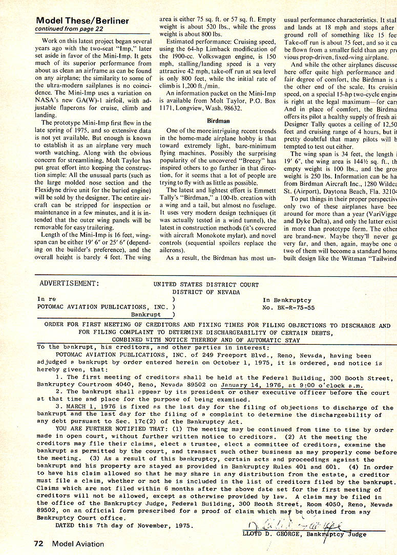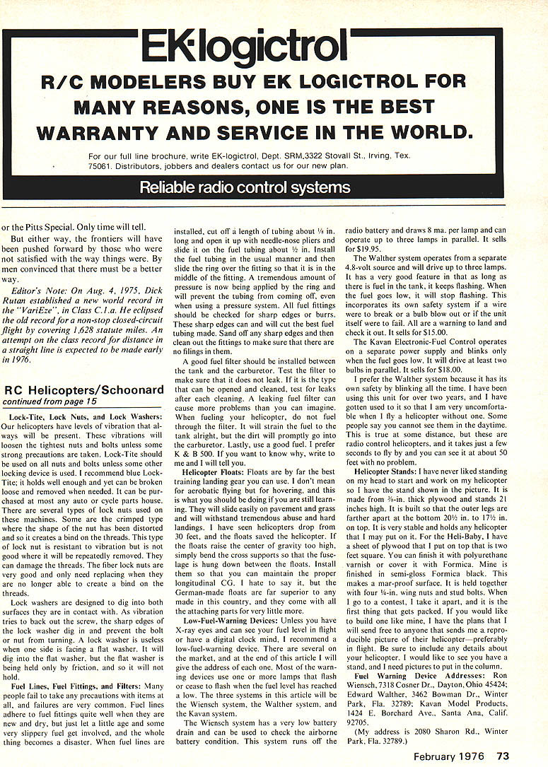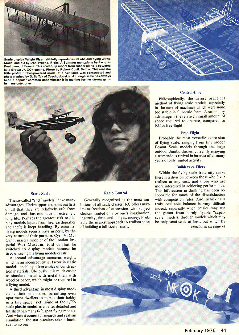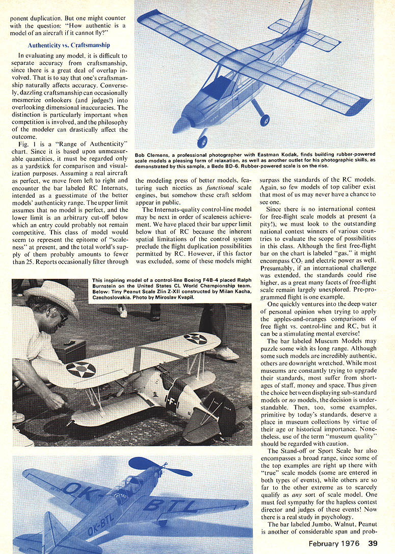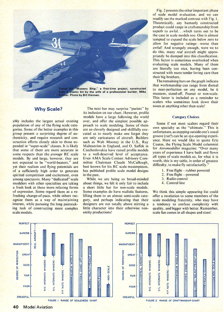 EVER WONDER what makes scale modeler tick would seem hear slightly different drummer regu lar non-scale model builders neces sarily better beat certainly differ ent Active scale builders distinct minority group Yet gain attention out proportion numbers great scale model talkers relatively few doers rea son simple Researching designing building scale models very hard work Vast amounts patience discipline required mention skill people willing invest ingredients What motivates Ask ten different builders may receive ten different answers Over period years have exchanged letters relating subject modelers various parts US foreign countries recently J D Gillies author completed tour gave us opportunity talk some people person well see models first-hand Additionally visited museums some worlds finest scale models exhibited article first two parts will try present some conclusions based upon collective opinions active scale model builders try evaluate some efforts risky generalize subject especially closely involved personal philosophies attempt What big attraction scale way tough question Obviously attraction universal would lot builders there certainly no shortage scale en thusiasts People no par ticular interest aviation can identify scale models whereas non-scale types bear vague resemblance real aircraft will go largely ignored Watch crowds gather contest would like quote Ron Van Puttes Nationals Radio Control report featured November Model viation spectators gathered watch AMA Sport Scale other event excitement involved watching flights beautifully crafted miniature versions full-scale aircraft cannot matched same issue Model viation quote Dan Pruss reporting 6th RC Soaring Nationals regular flying stopped chance given scale flier prepares ship show-stoppers prove high level interest category spectators viewpoint pit area nearly empties lines form around launch land ing area earlier Nationals fellow com mented walking away non-scale events think would exciting watch paint dry quote famous movie flier Frank Tallman after watching Wily Bill Hannan quest realism has always phenomena scale wheel within wheels world reviewed depth first time first two articles RC contest dont care will snap-rolls sewer pipe doesnt look like real aircraft Im interested Make no mistake about scale model building flying has certain aspects show biz about modelers like actors motivated least part egos Perhaps choice words Exhibition Models literal originally intended scale modelers exude least little oldfashioned ham whether admit enjoy attention spectators fellow builders goodness knows earn other hand have great deal fun pro cess Question like build scale models Answer No like having built scale models subtle point per haps important examin ing motives interesting note some RC pattern fliers have entered scale via back door say originally no particular interest missed having appreciative audience Once involved usually via stand-off scale approach too hooked Unfortunately scale has long suffered mystique implied watchmakers could competitive international competition level may too far fact very spe cial type temperament prerequisite top-level scale modeler very few people qualify zealous scaler con stantly striving reach some self-desig nated plateau fellows may say merely out meet compe tition really dealing much tougher adversaries. themselves favorable result improvement arta gradual raising standards finer quality models An unfortunate side effect however may discourage ment among ranks lesser talented builders almost everyone would like improve skills comes point hobby can assume proportions work second job almostand non-paying except terms personal satisfaction Which some may adequate remuneration Interestingly talking professional model builders encountered much relaxed attitude regarding nit picking aspects building people cannot approach Internats standards simply very few cus tomers willing pay cost time involved Thus pros have devel oped ways achieving maximum results minimum efforts Scale Scale Turning motives models dis cussed issue authenticity builders scale models arrived conclusion Accuracy eye beholder Presumably truly scale model would exact duplicate real thing literally shrunken aircraft remains zenith likely real ized least until learn great deal about atomic structure Perhaps Internats-winning RC models represent closest approach date Some might argue certain museum display models would come closer ideal may true terms material com 38 Model Aviation Master scale builder Dave Platt making repairs ducted-fan radio-controlled Douglas Sky ray during last Nationals ponent duplication might counter question authentic model aircraft cannot fly Authenticity s Craftsmanship evaluating model difficult separate accuracy craftsmanship since great deal overlap volved say ones craftsman ship naturally affects accuracy Converse ly dazzling craftsmanship can occasionally mesmerize onlookers judges overlooking dimensional inaccuracies distinction particularly important competition involved philosophy modeler can drastically affect outcome Fig Range Authenticity chart Since based upon unmeasur able quantities must regarded yardstick comparison visual ization purposes Assuming real aircraft perfect move left right encounter bar labeled RC Internats intended guesstimate better models authenticity range upper limit assumes no model perfect lower limit arbitrary cut-off below entry could probably remain competitive class model would seem represent epitome scale ness present total worlds sup ply probably amounts fewer 25 Reports occasionally filter through modeling press better models fea turing such niceties functional scale engines somehow craft seldom appear public Internats-quality control-line model may next order scaleness achieve ment have placed bar upper limit below RC because inherent spatial limitations control system preclude flight duplication possibilities permitted RC However factor excluded some mod
