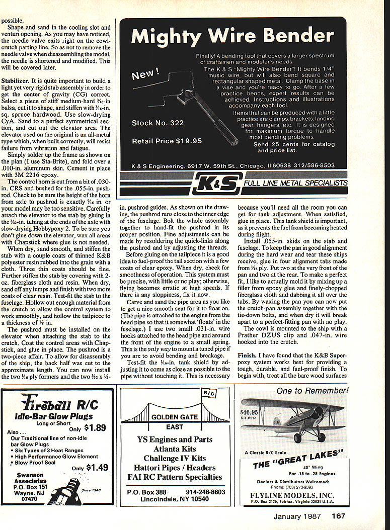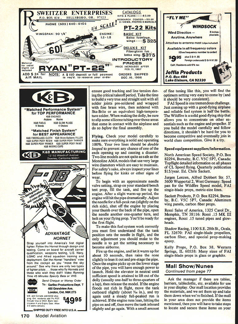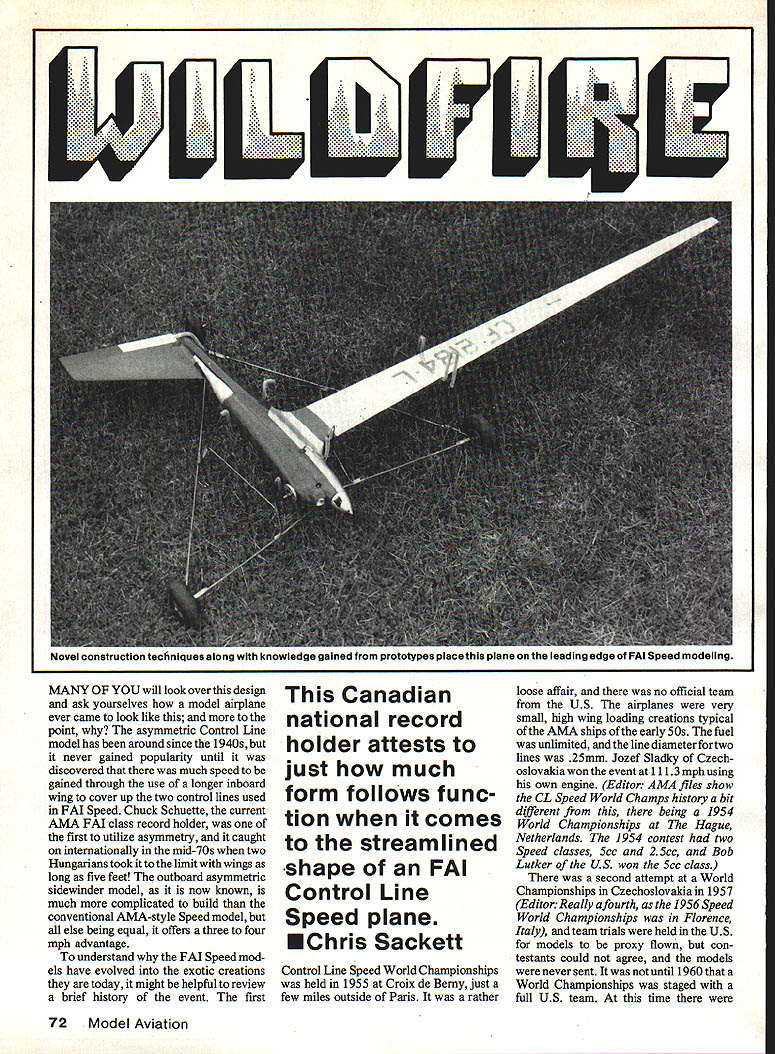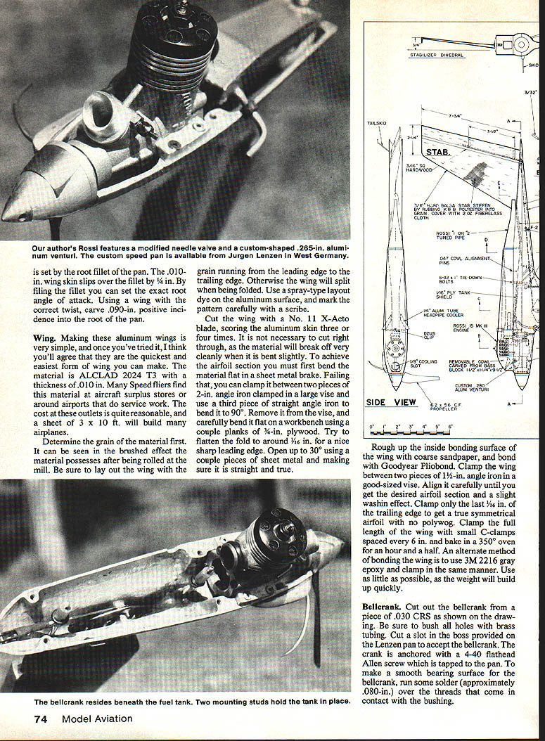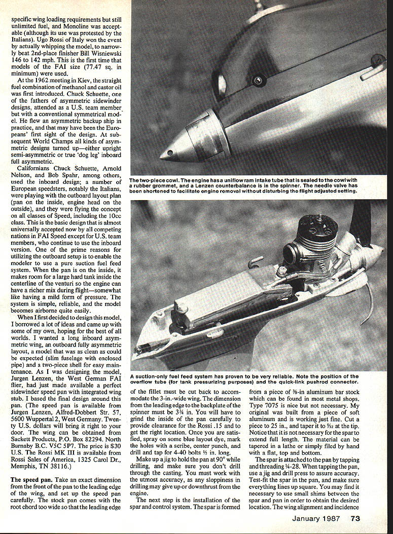 U el consiruciion wcnniques aiong WlTfl Knowleoge gained prototypes place plane leading edge FAi Speed modeling MANY OF YOU will look over design ask yourselves model airplane ever came look like point asymmetric Control Line model has around since 1940s never gained popularity until discovered much speed gained through use longer inboard wing cover up two control lines used FAI Speed Chuck Schuette current AMA FAd class record holder first utilize asymmetry caught internationally mid-70s two Hungarians took limit wings long five feet outboard asymmetric sidewinder model now known much complicated build conventional AMA-style Speed model else being equal offers three four mph advantage understand FAI Speed mod els have evolved exotic creations today might helpful review brief history event first Canadian national record holder attests just much form follows func tion comes streamlined shape FAI Control Line Speed plane Chris Sackett Control Line Speed World Championships held 1955 Croix de Berny just few miles outside Paris rather loose affair no official team US airplanes very small high wing loading creations typical AMA ships early SOs fuel unlimited line diameter fortwo lines 25mm Jozef Sladky Czech oslovakia won event 1113mph using own engine Editor AMA files show CL Speed World Champs history bit different being 1954 World Championships Hague Netherlands 1954 contest two Speed classes 5cc 25cc Bob Lutker US won 5cc class second attempt World Championships Czechoslovakia 1957 EditorReallyafourth 1956 Speed World Championships Florence Italy team trials held US models proxy flown con testants could agree models never sent until 1960 World Championships staged full US team time 72 Model Aviation specific wing loading requirements still unlimited fuel Monoline accept able although its use protested Italians Ugo Rossi Italy won event actually whipping model narrow ly beat 2nd-place finisher Bill Wisniewski 146 142 mph first time models FAI size 7747 sq minimum used 1962 meeting Kiev straight fuel combination methanol castor oil first introduced Chuck Schuette fathers asymmetric sidewinder designs attended US team member conventional symmetrical mod el flew asymmetric backup ship practice may have Euro peans first sight design sub sequent World Champs kinds asym metric designs turned upeither upright semi-asymmetric true dog leg inboard full asymmetric Californians Chuck Schuette Arnold Nelson Bob Spahr among others used inboard design number European speedsters notably Italians playing outboard layout plan pan inside engine head outside flying concept classes Speed including 10cc class basic design almost universally accepted now competing nations FAI Speed except US team members continue use inboard version prime reasons utilizing outboard setup enable modeler use pure suction fuel feed system pan inside makes room large hard tank inside centerline venturi engine can have richer mix during flightsomewhat like having mild form pressure system simple reliable model becomes airborne quite easily first decided design model borrowed lot ideas came up some own hoping best worlds wanted long inboard asym metric wing outboard fully asymmetric layout model clean could expected slim fuselage enclosed pipe two-piece shell easy main tenance As designing model Jurgen Lenzen West German FAI flier just made available perfect sidewinder speed pan integrated wing stub based final design around pan speed pan available Jurgen Lenzen Alfred-Dobbert Str 57 5600 Wuppertal 2 West Germany Twen ty US dollars will bring right door wing can obtained Sackett Products PO Box 82294 North Burnaby BC V5C 5P7 price $30 US Rossi MK III available Rossi Sales America 1325 Carol Dr Memphis TN 38116 speed pan Take exact dimension front pan leading edge wing set up speed pan carefully stock pan comes root chord too wide leading edge fillet must cut back accom modate 3-in -wide wing dimension leading edge backplate spinner must 3 will have grind inside pan carefully provide clearance Rossi 15 get right location Once satis fied spray some blue layout dye mark holes scribe center punch drill tap 4-40 bolts Make up aug hold pan 900 drilling make sure dont drill through casting must work utmost accuracy sloppiness drilling may give up downthrust engine next step installation spar control system spar formed piece -in aluminum bar stock can found metal shops Type 7075 nice necessary original built piece soft aluminum working just fine Cut piece 25 taper 2 tip Notice necessary spar extend full length material can tapered lathe simply filed hand flat top bottom spar attached pan tapping threading -28 tapping pan use ajig drill press assure accuracy Test-fit spar pan make sure everything lines up square may find necessary use small shims between spar pan order obtain desired location wing aligmnent incidence January1987 73 ne two-piece cowi ne engine nas uniflow ram intaketube sealed tothe cowl rubber grommet Lenzen counterbalance spinner needle valve has shortened facilitate engine removal disturbing flight adjusted setting suction-only fuel feed system has proven very reliable Note position overflow tube tank pressurizing purposes quick-link pushrod connector set root fillet pan 010m wing skin slips over fillet ng fillet can set exact root angle attack Using wing correct twist carve 090-in positive inci dence root pan Wing Making aluminum wings very simple once youve tried think youll agree quickest easiest form wing can make material ALCLAD 2024 T3 thickness 010 Speed fliers find material aircraft surplus stores around airports service work cost outlets quite reasonable sheet 3 x 10 ft will build airplanes Determine grain material first can seen brushed effect material possesses after being rolled mill sure lay out wing grain running leading edge trailing edge Otherwise wing will split being folded Use spray-type layout dye aluminum surface mark pattern carefully scribe Cut wing No 11 X-Acto blade scoring aluminum skin three four 