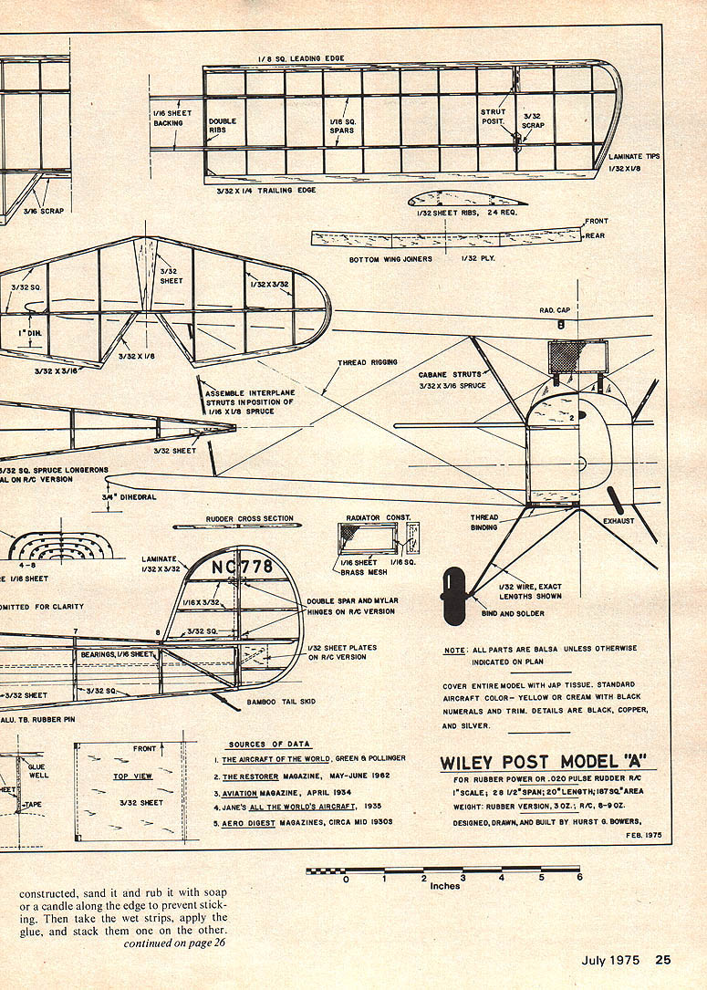 fl1oy ost w tG Bowers THE COLLAPSE stock market 1929 followed great depression 1930s came time Americans filled unprecedented enthusiasm aviation large extent mania flying brought about Lindberghs successful Atlantic crossing followed other daring h\tory-making flights economy time however tle enthusiasm manifested itself form reading aviation publications day dreaming time could afford buy airplane become pilot other times history determined resource ful Individuals content merely day dream put dr&ims ideas action de velopment actual hardware barns shops basements became small aircraft factories just case homebuilders today utilizing such tools materials engines could readily obtained course efforts futile also quite successful example Pietenpol Air Camper powered cheap plentiful Model Ford en gine period began under such circumstances still homebuilders favorite now some 45 years later Another example subject article Wiley Post Model began project enthusiastic Ford garage mechanic Enid OkIa Unfortunately name gifted individual has slipped oblivion owner garage Mr Straughn suffi ciently interested employees crea tion establish Straughn Airplane Co 1934 Wichita Kan small Model Ford engine powered twoplace biplane side side seating placed production Only three air planes built company beset financial problems ma chine intended sell under $1000 costing build 1935 corporation Oklahoma City bought manufacturing rights airplane named after Oklahomas famous flier far known use name connection Wiley Post ever venture dozen airplanes pro duced reportedly selling $1438 company succumbed another tragedy era flew little ship indicated very well liked being docile easy fly specifications performance Wiley Post typical light plane day its construction wing span 28 ft length overall 19 ft 8 weights empty gross 581 998 lbs respectively fuel capacity 7 gal 35 gallon/ hour consumption rate Maximum speed 80 mph cruise ranging 60 70 landing speed reportedly 25 mph Absolute service ceilings 12000 10000 ft construction conventional welded steel fuselage tail framework wooden wings fabric covering According Aircraft World William Green Gerald Pollinger two examples Wiley Post Model U S Civil Register 1965 active storage does select given aircraft model suppose answers question modelers matter aesthetics could find beauty Storch Stuka Yet favorites just others turned-on ungainly Jenny Cub Wasnt said beauty eyes beholder far modeling con cerned should expanded say July1975 23 Build two waysrubber tail-wagger RC original did well both systems power beauty eyes beholder given time given purpose reason selected Wiley Post indoor rubber-powered project turned out beautiful model indoor flying site simply didnt justice spite adjusting seemed right hand turn model liked big circles resigned myself th fact best suited outdooors However during careful check alignment discovered problema slight amount washin top wing panels other corrected model flies nicely still feel better suited outdoor flying lazy calm summer evenings Since weight Cox 020 Pee Wee engine very nearly equals weight propeller rubber make power job Better yet little ACE Baby pulse R/C unit weighs slightly over three ounces will save lots long chases retrieve model Look figures wing area 187 sq 13 sq ft model weight complete engine radio can easily held 10 oz under gives wing loading 8 oz er sq ft experience small schoolyard scale R/C models becoming popular have found wing loading perfect Needless say little model has unlimited possibilities keeping original concept prototype 42 years ago cheap build fly either mode Best dont have burn 10 gal gasoline car going out suitable flying fieldjust walk over local school yard let rip Construction Construction simple fast Start building two fuselage sides 3/32 sq medium balsa directly plan select R/C version may use 3/32 sq spruce longerons stick balsa uprights diagonals cross members Join sides cut form ers 1/16 sheet stock glueing place after sanding use Titebond glue almost entirely model building primar ily because can thinned water easily applied brush however applications prefer old standby Ambroid Such place covering forward decking 1/32 sheet easily done using four pieces cut shape held place masking tape until glue dry Never use pins will split wood bends Add soft balsa blocks cowl cheeks chin sand shape along / 16 plywood nose plate help add nose weight needed rubber version provide solid support 1/16 plywood firewall 020 engine used Now add 1/16 sq stringers turtledeck install tailskid landing I/B SQ LEADING EDGE & LAZ\ TIPS FROM x Iis 5mpg _- IJT ST RUT111L IIPOSITII ISPARSSTRU II3/32/ POSfl -Iz[I 1_i_V177___ I------AILERONS ON TOP WING ONLY 3/32 X IM TRAILING EDGE ALL RImS I/U SNEET MAIN RU 24 REQ CENTER SECT RIBB REQ FRONT REAR TOP WING ICIHERS/32 PL INSTRUMENT PANEL NT THRUST RUSEN 020 GALSA NOSE BLOCK uiMI SOFT SHEET —II__ OP VIEW Si II j ON N/C VERSION SHIFT BATTERIES FOR PROPER BALANCE WINDSHIELD PATTERN STNUCTURE FDI ROD II BEARING -Iy I/IS PLY FIREWALL POSITION FOR 020 POWERED VERSION/32 SHEET COVERING / RAD CAP~124zX- I RADIATOR HOSE2 3 PLASTIC TIflEIALL P IiIGPLYCUTBiDETODO EDTYPICAL STRUT CROSSSECTION LINE ON 020 POWERED VERSION P- 4I/IGSQS S riT 7--i ill I. II Ii 4r-&-Hr -11TACEBABYRiSTRIPE COLOR U -x UWIT SHOWN BY 1~~~-2 DOTTEDLINEB COX 020 PEE WEE U-.-.-.. SHOWN BY DOTTED IASOFTBNEE3/32 SHEET PLATES LINES FOR N/C\i, ALU TUBECASANE STRUT MOUNTING VERSIONEX~TI/32 WIRE- FILL IN WITH /32 SHEET MID BIDE VIEWIFRONT NOTE USE B 5COVER WITH TISSUEI UIEET PLASTIC PROP ON STRUT RUBBER VERSIONII Th i 71 K77m pI -POSITIONS\ -Tr BI ANDI V TREXLER SOLDERBALLOON WHEELSTAPEH gear fuselage may set aside until after wings tail built quite simple need few words advice laminate almost wing tips tail outlines 1/32 strips soaked hot water few mIn utes bonded Titebond glue very simple strength weight savings well worth Just cut form inside radius curve 24 Model Aviation LAMINATE 1/32 X 3/ 3/32 TORQUE ROD WS 