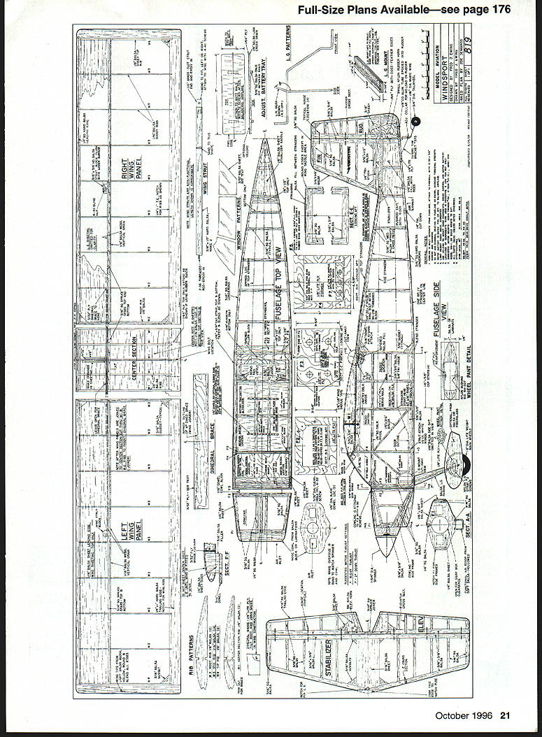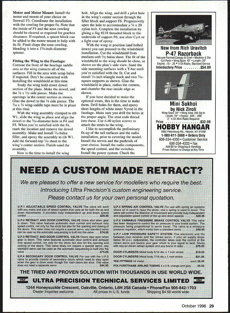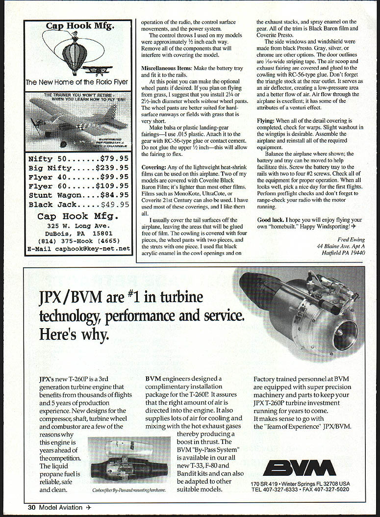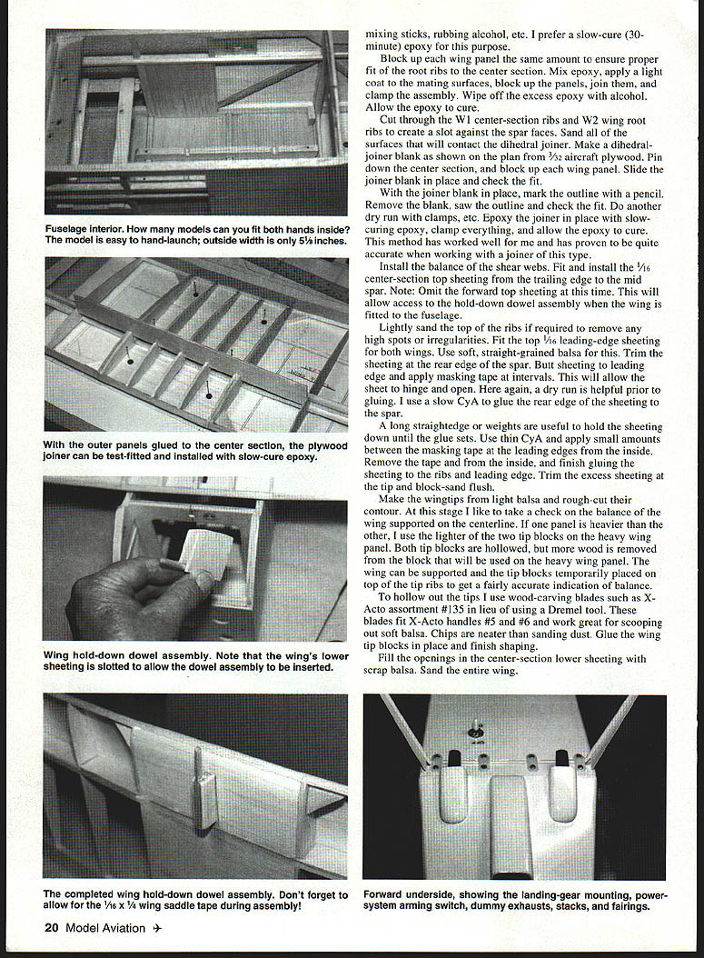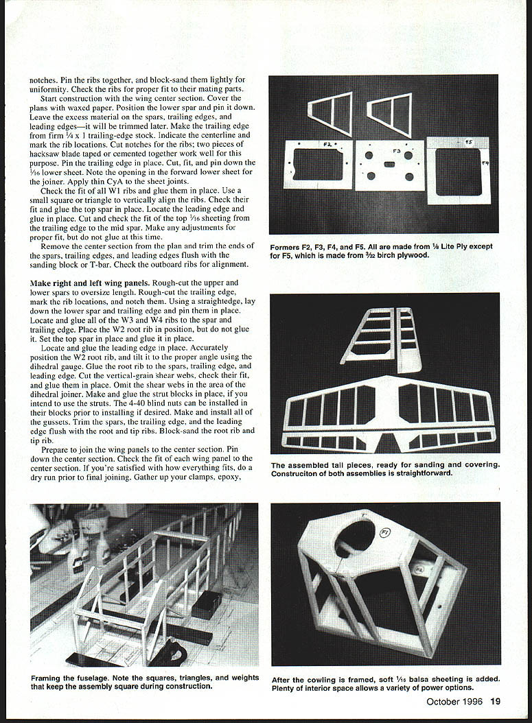 NO OCR TEXT NO OCR TEXT Type Electric RO Sport Wingspan 56 inches Wing Area 504 square inches Power 05-15 geared cobalt motor Functions Throttle rudder elevator Flying Weight 49-62 ounces Construction Built-up Covering/Finish Coverite Black Baron Film equivalent notches Pin ribs together block-sand lightly uniformity Check ribs proper fit mating parts Start construction wing center section Cover plans waxed paper Position lower spar pin down Leave excess material spars trailing edges leading edgesit will trimmed later Make trailing edge firm trailing-edge stock Indicate centerline mark rib locations Cut notches ribs two pieces hacksaw blade taped cemented together work well purpose Pin trailing edge place Cut fit pin down A6 lower sheet Note opening forward lower sheet joiner Apply thin CyA sheet joints Check fit Wl ribs glue place Use small square triangle vertically align ribs Check fit glue top spar place Locate leading edge glue place Cut check fit top 1A6 sheeting trailing edge mid spar Make adjustments proper fit glue time Remove center section plan trim ends spars trailing edges leading edges flush sanding block T-bar Check outboard ribs alignment Make right left wing panels Rough-cut upper lower spars oversize length Rough-cut trailing edge mark rib locations notch Using straightedge lay down lower spar trailing edge pin place Locate glue W3 W4 ribs spar trailing edge Place W2 root rib position glue Set top spar place glue place Locate glue leading edge place Accurately position W2 root rib tilt proper angle using dihedral gauge Glue root rib spars trailing edge leading edge Cut vertical-grain shear webs check fit glue place Omit shear webs area dihedral joiner Make glue strut blocks place intend use struts 4-40 blind nuts can installed blocks prior installing desired Make install gussets Trim spars trailing edge leading edge flush root tip ribs Block-sand root rib tip rib Prepare join wing panels center section Pin down center section Check fit wing panel center section youre satisfied everything fits dry run prior final joining Gather up clamps epoxy October 1996 19 Farmers F2 F3 F4 F5 made 1% Lite Ply except F5 made 3M birch plywood assembled tail pieces ready sanding covering Construciton both assemblies straightforward Framing fuselage Note squares triangles weights After cowling framed soft 1/i6 balsa sheeting added keep assembly square during construction Plenty interior space allows variety power options mixing sticks rubbing alcohol etc prefer slow-cure 30minute epoxy purpose Block up wing panel same amount ensure proper fit root ribs center section Mix epoxy apply light coat mating surfaces block up panels join clamp assembly Wipe off excess epoxy alcohol Allow epoxy cure Cut through Wi center-section ribs W2 wing root ribs create slot against spar faces Sand surfaces will contact dihedral joiner Make dihedral joiner blank shown plan 3h2 aircraft plywood Pin down center section block up wing panel Slide joiner blank place check fit joiner blank place mark outline pencil Remove blank saw outline check fit another dry run clamps etc Epoxy joiner place slowcuring epoxy clamp everything allow epoxy cure method has worked well has proven quite accurate working joiner type Install balance shear webs Fit install 1A6 center-section top sheeting trailing edge mid spar Note Omit forward top sheeting time will allow access hold-down dowel assembly wing fitted fuselage Lightly sand top ribs required remove high spots irregularities Fit top 1/16 leading-edge sheeting both wings Use soft straight-grained balsa Trim sheeting rear edge spar Butt sheeting leading edge apply masking tape intervals will allow sheet hinge open again dry run helpful prior gluing use slow CyA glue rear edge sheeting spar long straightedge weights useful hold sheeting down until glue sets Use thin CyA apply small amounts between masking tape leading edges inside Remove tape inside finish gluing sheeting ribs leading edge Trim excess sheeting tip block-sand flush Make wingtips light balsa rough-cut contour stage like take check balance wing supported centerline panel heavier other use lighter two tip blocks heavy wing panel Both tip blocks hollowed wood removed block will used heavy wing panel wing can supported tip blocks temporarily placed top tip ribs get fairly accurate indication balance hollow out tips use wood-carving blades such X Acto assortment #135 lieu using Dremel tool blades fit X-Acto handles #5 #6 work great scooping out soft balsa Chips neater sanding dust Glue wing tip blocks place finish shaping Fill openings center-section lower sheeting scrap balsa Sand entire wing 20 Model Aviation lage interior models can fit both hands inside model easy hand-launch outside width 51A inches outer panels glued center section plywood joiner can test-fitted installed slow-cure epoxy Wing hold-down dowel assembly Note wings lower sheeting slotted allow dowel assembly inserted completed wing hold-down dowel assembly Dont forget allow /16 x wing saddle tape during assembly Forward underside showing landing-gear mounting power system arming switch dummy exhausts stacks fairings iiz~ S LRDGD XUI -II~SROTIRDTOOR7TO -I _ __ I-- L--/NUDOD 4 ___ _____71Litm ---if I LEFT WING PANEL RIB PATTERNSTO GINO -RUSDP0 ND ROOT DIR IDS SOLSO IDDR RAL~&b SR 500 RIR RGLENLITL TIP SIR0R DOLNO 12OODET~I4ftDI ROLSOSORE SECT F-FSTEEPO TILT ROOT RON UNRIG GOUGE STABILIZER II Ill 11 I: TSIRTOG -lye DOLl FVI050 SUN NO O4 -A it-4 iOPDSPOR-{ 1 1k GD NIBS TO OORR ODIEDROL BROOD - DIHEDRALBRACE C TEB SEC N V7 ROROTROII OREROOLOWIOTDOOGRUII BROOD TO________IIIISTRUTRLOCE PLLRG 12ZNUR RTG DOORS NBSRRO zPtx OLSO TTS-DO RLIOOSS R ODD OS ROLDO 1/7A SDIR ES SPSDO RIGHT WING PANEL ROTOOIROTOSUTSGRDDOD-PUGOyOGOL --TIE SODIGO DOOD I lU~-4J7 ii II 11 ____V _______ ________________________II II II Sil4 _____ ____ITS SO ISO ES RN /___ ________I ITLOERLES-URTOIDOL GROG UERTDOL GROW - I RANROSOSIIINTOS __— op S DRIED SNOORDOGON PURIOS RUSSO DEDOD UT___