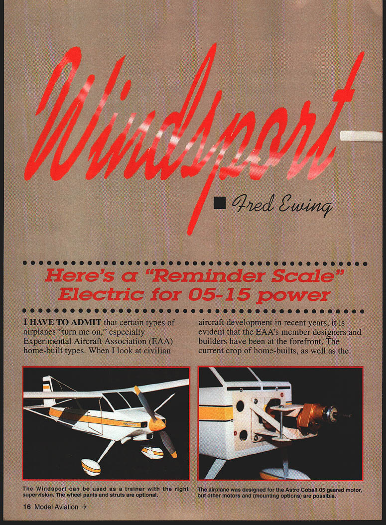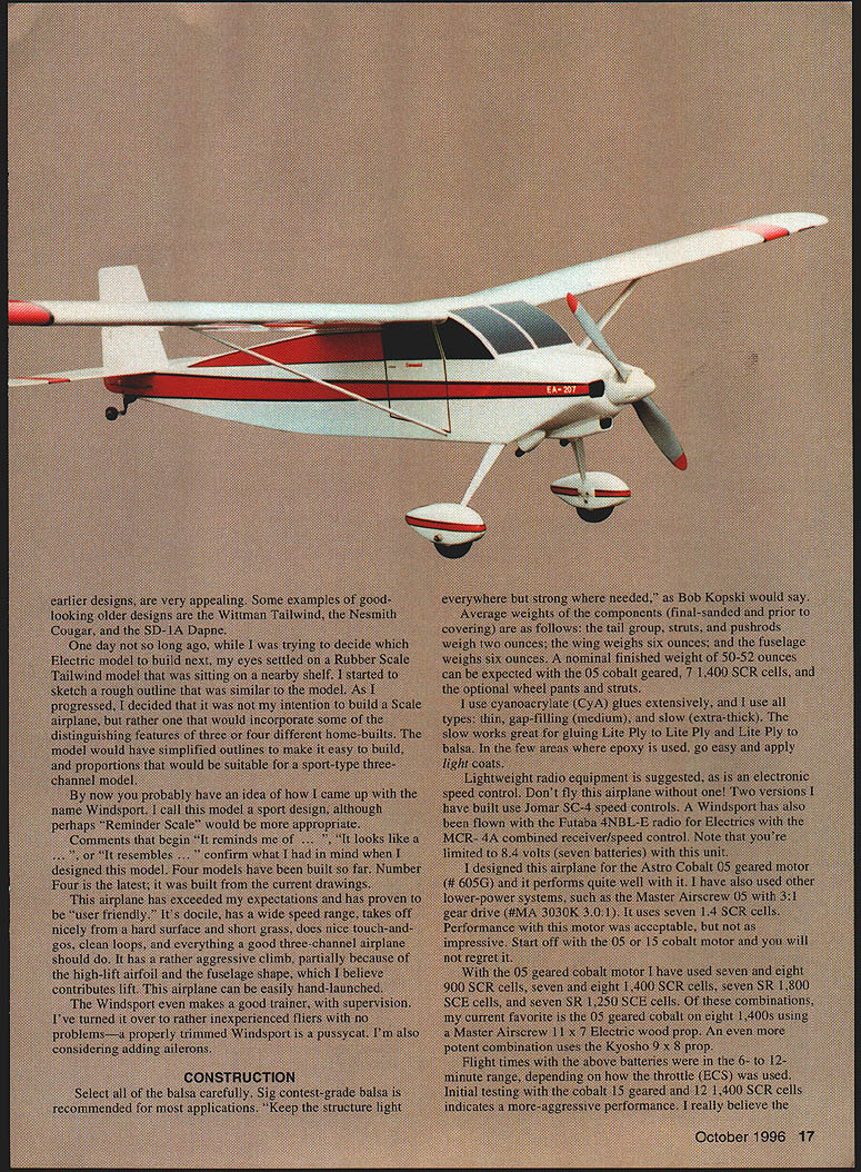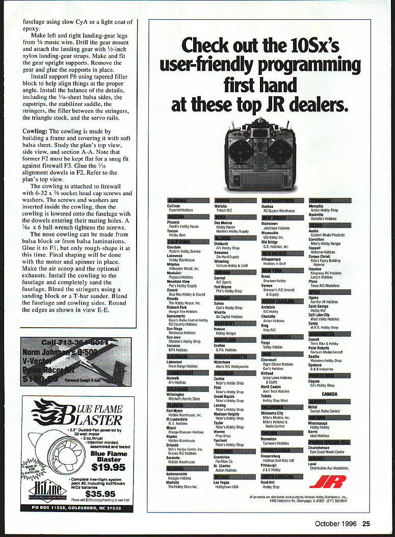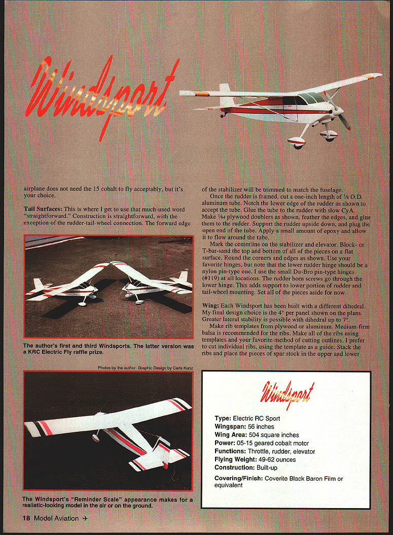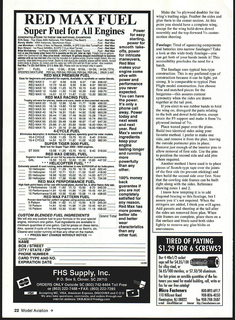 NO OCR TEXT NO OCR TEXT Type Electric RO Sport Wingspan 56 inches Wing Area 504 square inches Power 05-15 geared cobalt motor Functions Throttle rudder elevator Flying Weight 49-62 ounces Construction Built-up Covering/Finish Coverite Black Baron Film equivalent notches Pin ribs together block-sand lightly uniformity Check ribs proper fit mating parts Start construction wing center section Cover plans waxed paper Position lower spar pin down Leave excess material spars trailing edges leading edgesit will trimmed later Make trailing edge firm trailing-edge stock Indicate centerline mark rib locations Cut notches ribs two pieces hacksaw blade taped cemented together work well purpose Pin trailing edge place Cut fit pin down A6 lower sheet Note opening forward lower sheet joiner Apply thin CyA sheet joints Check fit Wl ribs glue place Use small square triangle vertically align ribs Check fit glue top spar place Locate leading edge glue place Cut check fit top 1A6 sheeting trailing edge mid spar Make adjustments proper fit glue time Remove center section plan trim ends spars trailing edges leading edges flush sanding block T-bar Check outboard ribs alignment Make right left wing panels Rough-cut upper lower spars oversize length Rough-cut trailing edge mark rib locations notch Using straightedge lay down lower spar trailing edge pin place Locate glue W3 W4 ribs spar trailing edge Place W2 root rib position glue Set top spar place glue place Locate glue leading edge place Accurately position W2 root rib tilt proper angle using dihedral gauge Glue root rib spars trailing edge leading edge Cut vertical-grain shear webs check fit glue place Omit shear webs area dihedral joiner Make glue strut blocks place intend use struts 4-40 blind nuts can installed blocks prior installing desired Make install gussets Trim spars trailing edge leading edge flush root tip ribs Block-sand root rib tip rib Prepare join wing panels center section Pin down center section Check fit wing panel center section youre satisfied everything fits dry run prior final joining Gather up clamps epoxy October 1996 19 Farmers F2 F3 F4 F5 made 1% Lite Ply except F5 made 3M birch plywood assembled tail pieces ready sanding covering Construciton both assemblies straightforward Framing fuselage Note squares triangles weights After cowling framed soft 1/i6 balsa sheeting added keep assembly square during construction Plenty interior space allows variety power options mixing sticks rubbing alcohol etc prefer slow-cure 30minute epoxy purpose Block up wing panel same amount ensure proper fit root ribs center section Mix epoxy apply light coat mating surfaces block up panels join clamp assembly Wipe off excess epoxy alcohol Allow epoxy cure Cut through Wi center-section ribs W2 wing root ribs create slot against spar faces Sand surfaces will contact dihedral joiner Make dihedral joiner blank shown plan 3h2 aircraft plywood Pin down center section block up wing panel Slide joiner blank place check fit joiner blank place mark outline pencil Remove blank saw outline check fit another dry run clamps etc Epoxy joiner place slowcuring epoxy clamp everything allow epoxy cure method has worked well has proven quite accurate working joiner type Install balance shear webs Fit install 1A6 center-section top sheeting trailing edge mid spar Note Omit forward top sheeting time will allow access hold-down dowel assembly wing fitted fuselage Lightly sand top ribs required remove high spots irregularities Fit top 1/16 leading-edge sheeting both wings Use soft straight-grained balsa Trim sheeting rear edge spar Butt sheeting leading edge apply masking tape intervals will allow sheet hinge open again dry run helpful prior gluing use slow CyA glue rear edge sheeting spar long straightedge weights useful hold sheeting down until glue sets Use thin CyA apply small amounts between masking tape leading edges inside Remove tape inside finish gluing sheeting ribs leading edge Trim excess sheeting tip block-sand flush Make wingtips light balsa rough-cut contour stage like take check balance wing supported centerline panel heavier other use lighter two tip blocks heavy wing panel Both tip blocks hollowed wood removed block will used heavy wing panel wing can supported tip blocks temporarily placed top tip ribs get fairly accurate indication balance hollow out tips use wood-carving blades such X Acto assortment #135 lieu using Dremel tool blades fit X-Acto handles #5 #6 work great scooping out soft balsa Chips neater sanding dust Glue wing tip blocks place finish shaping Fill openings center-section lower sheeting scrap balsa Sand entire wing 20 Model Aviation lage interior models can fit both hands inside model easy hand-launch outside width 51A inches outer panels glued center section plywood joiner can test-fitted installed slow-cure epoxy Wing hold-down dowel assembly Note wings lower sheeting slotted allow dowel assembly inserted completed wing hold-down dowel assembly Dont forget allow /16 x wing saddle tape during assembly Forward underside showing landing-gear mounting power system arming switch dummy exhausts stacks fairings iiz~ S LRDGD XUI -II~SROTIRDTOOR7TO -I _ __ I-- L--/NUDOD 4 ___ _____71Litm ---if I LEFT WING PANEL RIB PATTERNSTO GINO -RUSDP0 ND ROOT DIR IDS SOLSO IDDR RAL~&b SR 500 RIR RGLENLITL TIP SIR0R DOLNO 12OODET~I4ftDI ROLSOSORE SECT F-FSTEEPO TILT ROOT RON UNRIG GOUGE STABILIZER II Ill 11 I: TSIRTOG -lye DOLl FVI050 SUN NO O4 -A it-4 iOPDSPOR-{ 1 1k GD NIBS TO OORR ODIEDROL BROOD - DIHEDRALBRACE C TEB SEC N V7 ROROTROII OREROOLOWIOTDOOGRUII BROOD TO________IIIISTRUTRLOCE PLLRG 12ZNUR RTG DOORS NBSRRO zPtx OLSO TTS-DO RLIOOSS R ODD OS ROLDO 1/7A SDIR ES SPSDO RIGHT WING PANEL ROTOOIROTOSUTSGRDDOD-PUGOyOGOL --TIE SODIGO DOOD I lU~-4J7 ii II 11 ____V _______ ________________________II II II Sil4 _____ ____ITS SO ISO ES RN /___ ________I ITLOERLES-URTOIDOL GROG UERTDOL GROW - I RANROSOSIIINTOS __— op S DRIED SNOORDOGON PURIOS RUSSO DEDOD UT___