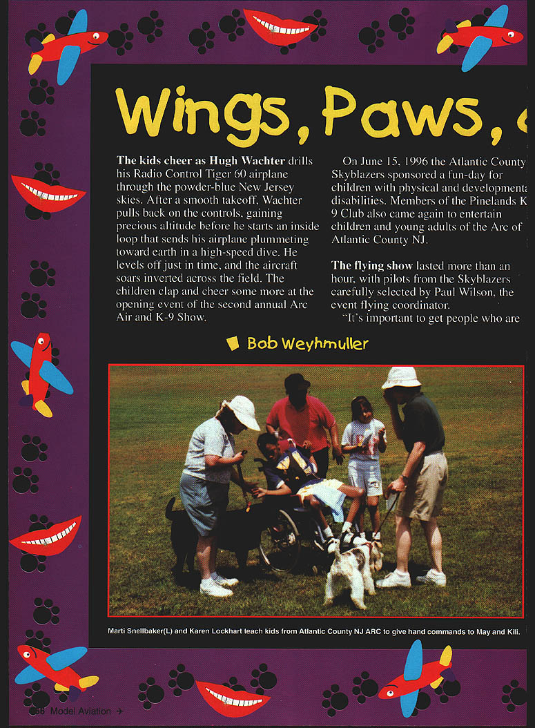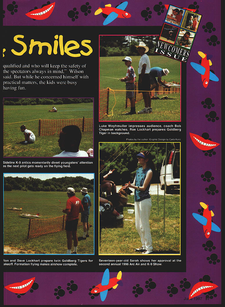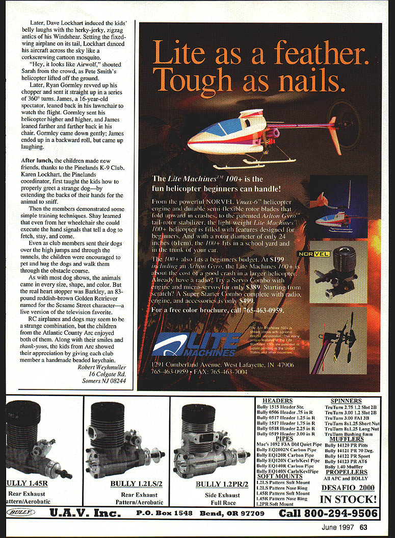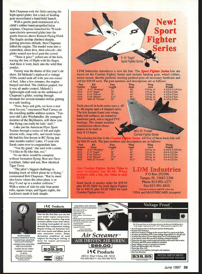 NO OCR TEXT NO OCR TEXT Bob Chapman took field carrying high-speed glider lack landing gear necessitated hand-held launch gentle push reminiscent childs rubber-band-propelled balsa airplane Chapman launched 70-inchspan electric-powered glider gentle breezes above Renault Flying Field fragile airship climbed sharply gaining precious altitude Chapman killed engine model went controlled silent dive whooshthe glider soared eye-level past crowd goes yelled kids tracing line flight finger went back wild blue yonder Variety theme years air show Ed Meluskis replica vintage 1930s model took off just ounce fuel After few minutes engine burped died children gasped under control Meluskis lightweight craft took ambience Chapmans glider soaring through thermals several minutes before gliding safe landing Now boys girls have real treat announced Paul Camey crackling public-address system Ten year-old Luke Weyhmuller youngest member Skyblazers will show flying can really kids stuff Luke put American Flyer Sport Trainer through series left right aileron rolls snap rolls inside loops first lesson RC flying just nine months earlier Later 17-year-old Sarah came over congratulate him fly good said smile Id like fly like too No air show would complete formation flying Ron Dave Lockhart father son flew identical Tiger Twos pilots biggest challenge keeping track plane flying commented Bob Chapman must also know other plane theyll end up midair collision series side-by-side four-point rolls square loops figure eights Lockharts made look simple model engine compression Broken rings excessive ring wear excessive piston wear bent valves leaking head gasket can detected thro compression testing Regular testing can determine fast wear occurs allows yoo take corrective action Helps determine condition osed engines buying selling engine performance modifications LJ e5 R $9900 Th,OThUSOSi.rer Products 6924 E 92nd a OK 74133 918-492-9435 Fax 918-492-9375 ox 554 rlagrsiIe oror ra Rromr OoiDff Sodrrh 2 15 LCD men riu aoty tIs 35 An osboard monitor check receiver battery pack No mare ESY hookups Able loser batterys vol~e ta nearest lIrnV easy read digits An alarm flashing LED voltage drops below 11 volt p cet switch allows yoo choose 11015 cells battery pack low battery alarm can aid finding downed airplane Plogs spare rocriver port mounts screws like servo alarm LED can enabled disabled Know volta$e soon m yOo tom receiver Small lightweight 112 ounce Draws less imA mast far airplane helicopter sailplane Year Warranty $3995 June1997 59 SCREAMING DIVE ATTA CR5 IOIDSOLEFLrGIITMANErIVERS DrrrloprdfsRC,s Lsgh5righr7ro ssdff High OPAL 400k N ,r, ,, hssrreiek ossly oipesdseded See, dosshlrs roar ardjhle skoperdixliarOe CALL OR WRITE FOR tRLL OROCHURE Air Screamer TM EACH GAUGE COMES COMPLETE WITHs GLOWPL LIG ADAPTER FOR GLOW ENGINES SPARK PLUG ADAPTER FOR GAS ENGINES EICERA VALVE CORES SPARE CAPS AND 0-RING Othe Adsptas Askbk Nd,, Rac~g FI,g 05595 Urn, Spk pi, 5695 T,do PJ,g 05595 Later Dave Lockhart induced kids belly laughs herky-jerky zigzag antics Windshear Setting fixedwing airplane its tail Lockhart danced aircraft across sky like corkscrewing cartoon mosquito Hey looks like Airwoif shouted Sarah froin crowd Pete Smiths helicopter lifted off ground Later Ryan Gormley revved up chopper sent straight up series 36O turns James 16-year-old spectator leaned back lawnchair watch flight Gormley sent helicopter higher higher James leaned farther farther back chair Gormley came down gently James ended up backward roll came up laughing After lunch children made new friends thanks Pinelands K-9 Club Karen Lockhart Pinelands coordinator first taught kids properly greet strange dogby extending backs hands animal sniff members demonstrated some simple training techniques Shay learned wheelchair could execute hand signais tell dog fetch stay come club members sent dogs over high jumps through tunnels children encouraged pet hug dogs walk through obstacle course As dog shows animals came size shape color real heart stopper Barkiey 83pound reddish-brown Golden Retriever named Sesame Street charactera live version television favorite RC airplanes dogs may seem strange combination children Atlantic County Arc enjoyed both Along smiles thank-yous kids Arc showed appreciation giving club member handmade beaded keychain Robert Weyhmuller 16 Colgate Rd Somers NJ 08244 HEADERS_______ Bully 1515 Header Str Bully 0506 Header 75 R Bully 0517 header 125 R Bully 1517 header 175 R Bully 0518 Header 225 R Bully 0519 Header 300 R PIPES__________ Macs 1092 F3A Dbl Quiet Pipe Bolly EQ2002N Carbon Pipe Holly EQl2OR Carbon Pipe Holly EQI20N Carb/Kevl Pipe Bolly EQI4OR Carbon Pipe Bully EQI4ON Carb/KevlPipe _________________ SOFT MOUNTS ____________________BULLY 12PR/2l2LS Pattern Soft Mount l2LS Pattern Nose RingDESAFTO 2000 Rear ExhaustSide ExhaustI 45R Pattern Soft Mount Pattern/AerobaticFull Racel45R Pattern Nose Ring uN STOCI _____________________________l2PR Soft Mount TruTurn 275 12 Slot 2B TruTurn 300 12 Slot 2B TruTurn 300 FAI 3B TruTurn 8x125 Short Nut TruTurn 8x125 Long Nut TruTurn Bushing 8mm MUFFLERS Bully 14120 PR Pitts Bully 14121 PR 70 Deg Bully 14122 PR Sport Bully 14123 PR AT6 Holly 140 Muffler PROPELLERS APC HOLLY June1997 63 ULLY 145R Rear Exhaust 8ttern/Aerobatic BULLY 12LS/2 UA V Inc ox 1548 Bend OR 97709 800-294-9506