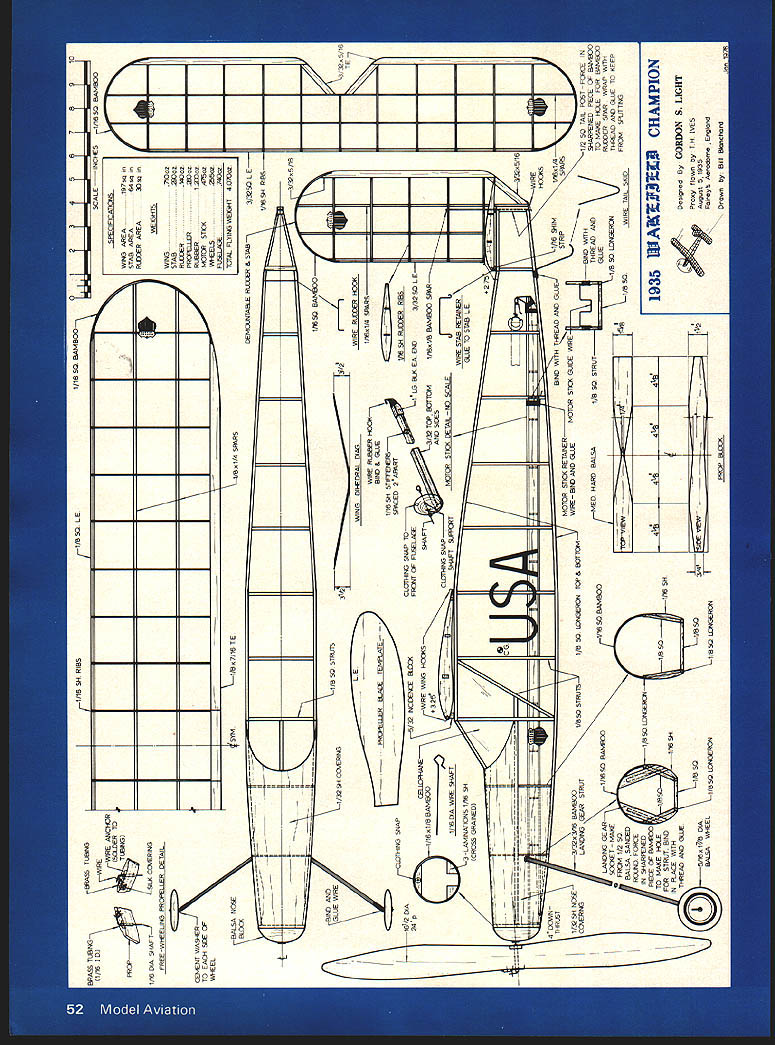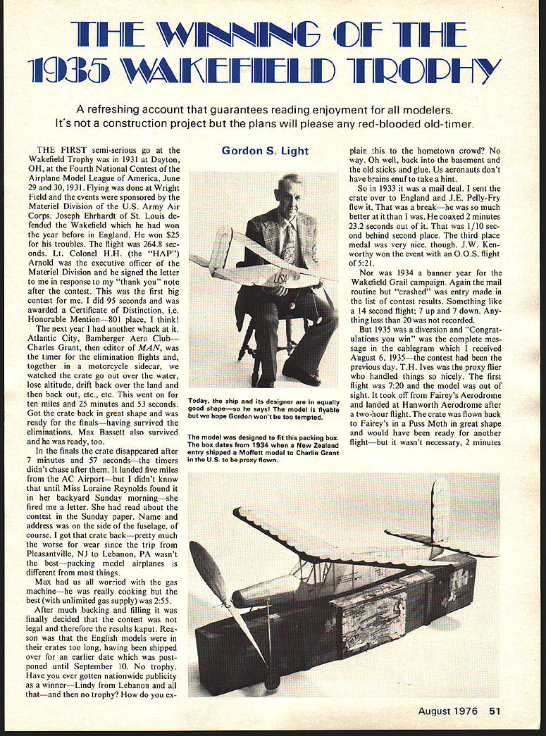 lu-It WIINNINL IDIF l[IIiII ZILID lI1QIDIIDIIY refreshing account guarantees reading enjoyment modelers Its construction project plans will please red-blooded old-timer THE FIRST semi-serious go Wakefield Trophy 1931 Dayton OH Fourth National Contest Airplane Model League America June 29 30 1931 Flying done Wright Field events sponsored Materiel Division US Army Air Corps Joseph Ehrhardt St Louis de fended Wakefield won year before England won $25 troubles flight 2648 sec onds Lt Colonel HH HAP Arnold executive officer Materiel Division signed letter response thank note after contest first big contest did 95 seconds awarded Certificate Distinction ie Honorable Mention801 place think next year another whack Atlantic City Bamberger Aero Club Charles Grant editor MAN timer elimination flights together motorcycle sidecar watched crate go out over water lose altitude drift back over land back out etc etc went ten miles 25 minutes 53 seconds Got crate back great shape ready finalshaving survived eliminations Max Bassett also survived ready too finals crate disappeared after 7 minutes 57 secondsthe timers didnt chase after landed five miles AC Airportbut didnt know until Miss Loraine Reynolds found backyard Sunday morningshe fired letter read about contest Sunday paper Name address side fuselage course got crate backpretty much worse wear since trip Pleasantville NJ Lebanon PA wasnt bestpacking model airplanes different things Max us worried gas machinehe really cooking best unlimited gas supply 255 After much backing filling finally decided contest legal therefore results kaput Rea son English models crates too long having shipped over earlier date post poned until September 10 No trophy Have ever gotten nationwide publicity winnerLindy Lebanon thatand no trophy ex Gordon S Light plain hometown crowd No way Oh well back basement old sticks glue Us aeronauts dont have brains enuf take hint So 1933 mail deal sent crate over England JE Pelly-Fry flew breakhe much better coaxed 2 minutes 232 seconds out 1/10 sec ond behind second place third place medal very nice though JW Kenworthy won event 00S flight 521 Nor 1934 banner year Wakefield Grail campaign Again mail routine crashed entry made list contest results Something like 14 second flight 7 up 7 down Any thing less 20 recorded 1935 diversion Congrat ulations win complete mes sage cablegram received August 6 1935the contest previous day TH Ives proxy flier handled things nicely first flight 720 model out sight took off Faireys Aerodrome landed Hanworth Aerodrome after two-hour flight crate flown back Faireys Puss Moth great shape would have ready another flightbut wasnt necessary 2 minutes August 1976 51 Today ship end its designer equally good shapeso says model flyable hope Gordon wont too tempted model wes designed fit pecking box box dates 1934 New Zealand entry shipped Moffett model Charlie Grant US proxy flown WASS TUBNG BBASS TUBBG 1/16 ID\1WIRE \\wIRE ANd-CR ISCEDER 10 TL8ING PRcP 1/16 GA SJ-IAFTSLACOAERING FREE-WHEELERS PROREUER DETAIL CEMENT WASHER TO EACH SEE CF W1-IEEL 1—BALSANOSE\ SYM 1/16 SH RIBS \ 1/6r7/16 TE 1/BBS LE F /Bx1/4 56565 1/16 50 BAMBOO\ x 1.~~DEMESJ1/1rABLERLccEN&ST6B\ SCALEINCI-ES1/iBSO BAMBOO 3/32S0 LE zLi~ 4K K 1-BINDANDf SIRE 1/325H COSITRING LE PQbFI FO P arv TFMR ATE LOTHING SNAP 16I2 GA/32 INODEPEE K 24 p lExi B BAMBOO 1/16 GA WRE SI-IAPT 3-LAMNATONSi/iB NH CROW GRAINED IIU II _______ II WIRE WINO HOCES 325 3/32x5/1B --7 3 32x5111 _____________________________________________________TE WING DiI-eDRAL GAGWIRE RLEEER I-*504 WIRE RUBBER I-EOtG--11/lEElIA SPARS ________________________ BND & GLUE 1/16 NH STIPPENERS SPADED 2 ARSRT 1/16 NH RUEEER RIBS CLOTHING SNAP TO WIRE STAB RETAJNER BIND WITH THREAD AND GLUE1/16 SHIM1/16x1/4 MOTOR STICK RETAINER 02 NH NOSE3/32x116 BAMBOOWIRE B11C AND GLUEMOTOR STkCI GUIDE WIRE LANDING GEAR STRUT1/BBS STRUTS1/B SO LONBERON TOP & BOTlOM BIND WITH 50 TAIL POSTFORCE IN MED HARO BALSA1/B SO STRUTTHREAD ANDSHARPENED PECE CF BAMNOC LANONO GEAR1/16 50 BAMBOO TO MAKE -CLE FOR BAMBOC RSEOER SPAR WRAP WITH _________________________________________1/B SO LONGERCRTHREAD APE GLUE TO KEEP 14I\1FROM SPUTTING BALSA SANDED/6S0WIRE TAIL SKID ROUND FORCEI IN SHARPENED/1/B SO LONOEROR FOR STRUT BIND// 5/16x17/BDIA116 NOEROR PROP dCK 4S41/B41/B4t 1935 PION DesIBUed GORDON S LIGHT Proxy Ilown Ny T H IVES Ao5xsS 5 1635 FarreyS Aerodome England SPECIFICATEAS WING AREA16716 IC STAB AREA 6416 0 RLEIEER AREA WECHTS WING7lOoz STABNHDoz RLIXIERl400z PROPELLER 3oz RUBBER1 232oz MOTOR SThCK 4750 WHEELS 32r5oz FUSELASE TOTAL FLYING WEK3HT40750 1935 Wakefield Trophy 266 seconds average enough time did get trophy flash around also pay insurance plus shipping charges Joe E warned expensive getting married have custody mug Someone knows dropped thing world little flat vicinity Alaska Might still far know personally think Joe dropped Obviously proxy model important thing other good proxy flier good packing crate First must pass parcel post regulations length girth etc otherwise Post Office wont take means shipping express during depression no could afford So obviously have good box well advised build model fitso much easier sound tech nically other way around turns out Moffett Trophy con test Remember Charles Grant proxy flier New Zealand entry flown out sight took empty box camp Peru VT summer 1934 used box ship some models home Ob viously 1935 very much mind could struggle through model building part job shipping crate took talent way beyond model very much alive well after 41 years obviously better shape am Original covering though flew 1936 Detroit no great amount success phasing out being phased out engineering school model airplane article writing getting better Structural members minimumnot dihedral braces vertical fin duplicate half stabilizer time least fun handing trophy over AA Judge English team took back home think third two English lads ahead Incidentally shipping crate great shape too 1935 model goode