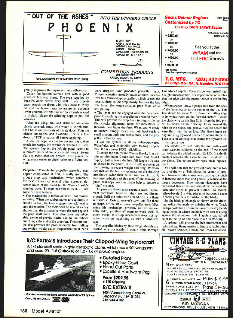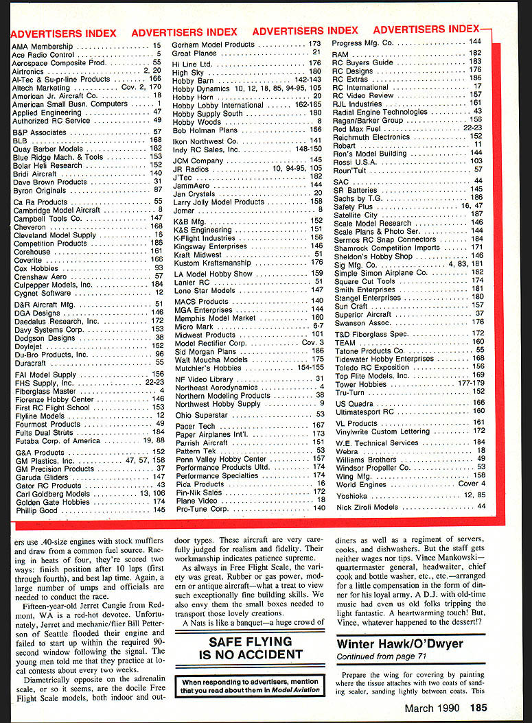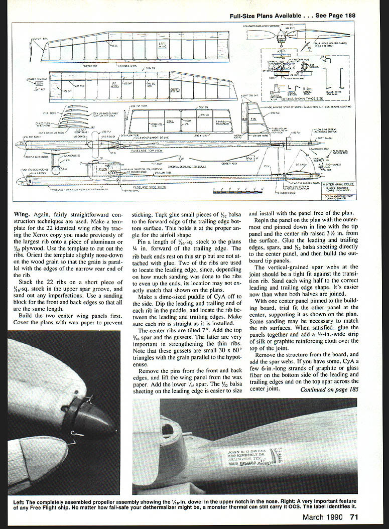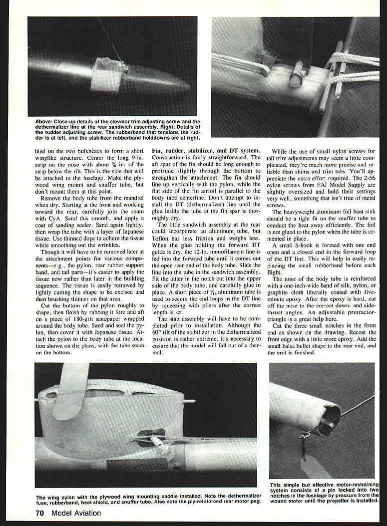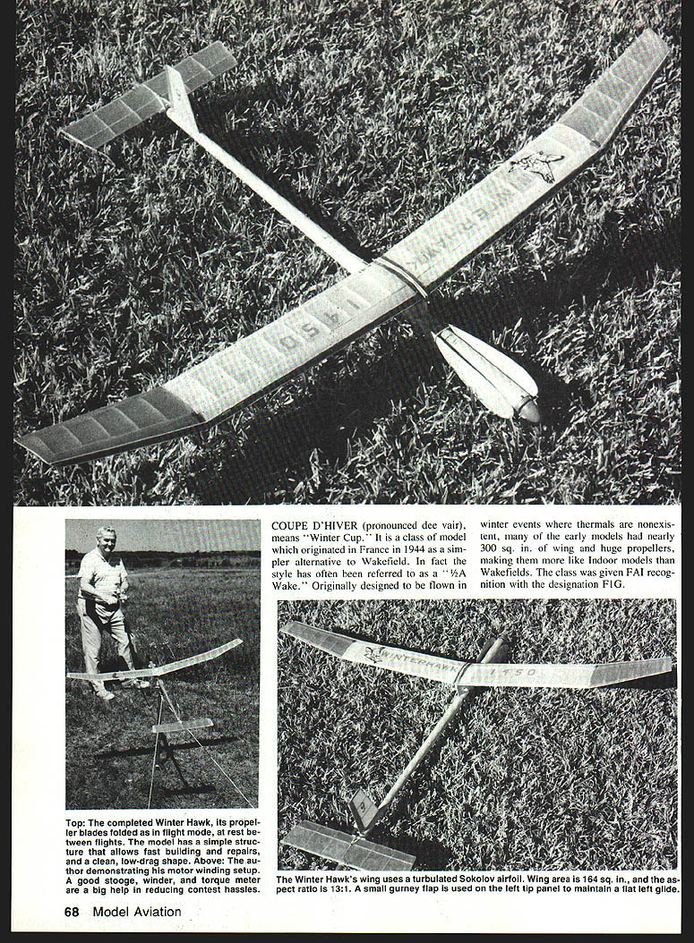 68 Model Aviation winter events thermals nonexis tent early models nearly 300 sq wing huge propellers making like Indoor models Wakefields class given FAI recog nition designation Flu COUPE DHIVER pronounced dee vair means Winter Cup class model originated France 1944 sim pler alternative Wakefield fact style has often referred /2 Wake Originally designed flown Top The completed Winter Hawk its propel ler blades folded flight mode rest tween flights model has simple struc ture allows fast building repairs clean low-drag shape Above au thor demonstrating motor winding setup good stooge winder torque meter big help reducing contest hassles Winter Hawks wing uses turbulatea okoIov airtoll wing area 164 sq pect ratio 131 small gurney flap used left tip panel maintain flat left glide Winter Hawk t A41 -U f winter hawk primarily white bird na tive Scandinavian countries also found other parts northern Europe As Coupe dHiver grew popularity inevitably came flown summer well summer winds thermals caused problems designs light wing loadings slow climbing characteristics Being difficult DT de thermalize thermals models often lost Sometimes moderate winds dashed ground before could gain enough altitude Consequently evolution has away light wing loadings slow climb much Wakefield-like performance appear ance todays breed small fastclimbing Coupe capable winning com petitions hot summer days moderate winds wont win under conditions added prowess compromise must made using latest technology reli able model also wanted plane could come out top calm days no thermals present Bob White has such model Beau Coupe shied away complicated wing structure curved tips Also carving efficient propeller seemed difficult task found simpler approach harness ing lot new ideas available compo nents came up just model wantedquick-building clean-lined competitive Winter Hawk im mediate success awarded Ft Worth Planesmens Best New Design 1983 has won placed contests since model has accumulated some 20 trophies won Open Coupe 1987 Nats Lincoln NE Basic specifications Winter Hawk follows wing uses tur bulated Sokolov airfoil has area 164 sq aspect ratio 131 small gurney flap used left tip panel maintain flat left glide helps keep thermals propeller uses very effi cient precarved blades available Blue Ridge Models also uses torque-sen sitive prop stop eliminates rubber bunching improves transition climb glide Overall its clean lowdrag shape still meets 31-sq-in cross section requirement model has simple design features allow fast build ing repairs Fuselage Make body single piece /16 sheet balsa light grained 3 x 36 sheet first tapered slightly aft 24 width 1% /6 x 24-in triangle removed side Seal inside two coats thick nitrate dope allowing about two hours beNamed after hawk native Scandinavian countries contest-winning Coupe dHiver evolved some novel ideas ingenius use available materials EJohn R ODwyer tween coats After second coat dry immerse sheet hot water bath tub about 10 minutes balsa starts curling tube wet tube slid onto round mandrel approximately 10 diameter found old pool cue almost perfect Wrap tube Ace bandage other cloth thats similarly stretchy porous Allow day thorough drying body tube drying build wing mount pylon Use three 2/2 x 3-in pieces lightweight even-grained /16 balsa sheet Edge glue together using CyA cyanoacrylate glue 9-in strip grain running vertical Apply coat dope exact center inside will help forming around two ribs shape pylon can transfer con tour ribs plan first Xe roxing paper ironing shape onto balsa sheet Transfer wing stabilizer contours same way two pylon ribs assem March 1990 69 Left The propeller hubs #8 left #9 right number eight hub uses wheel collars secure propeller blades #9 lighter has less drag spinner carved basswood Right Close-up view hub #9 showing simple spinner adapter hubs include best features several different designs Complete construction operating details contained text plans bled two bulkheads form short winglike structure Center long 9-in strip nose about % strip below rib side will attached fuselage Make ply wood wing mount snuffer tube dont mount point Remove th body tube mandrel dry Starting front working toward rear carefully join seam CyA Sand smooth apply coat sanding sealer Sand again lightly wrap tube layer Japanese tissue Use thinned dope adhere tissue smoothing out wrinkles Though will have removed later attachment points various compo nentseg pylon rear rubber support band tail partsits easier apply tissue now rather later building sequence tissue easily removed lightly cutting shape excised brushing thinner area Cut bottom pylon roughly shape finish rubbing fore aft piece 180-grit sandpaper wrapped around body tube Sand seal py lon cover Japanese tissue tach pylon body tube loca tion shown plans tube seam bottom Fin rudder stabilizer DT system Construction fairly straightforward aft spar fin should long enough protrude slightly through bottom strengthen attachment fin should line up vertically pylon flat side fin airfoil parallel body tube centerline Dont attempt stall DT dethermalizer line until glue inside tube fin spar thor oughly dry little sandwich assembly rear could incorporate aluminum tube Teflon has less friction weighs less glue holding forward DT guide dry 12-lb monofilament line fed forward tube until comes out open rear end body tube Slide line tube sandwich assembly Fit latter notch cut upper side body tube carefully glue place short piece A6 aluminum tube used secure end loops DT line squeezing pliers after correct length set stab assembly will have com pleted prior installation Although 600 tilt stabilizer dethermalized position rather extreme its necessary ensure model will fall out ther mal use small nylon screws tail trim adjustments may seem little com plicated theyre much precise re liable shims trim tabs Youll ap preciate extra effort required 2-56 nylon screws FAI Model Supply slightly oversized hold settings very well somethin
