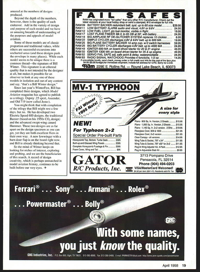 NO OCR TEXT NO OCR TEXT amazed numbers designs produced Beyond depth numbers however quality endeavor Add variety design purpose model have amazing breadth understanding purposes appeals model aviation Some models classic proportion traditional values others arc successful excursions uncharted areas designs push envelope places model seems unique common threadthe signature Bill Winter signature ethereal quality intended designer makes possible observer look models isolation out context say thats Bill Winter design Since last years Winterest Bill has completed three designs Model Aviation magazine has agreed publish trilogy Osprey 25 sport Ascender Old 719 now called Jester might think completion trilogy Bill might rest few days no has developed two Electric Speed 600 designs traditional Buzzer based 1950s CO2 design advanced swept-wing canard Hummer two designs far apart design spectrum can get yet both excellent fliers own way new lowwinger barn door flap board right now Bill already thinking beyond So mind Winter keeps looking niches interest exploring probing beneficiaries search record design creativity perhaps unmatched model aviation history continues built before very eyes TYPHOON EW Typhoon 22 Special Order Pre-built Parts Honeycomb Top Bottom Turtle Deck$325 Built-up Glassed Wing Panels$395 Complete Honeycomb Fuselage & Fin$595 Foam Cores Wing Tail$95 909 Sq Version 2 Sheets $1595 Plans 1000 Sq Version 2 Sheets$1595 Plans 1140 Sq 22 version 2 Shts .. $1995 Fiberglass Cowl 909 & 1000$2195 Fiberglass Cowl 22 version$2195 Clear Canopy versions$1495 Wing Tube & Socket 7/8 x 24$1195 Wing Tube & Socket 7/8 x30 tor 22$1195 Plug-In Wing Adjuster Kit 4-Pack$1295 Plug-In Adjustable Stab Kit$995 3713 Pompano Drive Pensacola FL 32514 GATORPhone 904 494-0203 RIC Products Incv VISA/MasterCard Welcomed $450 per Item S&HResidents add 6% Tax April 1998 19 FAIL SAFES RAM has onginated fait safes other R/O manufacturer Check out latest versions local hobby shop send stamped #10 envelope full info RAM 09BATTERY BACKER redundant batt syst up 60 size model$3995 RAM 11LOW BATTERY ALARM audio visual 48V 96V2495 RAM 12LOW FUEL LIGHT glo fuel monitor visible flight1995 RAM 17LOST PLANE FINDER tt4k II 65 DB 50 bait ety2495 RAM 18BIG AIRPLANE RF DE-GLITCHER SYSTEM replaces 10 chokes895 RAM 22SIMPLE CYCLER discharges 48V & 96V batt up 600 MA1995 RAM 25BIG PLANE BATTERY BACKER 10 amp cap w/2 switch harnesses5995 RAM 26BIG BATTERY CYCLER discharges 48V batt up 4000 MA 2495 RAM 49IGNITER 800 MA board driver/starter 20821 engine 4995 RAM 50IGNITER 1300 MA board driver/starter 358 up engine 4995 RAM 62SERVO FAIL SAFE adi sate point & delay waterproofable2495 RAM 83RADIO SIGNAL WATCHDOG Provides 4 functions 1/2 oz1495 unavailable locally send check money order full credit card info cost tern plus $400 l$5O0 foreignl immediate shipment Include full address U PS Sorry no COD m 229E E Rollins Rd d Lake Beach IL 60073 size style