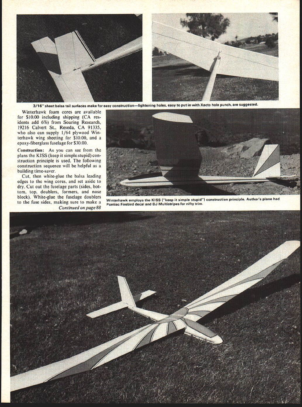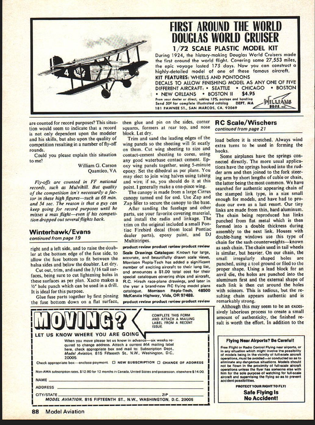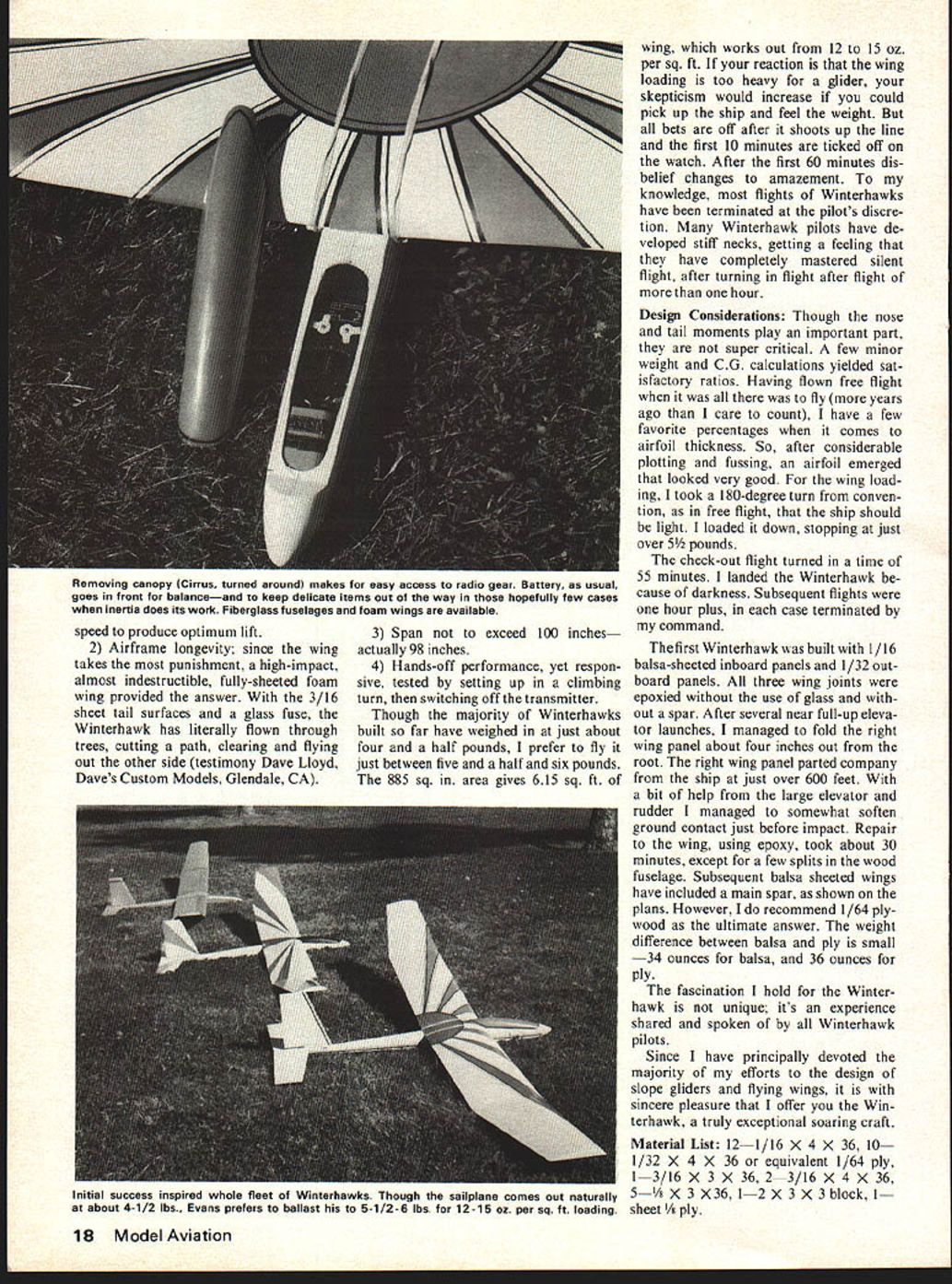 Author-designer Bill Evans displays pleas ing lines Winterhawk Has foam wing sheeted tail surfaces easy building WINTERHAWK combines strength tank flight characteristics bird prey combination de livers superior thermal time airframe longevity has goal say fellow fliers gee wont come down Winterhawk answer chief com plaint other fliers youve up hour about landing sol can use frequency Project Winterhawk undertaken deliver thermal craft several desir able qualities 1 Maximum flight time regardless lift conditionsaccomplished max imum-lift wing weight weight 16 Model Aviation Get line tension up before launch Use wing spar wing sheeted balsa either balsa plywood sheeting use glass cloth epoxy reinforce dihedral joints I/4S/Ir-BALSA LEADING EDGEN [v34][b18642320600]]1 -S32 ID ALUMINUM TUBE I/4 BALSA TIP RIB REQUIRED IF WINGS ARE .I/4 PLYWOOD RIBSHEETED WITH PLYWOODFDAM WING CORES COVERED WiTH BALSA SHEET-I/IBTHICK INBOARD I/2I/2HARDWOOD&I32THICK OTBOARDOTION COVER TIRWIMG WITH I/64 ThICK PLYWOOD 4 4 -3321DALUMINUM TUBE DIH CORAL DIAGRL2 NO SCALE DIHEDRAL GAGE K I4D1A DOWEL n 0 OL 00 Ill 00 0 o3 3/IBSHEET BALSA0 0 DIA MUSIC WIREELEVATOR ANDOL STABILIBER 3/32 DIA MUSIC WIRE00 00 CENTER SE Oti DIHEDRAL0OL SETTING WIRE TEMPLATES 00 __L LIGHTENING HOLES ARE PUNCHED IN WITH *ACTO I/2 DIA HOLE PUNCH 1 0 Ij IPLYIiPLYtPLY 3/I6SHEET BALSA0 CL IN AND RUDDER0 14 SHEET BALSATIP RIB CIRRUS CANOPY TURNEDI/43/BHARDWOOD MOUNTSWINGTIP HAS NERO WASHOUT END-FOR-ENDBALANCE POINT LONGERONS ARE I/rDIA DOWEL I/4SQUARE BALSA BRICK IirIl IKRAFT SPLICE BALSA SIDES & BOTTOM IF USING 3B SHEET FETQS& BOTTOM ADJUSTABLE TOW-HOOK YEDGE OF LIBPLYWOOD DOUBLER 9SCLE WING SPAN99 1/2 INCHES WING AREA 88250 IN STANDARD CLASS N/C SAILPLANE DESIGNED BY BILL EVANS WINTRRHAWK Al RIGHTS RESERVED %J FULL-SIZE PLANSAVAILABLE .. SEEPAGE 104 2 -b 0 ] 0 0 2 0 -Jo 0 CD -1 speed produce optimum lift 2 Airframe longevity since wing takes punishment high-impact almost indestructible fully-sheeted foam wing provided answer 3/16 sheet tail surfaces glass fuse Winterhawk has literally flown through trees cutting path clearing flying out other side testimony Dave Lloyd Daves Custom Models Glendale CA 3 Span exceed 100 inches actually 98 inches 4 Hands-off performance yet respon sive tested setting up climbing turn switching off transmitter Though majority Winterhawks built far have weighed just about four half pounds prefer fly just between five half six pounds 885 sq area gives 615 sq ft wing works out 12 15 oz per sq ft reaction wing loading too heavy glider skepticism would increase could pick up ship feel weight bets off after shoots up line first 10 minutes ticked off watch After first 60 minutes dis belief changes amazement knowledge flights Winterhawks have terminated pilots discre tion Winterhawk pilots have de veloped stiff necks getting feeling have completely mastered silent flight after turning flight after flight hour Design Considerations Though nose tail moments play important part super critical few minor weight CG calculations yielded sat isfactory ratios Having flown free flight was fly years ago care count have few favorite percentages comes airfoil thickness So after considerable plotting fussing airfoil emerged looked very good wing load ing took 180-degree turn conven tion free flight ship should light loaded down stopping just over 5 pounds check-out flight turned time 55 minutes landed Winterhawk cause darkness Subsequent flights hour plus case terminated command first Winterhawk built 1/16 balsa-sheeted inboard panels 1/32 out board panels three wing joints epoxied use glass out spar After several near full-up eleva tor launches managed fold right wing panel about four inches out root right wing panel parted company ship just over 600 feet bit help large elevator rudder managed somewhat soften ground contact just before impact Repair wing using epoxy took about 30 minutes except few splits wood fuselage Subsequent balsa sheeted wings have included main spar shown plans However recommend 1/64 ply wood ultimate answer weight difference between balsa ply small 34 ounces balsa 36 ounces ply fascination hold Winterhawk unique its experience shared spoken Winterhawk pilots Since have principally devoted majority efforts design slope gliders flying wings sincere pleasure offer Win terhawk truly exceptional soaring craft Material List 121/16 X 4 X 36 10 1/32 X 4 X 36 equivalent 1/64 ply 13/16 X 3 X 362 3/16 x 4 x 36 5/8 X 3 X36 l2 X 3 X 3 block 1 sheet /s ply 18 Model Aviation Removing canopy ICirrus turned around makes easy access radio gear Battery usual goes front balanceand keep delicate items out way hopefully few cases inertia does its work Fiberglass fuselages foam wings available Initial success inspired whole fleet Winterhawks Though sailplane comes Out naturally about 4-1/2 lbs. Evans prefers ballast 5-1/2-6 lbs 12-15 os per sq ft loading Winterhawk foam cores available $1000 including shipping CA res idents add 6% Soaring Research 19216 Calvert St Reseda CA 91335 also can supply 1/64 plywood Win terhawk wing sheeting $1000 epoxy-fiberglass fuselage $3000 Construction As can see plans KISS keep simple stupid con struction principle used following construction sequence will helpful building time-saver Cut white-glue balsa leading edges wing cores set aside dry Cut out fuselage parts sides bot tom top doublers formers nose block White-glue fuselage doublers fuse sides making sure make Con tinjpd nn nab RR 3/16 sheet balsa tail surfaces make easy constructionlightening holes easy put Aacto noie ouncn suuesLuu Winterhawk employs KISS lkeep simple stupidl construction principle Authors plane Pontiac Firebird decal DJ Multistripes nifty trim -uW w FIRSI AROUND IH[ WORLD DOUGLAS WORLD CRUIS[R 1 72 SCALE PLASTIC MODEL KIT During 1 924 history-making Douglas World Cruisers made first around world flight Covering some 27553 miles epic voyage lasted 1 75 days Now can construct highly-detailed model famous aircraft KIT FEATURES WHEE